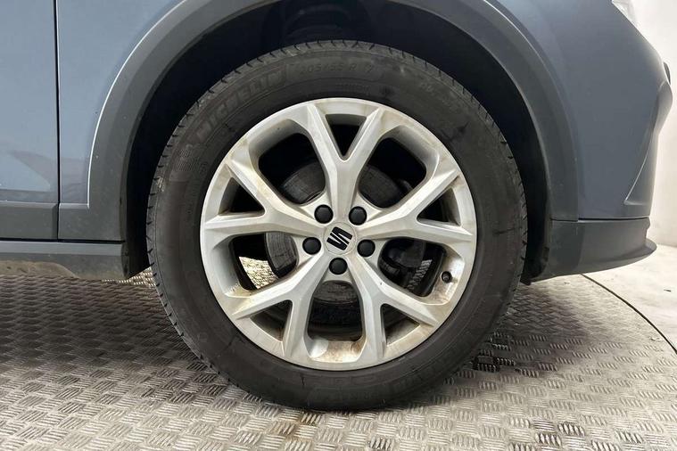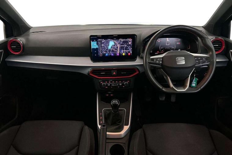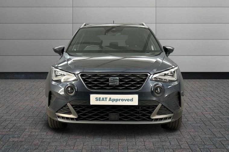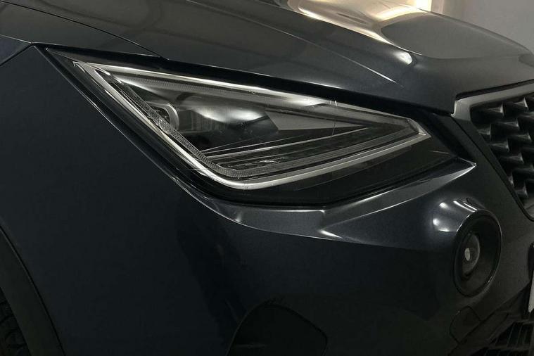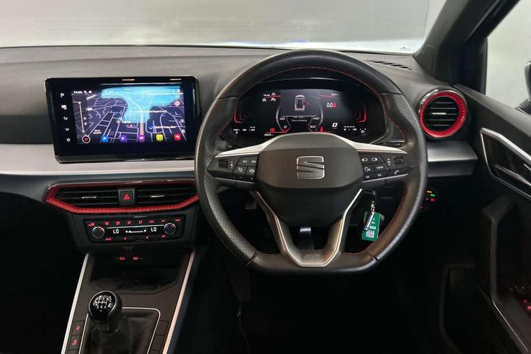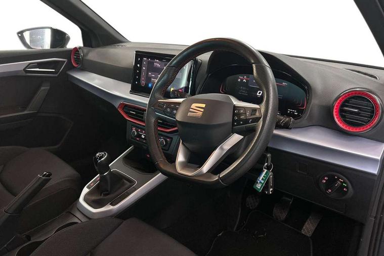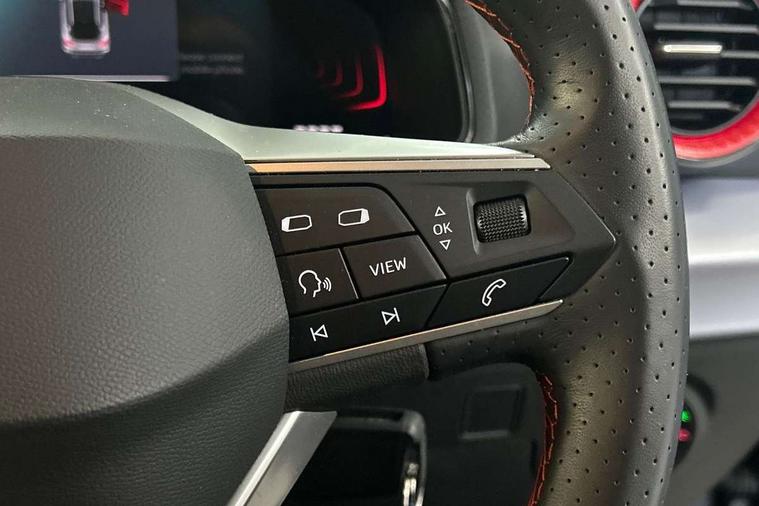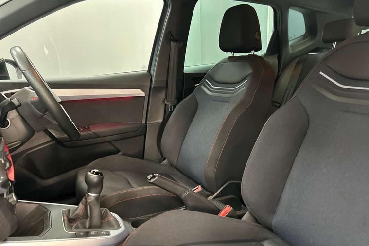 'Lights On' Reminder warning buzzer, 8" Digital cockpit, Digital clock, E-call, Electric speed sensitive power steering, Full Link Smartphone Integration with Mirror Link, Apple Car Play, Google Android Auto with USB Type C cable for Apple and Android compatibility, Lane keeping system, Low fuel warning light, Outside temperature display, Rear parking sensor, RPM counter, Seat connect with safety, service, remote and online, SEAT Drive profile - Four different models normal-sport-eco-individual, steering response, throttle response, Trip computer, Wireless phone charger, 9.2" colour touchscreen with navigation system, voice control and USB port (type c), Bluetooth interface for hands free and audio streaming, DAB digital radio and AM/FM radio, Steering wheel mounted audio controls, Anti theft roof antenna, Auto dimming interior rear view mirror, Automatic activation of hazard warning lights, Body coloured bumpers, Body coloured door handle inserts, Chrome roof rails and window surrounds, Dark tinted rear windows, Electric front/rear windows, Electrically adjustable, heated and folding door mirrors, Front fog lights with cornering function and rear fog light, FULL LED automatic headlights with dynamic headlight range control, coming and leaving home, LED daytime running lights, LED rear tail lights and licence plate lights, Protective side mouldings, Rain sensing wipers, Rear side wing doors, Rear spoiler, Rear window wash/wipe, Roof colour door mirrors, Third brake light, Twin exhaust pipe styling hidden exhaust pipe, Visible VIN plate, Windshield wiper with intermittent control and potentiometer, 2 cupholders, 3 seat bench in 2nd row, 60/40 split folding rear seat, Aircare filter, Black interior roof, Cloth upholstery, Double boot floor, Driver sunvisor with covered mirror + card holder, Dual zone climate control, Front courtesy light with front reading lights, Front sport seats, Gear shift indicator, Height adjustable front seats, Height/reach adjustable steering column, Illuminated boot, Instrument lighting with brightness control, Interior ambient lighting, Interior light in footwell, central console and door panel, ISOFIX points in outer rear seats with top tether anchorage points, Passenger sunvisor with vanity mirror, Perforated flat bottomed leather steering wheel/gear knob/handbrake with red stitching and FR logo, Single front passenger seat, Two front and three rear height adjustable headrests, Interior chrome pack - Arona, 3 point seatbelts on all rear seats, ABS, Active front headrests, Child locks on rear doors, Driver and front passenger airbags with front passenger airbag de activation, front side and curtain airbags, Electronic stability control, Emergency Brake Assist (EBA) and front assist, Front and rear seatbelt reminder, Hill hold control, Multi-Collision braking, Tiredness recognition system, Traction control, Tyre pressure monitoring system, Alarm with back-up horn, Electronic engine immobiliser, Locking wheel bolts, Remote central locking + deadlocks, Tow away protection, Titan black dashboard, 17" Dynamic alloy wheels,