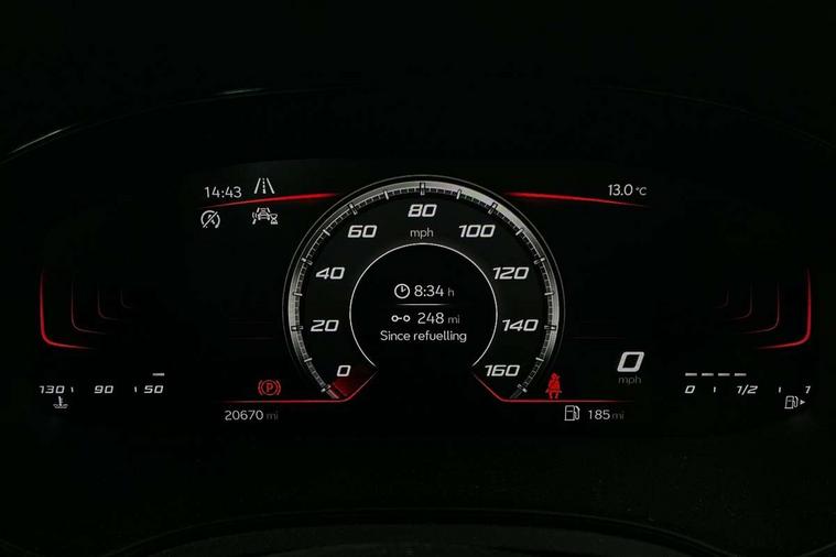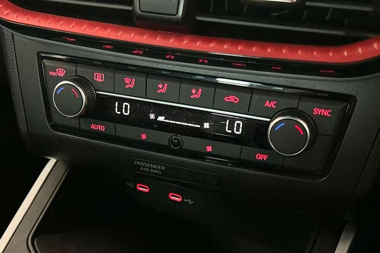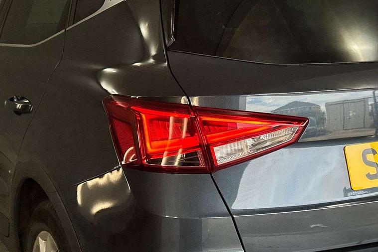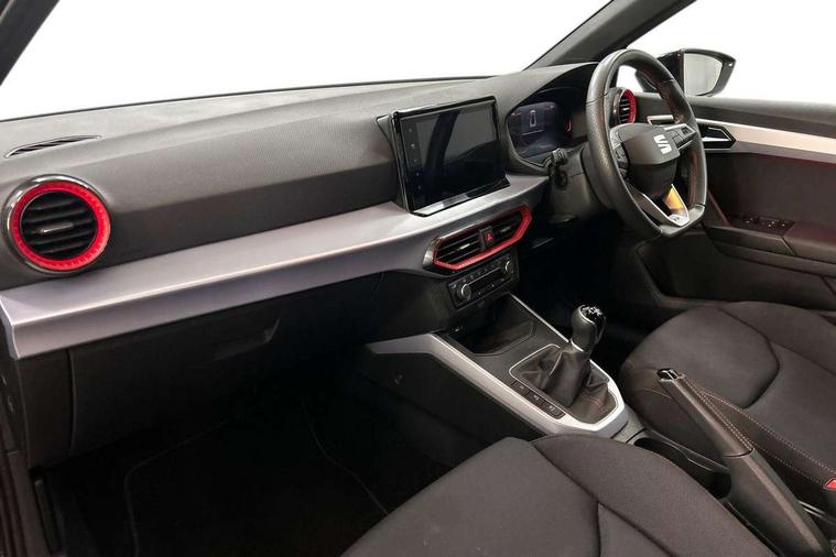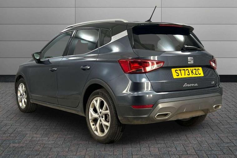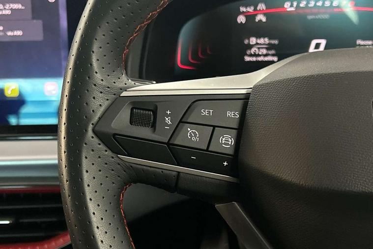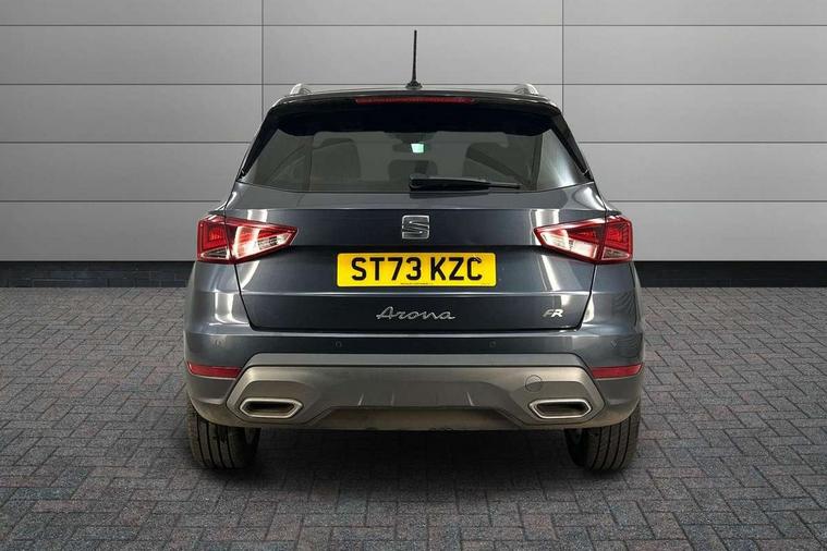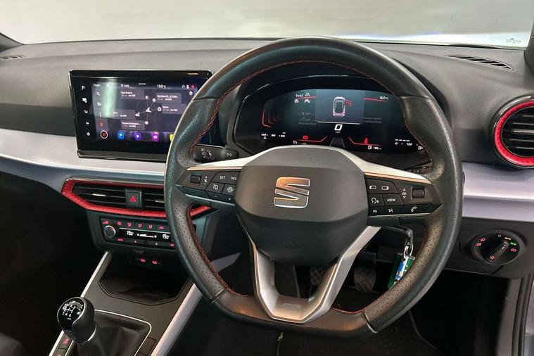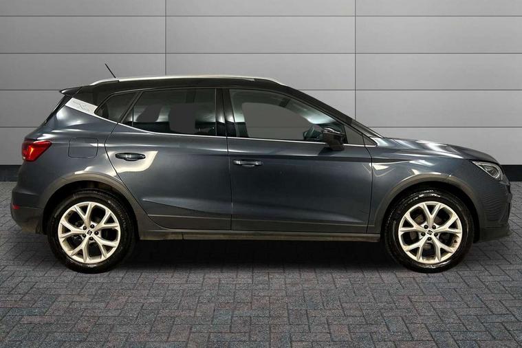 'Lights On' Reminder warning buzzer, 8" Digital cockpit, Digital clock, E-call, Electric speed sensitive power steering, Full Link Smartphone Integration with Mirror Link, Apple Car Play, Google Android Auto with USB Type C cable for Apple and Android compatibility, Lane keeping system, Low fuel warning light, Outside temperature display, Rear parking sensor, RPM counter, Seat connect with safety, service, remote and online, SEAT Drive profile - Four different models normal-sport-eco-individual, steering response, throttle response, Trip computer, Wireless phone charger, 9.2" colour touchscreen with navigation system, voice control and USB port (type c), Bluetooth interface for hands free and audio streaming, DAB digital radio and AM/FM radio, Steering wheel mounted audio controls, Anti theft roof antenna, Auto dimming interior rear view mirror, Automatic activation of hazard warning lights, Body coloured bumpers, Body coloured door handle inserts, Chrome roof rails and window surrounds, Dark tinted rear windows, Electric front/rear windows, Electrically adjustable, heated and folding door mirrors, Front fog lights with cornering function and rear fog light, FULL LED automatic headlights with dynamic headlight range control, coming and leaving home, LED daytime running lights, LED rear tail lights and licence plate lights, Protective side mouldings, Rain sensing wipers, Rear side wing doors, Rear spoiler, Rear window wash/wipe, Roof colour door mirrors, Third brake light, Twin exhaust pipe styling hidden exhaust pipe, Visible VIN plate, Windshield wiper with intermittent control and potentiometer, 2 cupholders, 3 seat bench in 2nd row, 60/40 split folding rear seat, Aircare filter, Black interior roof, Cloth upholstery, Double boot floor, Driver sunvisor with covered mirror + card holder, Dual zone climate control, Front courtesy light with front reading lights, Front sport seats, Gear shift indicator, Height adjustable front seats, Height/reach adjustable steering column, Illuminated boot, Instrument lighting with brightness control, Interior ambient lighting, Interior light in footwell, central console and door panel, ISOFIX points in outer rear seats with top tether anchorage points, Passenger sunvisor with vanity mirror, Perforated flat bottomed leather steering wheel/gear knob/handbrake with red stitching and FR logo, Single front passenger seat, Two front and three rear height adjustable headrests, Interior chrome pack - Arona, 3 point seatbelts on all rear seats, ABS, Active front headrests, Child locks on rear doors, Driver and front passenger airbags with front passenger airbag de activation, front side and curtain airbags, Electronic stability control, Emergency Brake Assist (EBA) and front assist, Front and rear seatbelt reminder, Hill hold control, Multi-Collision braking, Tiredness recognition system, Traction control, Tyre pressure monitoring system, Alarm with back-up horn, Electronic engine immobiliser, Locking wheel bolts, Remote central locking + deadlocks, Tow away protection, Titan black dashboard, 17" Dynamic alloy wheels,