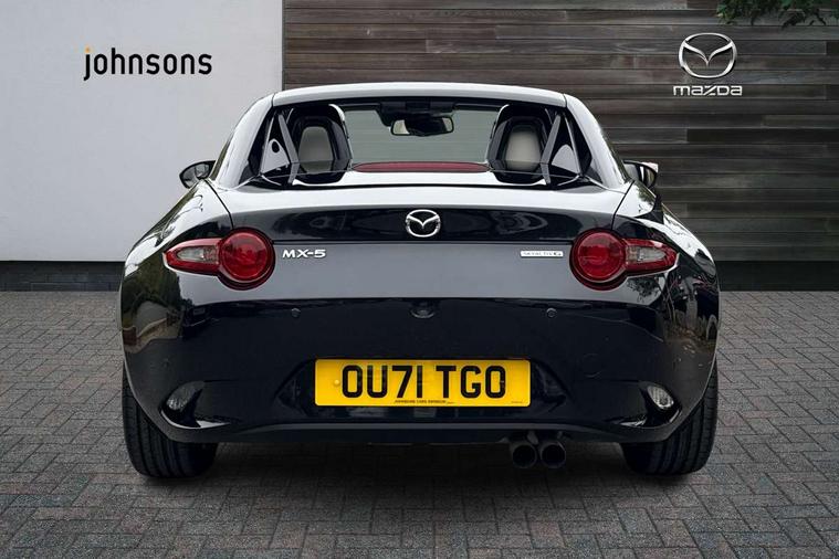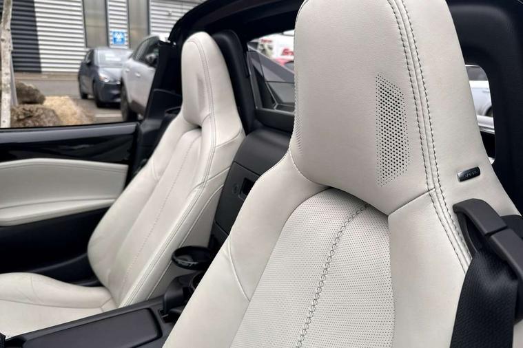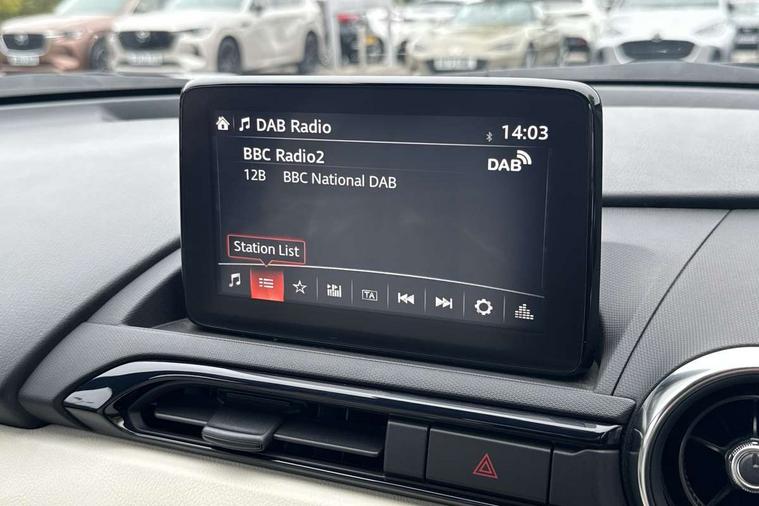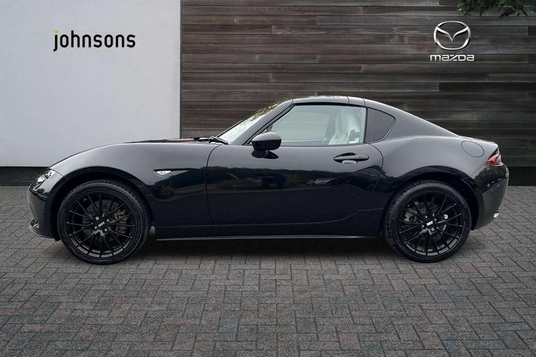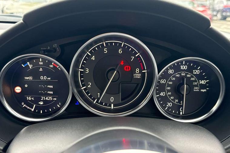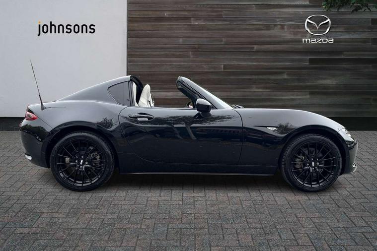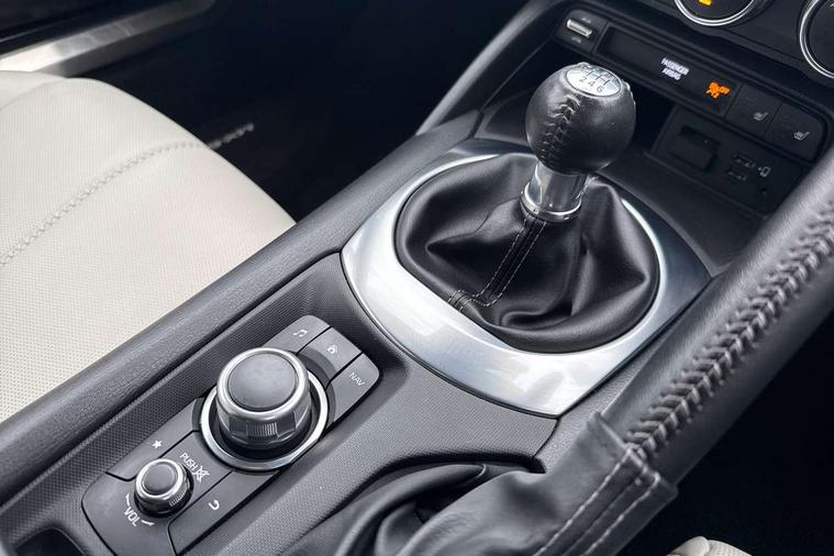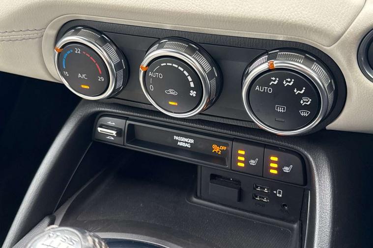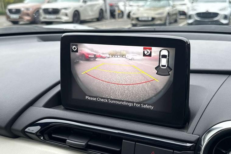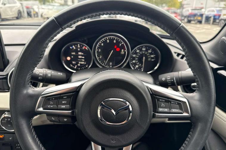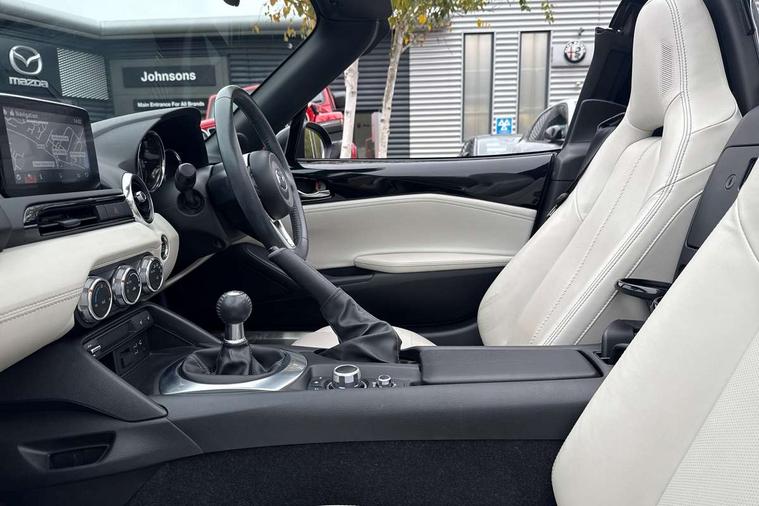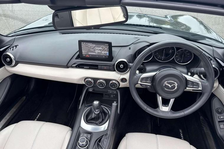 7" colour touch screen with Mazda connect infotainment, Aha and stitcher app, Analogue speedometer, Apple car play/Android Auto, Blind spot monitoring with rear cross traffic alert, Cruise control + speed limiter, Driver alert system, Emergency stop signalling system, Engine start/stop button, Hands free phone preparation, Integrated bluetooth with hands-free calling, bluetooth audio and easy access to phone contacts, Integrated navigation system, Lane departure warning system, Multi dot display tachometer and electric odometer, PAS, Rear parking sensor, Reversing camera, Service indicator, Traffic sign recognition, Trip computer, Water temperature gauge, I-ELOOP, i-stop, Limited slip differential, Sports suspension featuring Bilstein dampers, 2 USB/aux input socket, Multimedia Commander including separate volume dial, Premium Bose sound system with 9 speakers with 2 in each front headrest, AM/FM/DAB radio and single CD/MP3, Steering wheel mounted audio/bluetooth controls, Adaptive LED Headlights, Auto dimming rear view mirror, Automatic headlamp levelling, Body colour bumpers, Body colour co ordinated interior upper door trim, Coming/leaving home lighting function, Dual exhaust pipes, Dusk sensitive headlamps, Electric front windows/one touch facility, Electrically operated retractable hard top with heated rear glass window, High mounted rear brake light with Black coloured cover, LED 3rd brake light, LED daytime running lights, LED indicator lights, LED rear lights, Piano black electric/heated door mirrors, Piano Black fashion bars, Rain sensing front wipers, Stainless steel scuff plates with MX-5 logo, 12V socket, Centre console storage box, Chrome Air conditioning dials, Climate control air conditioning, Coin Box, Driver and front passenger sunvisors with covered vanity mirror and driver ticket holder, Driver seat manual slide, recline and tilt adjustment, Front centre armrest, Front head restraints, Gear shift indicator, Heated front seats, in 3 heat levels, Interior courtesy light, ISOFIX front passenger seat child seat compliance, Leather gear knob, Leather handbrake lever, Leather steering wheel, Lockable rear centre box with lid, Passenger seat + manual slide/recline adjust, Perforated nappa leather upholstery, Side door trim in light stone vinyl with light stitching, Sports seats, Strut brace, Tilt/telescopic steering column, Transparent windblocker, Two cupholders, 3 point ELR front seatbelts with pretensioners, ABS+Electronic Brake force Distribution, Deployable Hood System (DHS), Driver and front passenger airbags, Driver and passenger seatbelt reminder audible warning, DSTC-Dynamic Stability and Traction Control, Hill hold assist, Passenger airbag deactivate switch, SCBS - Smart City Brake Support, rear plus front with autonomous emergency braking, Side airbags, Tyre pressure monitor, Remote central locking with deadlocking and remote boot release, Smart keyless entry, Superlocking, Thatcham category 1 alarm + immobiliser, Chrome air vent surrounds, Chrome meter rings, Dashboard panel - vinyl leather Light Stone, 17" BBS Gun Metallic alloy wheels, Tyre puncture repair kit,