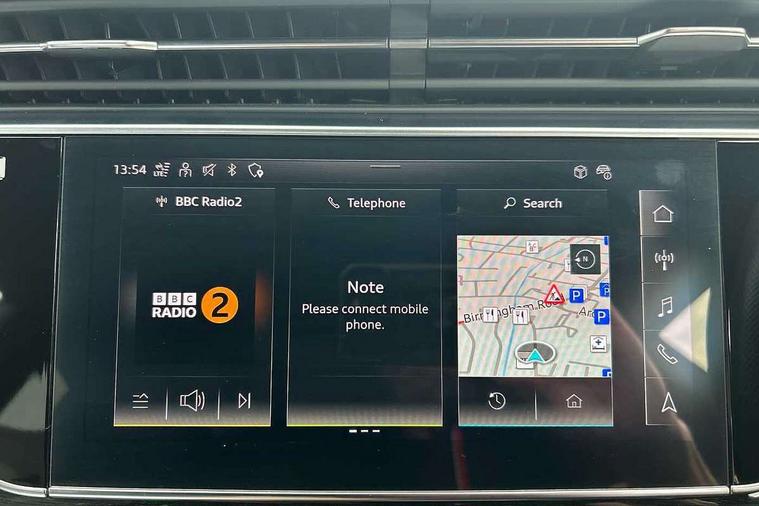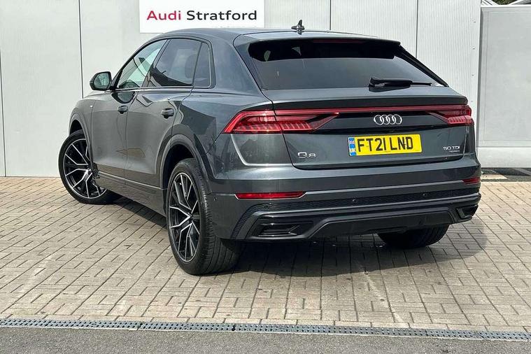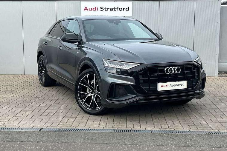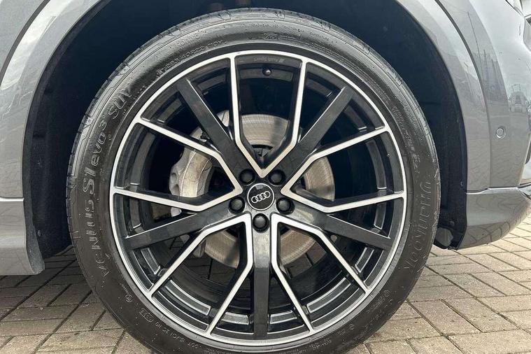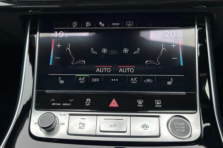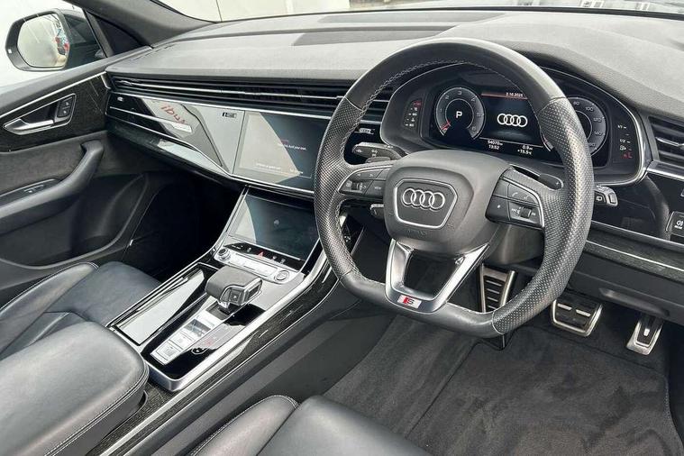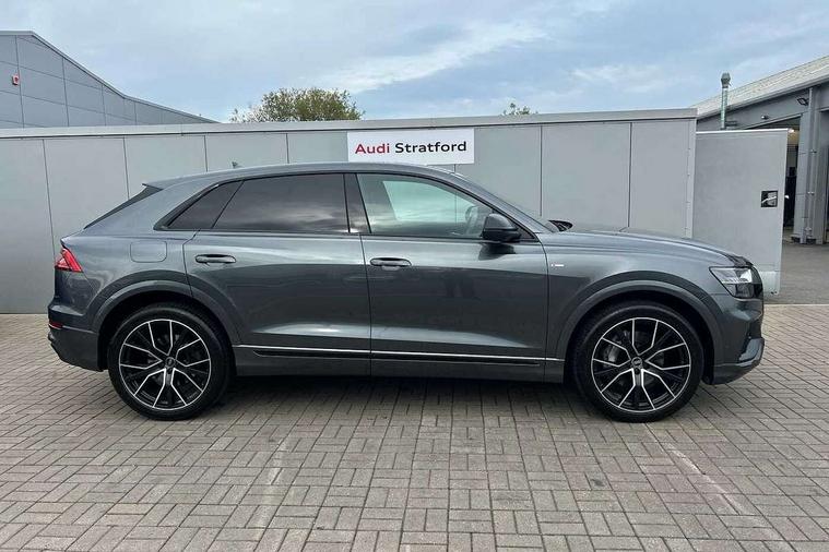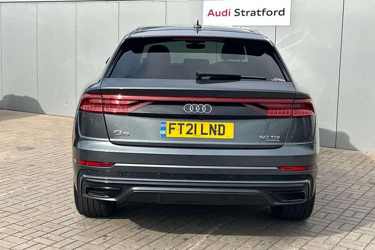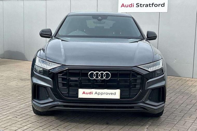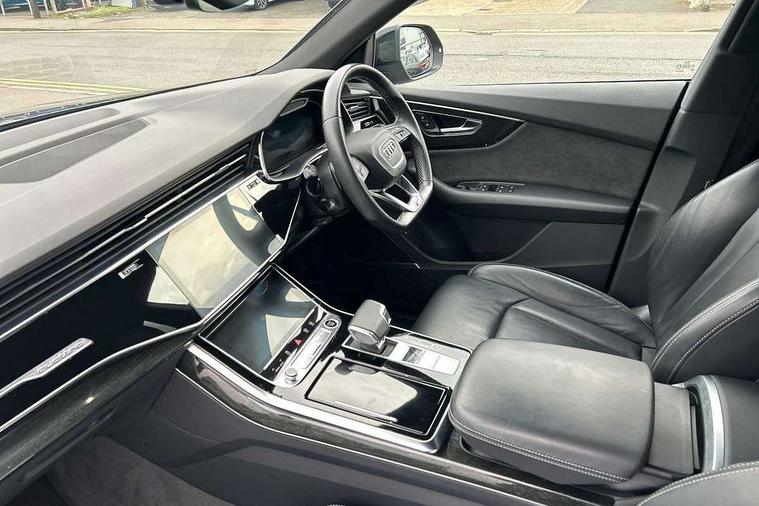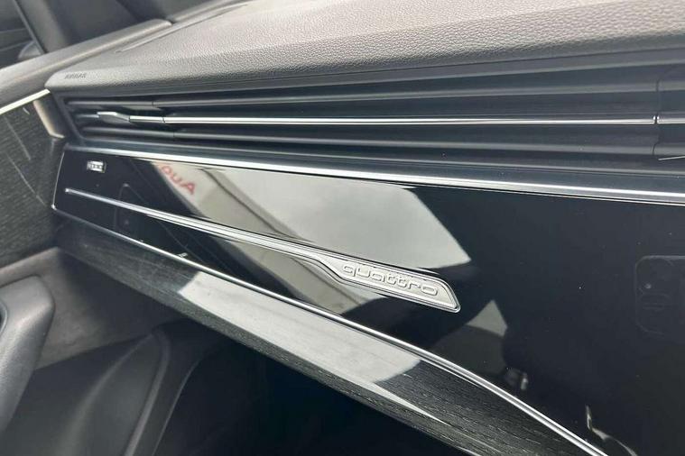 10.1" and 8.6" Dual colour touchscreens, Audi connect safety and service (e-call), Audi connect with Amazon Alexa Integration, Audi drive select, Audi parking system plus includes 360 degree display with front and rear sensors, Audi phone box with wireless charging, Audi virtual cockpit - 12.3" high resolution LCD display with fully customisable instrument cluster, Automatic start/stop system, Electro-mechanical PAS, Low washer fluid indicator, MMI - Multi Media Interface control system, MMI navigation plus with MMI touch, Natural voice recognition, On board computer, Operating buttons in black, glass look with haptic feedback, Power operated tailgate, Rear view camera, Service interval indicator, Smartphone interface includes wireless Apple carplay/Android Auto, 48V Mild hybrid technology, Adaptive sport air suspension, Diesel particulate filter, Quattro all wheel drive with self locking centre differential, Audi music interface with 2 USB ports with charge and data functions, Audi sound system with 6 channel amplifier, 180 watt amplifying capacity and 10 loudspeakers including subwoofer, Aux-in socket, DAB Digital radio, Acoustic windscreen, Audi HD Matrix LED headlights with dynamic front and rear indicators, Auto dimming frameless rear view mirror, Coming/leaving home lighting function, Electric front+rear windows, Electrically adjustable/heated/folding/auto dimming door mirrors with integrated LED indications + kerb view function for passenger side, Headlight washers, Heat insulating glass in windshield, LED signature daytime running lights, Platinum grey front spoiler lip and diffuser insert with honeycomb grille in black, Privacy glass - dark tinted rear and rear side windows from B-pillar backwards, Rain and light sensors, Rear wiper, 4 zone deluxe automatic climate control, 4-way lumbar support for front seats, 40:20:40 split folding rear bench seat, Black cloth headlining, Comfort front centre armrest, Driver seat memory function, Electrically adjustable front seats, Front head restraints, Front/rear floor mats, Heated front seats, ISOFIX child seat mounting for front passenger seat and 2 outer rear seats with top tether child seat mounting for all 3 rear seats, LED interior ambient lighting, Luggage compartment sill protection in stainless steel, Rear centre armrest with 2 cupholders, Rear headrests, Rear seat bench plus, Stainless steel pedals, Sunvisors with illuminated vanity mirrors, Titanium Black Styling Pack - Q8, 3 point seatbelts on all seats, Audi pre sense front, Driver and front passenger, front side and curtain airbags, Electromechanical parking brake, Electronic Stability Control (ESC) including ABS, ASR and EDL, Front passenger airbag deactivation, Hill descent control, Hill hold assist, Predictive pedestrian protection, Seatbelt monitoring, Traction control, Tyre pressure loss indicator, Warning triangle and first aid kit, Anti theft alarm with tow away protection, Anti-theft wheel bolts and wheel loosening detection, Immobiliser, Keyless go with remote central locking, Polished oak trim with grey finish inlay, Tool kit, Tyre repair kit,