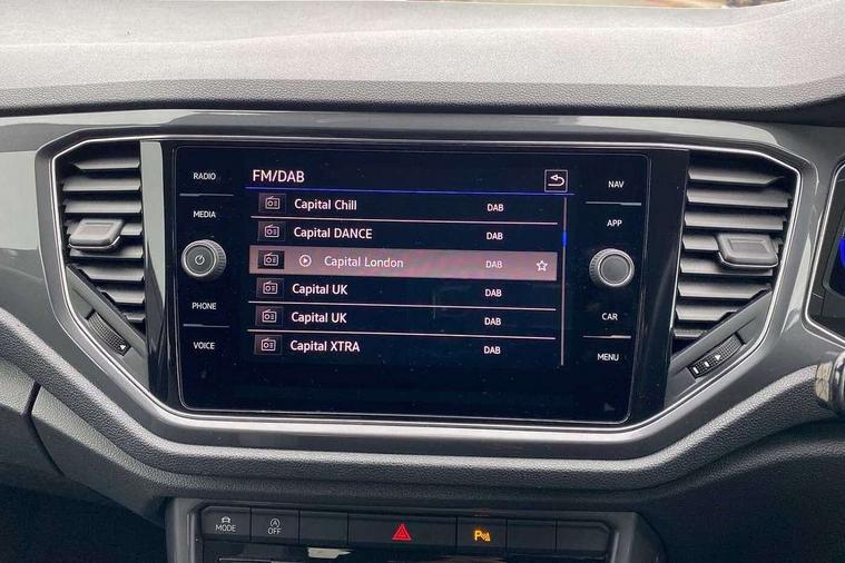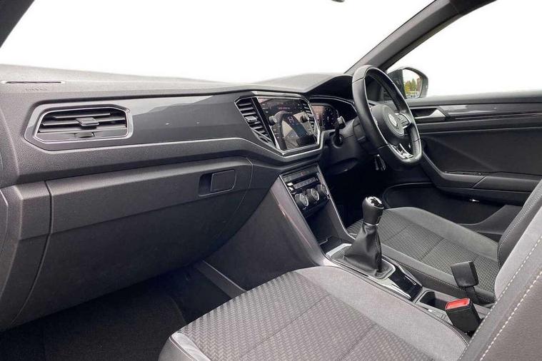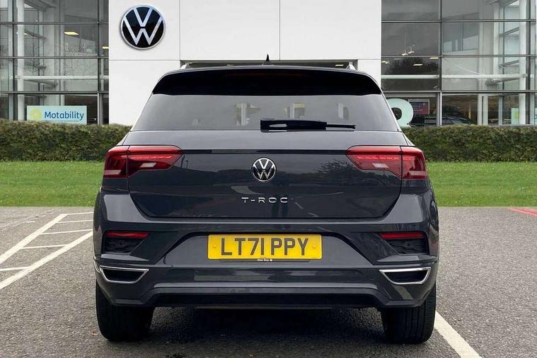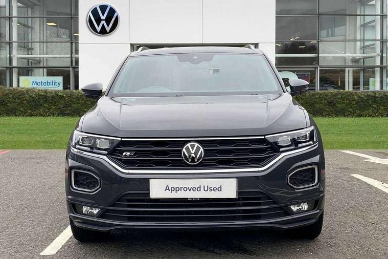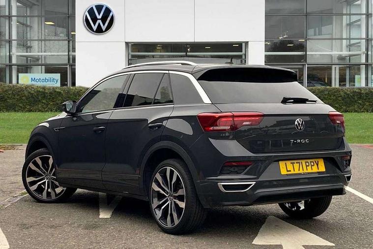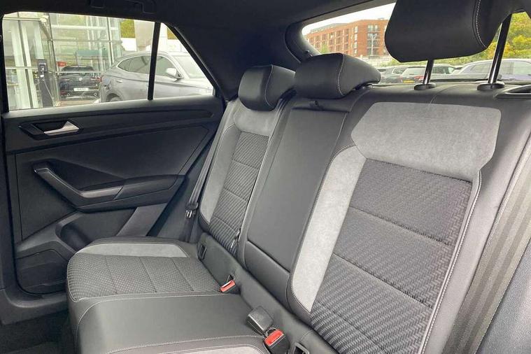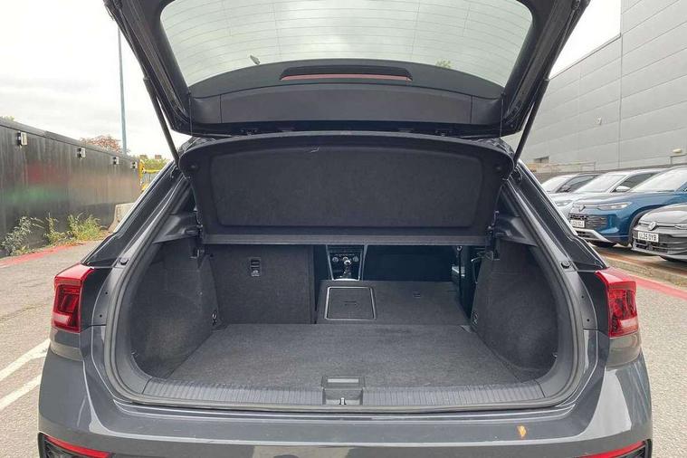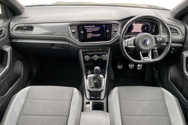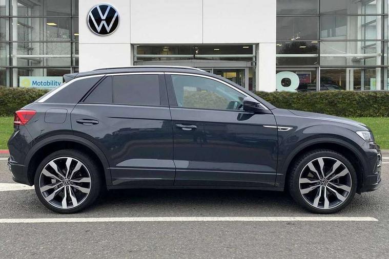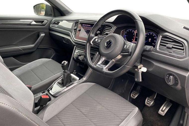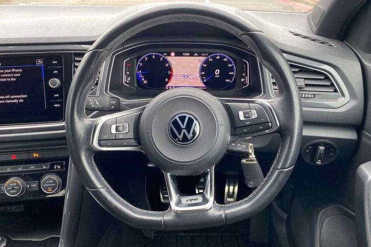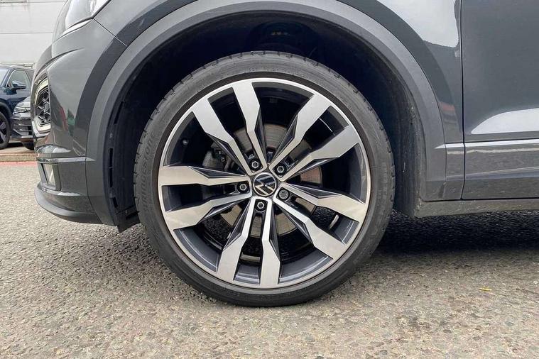 'Lights On' Reminder warning buzzer, Adaptive cruise control, Bluetooth telephone and audio connection for compatible devices, Car information display, Digital Cockpit Pro - Active info display, Driver alert system with audible and visual fatigue detection system, Driver tips and journey analysis, Emergency call service, Lane assist with warning text instrument cluster, Modified key software - reduce switch off time for key status change to Long no motion, Multifunction camera, Multifunction computer with visual gear change recommendation for fuel consumption, Navigation system discover media including streaming and internet, Service interval indicator, Think blue trainer driver tips and journey analysis, Traffic sign recognition, Voice activation, Warning sound and light for front seatbelts unfastened, Wireless app connect for apple carPlay, Battery regeneration during braking, Rear shock absorption for sports version, Start/stop function with battery regeneration, DAB Digital radio, Disk brakes in front, Diversity antenna for FM reception, Music playback - MP3, WMA and AAC files, Premium USB cable in choice of either Apple or Android smartphone compatibility, SD card slot, Simultaneous pairing of 2 compatible mobile devices, SMS functionality - read, compose and send SMS messages using touch-screen display, Storage compartment with longitudinal and height adjustable in armrest and two rear air vents, Three route options - Fast, Short, Eco, Title and cover art display, USB-C Interface and USB charging socket, Auto dimming interior rear view mirror, Automatic coming/leaving home lighting function and daytime running lights, Automatic hazard lights activation under emergency braking, Black grained lower door protectors, Body colored door lower parts, Body colour door handles, Body colour rear roof spoiler, Chrome effect left and right trapezoid exhaust tailpipe fascia surround, Chrome plated moldings, Chrome trim on upper and lower radiator grille, Dusk sensor, Dynamic headlight range control with self adjusting whilst driving, Electrically foldable, adjustable and heated door mirrors with puddle lights and reverse activated kerb-view adjustment on passenger's door mirror, External USB type C socket and charging sockets, Front and rear electric windows, Front fog lights with static cornering function, Front windscreen wiper with intermittent wipe and 4 position delay, Fully galvanised body, Heated rear window, Heated windscreen washer jets, High level 3rd brake light, LED darkened rear light clusters, LED headlamps with automatic range adjustment and unique signature LED separate daytime running lights, LED rear number plate lights, LED tail lamp rear comination lamps, Privacy glass, R-Line design body coloured bumpers, Rain sensor, Rear tinted glass from B-pillar backwards approx 65% tinted, Rear wash/wipe with intermittent wipe setting, Silver anodised roof rails, Volkswagen roundel, 12V socket in centre console storage area, 3 rear head restraints, 4 load lashing points in luggage compartment, Aluminium pedals, Black roof lining and sun visors, Branded points of interest, Carbon flag cloth upholstery, Chrome plated radiator grille inserts, air vent surrounds and light switch surrounds, Climate control - 2 zone electronic air conditioning with automatic air recirculation and allergy filter, Door and side trim panel, Door and side trim panel in foam film, insert in leatherette, Drawer under drivers seat, Front + rear carpet mats, Front centre armrest, Front cupholders x 2, Front seat back storage pockets, Front sports seats with R-Line logo on seat backrest, Glovebox, Heated front seats, Height adjustable front seats, Height/reach adjust steering wheel, Instrument lighting, white adjustable panel illumination, Interior light delay, Interior light in footwell, Isofix easy fit child seat preparation for 2 outer rear seats, LED interior light with switch off delay/dimmer and 2 front/rear LED reading lights, Load through provision with single cup holder when folded down, Luggage compartment cover, removable, Luggage compartment lighting, R Line badge, Scuff plates in door apertures, Split folding rear seat backrests with centre armrest, Stainless steel pedals, Storage compartment in left and right luggage area, Storage compartment in rear doors, Storage compartments in driver and front passenger doors, Sunvisors with illuminated vanity mirrors, Three spoke multi-function leather trimmed steering wheel and gearknob, Unique R Line door sill protectors, White ambient lighting, R line styling pack - T-Roc, Winter pack - T-Roc, 3 rear three point seatbelts, ABS, Curtain airbags, Driver and front passenger safety-optimised head restraints, Drivers and front passengers airbags with passengers deactivation switch, Drivers seatbelt reminder, Electronic parking brake with auto hold, Electronic stability control (ESC) includes ASR, EDL, EDTC and trailer stabilisation function, Front assist with city emergency braking and pedestrian monitoring, Front seat side impact airbags, Hill start assist, Predictive pedestrian protection, Rigid safety cell with front and rear crumple zones, Single tone horn, Three point height adjust front seatbelts + pretensioners, Tyre pressure loss indicator, Ventilated front and rear disc brakes, Volkswagen roadside assistance, Alarm with remote central locking and interior protection, Electronic engine immobiliser, Remote central locking with SAFELOCK, radio remote control with 2 remote control folding keys, Shadow grey decorative inserts in dash, centre console and door panel, 19" Suzuka alloy wheels with low rolling resistance tyres and anti wheel bolts,