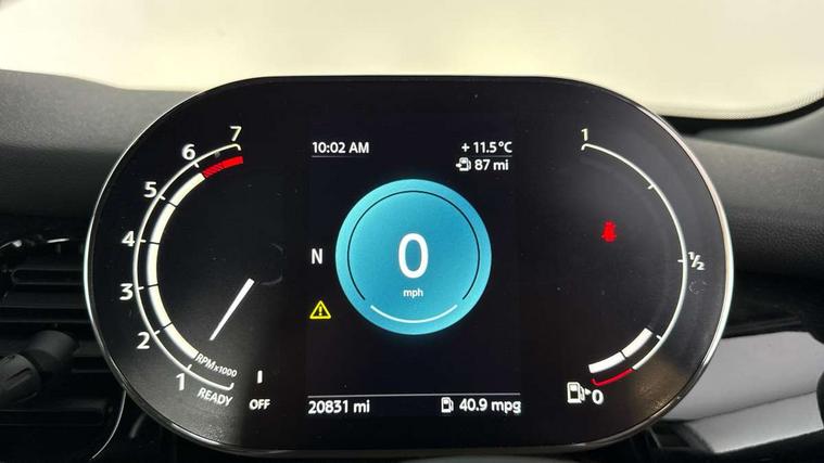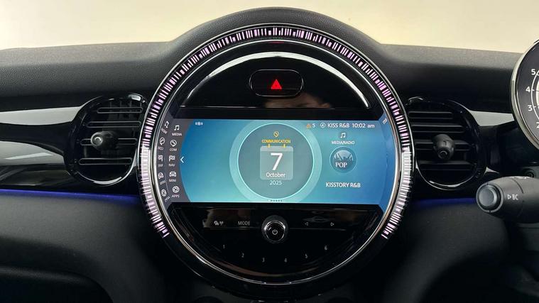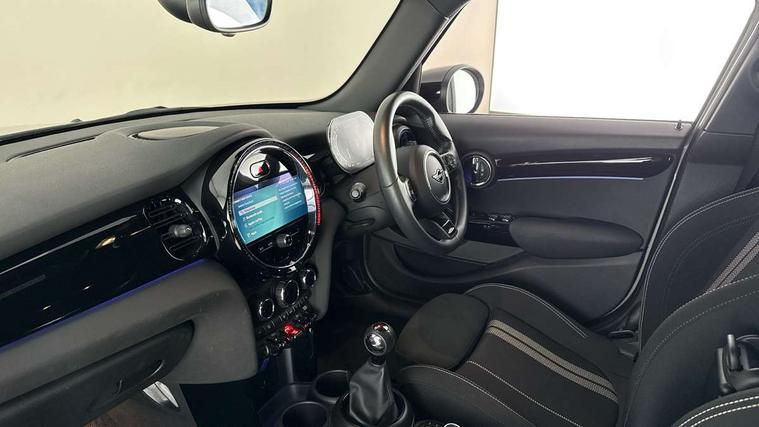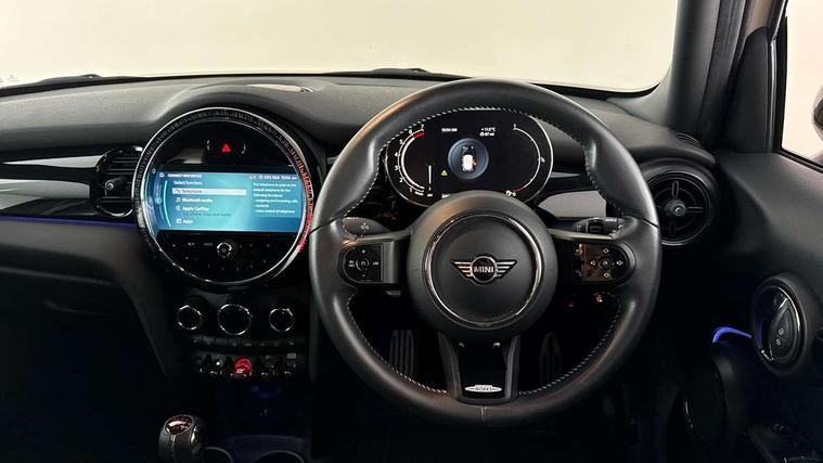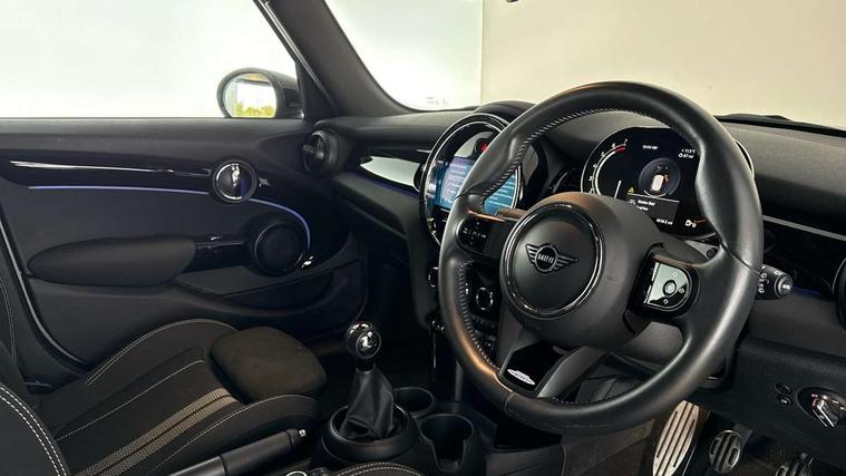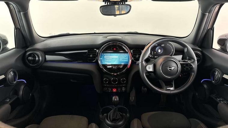 Automatic start/stop function with brake energy recuperation, Compatible mobile phone bluetooth with audio streaming, Cruise control with brake assist, Electro-mechanical speed dependant steering assistance, Flexible car sharing preparation, Instrument cluster, MINI Driving Modes - centre toggle switch to control driving setting (sport, mid and green), Mini E-call, MINI TeleServices, On board computer, Rear park distance control, Service interval indicator, 6 Speed manual transmission including gear change indicator display, Adaptive suspension, Double Vanos system, Fully variable valve control, High precision injection, Performance Control, 6 speakers in front door trims and underneath front seats, 8.8" touchscreen with LED ring, FM tuner and DAB digital radio, Automatic headlight activation switch, Body colour fuel filler cap, Chrome border high gloss black slats radiator grille, Dynamic brake lights, Electric front+rear windows, Exhaust tailpipe on left with chrome finisher, Heated rear window, Heated windscreen washer jets, JCW Aerodynamic kit - Front and rear bumpers with sporty JCW styling and part-painted side sills with MINI John Cooper Works door sill finishers, John Cooper Works rear spoiler, LED headlight with closed ring and daytime driving lights, Metal door sill strips with MINI imprint, Model logo Cooper on right of tailgate, Rain sensor window wipers, Rear fog lights, Rear LED lights with union jack design, Rear window wiper, Side scuttle panel with integrated indicator, Sun/heat protection glass, White indicator lenses, 12V Accessory socket in centre console, 4 lashing eyes in luggage compartment, 60/40 split folding rear seat, Anthracite headliner including grab handles and clothes hooks, Carbon black colour line - Knee roll and door armrest, Chrome interior highlights, Cupholders, Front and rear isofix with front passenger airbag deactivation, Glove compartment, Height and length steering column adjustment, Interior lighting with 12 different colours across the dashboard, underneath door bezel with illuminated laser-engraved design on central display, JCW Sport seats with integrated headrests, adjustable thigh support and John Cooper Works logo, Leatherette gearshift lever and handbrake gaiters, LED reading lights, vanity mirror lights, front foot well light and spotlight on front seats, Manual air conditioning, Mechanical seat adjustment - forward/back & backrest for front seats and driver seat height adjust, Multifunction steering wheel, Storage compartments in doors, Sunvisors with vanity mirrors, Velour floor mats, Walknappa leather steering wheel with grey seam and John Cooper Works badge on Piano Black lower steering wheel spoke, Piano black exterior pack - Mini Hatchback Cooper, 3 point seatbelts on all five seats, 6 Airbags - front, side, head and seat belt tensioners, Anti-lock braking system (ABS), DSC - Dynamic Stability Control, Front and rear disc brakes, Hill start assist, Single tone fanfare horn, Tyre pressure monitoring system, Alarm system with tilt sensor, monitoring doors, bonnet interior and tailgate, Electronic vehicle immobiliser, Start/stop toggle with keyless go, Piano black interior trim, Tool kit,