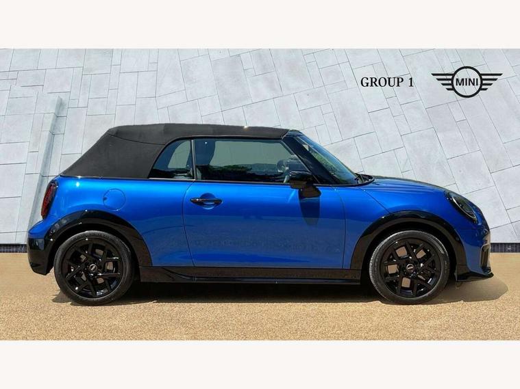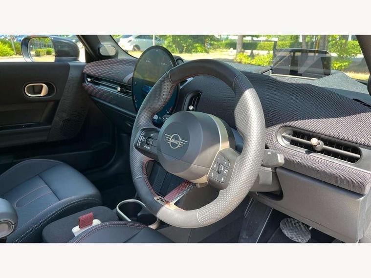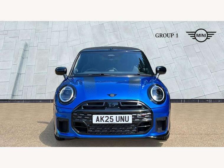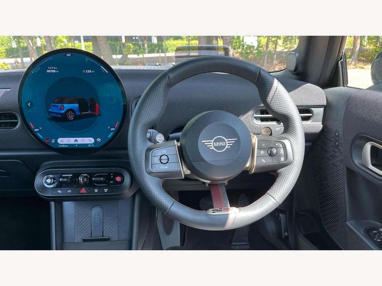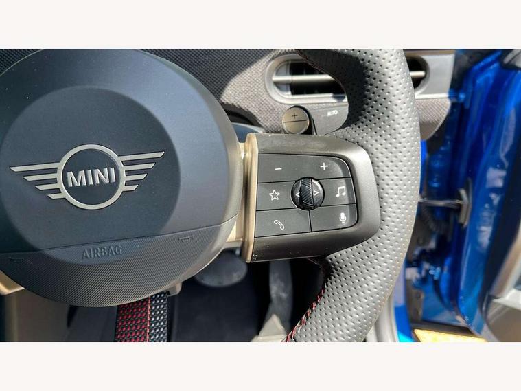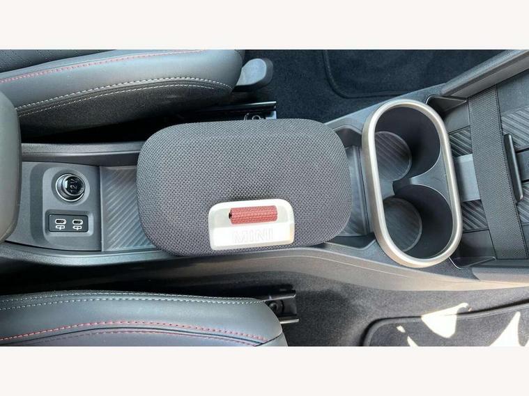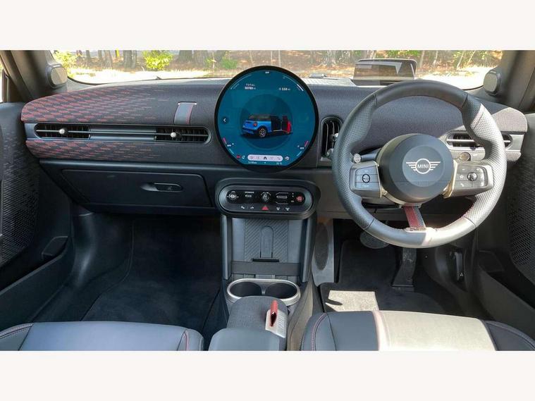 Always open timer, Central toggle bar, Circular OLED Screen, Compatible mobile phone bluetooth with audio streaming, Cruise control, Digital instrument cluster, e-Call (emergency call), MINI Experience Modes, Mini navigation system, On board computer, PAS, Service interval indicator, 7 speed steptronic transmission with double clutch, Adaptive suspension, DAB Digital radio, Personal eSim, Adaptable light signatures, Auto headlights, Electric front windows, Front and rear apron, High gloss hexagonal patterned grille surround, LED 3rd brake light, LED daytime running lights, LED indicator lights, LED rear lights, Logos in Vibrant Silver, Rain sensor window wipers, Rear boot, Rear fog lights, Rear roof spoiler with airblades, Wind deflector, 2 seat bench in second row, 2 zone automatic air conditioning, 60/40 rear seat bench, Ambient lighting, Black lower band in high gloss, Floor mats, Front and rear head restraints, Front compact armrest, Heated steering wheel, Height adjustable passenger seat, Lidded storage box in Black/Red knit, Light headliner, Luggage compartment lighting, Partially perforated vescin steering wheel with red accent, black/red decorative strap, Single front passenger seat, Steering wheel paddle shift, Sunvisors with vanity mirrors, Vescin/Cord combination JCW upholstery includes dash knit in black with red accents, Driving assistant pack - Cooper Convertible, Level 1 pack - Mini Convertible, Park assistant pack - Cooper Convertible, 3 point seatbelts on all four seats, 6 Airbags - front, side, head and seat belt tensioners, Anti-lock braking system (ABS), Brake caliper in Black with JCW badge, DSC - Dynamic Stability Control, Electronic parking brake, Front and rear disc brakes, Front ISOFIX (iSize), Front passenger airbag deactivation, JCW Sport Brakes, Traction control, Tyre pressure monitoring system, Alarm, Immobiliser, Remote central locking, Black/Red decorative dash strap, Tyre repair kit,
