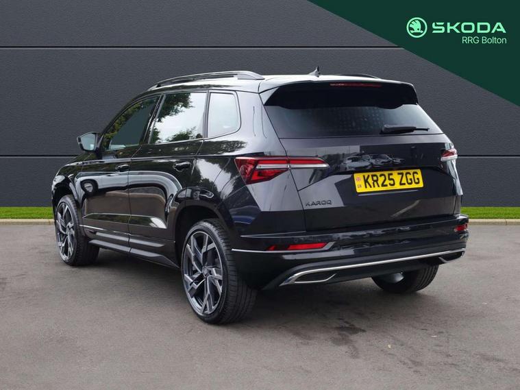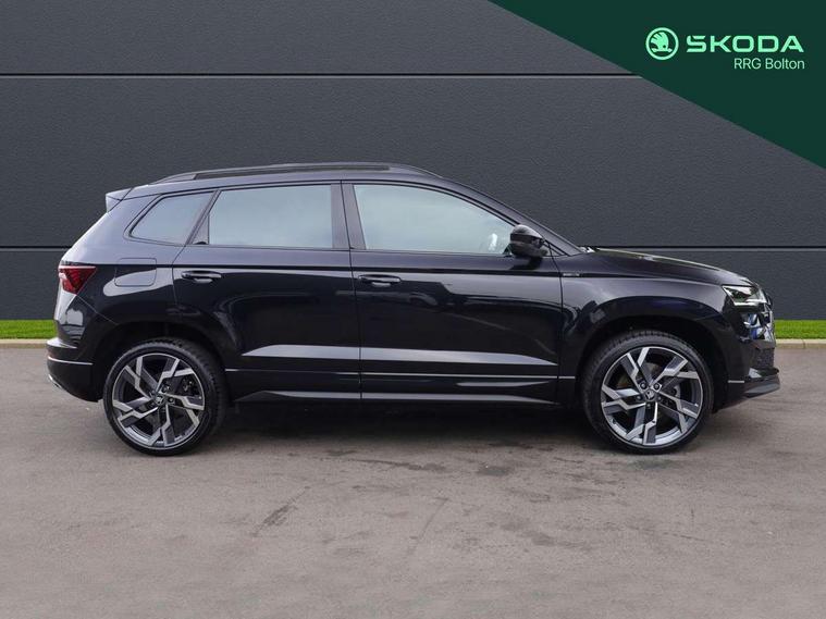 Advanced driver attention and drowsiness monitor, Emergency services call system, Outside temperature gauge, Sensor for driver assistance systems, Service interval indicator, SmartLink wireless for Apple and wired for Android, Start/stop system with regenerative braking, Traffic sign recognition, USB C Port x 2 in front centre console, Virtual Cockpit - 10.25" digital display, Virtual pedal with electrically operated boot door, Wireless smartphone charging, DAB radio with Bluetooth, USB connection, Acoustic glass, Aero front windscreen wipers with intermittent function, Auto dimming rear view mirror with light and rain sensors, Black door mirrors, Black electric window control buttons, Black radiator grille, Black roof rails, Body colour door handles, Electric front and rear windows with child proof lock, Extended rear roof spoiler, Front door steps with SportLine logo, Heated rear windscreen, LED daytime running lights, LED rear lights with high functionality welcome effect and dynamic indicators, Light assistant (coming/leaving home/tunnel light), Panoramic sliding sunroof, Plastic scuff plates in door apertures, Privacy glass, Protective door side sills in body colour, Rear diffuser, Rear side wing doors, Rear window wiper with washer system and intermittent control, Safety reflectors on front doors, Skoda lettering on tailgate in black, Sportline badge on front fender, Sports front and rear bumpers, Third brake light, Unique dark chrome design logo on alloy wheels, 1.5 litre bottle holders in driver and front passenger door panels, 12V socket in boot, 12v socket in front centre armrest with storage compartment and rear air vents, 2 x Tablet holder, 3 rear height adjustable headrests, 3 seat bench in 2nd row, 3 spoke sports leather heated multifunction steering wheel with DSG paddles, 4 foldable roof handles with rear coat hooks, Black floor carpet, Cargo elements in boot, Chrome inner door handles, Foldable hooks in the boot, Front head restraints, Height adjustable front three point seats belts with tensioners, Height/reach adjust steering wheel, Ice scraper, Illuminated glovebox, Illuminated luggage compartment, Isofix child seat preparation for front passenger seat, Isofix child seat preparation outer rear, Manual lumbar support for front seats, Pen holder, Pollen filter, Rear backrest release from boot, Rear boot cover, Rear package tray, Rear reading lights, Rear seats fixed folding and divided 60:40, Rubbish bin door, Safety vest holder, Single front passenger seat, Skoda lettering on steering wheel, Sportline decorative inserts, Storage box in upper central dashboard closed, Sunvisors with illuminated vanity mirrors, Textile floor mats, Ticket holder, Titan black interior ceiling, Umbrella under passenger seat, Under passenger seat storage compartment, Columbus pack - Karoq, LED Interior lighting pack with Skoda welcome logo - Karoq, Light Pack - Karoq, Non Smokers pack, Performance pack - Karoq, Winter plus pack with heated front and rear seats - Karoq, Automatic door unlocking in case of crash, Automatic fuel cut off in case of crash, Driver airbag, Electronic parking brake with auto hold function, Emergency rear braking signal, ESC (incl. ABS+MSR+ASR+EDS+HBA+DSR+RBS+MKB), Front side airbags, Head airbags, Hill hold control, Knee airbags, Passenger airbag with switch-off function, Pedestrian monitor, Seatbelt reminder signalisation and pretensioner for all seats, Three point seatbelts rear, Two tone horn, Tyre pressure monitor, Alarm with interior monitoring, back up horn and tilt sensor with safe function, Electronic engine immobiliser, Keyless entry and start/stop, Remote central locking with 2 remote folding keys, Black air vent surround, Black centre console, carbon door decor, Satin black dashboard, Satin black door trim, 19" Sagittarius anthracite alloy wheels, Anti-theft wheel bolts protection, Breakdown and tool kit,