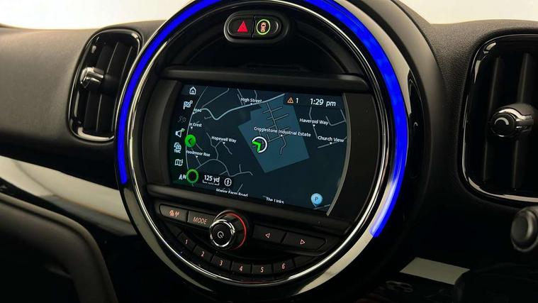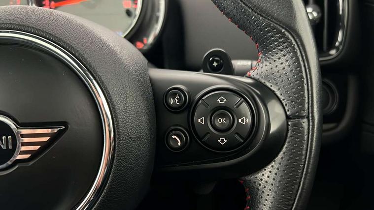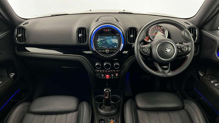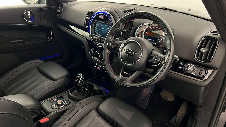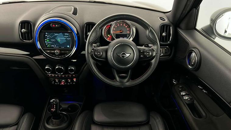 Apple CarPlay preparation, Brake pad wear indicator warning light, Central display with LED ring and 6.5" colour touch screen, Connected driver, DTC - Dynamic traction control, Exterior temperature gauge, Intelligent emergency call, MINI remote services, MINI TeleServices, Navigation system, On board computer, Personal Profile, Real time traffic information, Service interval indicator, Servotronic speed sensitive power steering, Electronic differential lock, Performance Control, Auxiliary input socket, DAB digital radio module, MP3 compatible radio/single CD player, Radio visual boost, Anti dazzle rear view mirror, Body colour scoop integrated into engine- compartment lid, Chrome door handles, Chrome headlight surround, Chrome plated radiator grille, Chrome side scuttle, Chrome window surround, Electric front windows + one touch + anti-pinch, Electrically adjustable door mirrors, Follow me home headlights, Green tinted glass, Heated door mirrors/heated windscreen washers, Heated rear window with automatic switch off, Metal look door sill finishers, Rain sensor including auto headlights activation, Rear wiper, Roof spoiler, Twin chrome exhaust tailpipes, White indicator lights, 12V power point front, 2 cupholders in front centre console, 4 lashing points to secure luggage, 40:20:40 split folding rear seats, Centre console storage box, Chrome interior door handles, Driver/passenger sunvisors, Front and rear headrests, Front interior light, Front passenger grab handle, Front seat backrest storage nets, Gearshift paddles, Heater with recirculation function, Height/reach adjust steering wheel, Isofix rear child seat preparation, Luggage compartment lighting, Multifunction steering wheel, Rear grab handles, Sensatec gearshift and handbrake, Sport front seats, Storage compartments in doors, Toolkit in luggage compartment, Interior lights pack - Countryman, MINI Excitement Pack - Countryman, 3 point automatic seatbelts, 3 point seatbelts on all rear seats, ABS, Cornering brake control (CBC), Crash Sensor - activates hazard/interior lighting + unlocks doors, Driver and passenger airbags, Driver and passenger side airbags, DSC - Dynamic Stability Control, Electronic brake force distribution, Electronic parking brake, Front curtain airbags, Front passenger airbag deactivation, Fuel cut off safety device, Hill start assist, Pyrotechnically pre-tensioned front seatbelts, Tyre pressure warning, Automatic door locking, Keyless Start, Locking wheel bolts, RF remote control central locking, Second remote key, Thatcham category 1 alarm + immobiliser,