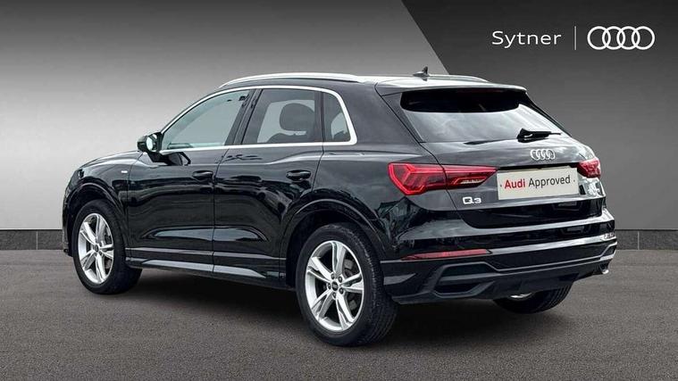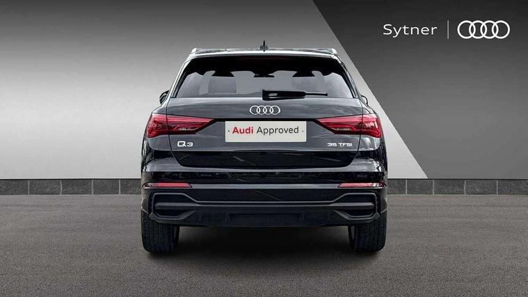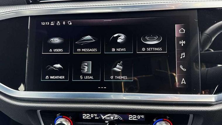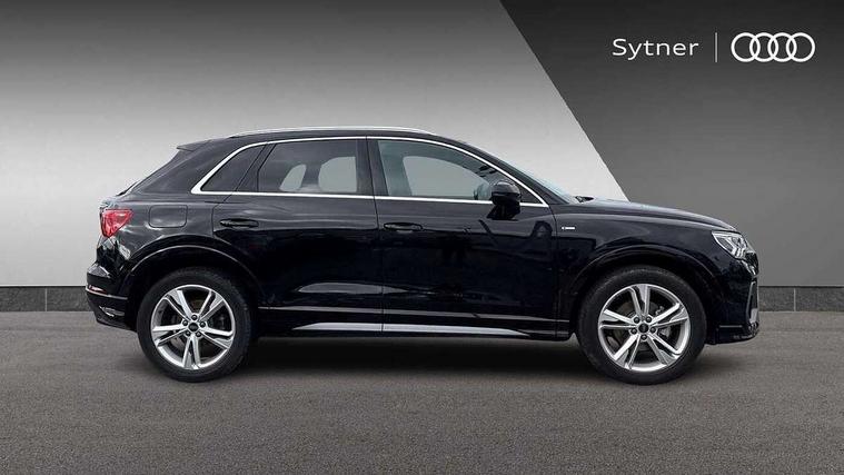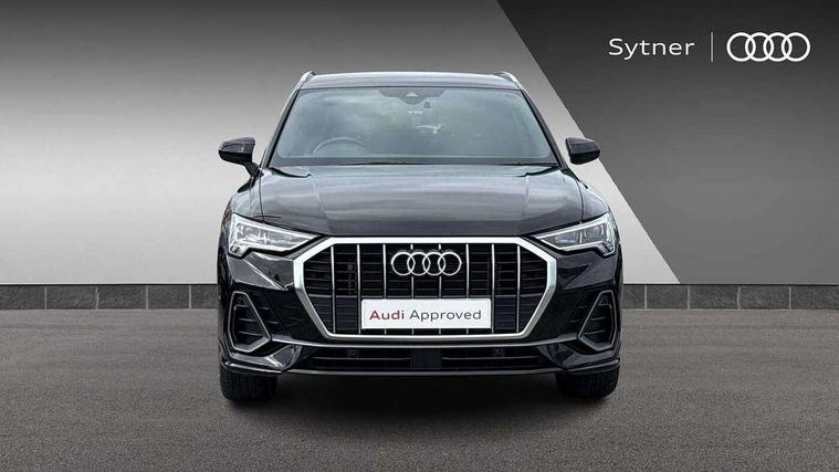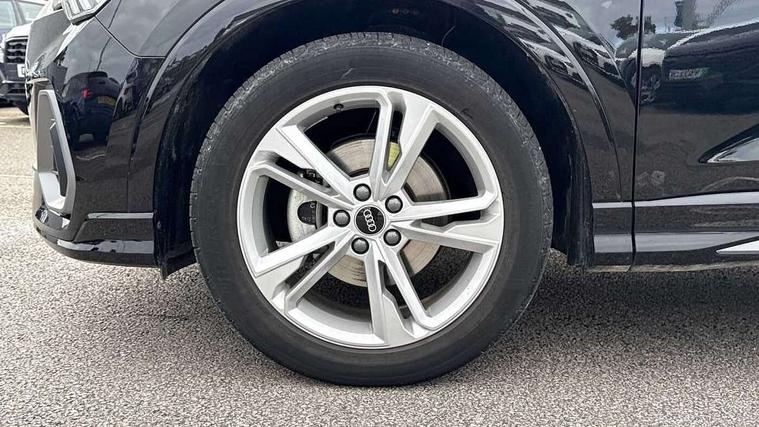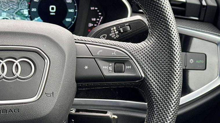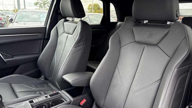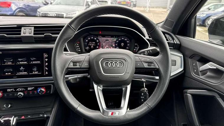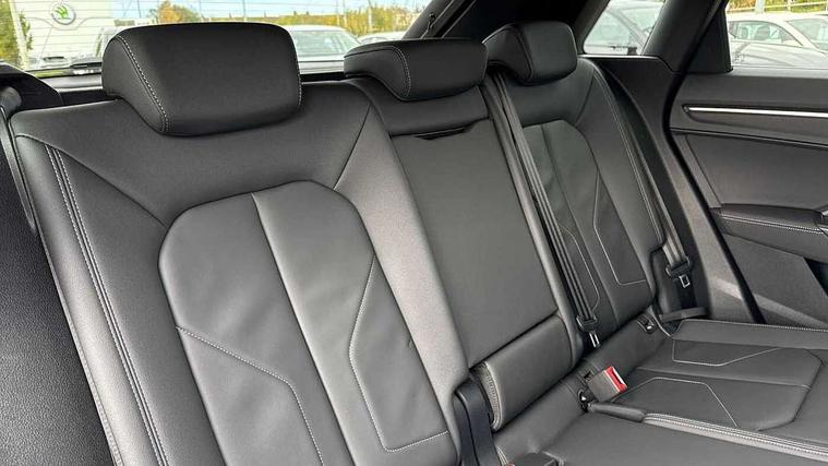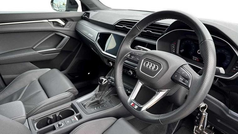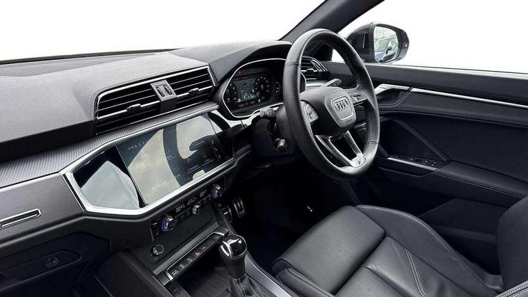 Amazon alexa Integration, Audi drive select, Audi lane departure warning, Audi smartphone interface includes wireless Apple carplay/Android Auto, Audi Virtual Cockpit - 10.25" display, Bluetooth interface, Camera based traffic sign recognition, Legal emergency call, MMI Navigation Plus with high resolution 10.1 inch touchscreen colour display, Power operated tailgate, Progressive steering, Service interval indicator, Start stop system with recuperation, Voice control system with natural language interaction, Sports suspension, 2 USB-C ports with charge and data functions, 6 passive loudspeakers, DAB digital radio module, Acoustic windscreen, Aluminium roof rails, Aluminium window trim, Anthracite black radiator grille, Auto dimming frameless rear view mirror, Body colour front spoiler blade, Body coloured bumpers, Electrically folding, adjustable and heated door mirrors with integrated LED side indicators and kerb view function for passenger side, Front and rear electric windows, Front fog lights, Front side air inlets in matt platinum grey, Grille vertical bars in aluminium silver/Matt, High gloss black finish B and C pillars, LED Dynamic rear indicators, LED headlights with LED daytime running lights, LED rear lights, LED third brake light, Privacy glass dark tinted rear and rear-side windows (from B-pillar backwards), Rain and light sensors, Rear diffuser grille in grained matt black, Rear diffuser strip in matt anthracite black, Rear side wing doors, Rear wiper, S line badges on front wings, S Line front and rear bumpers, Side skirt insert in matt Platinium grey, Variable front intermittent wipers, 12V socket in rear centre console, 3 seat bench in 2nd row, 3 spoke leather multifunction steering wheel features S badging and grips in perforated leather with contrast stitching, 40:20:40 folding with manual adjustment for 60:40 forwards/backwards position and backrest angle, Adjustable rear seat bench/backrest with centre armrest and cupholder, Black cloth headlining, Dual zone electronic climate control, Front and rear black floor mats with contrast stitching in rock grey, Front and rear headrests, Front and rear roof module including reading lights, Front centre armrest, Glove compartment lighting, Height and reach adjustable steering wheel, Illuminated door sill trims with S logo, ISOFIX child seat mounting for front passenger with airbag deactivation and outer rear seat including top tether attachment point for outer rear seats, Luggage compartment light, Manual front seats with height adjustment, Perforated leather gearknob, Single front passenger seat, Stainless steel luggage compartment sill finisher, Stainless steel pedals, Ambient lighting pack - Q3, Non smoking pack - Q3, 3x3 point rear seatbelts, 6 airbags - Driver, front passenger, curtain and side windows, Audi pre-sense front with pedestrain and cyclist recognition, Electrically operated child locks on rear doors, Electromechanical parking brake, Electronic stabilisation control including ABS, ASR and EDL, Front seatbelt reminder, Hill descent control, Hill hold assist, Pre sense basic, Seatbelt monitoring, Tyre pressure warning, Warning triangle and first aid kit, Anti theft alarm, Anti theft wheel bolts, Immobiliser, Remote central locking, Aluminium look interior elements, Dark matt brushed aluminium inlay, Detail dashboard around MMI touch colour display in glass look, black with surround in aluminium look, Leatherette door armrest,