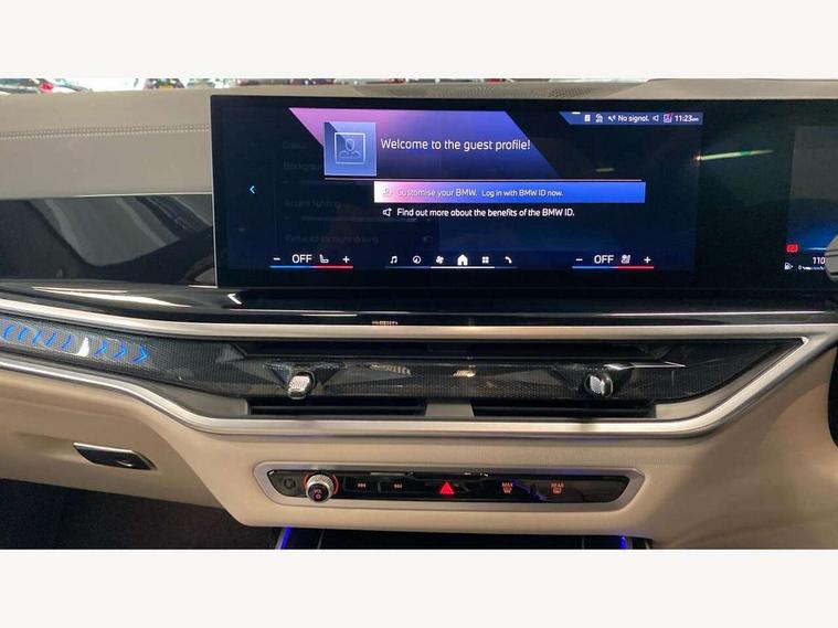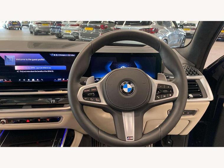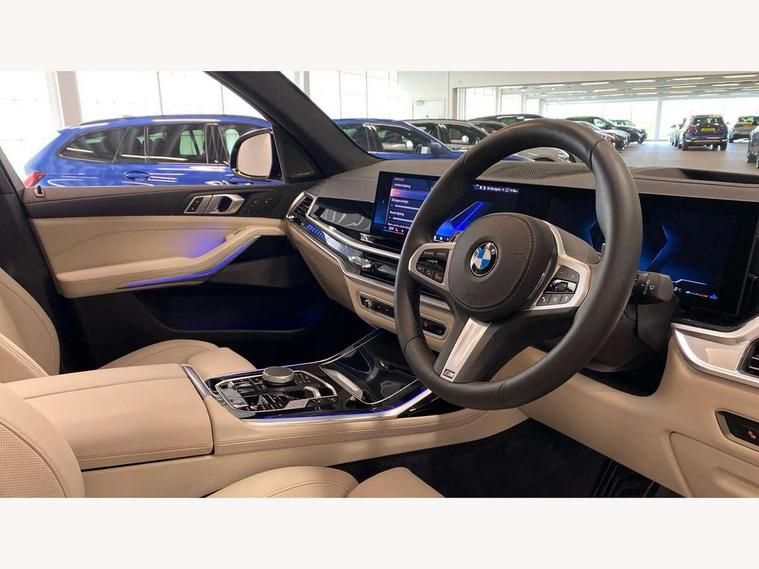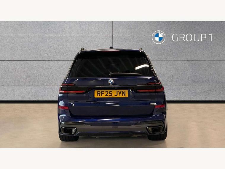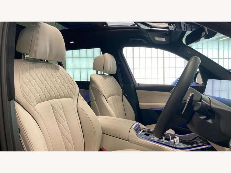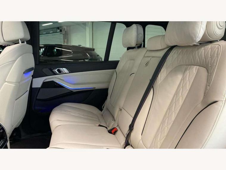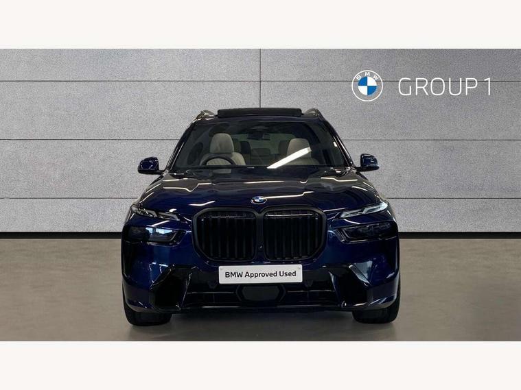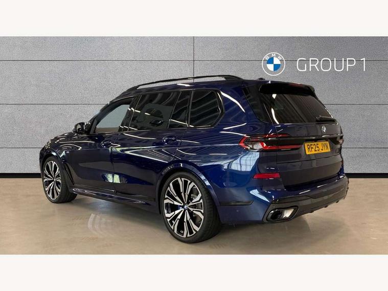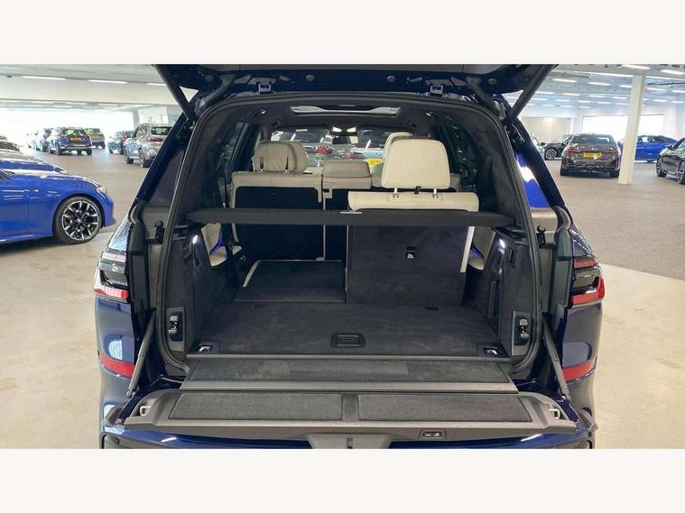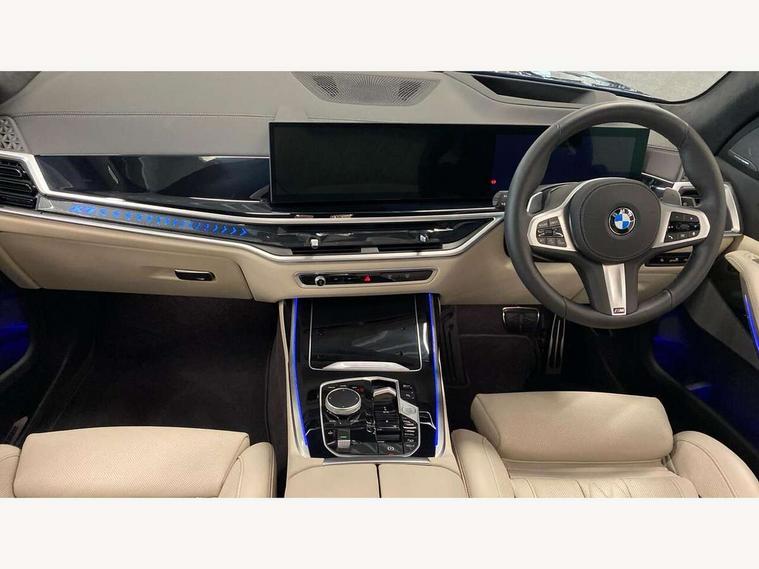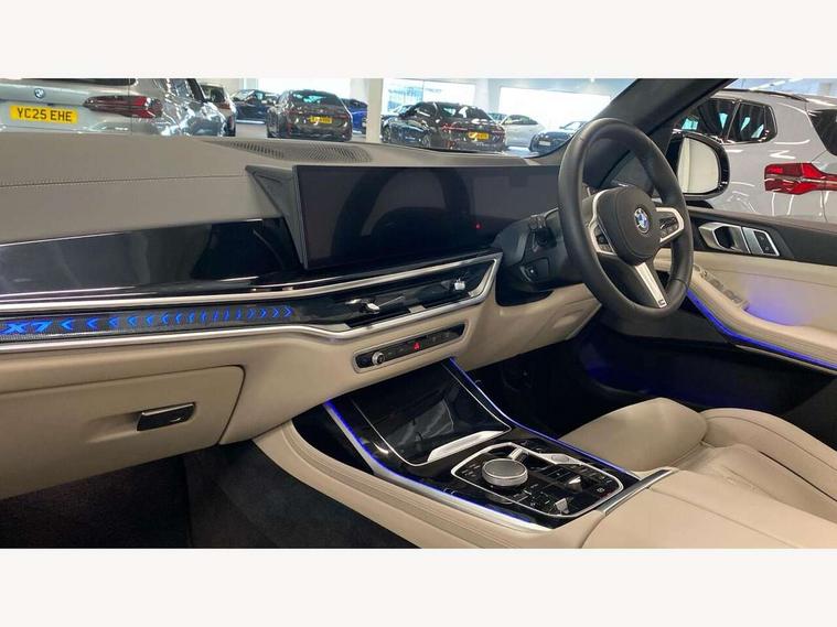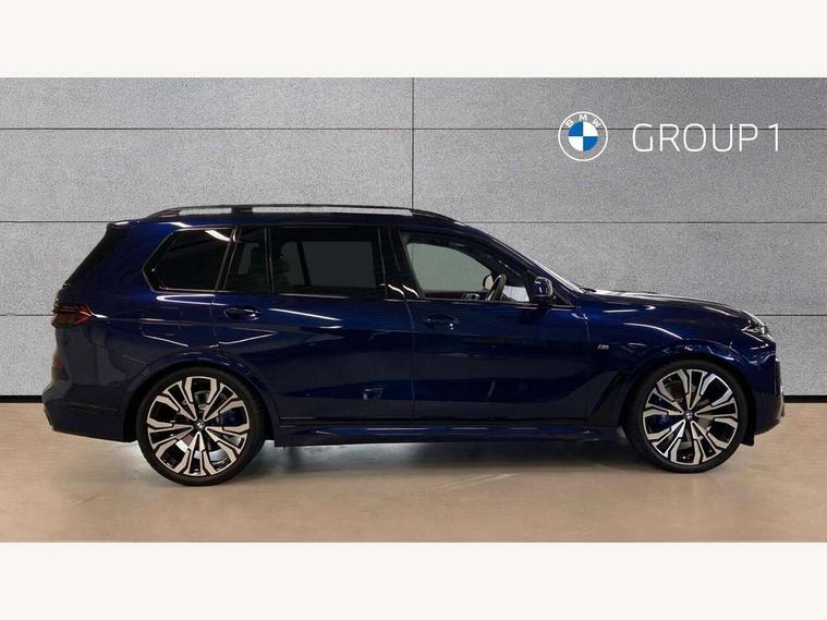 2 rear USB-C ports, Attentiveness assist, Automatic start/stop function, Automatic tailgate operation, BMW ConnectedDrive online services, BMW Drive recorder, BMW gesture control, BMW Teleservices, Brake pad wear indicator in front and rear, Condition based service, Integrated owner's handbook, Live Cockpit Professional with head up display including 12.3" instrument cluster and 14.9" central display, Parking assistant pro including reversing assistant, PDC, lateral parking aid, reversing assist camera, parking drive off monitoring, 48V Mild hybrid technology, 8 speed automatic with steptronic transmission including automatic hold function and gearshift paddles on the steering wheel, Drive experience switch with comfort mode + ECO PRO + sport mode, Permanent all wheel drive, 2x Front USB (1x USB-C, 1x USB-A), DAB radio, Personal eSim, Acoustic glazing, Adaptive air flap control bars in high gloss black, Air breather and door claddings in high gloss chrome, Body coloured wheel arches, Dynamic brake lights with LED technology, Electrically adjustable and heated aspheric folding side mirrors with auto dimming, electric fold in function, automatic parking function, Exterior and central air inlets in front bumper painted pearl chrome, Follow me home headlight function, Frameless interior mirror, Front and rear electric windows, Heated windscreen washer nozzles, High beam assist, High gloss black shadow line roof rails, High gloss black shadowline trim in side/window frame, window recess cover, window guide, B and C pillar, mirror triangle, mirror base, mirror frame, Integrated turn indicators, LED daytime running lights, LED rear lights, LED third brake light in rear spoiler, Rain sensor with automatic headlight activation and windscreen wiper control, Rear side wing doors, Sump guard front and rear painted in silver, Trailer stabilisation logic, 12V - Power sockets with 2x centre console and 1x luggage compartment, 2 seat bench in 3rd row, 2x cupholders in front, rear centre armrest and two in third row seats, 3 seat bench in 2nd row, 3 spoke M leather multifunction steering wheel, 40:20:40 split folding rear seat backrests, Ambient lighting strip in the instrument panel with illuminated, Armrest in front centre console, Compartment in front of cupholder, Driver and front passenger sunvisors with illuminated vanity mirrors and ticket holder, Electrical steering column with adjustable height and length with activation and control on the steering column, Entry sills with illuminated M inscription, Fold down flush into floor of luggage compartment 50:50, Front and rear colour co-ordinated with all standard carpet colours, Front and rear door pockets, Front and rear side armrests integrated into door trim, Front seat back pockets, Grab handles, Height adjustable front headrests, Height adjustable rear headrests, Lockable glove compartment, Nano filter, Single front passenger seat, Soft close doors, Storage tray and compartment with lid in centre console, Wireless charging tray, Additional storage compartment pack - X7, Ambient light interior pack - X7, Connected Package Professional - X7, Interior lighting pack - X7, Luggage compartment pack - X7, M aerodynamics pack - X7, M Sport pack - X7, 3 point seatbelts on all seats, front pyrotechnic belt tensioners, stopper and belt force limiters, front and outer rear seats, Acoustic protection for pedestrians, Active protection, Airbag - Front driver and passenger, side airbags and Head airbags, Anti lock braking system (ABS) with cornering brake control, Automatic Stability Control (ASC), BMW emergency call, Child seat ISOFIX attachment rear outer seats in 2nd row and both seats in 3rd row includes top tether, Comfort access system with digital key, Comfort cushion seats for outer seats in 2nd row, Crash sensor inclu activation of airbags, interior light, safety battery terminal clamp, hazard warn flasher, unlock doors, deactivation of fuel pump, DSC - Dynamic Stability Control, Dynamic Traction Control - DTC, Electromechanical parking brake with automatic drive away release and auto hold function, Front and rear brake discs with interior ventilation, Hill descent control, Integrated braking system, Manual child lock in rear doors, PC iBrake PostCrash approach control warning with light braking function, Tyre pressure monitoring system, Tyre pressure sensors, Variable torque distribution, Warning triangle and first aid kit, Alarm, Central locking including 2 vehicle keys with integrated emergency key, Engine immobiliser, Locking wheel bolts, Galvanic embellisher for controls,