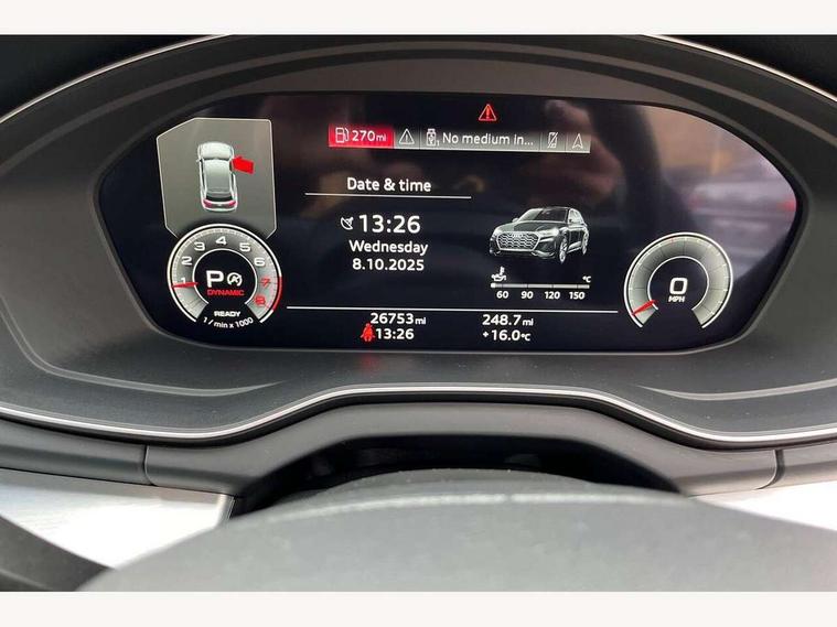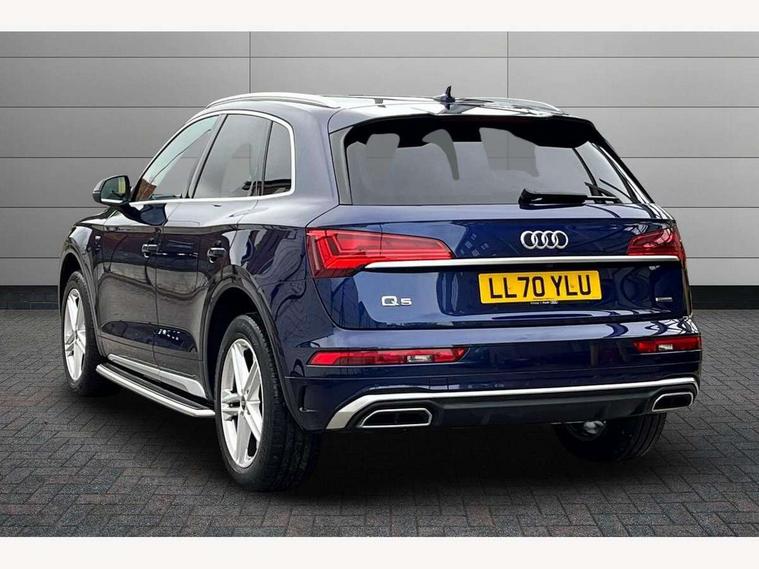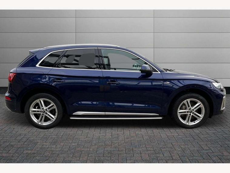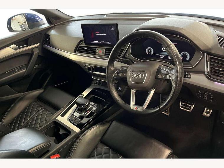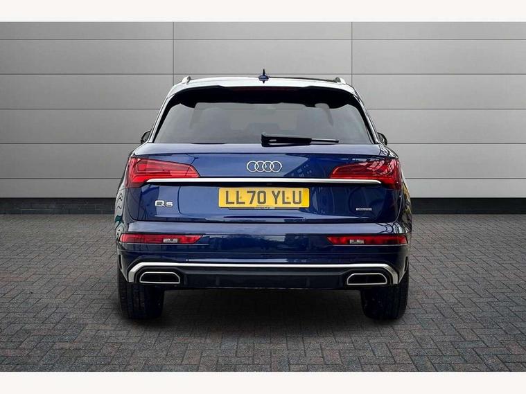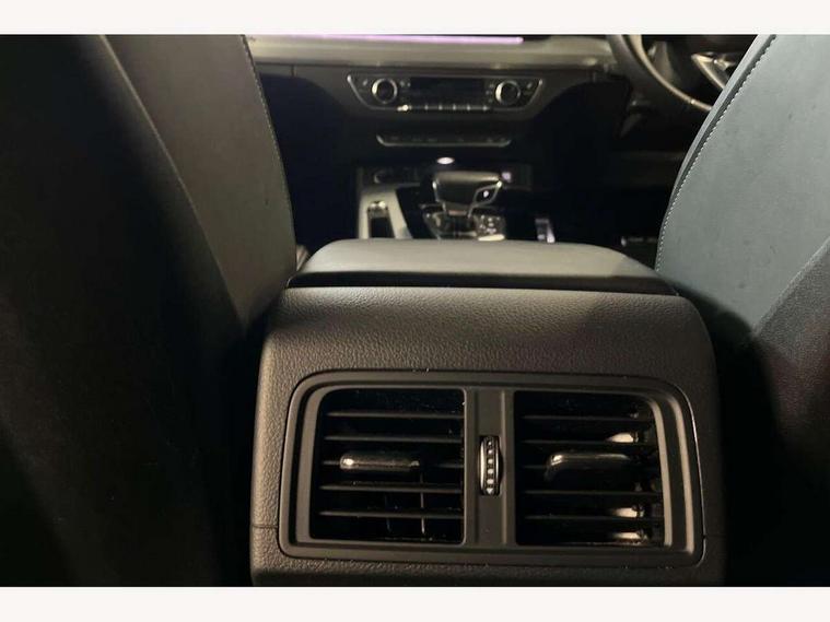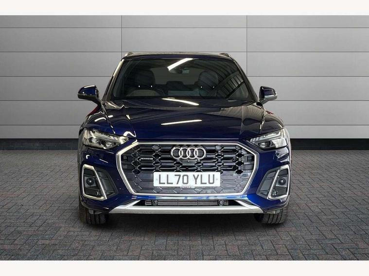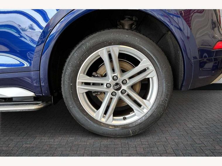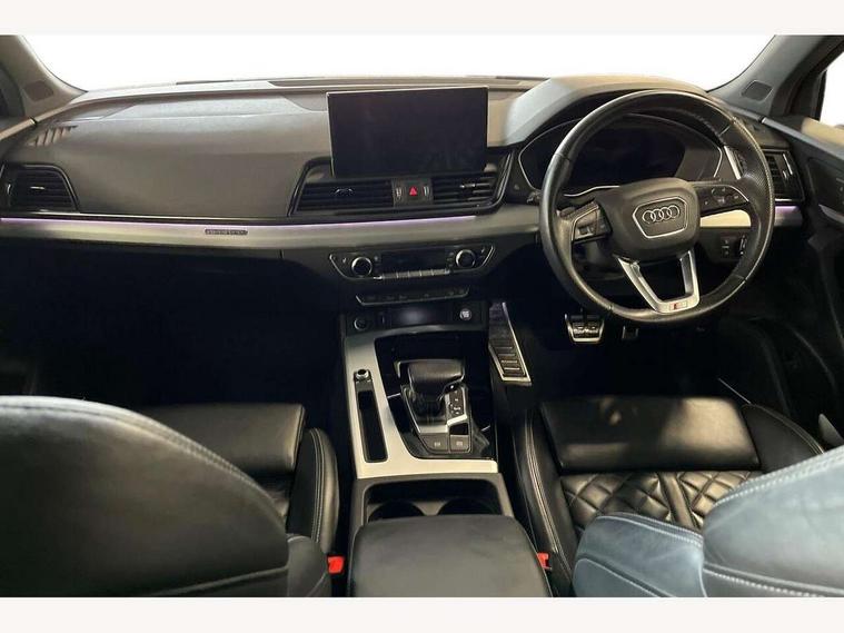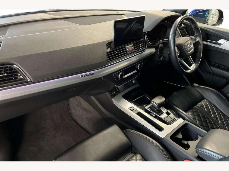 Amazon alexa Integration, Audi connect safety and service (e-call), Audi drive select, Audi virtual cockpit plus with 12.3" screen and three different layout designs, Audi wireless smartphone interface, Automatic start-stop system with coasting functionality and efficiency programme, Electro - mechanical power assisted steering, MMI navigation plus with 10.1" touch screen, Mobile telephone preparation - bluetooth interface, Power tailgate, Service interval indicator, Voice control system with Audi hotword activation "Hey Audi", Quattro on demand, DAB Digital radio, Acoustic windscreen, Air inlets in matt titanium black with blades in matt aluminium silver, Aluminium roof rails, Audi matrix LED headlights with LED rear lights + dynamic front and rear indicators, Auto dimming rear view mirror, Automatic headlight adjustment, Automatic headlights and windscreen wipers, Body colour bumpers, Body colour door mirrors, Body colour rear diffuser with matt aluminium silver surrounds, Body colour underbody protection, Chrome plated exhaust trims, Door sills in Selenite silver, Electric adjustable/heated/folding door mirrors, Front air inlet surrounds in aluminium, Front and rear electric windows, Front radiator grille in honeycomb design, Headlight washers, Rear chrome trim strip below lights, Rear privacy glass and rear side windows, Rear spoiler, Rear wiper, Roof bars, S Line badges on the front wings, S Line front and rear bumpers, S Line side skirts, 2 x USB charging port with aux input socket, 3 rear headrests, 40:20:40 split folding rear seat with rear centre armrest, Black cloth headlining, Contrast stitching on seats, steering wheel and gear lever gaiter, Deluxe 3 zone electronic climate control, Front centre armrest, Front sport seats with S embossed logo, Front/rear floor mats, Gear lever in black leather, Heated front seats, Height adjustable front head restraints, Height/reach adjustable steering column, Illuminated door sill trims with S logo, ISOFIX child seat mounting and top tether, Manual seat adjustment with 4-way electric lumbar support, Removable luggage compartment floor, Stainless steel pedals, Sunvisors with vanity mirrors, Tool kit, Trunk roller cover, High gloss pack - Q5, LED interior light pack - Q5, 3 point seatbelts on all seats, 6 airbags - Driver, front passenger, curtain and side airbags, Electrically operated child locks on rear doors, Electromechanical parking brake, Electronic stabilisation control including ABS, ASR and EDL, Front passenger airbag deactivation, Hill descent control, Hill hold assist, Multi collision brake assist, Pop-up bonnet for pedestrian protection, Pre sense city, Seat belt force limiter, Seatbelt monitoring, Tyre pressure warning, Warning triangle and first aid kit, Anti theft alarm, Anti-theft wheel bolts, Keyless Go access/ignition system, Matt brushed aluminium inlays,