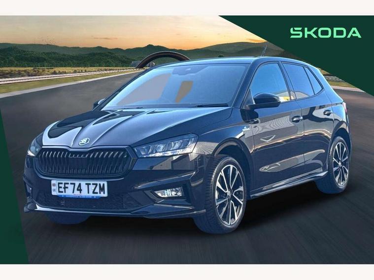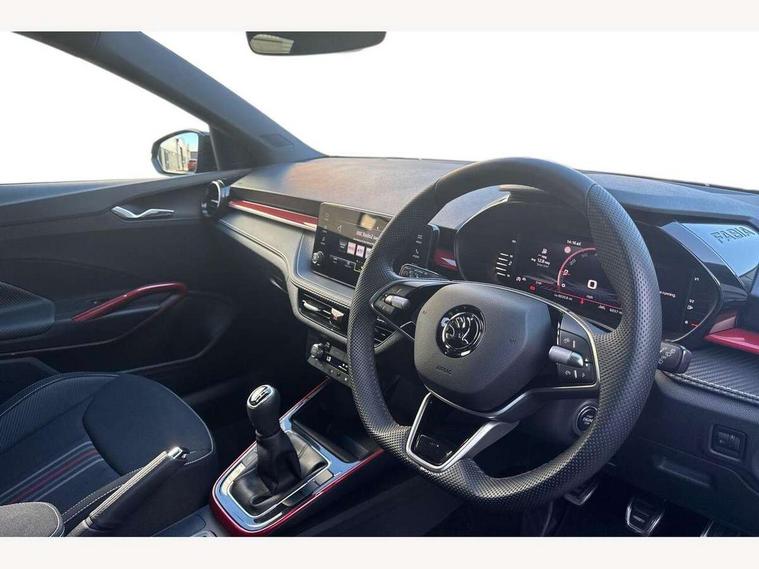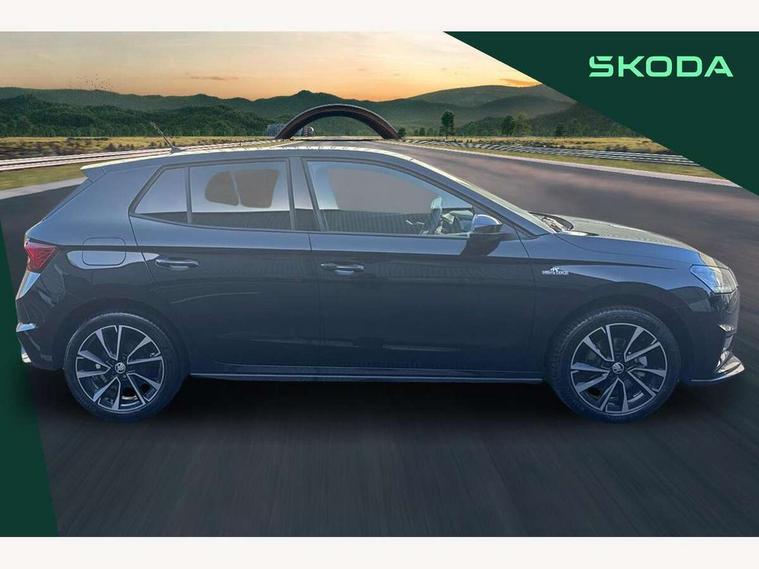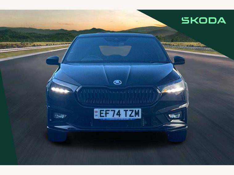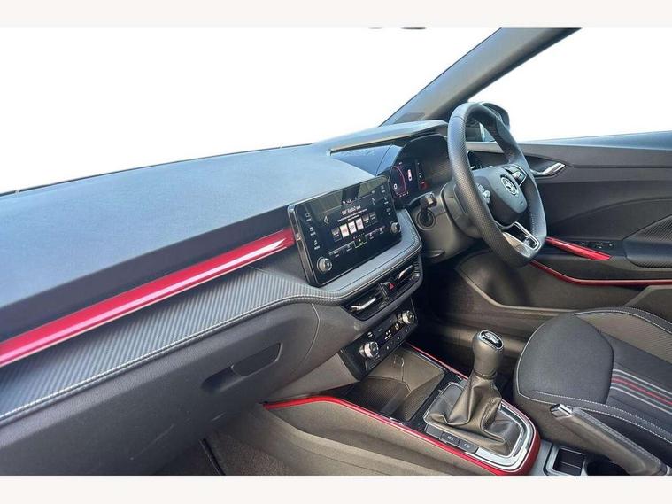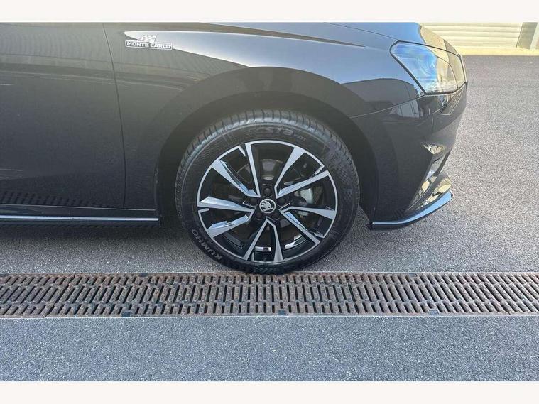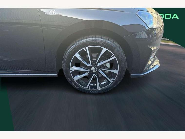 Advanced driver attention and drowsiness monitor, Bluetooth connection, Electromechanical power steering, Exterior temperature gauge, Service interval indicator, Traffic sign recognition, Virtual cockpit with 10.25" colour display, Wireless SmartLink for Apple CarPlay and Android Auto, 6 Speakers (4 in front and 2 in rear), Auxiliary socket for external MP3 player, DAB digital radio reception, Auto dimming rear view mirror, Black radiator grille, Body coloured bumpers, Door mirror integrated indicators, Front and rear electric windows, Front window wiper intermittent control, Headlight range control - Automatic, Ice scraper in fuel cap, LED daytime running lights with coming and leaving home feature, LED rear lights, Monte Carlo badging, Privacy glass, Rear LED fog light, Rear side wing doors, Rear window wiper with washing nozzles, Roof mounted spoiler, SKODA tailgate lettering in black, Sports bumpers, Third brake light, 2 reading lights in front and 2 reading lights in rear, 3 rear headrests, Aluminium pedals, Backrest split and folding, Black headlining, Central console with removable cup holder and storage box, Chrome handbrake release button, Door sills with fabia badging, Dual zone air conditioning with climatronic electronic control, Fabric/artificial leather upholstery, Front centre armrest, Front sports seats, Gearshift knob/handle in leather, Hand brake lever handle in leather, Height adjustable front headrests, Height adjustable front seats, Height adjustable steering wheel, ISOFIX and TopTether anchorage points to the outer rear seats, ISOFIX and TopTether on the front passenger seat, Luggage compartment lighting, Manually adjustable lumbar support in front seats, Metallic painted red central console cover, Metallic red interior door handles, Pollen filter, Rear seat bench unsplit, Single front passenger seat, Sun visors with mirror and airbag label on passenger side, Textile floor mats, Ticket holder, Umbrella in drivers door, 3-point height adjustable front seats belts with pretensioner and force limiter, Automatic warning lights in case of crash, Driver and passengers airbag with switch off function, e-Call+, ESC including ABS, MSR, ASR, EDS, HBA and XDS, Front and rear seat belt warning, FRONT ASSIST (AEB City and AEB Inter Urban), Front side airbags, Head airbags, One tone horn, Pedestrian protection, Three rear 3-points safety seat belts with pretensioner and force limiter including stop function for outer rear seat belts, Tyre pressure monitoring system, Anti-theft alarm system including immobiliser, interior monitoring, backup horn, and towing protection, Central locking with radio remote control, interior controls, SAFE function and 2 foldable keys, Carbon effect door and side trim panels, Carbon effect lower decorative trim with white stitching, Monte carlo air vents, Red metallic upper decorative trim, Anti-theft wheel bolts protection, Super-low rolling resistance tyres,