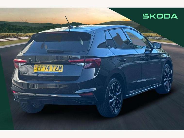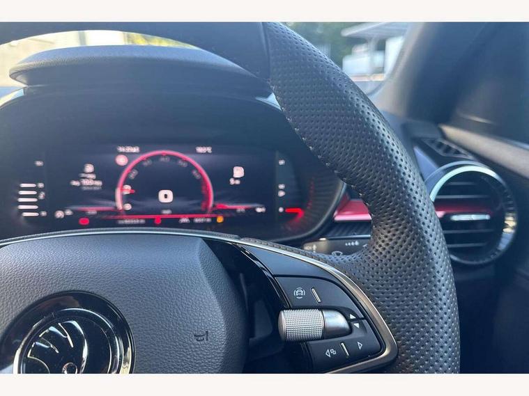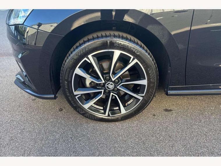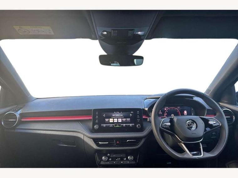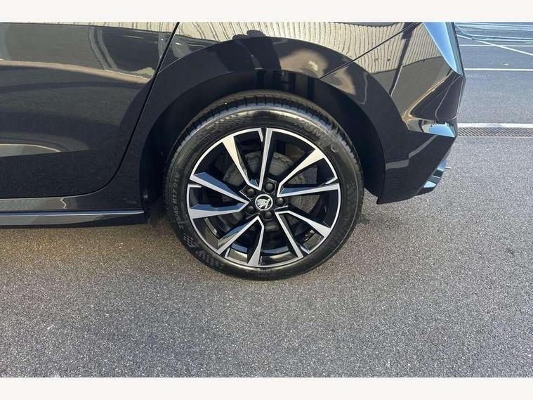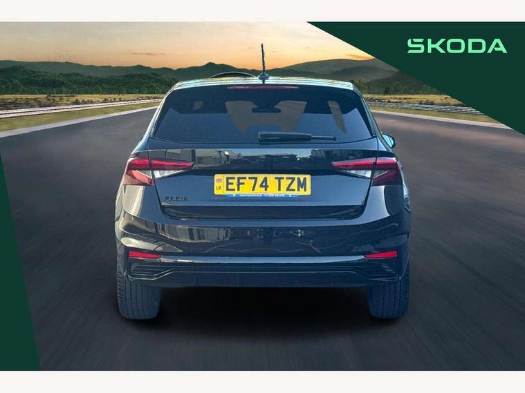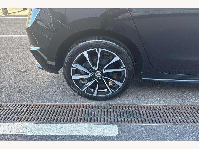 Advanced driver attention and drowsiness monitor, Bluetooth connection, Electromechanical power steering, Exterior temperature gauge, Service interval indicator, Traffic sign recognition, Virtual cockpit with 10.25" colour display, Wireless SmartLink for Apple CarPlay and Android Auto, 6 Speakers (4 in front and 2 in rear), Auxiliary socket for external MP3 player, DAB digital radio reception, Auto dimming rear view mirror, Black radiator grille, Body coloured bumpers, Door mirror integrated indicators, Front and rear electric windows, Front window wiper intermittent control, Headlight range control - Automatic, Ice scraper in fuel cap, LED daytime running lights with coming and leaving home feature, LED rear lights, Monte Carlo badging, Privacy glass, Rear LED fog light, Rear side wing doors, Rear window wiper with washing nozzles, Roof mounted spoiler, SKODA tailgate lettering in black, Sports bumpers, Third brake light, 2 reading lights in front and 2 reading lights in rear, 3 rear headrests, Aluminium pedals, Backrest split and folding, Black headlining, Central console with removable cup holder and storage box, Chrome handbrake release button, Door sills with fabia badging, Dual zone air conditioning with climatronic electronic control, Fabric/artificial leather upholstery, Front centre armrest, Front sports seats, Gearshift knob/handle in leather, Hand brake lever handle in leather, Height adjustable front headrests, Height adjustable front seats, Height adjustable steering wheel, ISOFIX and TopTether anchorage points to the outer rear seats, ISOFIX and TopTether on the front passenger seat, Luggage compartment lighting, Manually adjustable lumbar support in front seats, Metallic painted red central console cover, Metallic red interior door handles, Pollen filter, Rear seat bench unsplit, Single front passenger seat, Sun visors with mirror and airbag label on passenger side, Textile floor mats, Ticket holder, Umbrella in drivers door, 3-point height adjustable front seats belts with pretensioner and force limiter, Automatic warning lights in case of crash, Driver and passengers airbag with switch off function, e-Call+, ESC including ABS, MSR, ASR, EDS, HBA and XDS, Front and rear seat belt warning, FRONT ASSIST (AEB City and AEB Inter Urban), Front side airbags, Head airbags, One tone horn, Pedestrian protection, Three rear 3-points safety seat belts with pretensioner and force limiter including stop function for outer rear seat belts, Tyre pressure monitoring system, Anti-theft alarm system including immobiliser, interior monitoring, backup horn, and towing protection, Central locking with radio remote control, interior controls, SAFE function and 2 foldable keys, Carbon effect door and side trim panels, Carbon effect lower decorative trim with white stitching, Monte carlo air vents, Red metallic upper decorative trim, Anti-theft wheel bolts protection, Super-low rolling resistance tyres,