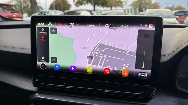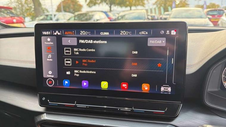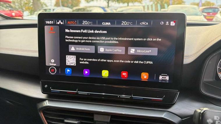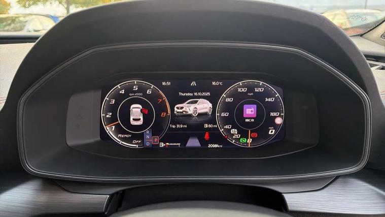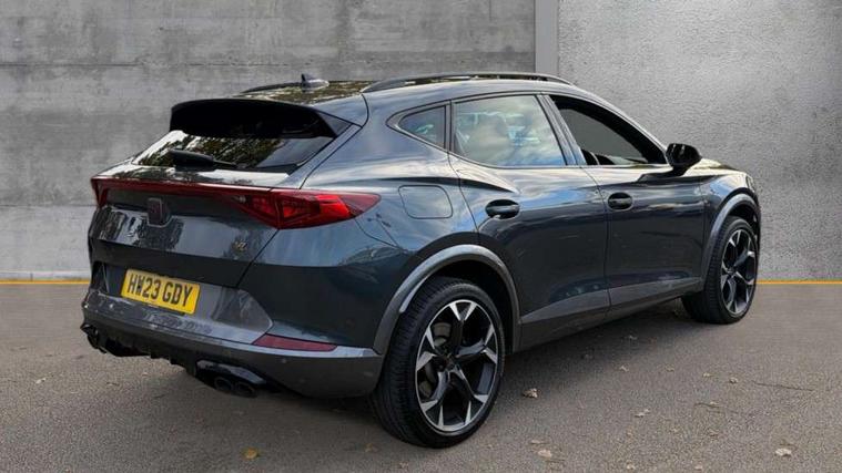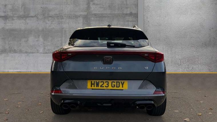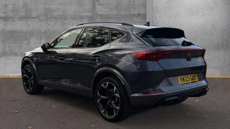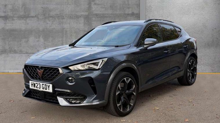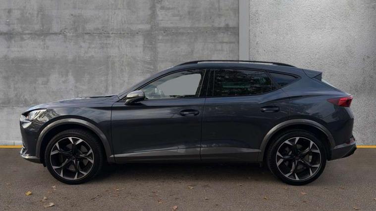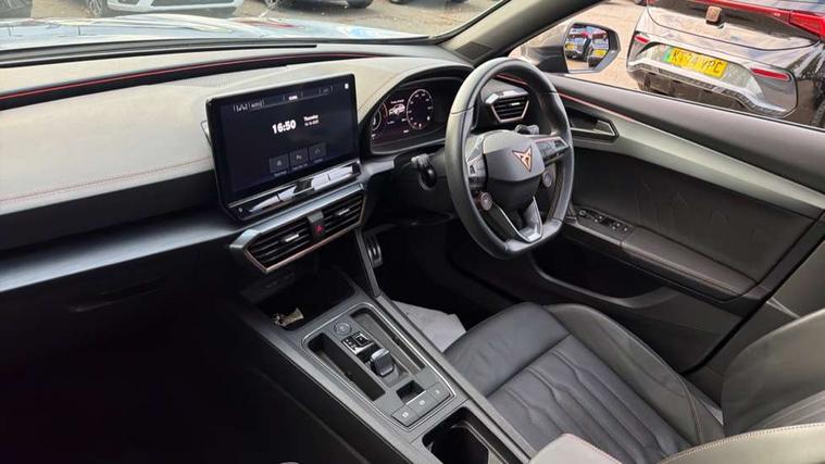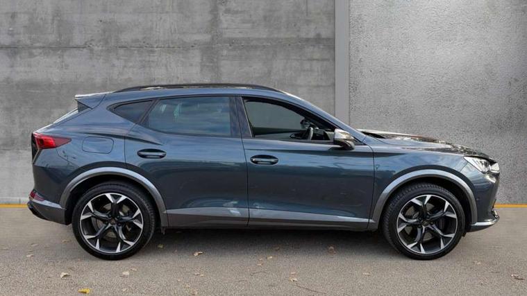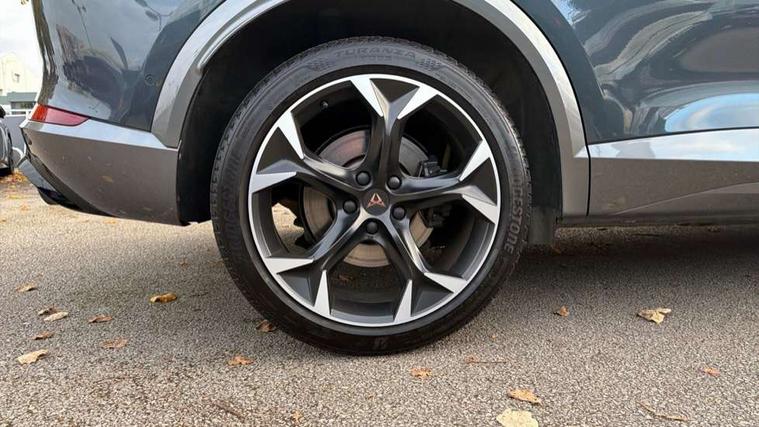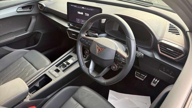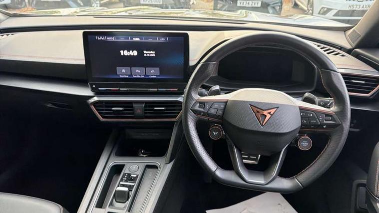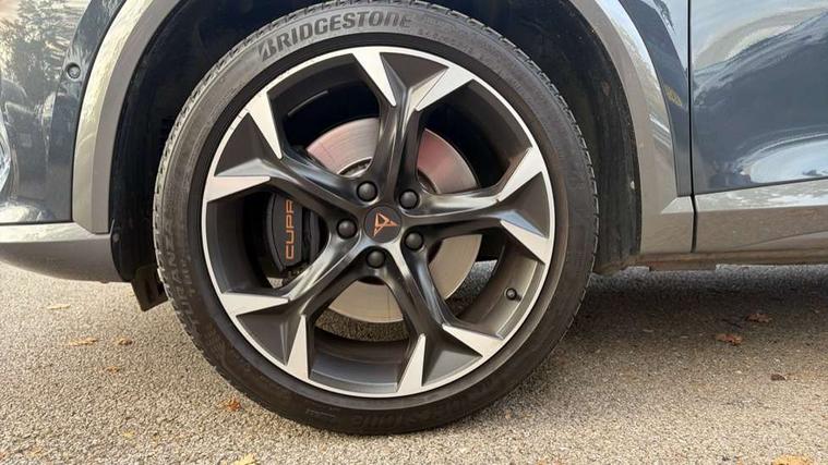 Digital cockpit and configurable dashboard, Driver alert system, Dynamic chassis control with driving profile selection (Comfort, Sport, CUPRA, Individual), Forward collision warning with automatic braking, Lane assist, Navigation system with 12'' Touchscreen Display, Park assist (inc front/rear parking sensors), Predictive adaptive cruise control with speed limiter, RPM, trip computer, outside temp gauge, instrument light brightness, low fuel warning light, lights on reminder, gearshift indicator, Service interval indicator, Speed sensitive power steering, Start/stop system with regenerative braking, Virtual pedal and electric tailgate, Voice control system, Wireless apple carplay, Wireless phone charger, Electronic locking differential and dynamic traction support, Sports suspension with front shock absoption, 2 front and 2 rear USB type C sockets, Auxiliary input socket, DAB radio, Auto dimming rear view mirror, Body colour door handles, Body coloured bumpers, Dark grey wing mirror, Daytime running light with automatic headlight control and coming home feature, Dynamic headlight range control, Electric front/rear windows, Electrically adjustable heated and folding door mirrors with memory function, Front fog lamps with cornering function, Gloss black roof rails and window surrounds, LED Headlights, LED Taillights with dynamic indicator, Rain sensing wipers, Rear diffuser with twin exhaust pipe on each side, Rear side wing doors, Rear wash/wipe, Sports bumpers, Third brake light, Tinted rear windows, VZ logo rear badging, Welcome lights, 12v power supply in centre console, 12V socket, 12v socket in loadspace, 2 front and 2 rear reading lights, 230V socket, 3 seat bench in 2nd row, 60/40 split rear bench seat with armrest and mechanical seat release, Black headlining, Cupra sports pedals, Dust/pollen filter, Front and rear head restraints, Front centre armrest, Height/reach adjust steering wheel, Illuminated interior front door sills, Illuminated sunvisor with mirror, Isofix, Leather heated multi-function sports steering wheel with start stop, CUPRA mode button and gear shift paddles, Luggage tie-down hooks, Single front passenger seat, Three zone climate control with control panel in rear, Variable luggage/load compartment floor, Wraparound lighting, Genuine Nappa leather Pack - Cupra, Safety and driving pack (XL) - Formentor, 3 point seatbelts on all rear seats, ABS, Brake control system - ESC and brake booster, Child proof door locks, Driver and front passenger airbags with front passenger airbag de-activation, Electronic parking brake, Front and rear disc brakes, Front side curtain airbags, Hill hold control, Public e-call, Seat belt reminder for front and rear seats, Tyre pressure monitoring system, Anti theft alarm system, Keyless entry and start system (KESSY), Locking wheel bolts, Copper and aluminium interior detailing, 19" 'Exclusive' machined sport matte black and silver alloy wheels, Space saver spare wheel,