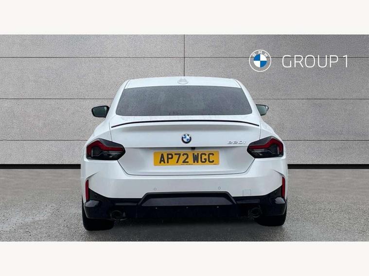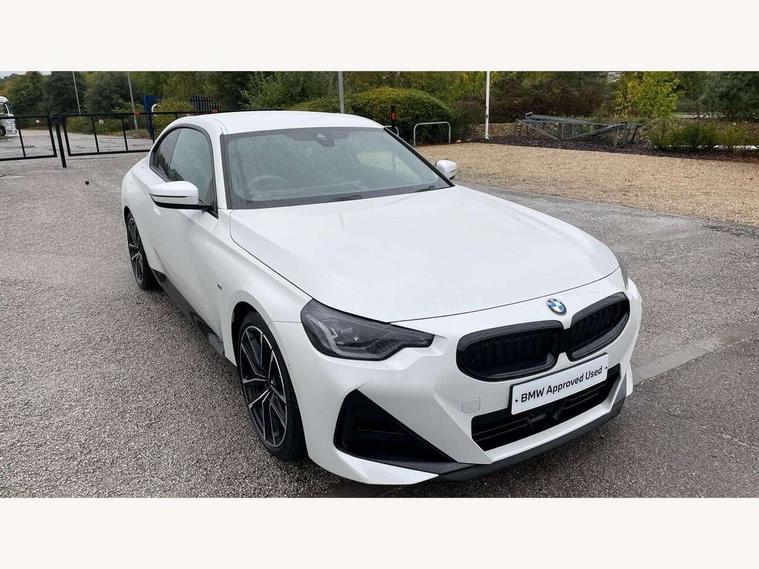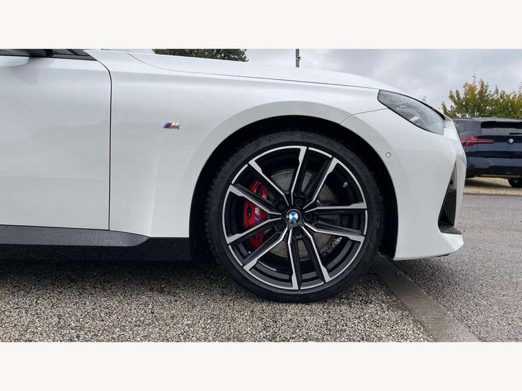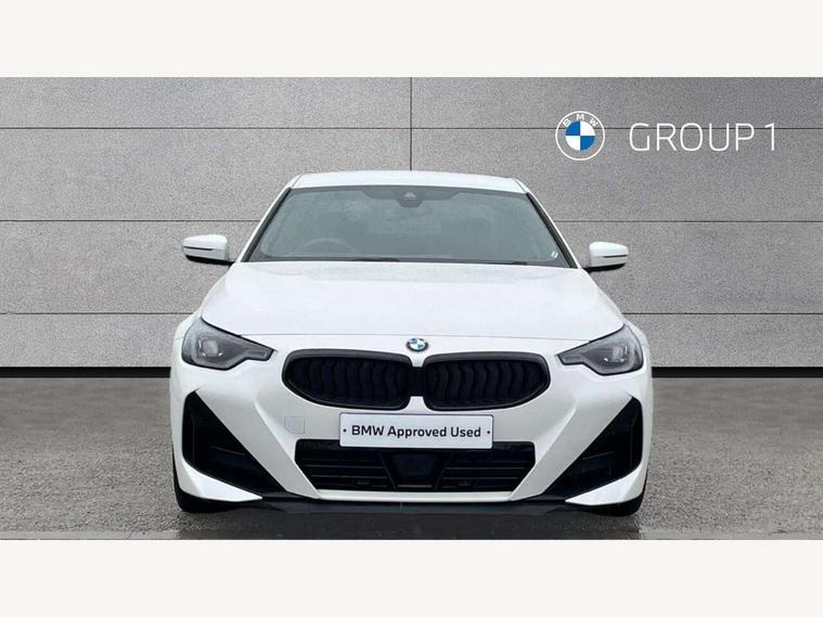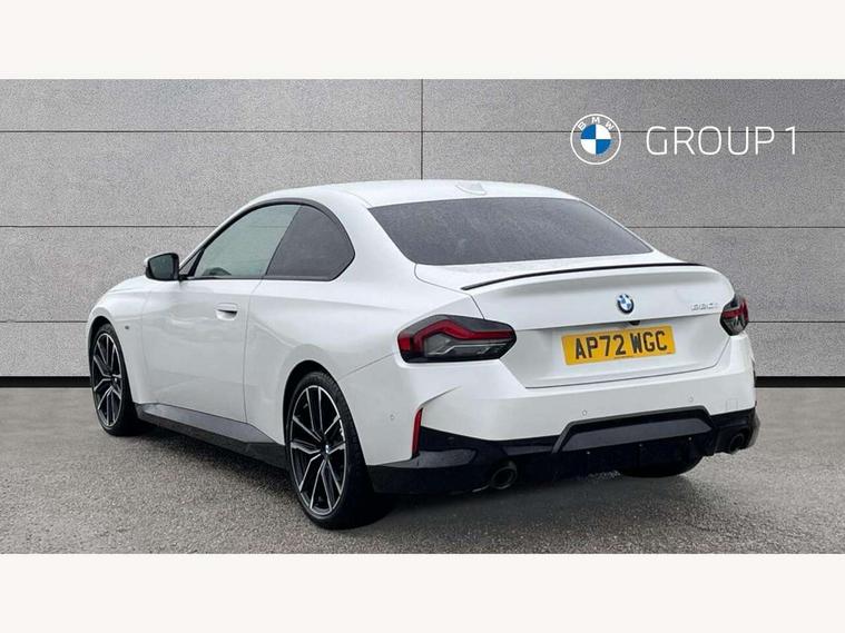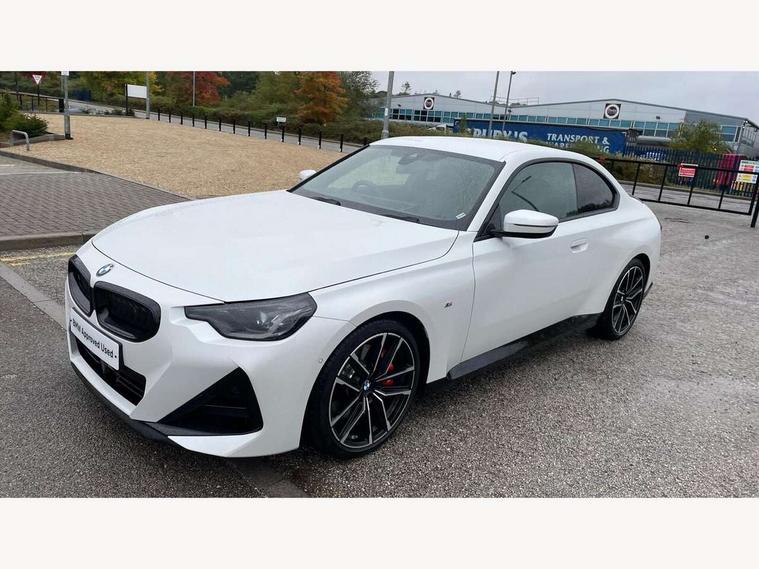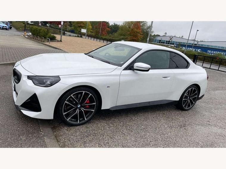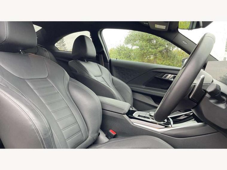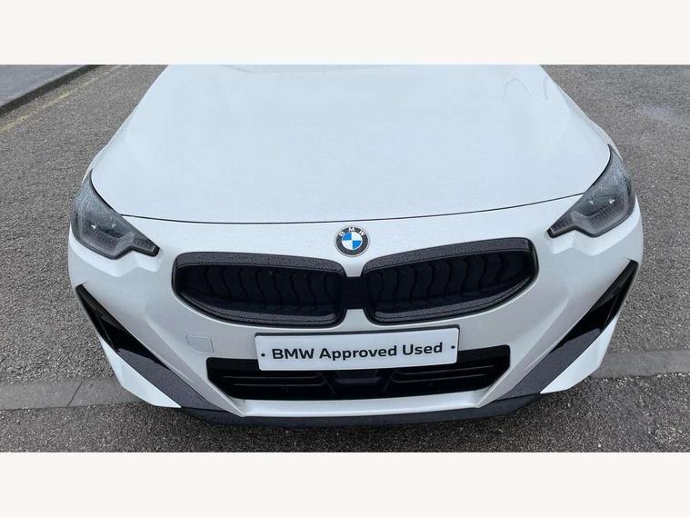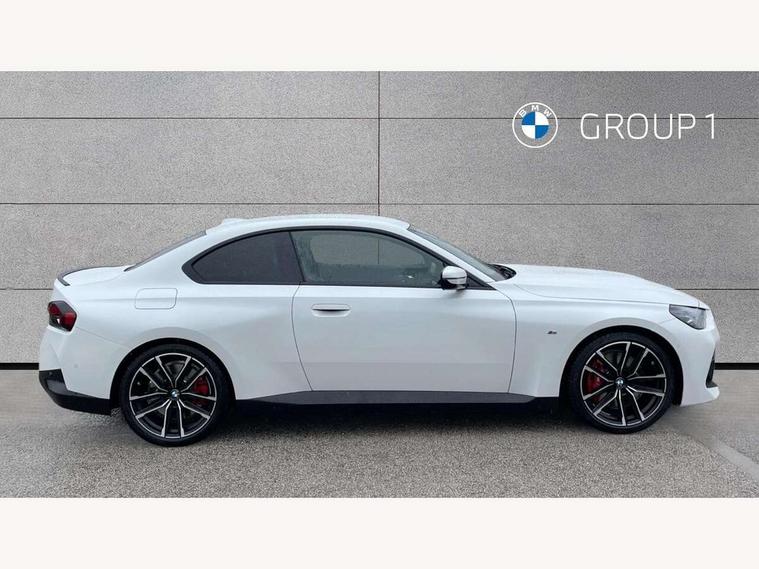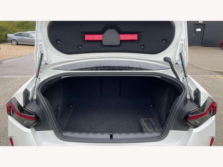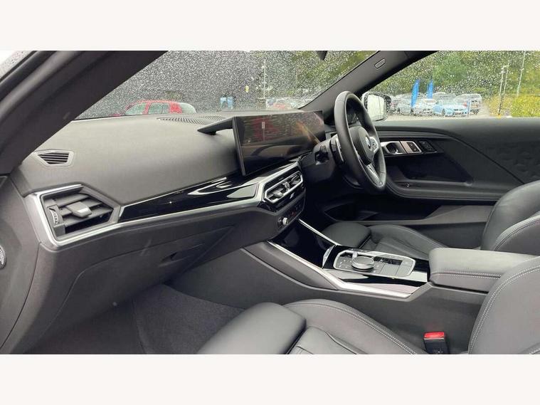 Attentiveness assist, Auto start-stop, Bluetooth, BMW ConnectedDrive online services, BMW Teleservices, Check Control warning system for monitoring of lights and door/luggage compartment open warning, Direct selection buttons, Drive off assistant, Eco pro mode, Electric power steering, Front and rear parking sensors, Front/rear Parking distance control, iDrive controller with turn and press function, Integrated owners handbook, Intelligent functions, Live cockpit plus with nav function 12.3" instrument cluster and 14.9" centre display, Oil sensor for level and grade, Optimum shift indicator, Personal Profile, Touch operation on control display, Variable sport steering, Widescreen multi-media display, Aluminium lightweight construction, Balancer shaft, BMW TwinPower Turbo four-cylinder petrol engine, Double VANOS, Drive performance control with ECO PRO comfort + sport mode, Electronic differential lock, High precision injection, M sport suspension, Petrol Particulate Filter, Sport automatic steptronic transmission with gearshift paddles, manual gearshift time display, launch control, coasting idle ECO PRO/COMFORT modes, Twin scroll turbocharger with Valvetronic, DAB tuner, Acoustic windscreen wipers for reduced driving noise, Adaptive LED Headlights, Automatic windscreen wipers and automatic headlight, Automatically dimming rear view mirror, Body colour door handles flush with door surface, Body colour door mirrors, Body colour front and rear bumpers, Daytime running lights, Electric windows - front and rear, with open/close fingertip control and trap release, Exhaust tailpipes x2 - 90mm in left and right, Fading support, Front and rear bumper system with replaceable deformation elements, Front door sill finishers in black plastic with BMW designation, Front windscreen wipers with integrated washer jets, Green tinted heat protection glazing, High beam assistant, High gloss shadowline exterior trim in mirror triangle cover, mirror cover panel, mirror bezel and window border, High level third brake light, Indicators integrated int mirror housing, LED registration plate light, LED technology rear tail lights, brake lights and turn indicators, Lightweight engineering, Model designation on right side of tailgate, One piece kidney grille with hight gloss chrome surround, Rear boot, Rear fog lights, Reversing light in rear light cluster, Shark fin antenna, Single part LED rear lights with smoked glass components, Trailer stabilisation logic, Visible VIN plate, 12V power socket in front centre console with blanking plug, 2 cupholders in front centre console, 3 zone automatic air conditioning, Ambient lighting, Compartment in front of cupholder, Conditioned based service, Driver seat backrest width adjustment, Front and rear side armrests integrated into door trim, Front armrest, Front door pockets, Front head restraints, Front sport seats, Heated front seats, Illuminated glove compartment with separate small compartment, M headliner Anthracite, M sport leather steering wheel, Manually adjustment steering wheel column, Rear seat backrest with manual 40:20:40 split folding, Rear seat centre foldable armrest with integrated cup holder, Single front passenger seat, Storage compartment between rear seats, Storage tray and compartment with cover in centre console, Sun visors with vanity mirrors and insert tab, Through loading system with 40/20/40 split folding 2 rear seat in 2nd row, Two folding rear seat headrests, Velour floor mats, Additional storage compartment pack without USB - 2 Series Coupe, Connected pack professional - 2 Series Coupe, Interior and exterior mirror pack - 2 Series Coupe, M Sport exterior styling aerodynamics pack - 2 Series Coupe, 2 tone horn, Anti lock braking system (ABS) with cornering brake control, Automatic Stability Control (ASC), BMW emergency call, Brake drying, Child seat ISOFIX attachment for the two outer rear seats, Crash sensor activating of airbags, Unlocking doors, hazard warning lights, interior light, safety battery terminal, Deactivation of fuel pump in the event of a crash, Driver and front passenger airbags, Driver and front passenger side airbags, integrated in the door side seat backrest bolsters for all seat variants, Dynamic brake control, Dynamic stability control + (DSC+), Dynamic Traction Control - DTC, Electrically operated hand brake including automatic hold function and automatic release when driving off, Front and rear disc brakes, Front passenger airbag deactivation, Head airbags for all 4 outer seats, Manual deactivation of front passenger airbag, Seat belt security check for driver and front passenger, Seatbelt warning, Side impact protection, Three point seat belts on 4 seats including front belt stopper, pyrotechnic belt tensioners and belt force limiters, Tyre pressure sensor, Warning triangle and first aid kit, Alarm system (Thatcham 1) with remote control and electronic engine immobiliser, Central locking switch for all doors, fuel filler cap and luggage compartment, Deadlocking function system to all doors, Drive away locking system on all doors and luggage compartment, Locking wheel bolts, Start/Stop button (illuminated) in centre console with keyless engine start and Auto Start-Stop deactivation button, Two remote control key with integrated key - one button for open and close doors/fuel flap/tailgate and separate button for unlock luggage compartment, BMW mobility tyre sealing system, Electrically powered 12V compressor, Reduced rolling resistance tyres,