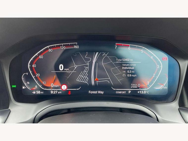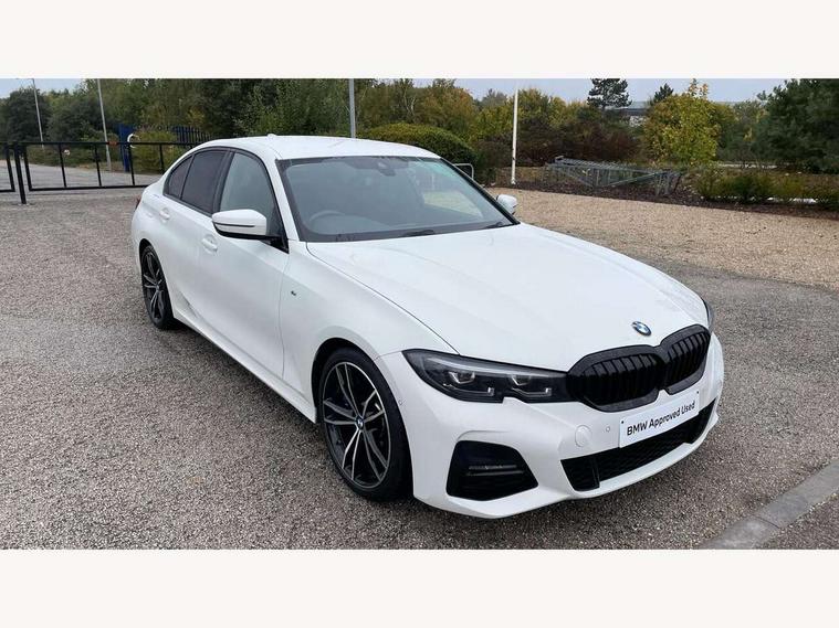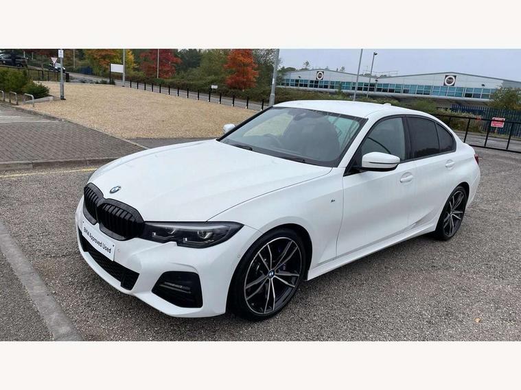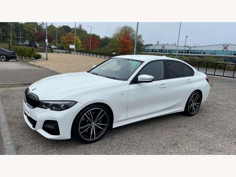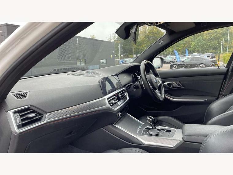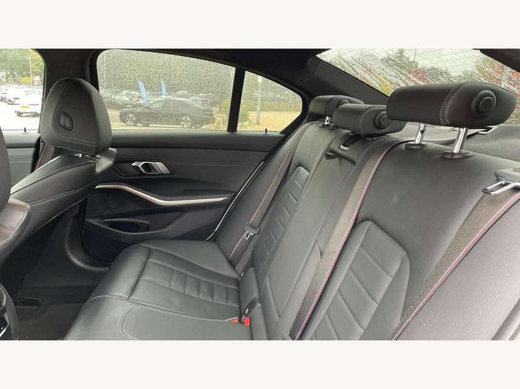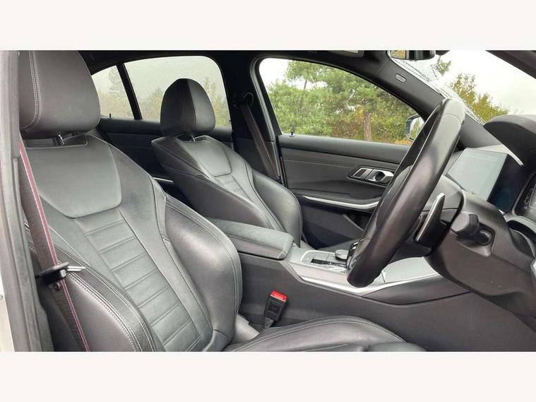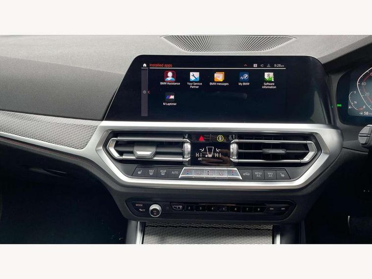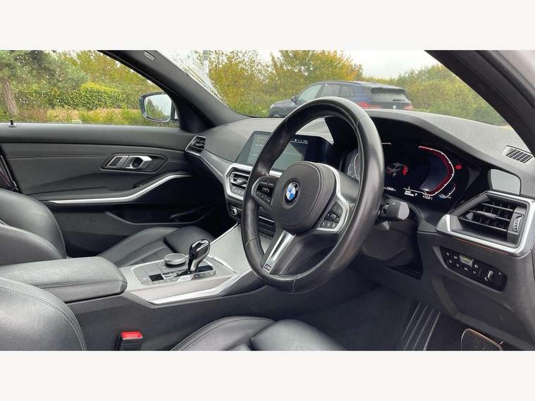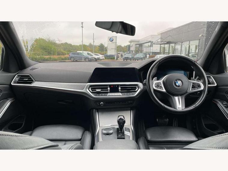 Active guard plus, Attentiveness assist, Auto start-stop, BMW Live Cockpit Professional Nav with 12.3" instrument display + 10.25" display, Intelligent Voice Assist, BMW OS 7, HDD, 2USB, 4G LTE connect, BMW service history, BMW Teleservices, Brake pad wear indicator in front and rear, Check Control warning system for monitoring of lights and door/luggage compartment open warning, Condition based service, Electric power steering with Servotronic steering optimised at all speed ranges, iDrive controller on centre console, Instrument cluster with speedometer with mph readout, tachometer, fuel gauge and oil temperature gauge, Integrated owners handbook, Oil sensor for level and grade, warning by check control system, On board computer - average speed+fuel consumption, service interval, clock/date, odometer/trip meter, outside temperature display and ice warning, Optimum shift indicator, Personal Profile - automatic lock when driving away selectable, Variable sport steering, Balanced 50/50 weight distribution, Battery cut-out switch, Drive performance control - ECO PRO, comfort and sport modes, Larger capacity fuel tank, M sport suspension, Petrol Particulate Filter, Stroke dependent dampers, DAB tuner, Electronic service booklet, Acoustic glazing, Active airstream chrome frame kidney grille with 8 high gloss black vertical slats, Automatic headlight beam throw control with load dependent regulating reaction, dynamic compensation of braking dive and acceleration squat, Black roof mouldings, Body colour door handles, Body colour front and rear bumpers, Body colour fuel filler flap, Body colour mirror caps with bottom segment in matt black, Dynamic brake lights, Electric windows - front and rear, with open/close fingertip control, anti-trap facility and comfort closing, Exhaust tailpipe - split left and right, Exterior mirrors - electrically folding with anti-dazzle, Fading support, Front and rear bumper system with replaceable deformation elements, Front black door sill finishers with BMW designation, Green tinted heat protection glazing, High gloss shadow line exterior trim, Interior rear view electrochromatic mirror with automatic anti dazzle function, LED daytime running lights, LED front fog lights, Lightweight engineering, M designation on front side panels, left and right, Matt black exterior B pillar, Model designation on right side of tailgate, Rain sensor with automatic headlight activation, Shark fin antenna, Two part LED tailights in L-shape with components in smoked glass, brake light, LED turn indicator and rear fog light, Visible VIN plate, Welcome lights in interior and door handle area, Windscreen wipers with integrated washing jets, 12V power socket in front storage compartment, 2 front cupholder in centre console with clamping elements and matt black inlay, 3 rear seats with non folding headrests with 3 point seat belts, 3 zone automatic air conditioning, 4 pieces lashing eyelets in luggage compartment, 40:20:40 split folding rear seat with loading system, Ambient lighting with welcome carpet light, Anthracite headlining, Armrest integrated in front and rear door trim + front centre console armrest, Centred top Luggage compartment lights, Four grab handles integrated in roof lining, Front and rear door exit lighting (left / right), Front and rear door pockets, Front and rear reading lights, Front and rear velour floor mats, Front head restraints, Front sport seats, Heated driver and front passenger seats, Height adjustable mechanically and infinitely variable steering column, Illuminated armrest storage compartment, Illuminated glove compartment with separate small compartment, Interior lighting - front centre over interior mirror with soft light, rear centre and front and rear footwell lighting, M sport leather steering wheel, Make-up mirror lights, Rear centre armrest with 2 cupholders, Rear centre console with storage compartment and ventilation grille, Sunvisors with vanity mirrors and ticket pocket, Toolkit located in luggage compartment, Connected pack professional - 3 Series Saloon/Touring, M sport exterior styling pack - 3 Series Saloon/Touring, 2 tone horn, BMW emergency call, Brake energy regeneration, Braking pre-tensioning, Child proof locking system in rear door, Child seat ISOFIX attachment rear outer seats, Coasting in idle in ECO PRO mode, Crash sensor activating of airbags, Unlocking doors, hazard warning lights, fuel cut off, interior lighting+activation of safety battery terminal clamp, Driver and front passenger side airbags, integrated in the door side seat backrest bolsters for all seat variants, Driver/Front Passenger airbags, Dry braking, Dynamic brake control, Dynamic stability control + (DSC+) - Anti-lock Braking System (ABS) with brake assist and cornering brake control + Automatic Stability Control (ASC), Dynamic Traction Control - DTC, Electromechanical parking brake including automatic hold function and automatic release of the parking brake when pulling away, Electronic differential lock control (EDLC), Front passenger manual airbag deactivation, Head airbags for all 4 outer seats, Hill start assist, Seat belt security check for driver and front passenger, Side impact protection, Three 3 point seat belts on all seats including front belt stopper, pyrotechnic belt tensioners and belt force limiters, Tyre pressure monitoring with three level warning strategy, Ventilated front and rear disc brakes, Warning triangle and first aid kit, Alarm system (Thatcham 1) with remote control and electronic engine immobiliser, Central locking switch for all doors, fuel filler cap and luggage compartment, Remote control with integrated key one button open/close vehicle and windows, sole opening of the luggage compartment lid and panic mode, Start/stop button with Comfort Go keyless engine start and auto Start/stop deactivation button, Vehicle key with M specific designation, Reduced rolling resistance tyres,