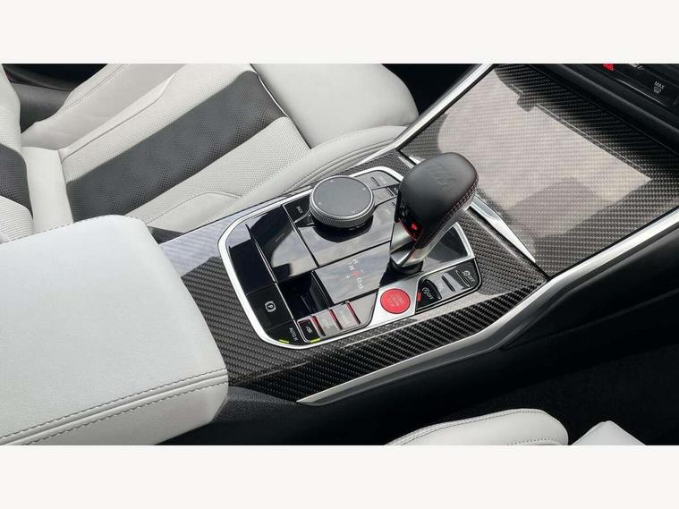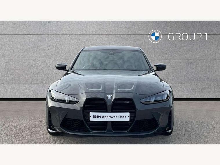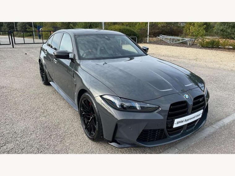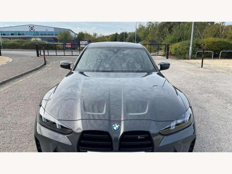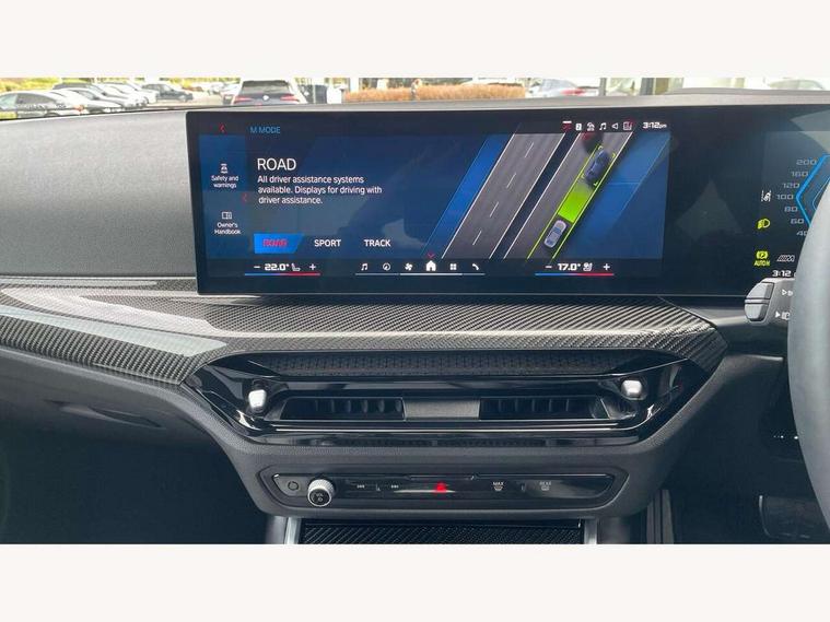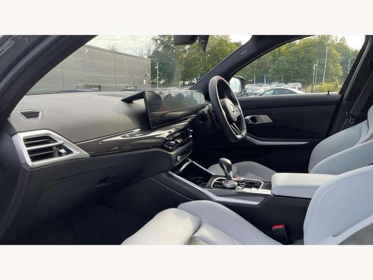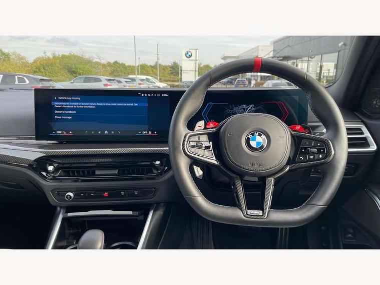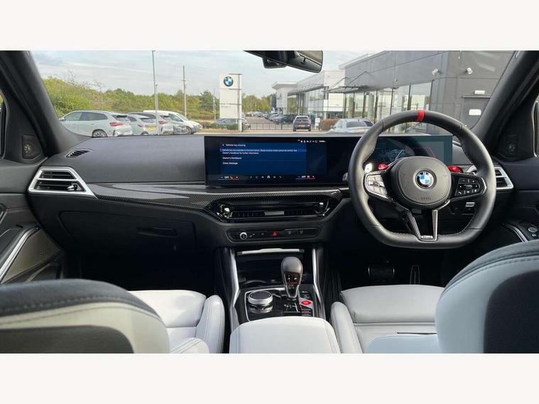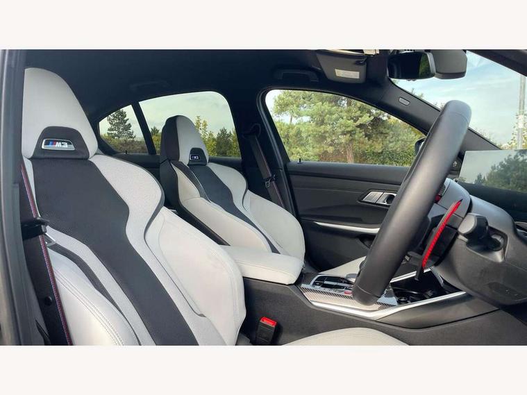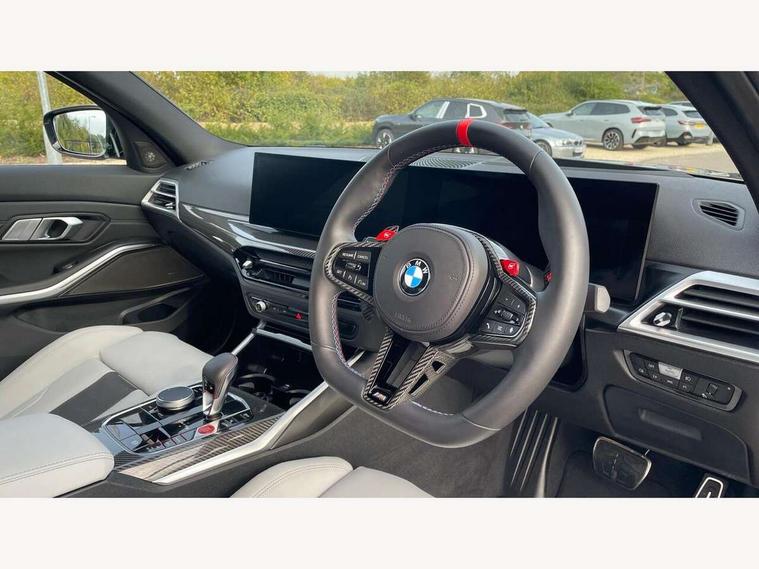 Active Guard, Automatic start/stop system, BMW ConnectedDrive online services, BMW legal emergency call, BMW Live Cockpit Pro with Head up display including 12.3" instrument display and 14.9" high resolution control display with navigation function, BMW Teleservices, Brake pad wear indicator warning light, Condition based service, Cruise control with braking function, Door/boot open warning light, Electric Power Steering (EPS) with Servotronic, Language version English, Lights on warning, M drive buttons, Oil sensor for level and grade, warning by check control system, Oil temperature gauge, On board computer, On board diagnostics, Optimum shift indicator, Outside temperature display, Park distance control, Pull away assistant, Run flat indicator, Service interval indicator, Shifting point display, Smartphone integration, Speed limiter, Start/stop button in red, Variable sport steering, Double joint spring strut front axle, M Adaptive suspension, M Drive Professional including track mode, laptimer, traction control & Drift analyser, M Sport differential, Safety battery terminal clamp, Sport automatic transmission with gearshift paddles, Auxiliary point for auxiliary devices, DAB radio with bluetooth music capability, Harman kardon surround sound audio system, Personal eSim, Auto dimming driver's door mirror, Automatic headlights + automatic windscreen wipers, Automatic parking function on front passenger's exterior mirror, Black model designation badges, BMW high gloss shadow line with extended contents, BMW radiator grille, frameless, with horizontal double blind slats, black high-gloss, with model badge, Body colour bumpers, Bonnet and tailgate badge, Carbon fibre reinforced plastic (CFRP) roof, Day time running light, Door mirror integrated indicators, Door sill finishers with aluminium inserts, Dynamic brake lights, Electric adjustable heated door mirrors, Electric folding door mirrors, Electrochromic exterior driver side mirror, Electrochromic interior rear view mirror with automatic anti-dazzle function, Entry sills with aluminium inserts and model badge, Follow me home headlights, Front and rear bumper system, Front and rear plastic apron in vehicle colour, Front door sill strips in aluminium inlays with M3 inscription, Front electric windows with open and close fingertip control, anti trap facility and comfort closing, Headlight beam throw control, Heat protection, sun protection glazing, Heated washer jets, High gloss black lower bumper edges, side sills and diffuser edge binding, LED tail lights with 3D L-shaped LED light design, M designation, Mirror glass aspheric on driver's side, convex on passenger side, Rain sensor, Rear boot, Rear fog lights, Rear reflectors, Rear side wing doors, Reversing light, Roof fin and roof trim strips in Black high-gloss, Shark fin roof aerial, Strakes in front side panel, black matt/high-gloss black, with model badge, Third brake light, Visible VIN plate, Welcome lighting, 2 cupholders in front centre console, 2 cupholders in rear armrest, 2 rear head restraints, 2 x 12 V Power sockets (luggage compartment and front centre console), 2 x USB Type C ports for charging and data transmission in front centre console, 3 seat bench in 2nd row, 40:20:40 split folding rear seat with loading system, Ambient inside door handle light, Ambient lighting for storage compartment, Ambient lighting front and rear, Anthracite headlining, Battery in luggage compartment, Centre console armrest with storage compartment, Contour lighting for door trim, Driver/passenger sunvisors with ticket holders + illuminated vanity mirrors, Driving experience mode switch, Dual zone automatic air conditioning, Dynamic ambient interior lighting, Electric front seats + driver memory, English handbook, Floor mats in velour, Front and rear door exit lights, Front door storage bins with bottle holder, Front footwell ambient lighting, Front interior light, Front isofix attachment + airbag deactivation, Front reading light, Front seat backrest width adjustment, Front/rear door armrests, Heated front seats, Height adjustable front headrests, Illuminated bow-type door handles in vehicle colour, driver's side with door lock, Interior mirror lighting, Isofix on 2nd row outer seats, Lockable/illuminated glovebox, Luggage compartment lighting, M Sport seats with with illuminated model designation, Multifunction steering wheel, Rake/reach adjustable steering wheel, Single front passenger seat, Storage compartment in rear doors, Storage tray and compartment with cover in centre console, Through loading system, Toolkit located in luggage compartment, Waterfall lighting for central air vent, Wireless charging tray, Connected package professional - M3, Extended storage pack - M3/M4, High gloss shadowline exterior trim pack - M3, 3 point seatbelts on all seats, ABS/EBD, Automatic Stability Control (ASC), Brake energy regeneration, Brake fade compensation, Compound structure brake discs, Cornering brake control (CBC), Crash sensor, Curtain airbags, Driver/Front Passenger airbags, Dry braking, Dynamic brake control, Dynamic stability control + (DSC+), Dynamic Traction Control - DTC, Electromechanical parking brake, Electronic differential lock control (EDLC), Front and rear head airbags, Front seat side impact airbags, Front seatbelt pretensioners + load limiters, Hill start assist, M Sport seat belts, Rear child proof door locks, Seat occupancy detection for driver and passenger side, Seatbelt warning, Side impact protection, Two tone horn, Tyre pressure sensor, Warning triangle and first aid kit, Centre lock switch, Closing system with central locking, Electronic immobiliser, Locking wheel bolts, Remote central locking, Thatcham cat 1 remote alarm, Vehicle Key with 4 buttons including the integrated key, Galvanic embellisher for controls, Tyre repair kit,