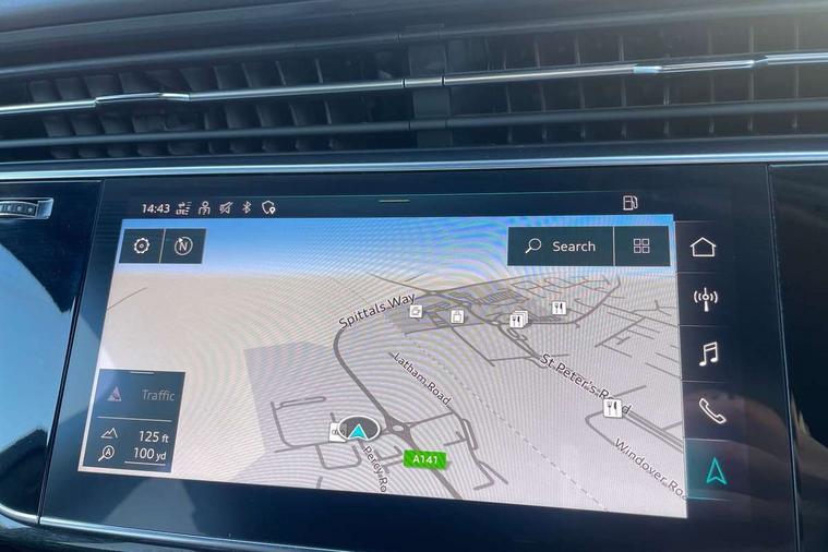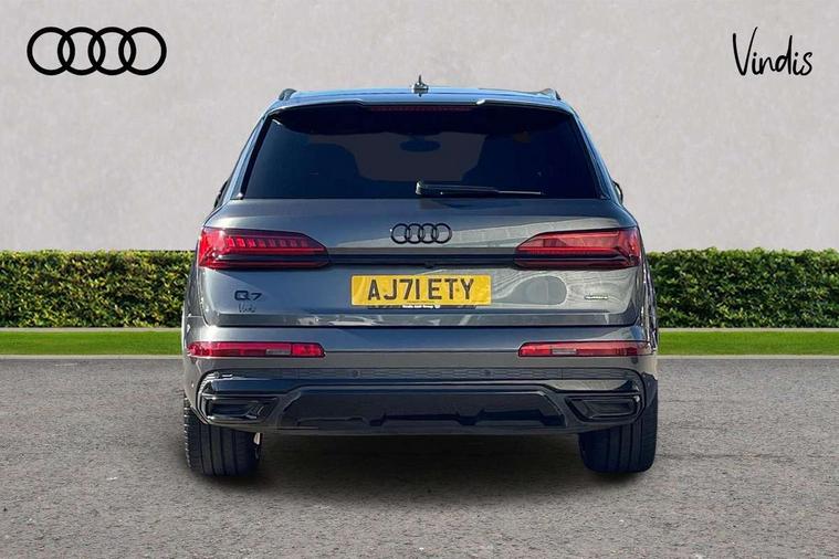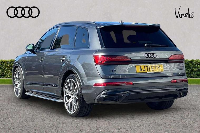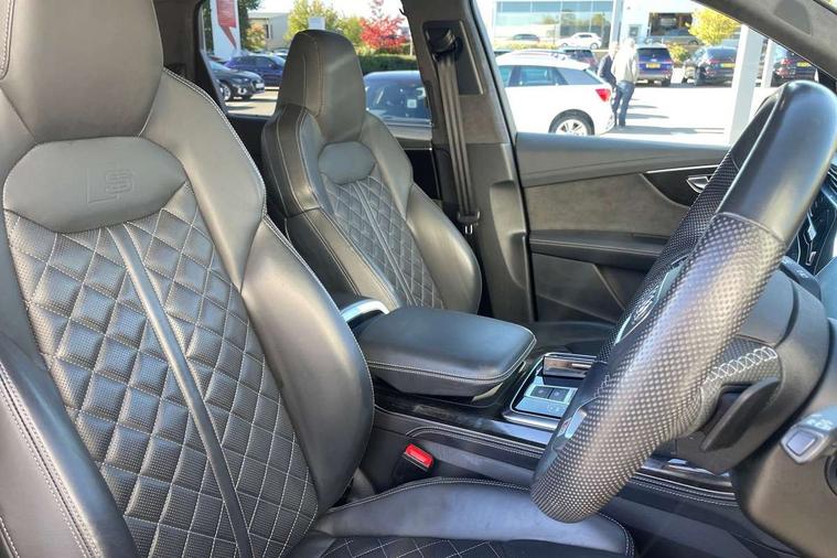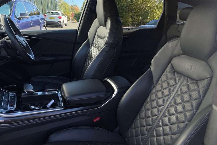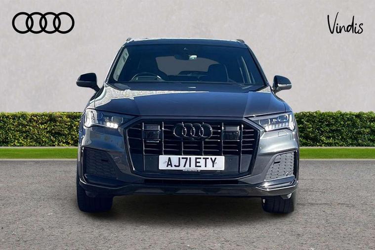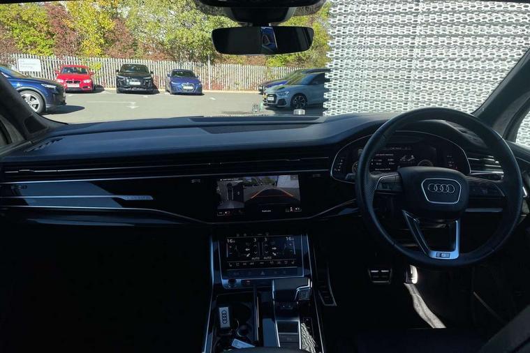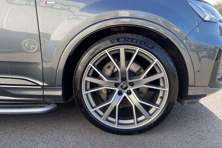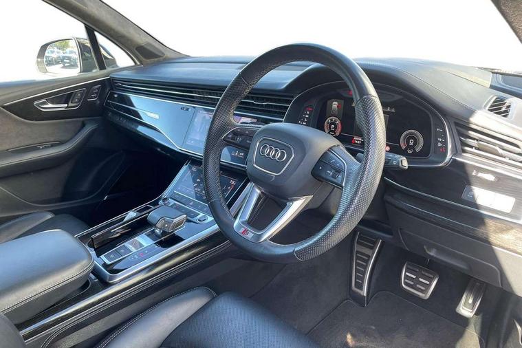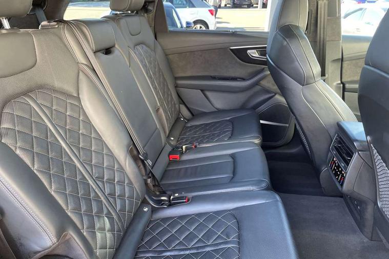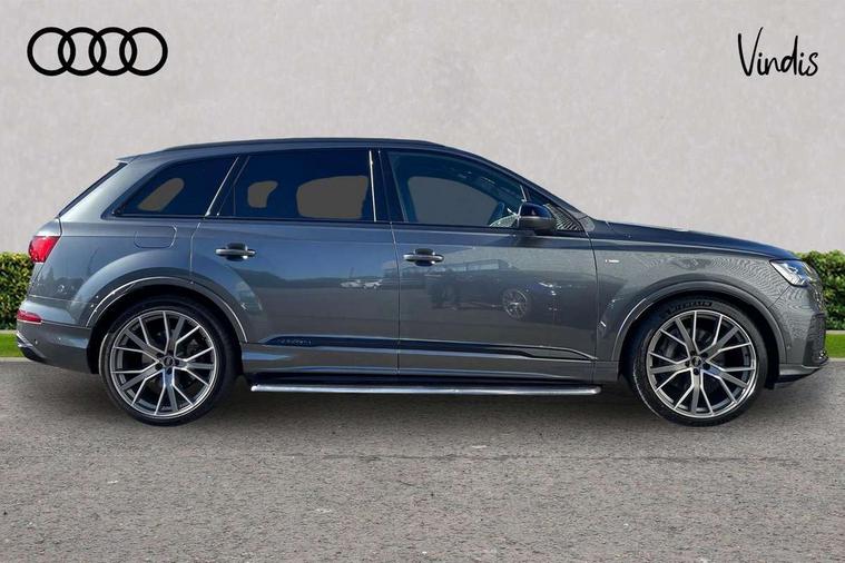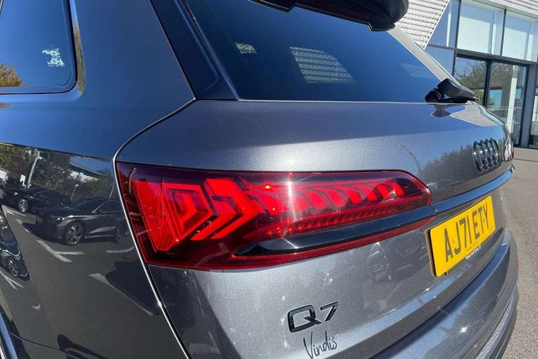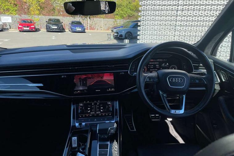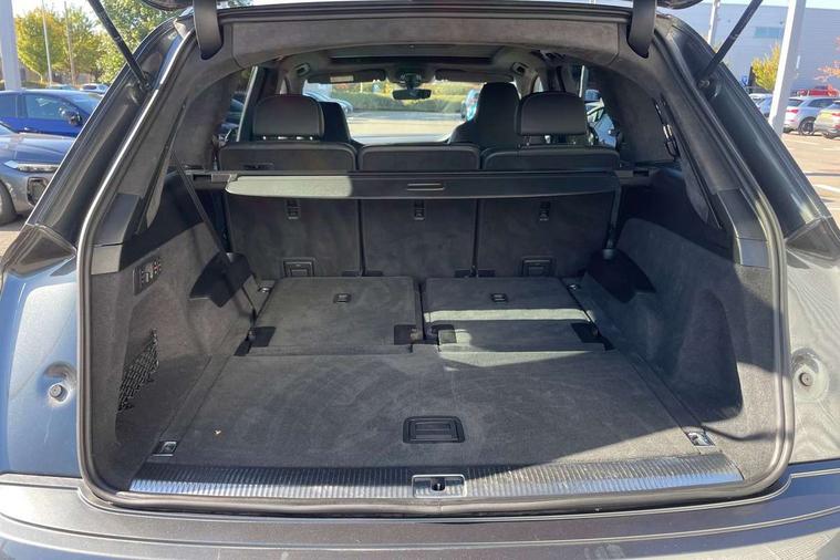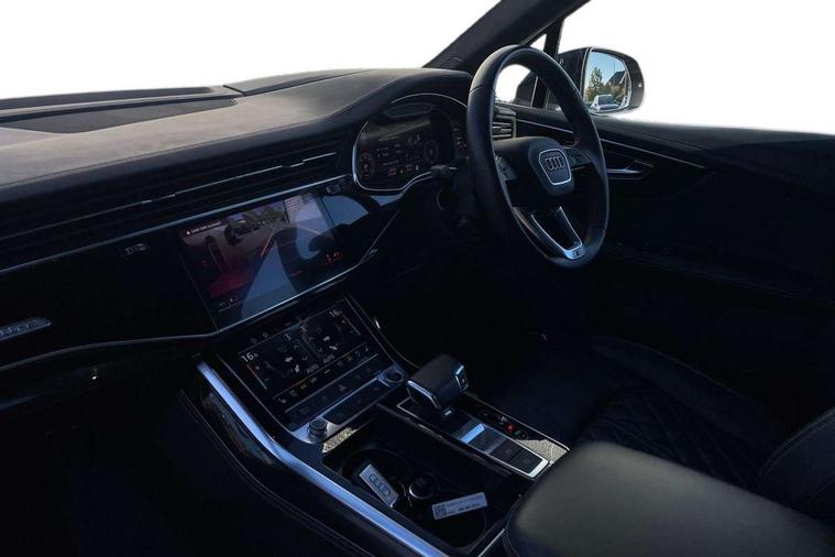 All wheel steering, Audi connect safety and service (e-call), Audi connect with Amazon Alexa Integration, Audi drive select (Auto, Comfort, Dynamic, Efficiency, Individual, Off-road and All road), Bluetooth interface, Camera based traffic sign recognition, Head up Display, MMI navigation plus with MMI touch screens includes 10.1" and 8.6" screens with haptic feedback, Natural voice recognition, Power door closure, Power operated tailgate, Smartphone interface includes wireless Apple carplay/Android Auto, Start/stop system, 48V Mild hybrid technology, Adaptive air sports suspension, Quattro all wheel drive with self locking centre differential, 2 USB-C ports with charging functionality in the rear, Audi music interface - front 2 USB-C ports with charger and data functions, DAB digital radio module, 3rd brake light, Audi Beam uses LEDs to project Audi logo onto the ground as you exit your Q7, Audi HD matrix LED headlights with Audi laser light + dynamic front and rear indicators, Auto dimming frameless rear view mirror, Black roof rails, Bumpers in contrast paint scandium grey finish includes door trim and wheel arch trim strips, inlays in door strip contain quattro embossing, Electric panoramic glass sunroof, Electrically adj heated/folding + automatically dimming exterior mirrors with memory + automatic kerb side function for passenger side exterior mirror, Gloss black finish for exterior Audi rings and Q7 logos without engine badging, Headlight washers, Heat insulating glass in windshield, Integrated LED indications in door mirrors, LED daytime running lights, LED rear tail lights, Privacy glass - dark tinted rear and rear side windows from B-pillar backwards, Rear side wing doors, Rear wiper, Side running boards, 2 seat bench in 3rd row, 3 seat bench in 2nd row, 3 spoke heated leather multi-function steering wheel including paddle shift, 4 zone deluxe automatic climate control, 7 seat layout with ISOFIX points for the front passenger seat and rear passenger seat, Black Alcantara headlining, Comfort front centre armrest, Double sun visors with illuminated vanity mirrors, Electric adjustable front seats/backrest bolsters, lumbar support, memory functionality, Folding rear seats, Front head restraints, Front/rear floor mats, Heated front and outer rear seats for second row, Illuminated door sill trims with S logo, Manual sunblind for the rear side windows and manual sunblind for the rear window, Rear head restraints, Seat ventilation and massage function in the front, Single front passenger seat, Stainless steel pedals, City assist pack - Q7, Comfort and sound pack with Bang + Olufsen premium sound system - Q7, Extended leather pack - Q7, Titanium black styling pack - Q7/SQ7, Tour pack with Adaptive cruise assist - Q7, 3 point seatbelts on all rear seats, Audi pre sense front, Child locks on rear doors, Driver and front passenger, front side and curtain airbags, Electromechanical parking brake, Electronic Stabilisation Control (ESC) including ABS, ASR and EDL, Extended pedestrian protection measures, Hill hold assist, Seatbelt monitoring, Tyre pressure loss indicator, Warning triangle and first aid kit, Anti theft alarm, Anti-theft wheel bolts and wheel loosening detection, Remote central locking, Polished oak trim with grey finish inlay, Tool kit, Tyre repair kit,
