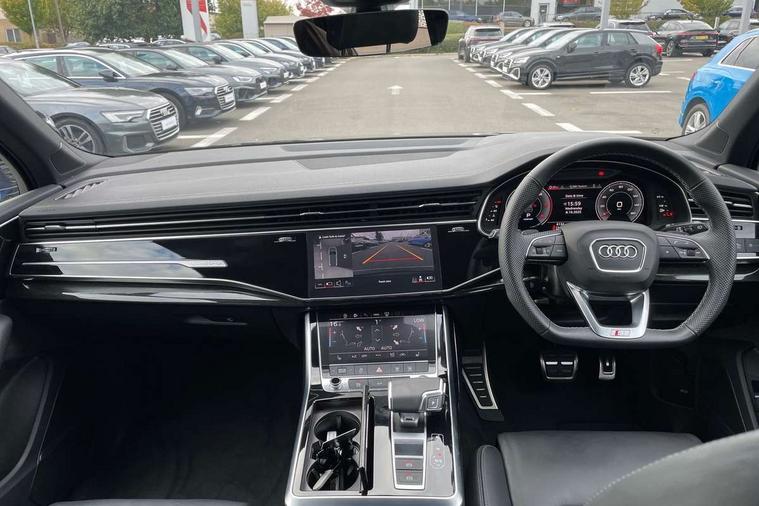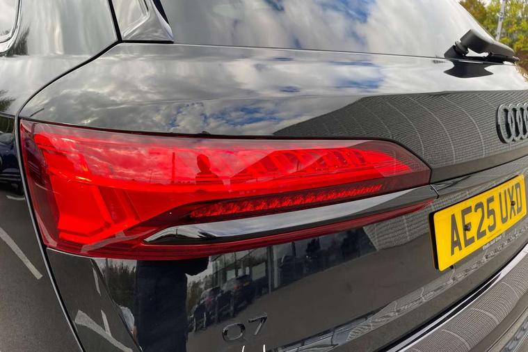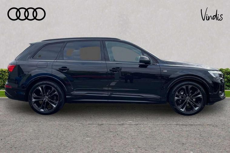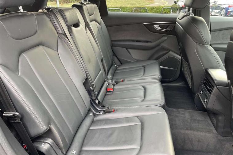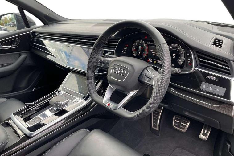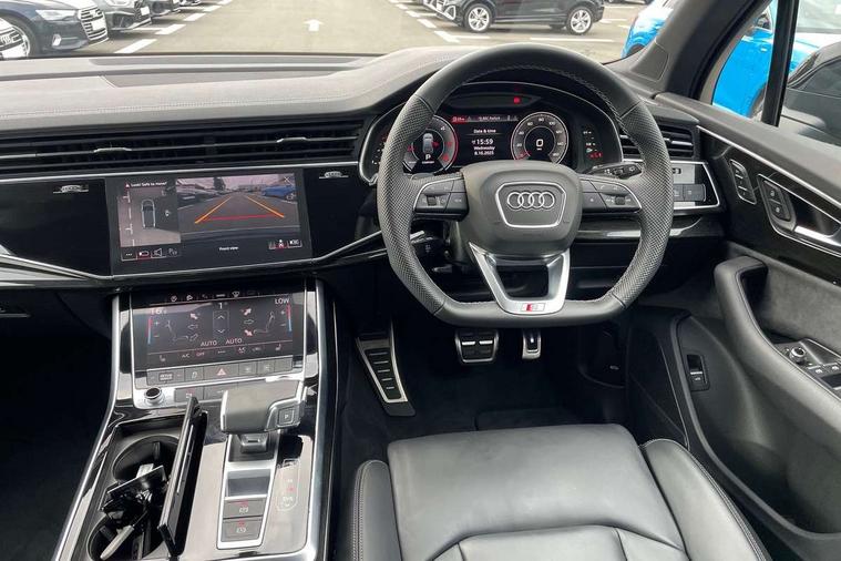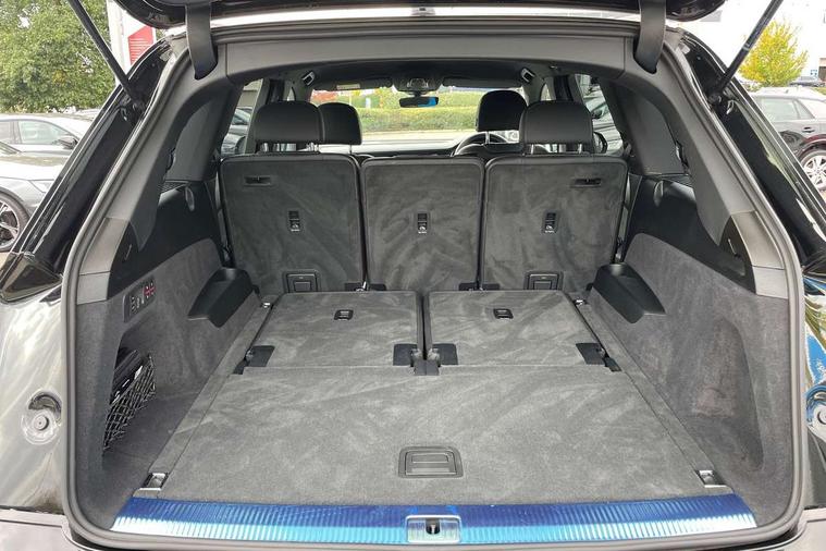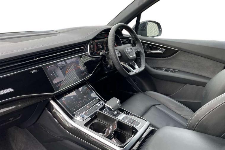Audi connect safety and service (e-call), Audi connect with Amazon Alexa Integration, Audi drive select (Auto, Comfort, Dynamic, Efficiency, Individual, Off-road and All road), Audi phone box light with wireless charging, Audi virtual cockpit - 12.3" high-resolution LCD display with fully customisable instrument cluster, Bluetooth interface, Camera based traffic sign recognition, Electromechanical power steering, MMI navigation plus with MMI touch screens includes 10.1" and 8.6" screens with haptic feedback, Natural voice recognition, Operating buttons in Matte black, Parking system plus with 360 degree display (front, rear and side sensors) - acoustic and visual park assist system, Power operated tailgate, Rear view camera, Smartphone interface includes wireless Apple carplay/Android Auto, Start/stop system, 48V Mild hybrid technology, Adaptive air sports suspension, Quattro all wheel drive with self locking centre differential, Audi music interface - front 2 USB-C ports with charger and data functions, Audi sound system with 6 channel amplifier, 180 watt amplifying capacity and 10 loudspeakers including subwoofer, DAB digital radio module, Audi Beam uses LEDs to project S emblem with red rhombus onto the ground when opening the side doors (front/rear), Auto dimming frameless rear view mirror, Black exhausts, Black roof rails, Electrically adj heated/folding + automatically dimming exterior mirrors with memory + automatic kerb side function for passenger side exterior mirror, Heat insulating glass in windshield, Integrated LED indications in door mirrors, LED 3rd brake light, LED daytime running lights, LED rear tail lights, Loading edge protection in stainless steel, Matrix LED headlights with dynamic front and rear indicators, Privacy glass - dark tinted rear and rear side windows from B-pillar backwards, Rear side wing doors, Rear wiper, 2 seat bench in 3rd row, 2 zone automatic climate control, 3 seat bench in 2nd row, 7 seat layout with ISOFIX points for the front passenger seat and rear passenger seat, Black cloth headlining, Comfort front centre armrest, Electric adjustable front seat with 4 way lumbar support, driver memory functionality, Folding rear seats, Front head restraints, Front/rear floor mats, Heated front seats, Illuminated door sill trims with S logo, ISOFIX child seat mounting for front passenger seat and 2 outer rear seats with top tether child seat mounting for all 3 rear seats, LED interior ambient lighting, Luggage compartment cover, Luggage compartment sill protection in stainless steel, Rear head restraints, Single front passenger seat, Stainless steel pedals, Sunvisors with illuminated vanity mirrors, Black styling pack plus - Q7, 3 point seatbelts on all rear seats, Audi pre sense front, Child locks on rear doors, Convenience key with safelock and gesture tailgate, Driver and front passenger, front side and curtain airbags, Electromechanical parking brake, Electronic Stabilisation Control (ESC) including ABS, ASR and EDL, Extended pedestrian protection measures, Hill hold assist, Seatbelt reminder, Tyre pressure loss indicator, Warning triangle and first aid kit, Anti theft alarm with tow away protection, Anti-theft wheel bolts and wheel loosening detection, Keyless Go, Remote central locking, Polished oak trim with grey finish inlay, Tool kit, Tyre repair kit,