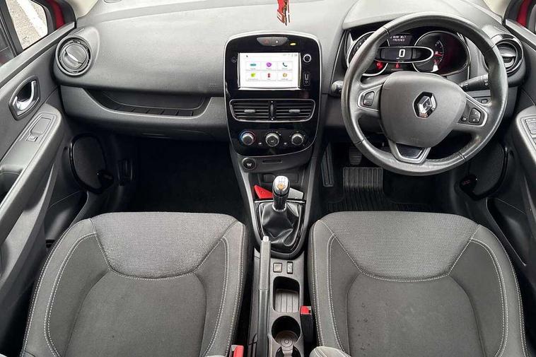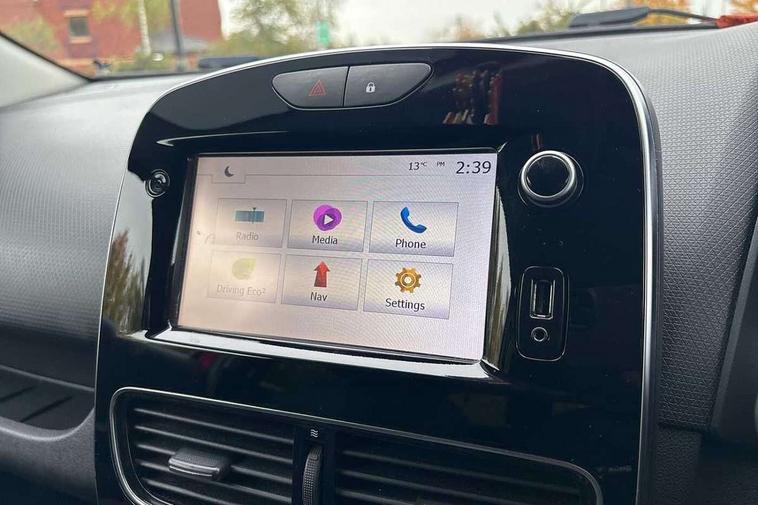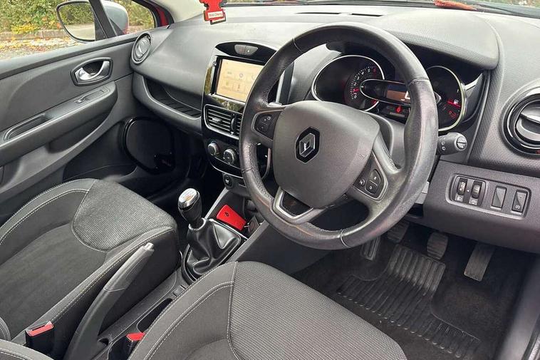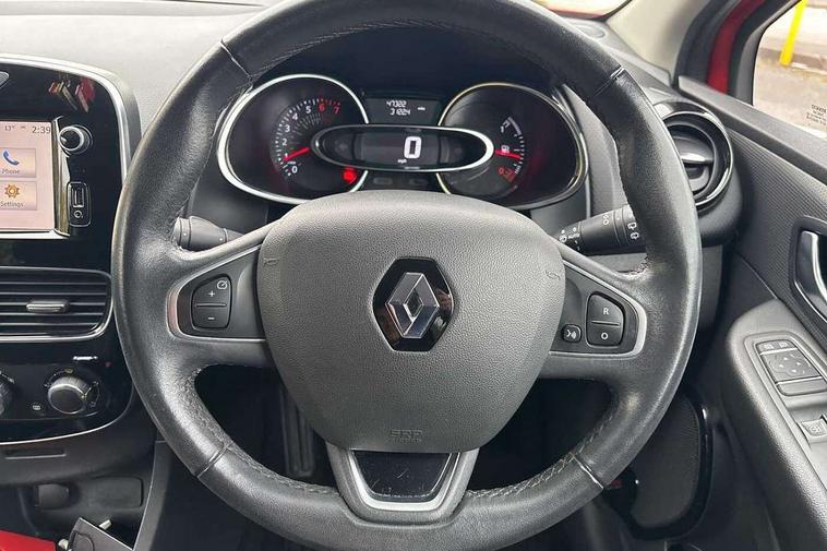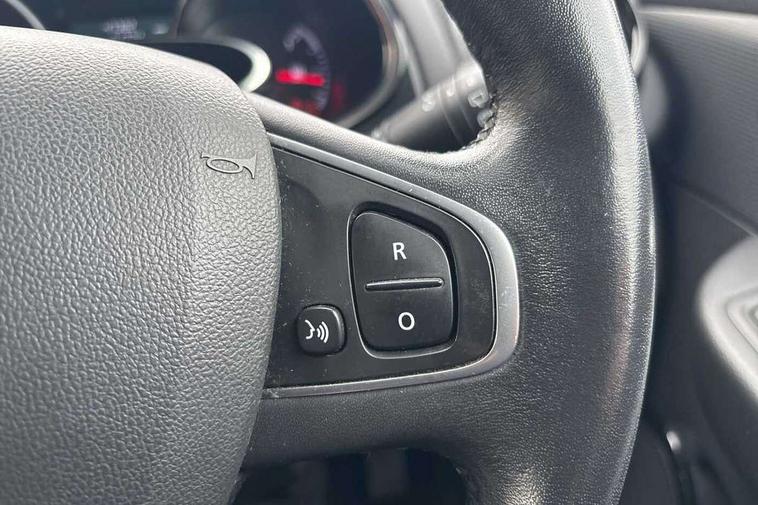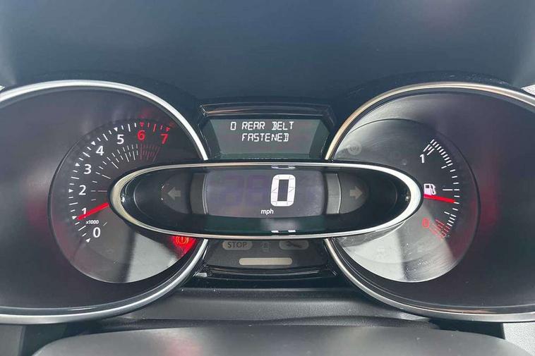 Cruise control + speed limiter, Push button starter, Renault MediaNav with 7" touch screen and Navteq Nav 'n' Go Satellite Navigation, Smartphone cradle, Trip computer, Variable PAS, 4x20W Arkamys radio with bluetooth handsfree and USB, Aux-in socket, Automatic headlights + automatic windscreen wipers, Black door protector with chrome inserts, Black headlamp surrounds, Body colour door handles, Body coloured bumpers, Body coloured rear spoiler, Chrome tailgate decoration, Electric adjustable door mirrors, Electric front windows + one touch + anti-pinch, Front fog lamps, Heated door mirrors, LED daytime running lights, Rear wiper, Variable front intermittent wipers, 12V Accessory socket, 3 rear height adjustable headrests, 60/40 split rear seats, Air recirculation control, Chrome gear knob insert, Chrome interior door handles, Design cloth upholstery, Driver's seat height adjustment, Front cupholders, Front door storage bin, Glovebox, Height adjustable front headrests, Height/reach adjust steering wheel, Isofix system on outer rear seats, Leather steering wheel, Multi function steering wheel, Pollen filter, System for Restraint and Protection SRP-front seats, 3 point seatbelts on all rear seats, ABS+EBD+Brake assist, Driver and passenger front and side airbag deactivation, Driver/Front Passenger airbags, Driver/front passenger side airbags, ESP + Traction control + Understeer control, Front side airbags(head+thorax), Height adjustable driver's seatbelt, Hill start assist, Seatbelt warning, Tyre pressure monitoring system, Anti-drill door locks, Child lock control of rear doors and windows, Deadlocking system, Hands free Renault card, Locking fuel filler cap, RAID (Renault Anti-Intruder Device) with automatic door locking, Remote central locking, Thatcham Cat 2 engine immobiliser, Dark carbon soft touch dashboard, Gloss black air vent surround, Gloss black centre console, Gloss black dashboard inserts,