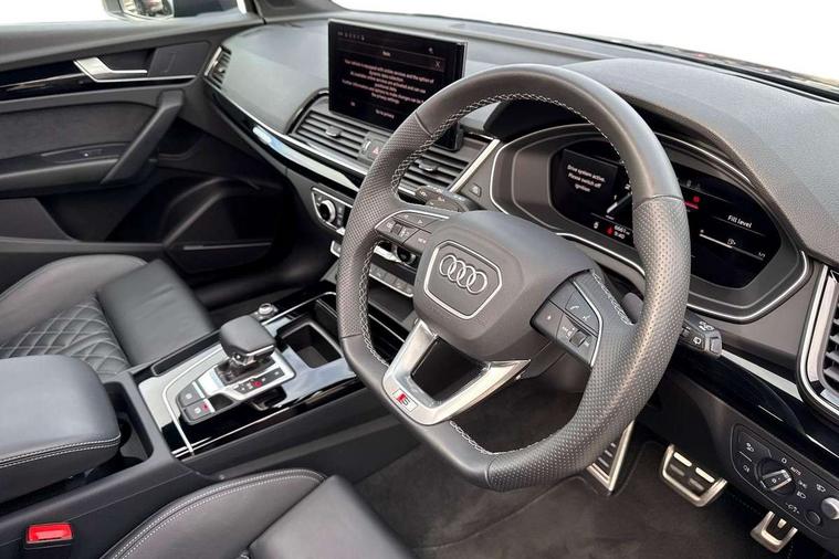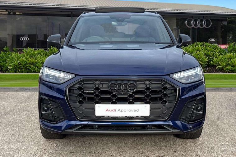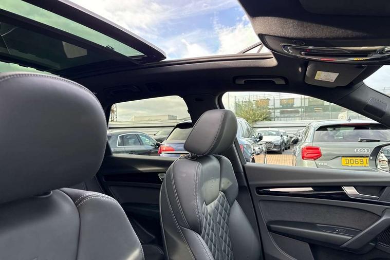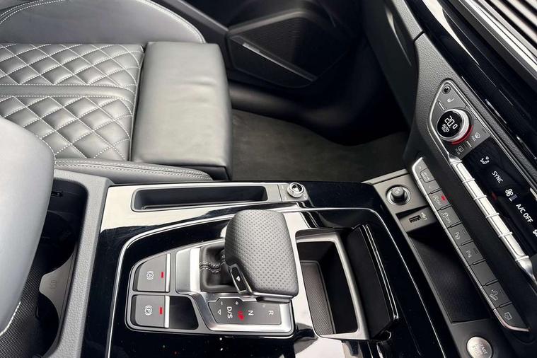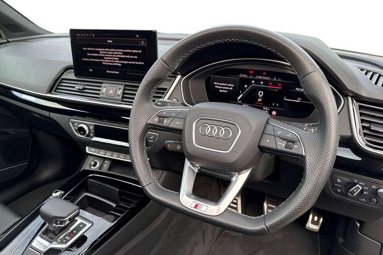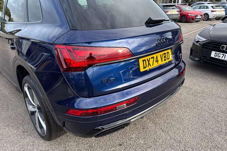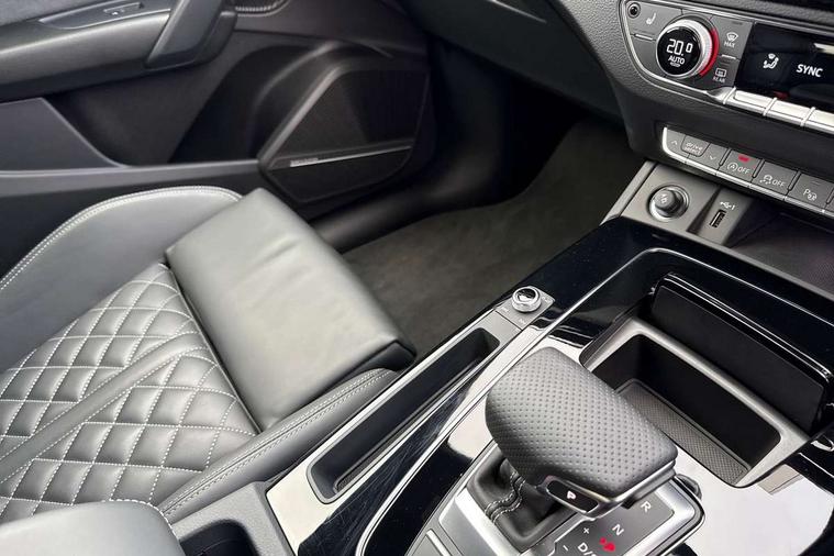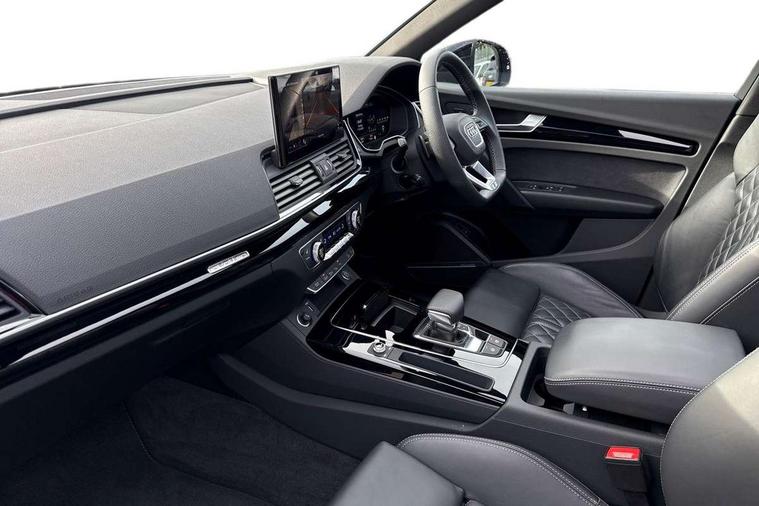 Acoustic front and rear parking sensor, Audi connect safety and service (e-call), Audi drive select, Audi virtual cockpit plus with 12.3" screen and three different layout designs, Audi wireless smartphone interface, Automatic start-stop system with coasting functionality and efficiency programme, Bluetooth interface, Camera based traffic sign recognition, Electro - mechanical power assisted steering, Lane departure warning, MMI navigation plus with 10.1" touch screen, Power tailgate, Reversing camera, Service interval indicator, Voice control system with Audi hotword activation "Hey Audi", Diesel particulate filter, Quattro on demand, S line sports suspension, 2 x USB charging port with aux input socket, 8 loudspeakers, DAB Digital radio, Acoustic windscreen, Auto dimming door mirrors, Auto dimming frameless rear view mirror, Automatic headlight adjustment, Automatic headlights and windscreen wipers, Black roof rails, Black styling with black rings, Body colour bumpers, Body colour rear diffuser with matt aluminium silver surrounds, Body colour underbody protection, Chrome plated exhaust trims, Daytime running lights, Door sills in Selenite silver, Electric adjustable/heated/folding door mirrors, Front air inlet surrounds in aluminium, Front and rear electric windows, Front radiator grille in honeycomb design, LED 3rd brake light, LED headlights and LED tail lights, Loading edge protection in stainless steel, Lower bumpers painted in contrast Manhattan grey, Rear chrome trim strip below lights, Rear privacy glass and rear side windows, Rear side wing doors, Rear wiper, Roof bars, S Line badges on the front wing panels, S Line front and rear bumpers, S Line rear spoiler, S Line side skirts, 3 rear headrests, Black cloth headlining, Comfort front centre armrest, Contrast stitching on seats, steering wheel and gear lever gaiter, Deluxe 3 zone electronic climate control, Front head restraints, Front sport seats with S embossed logo, Front/rear floor mats, Gear lever in black leather, Heated front seats, Height/reach adjustable steering column, Illuminated door sill trims with S logo, Luggage compartment cover, Manual seat adjustment with 4-way electric lumbar support, Single front passenger seat, Stainless steel pedals, Sunvisors with vanity mirrors, Top surface of the rear centre armrest in artificial leather, High gloss pack - Q5, LED interior light pack - Q5, 3 point seatbelts on all seats, 6 airbags - Driver, front passenger, curtain and side airbags, Attention and drowsiness assist, Electrically operated child locks on rear doors, Electromechanical parking brake, Electronic stabilisation control including ABS, ASR and EDL, First aid kit with warning triangle and vests, Front passenger airbag deactivation, Hill descent control, Hill hold assist, ISOFIX child seat mounting for front passenger seat and ISOFIX child seat mounting with Top Tether for outer rear seats, Multi collision brake assist, Pop-up bonnet for pedestrian protection, Pre sense city, Seatbelt monitoring, Tyre pressure warning, Anti theft alarm, Anti-theft wheel bolts, Remote central locking, Remote control key with SAFELOCK and keyless go, Air vents inserts and centre console in gloss black, Tool kit, Tyre repair kit,