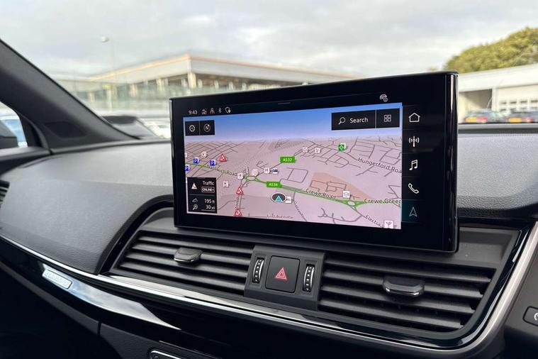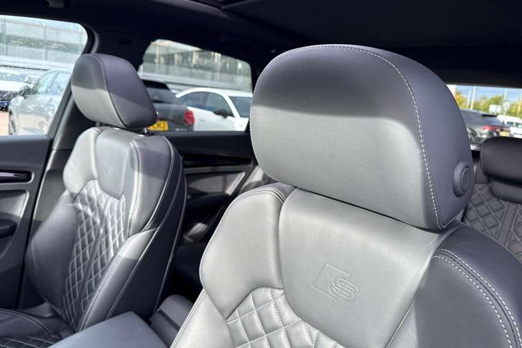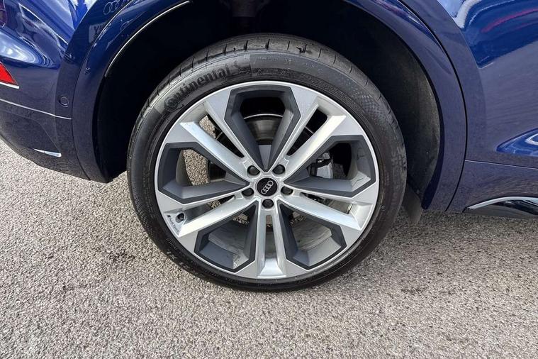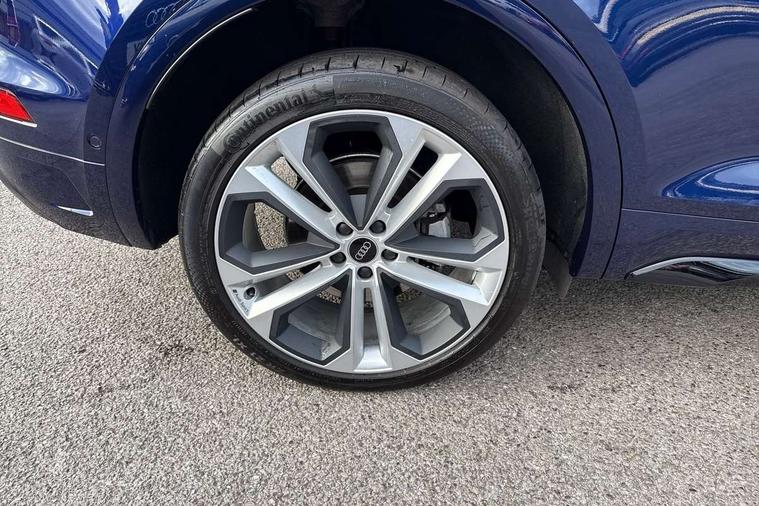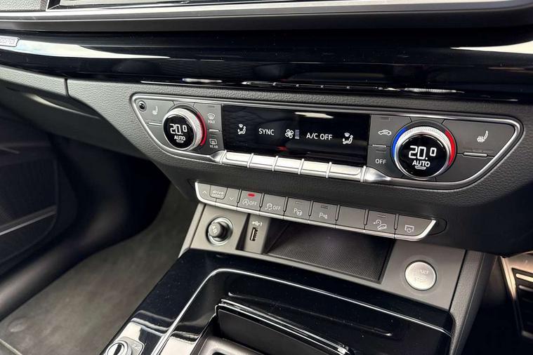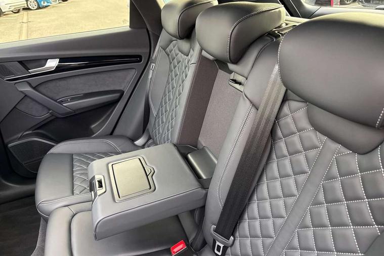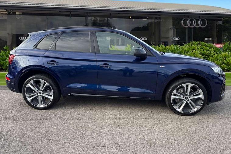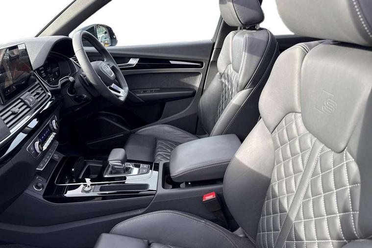 Acoustic front and rear parking sensor, Audi connect safety and service (e-call), Audi drive select, Audi virtual cockpit plus with 12.3" screen and three different layout designs, Audi wireless smartphone interface, Automatic start-stop system with coasting functionality and efficiency programme, Bluetooth interface, Camera based traffic sign recognition, Electro - mechanical power assisted steering, Lane departure warning, MMI navigation plus with 10.1" touch screen, Power tailgate, Reversing camera, Service interval indicator, Voice control system with Audi hotword activation "Hey Audi", Diesel particulate filter, Quattro on demand, S line sports suspension, 2 x USB charging port with aux input socket, 8 loudspeakers, DAB Digital radio, Acoustic windscreen, Auto dimming door mirrors, Auto dimming frameless rear view mirror, Automatic headlight adjustment, Automatic headlights and windscreen wipers, Black roof rails, Black styling with black rings, Body colour bumpers, Body colour rear diffuser with matt aluminium silver surrounds, Body colour underbody protection, Chrome plated exhaust trims, Daytime running lights, Door sills in Selenite silver, Electric adjustable/heated/folding door mirrors, Front air inlet surrounds in aluminium, Front and rear electric windows, Front radiator grille in honeycomb design, LED 3rd brake light, LED headlights and LED tail lights, Loading edge protection in stainless steel, Lower bumpers painted in contrast Manhattan grey, Rear chrome trim strip below lights, Rear privacy glass and rear side windows, Rear side wing doors, Rear wiper, Roof bars, S Line badges on the front wing panels, S Line front and rear bumpers, S Line rear spoiler, S Line side skirts, 3 rear headrests, Black cloth headlining, Comfort front centre armrest, Contrast stitching on seats, steering wheel and gear lever gaiter, Deluxe 3 zone electronic climate control, Front head restraints, Front sport seats with S embossed logo, Front/rear floor mats, Gear lever in black leather, Heated front seats, Height/reach adjustable steering column, Illuminated door sill trims with S logo, Luggage compartment cover, Manual seat adjustment with 4-way electric lumbar support, Single front passenger seat, Stainless steel pedals, Sunvisors with vanity mirrors, Top surface of the rear centre armrest in artificial leather, High gloss pack - Q5, LED interior light pack - Q5, 3 point seatbelts on all seats, 6 airbags - Driver, front passenger, curtain and side airbags, Attention and drowsiness assist, Electrically operated child locks on rear doors, Electromechanical parking brake, Electronic stabilisation control including ABS, ASR and EDL, First aid kit with warning triangle and vests, Front passenger airbag deactivation, Hill descent control, Hill hold assist, ISOFIX child seat mounting for front passenger seat and ISOFIX child seat mounting with Top Tether for outer rear seats, Multi collision brake assist, Pop-up bonnet for pedestrian protection, Pre sense city, Seatbelt monitoring, Tyre pressure warning, Anti theft alarm, Anti-theft wheel bolts, Remote central locking, Remote control key with SAFELOCK and keyless go, Air vents inserts and centre console in gloss black, Tool kit, Tyre repair kit,