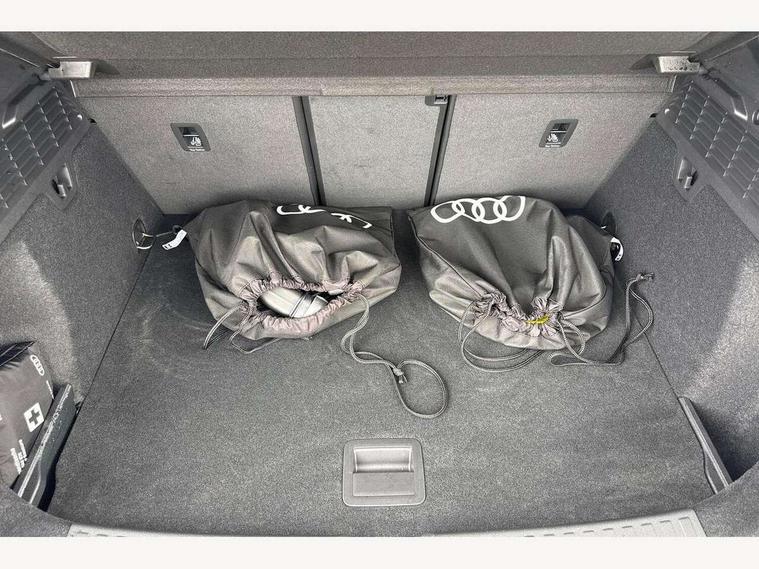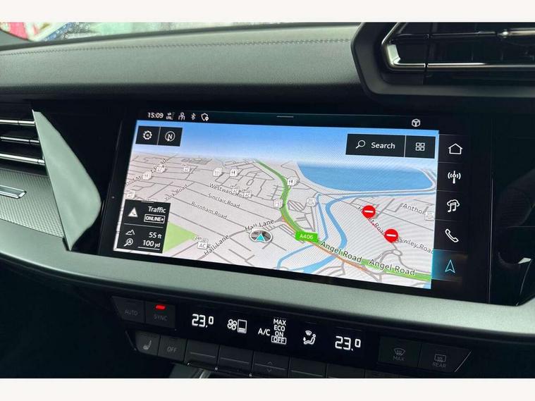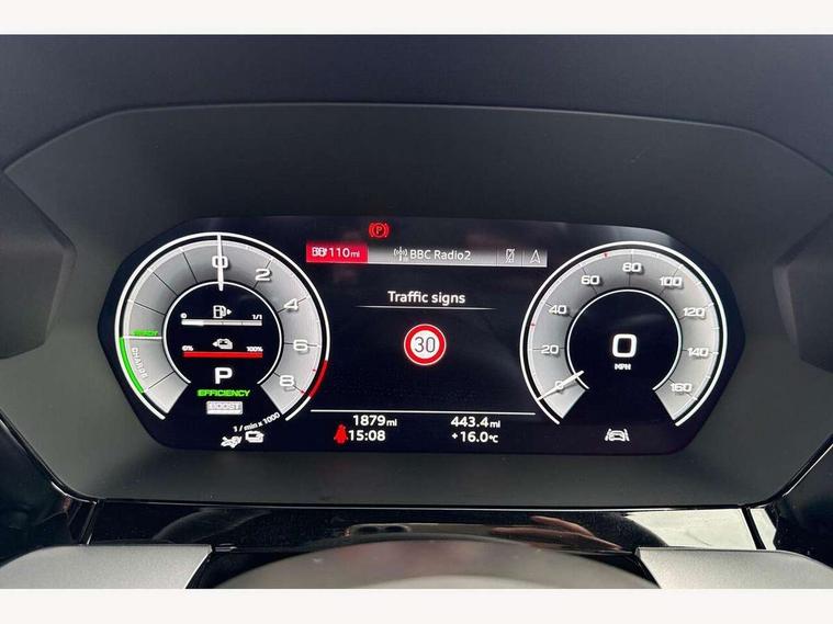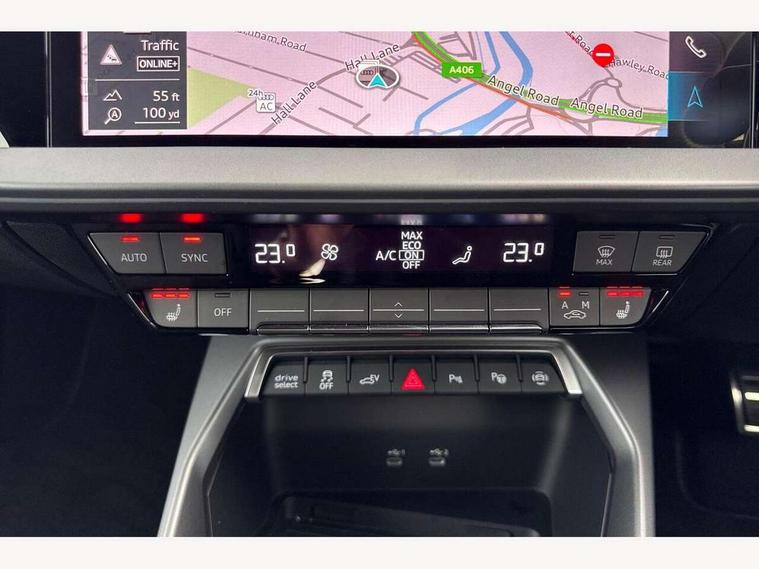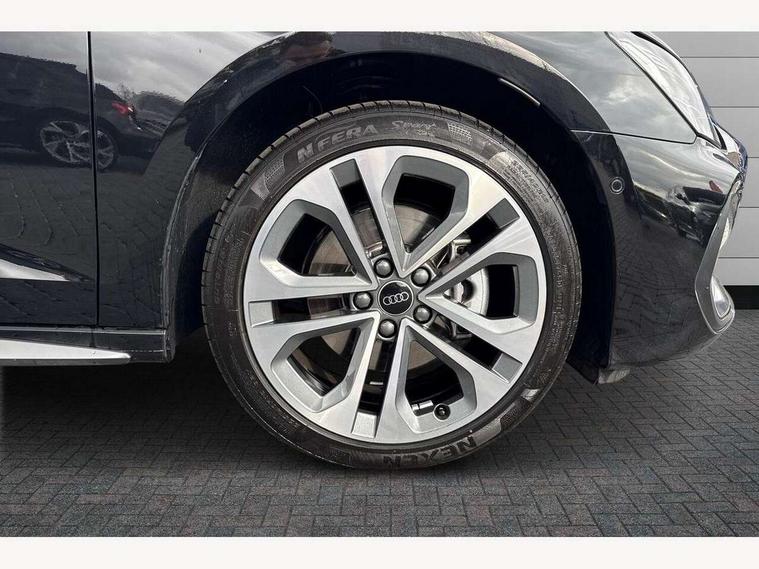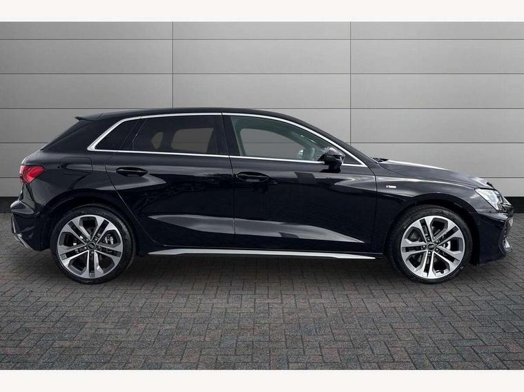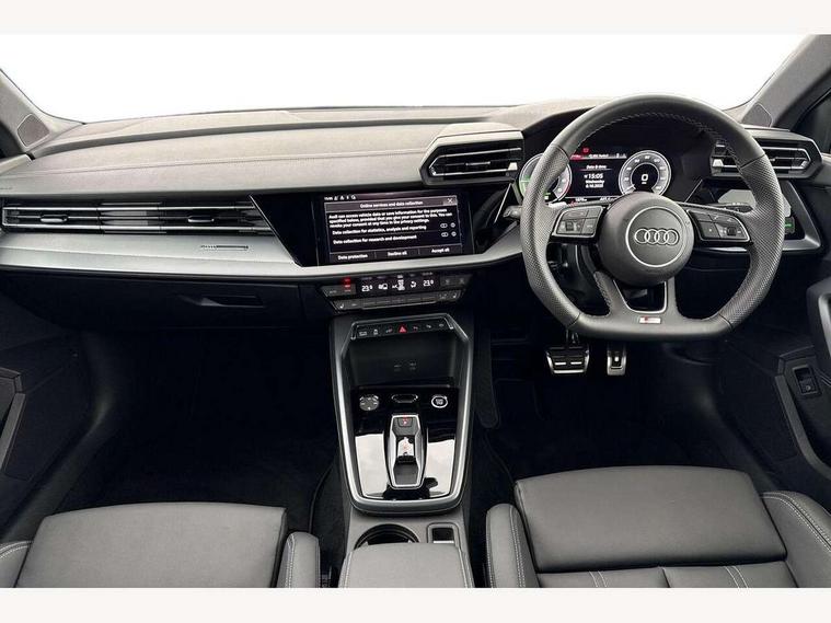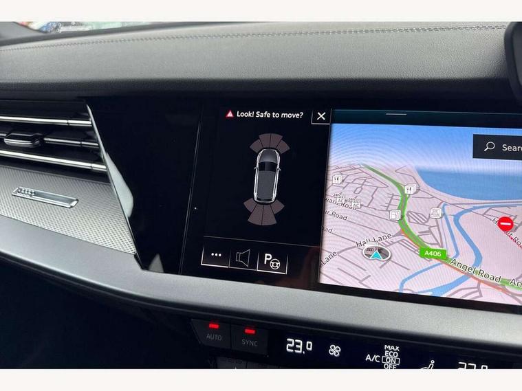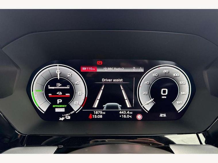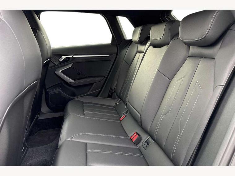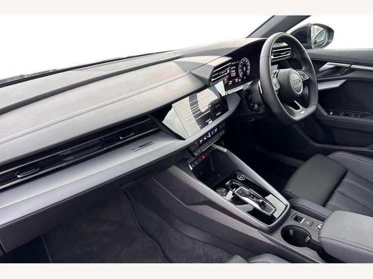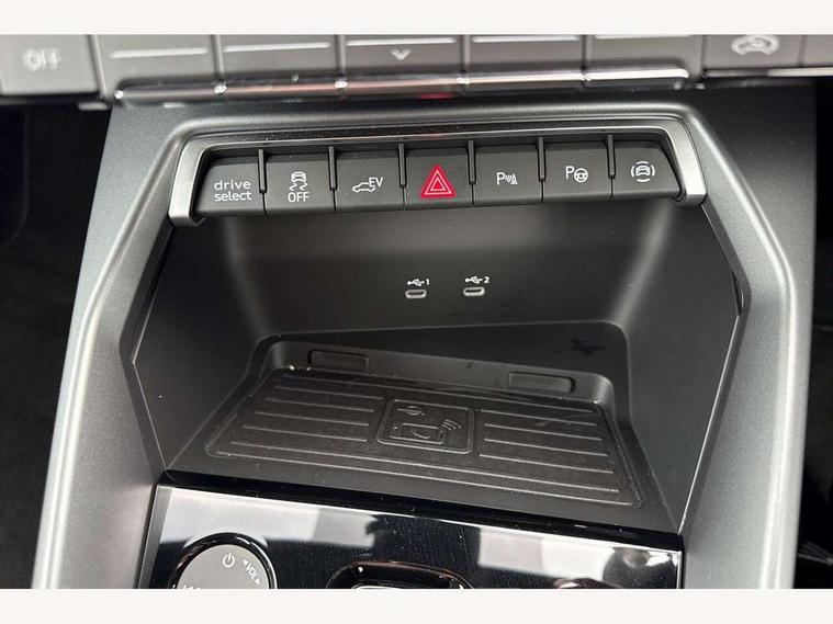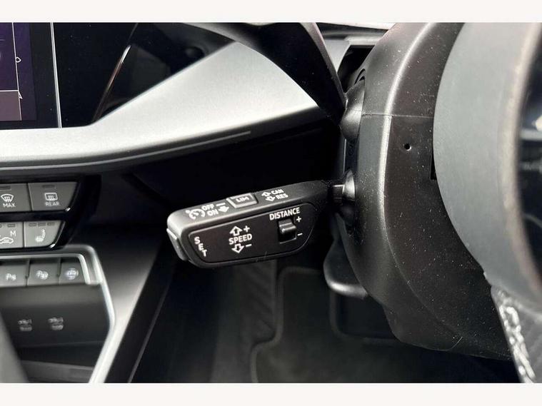 Adjustable speed limiter, Audi drive select, Audi smartphone interface with app store includes wireless Apple carplay, Android auto and Amazon alexa integration, Audi virtual cockpit plus - 12.3" full HD resolution dynamic digital instrument cluster, Automatic start/stop system with recuperation, Bluetooth interface, Camera based traffic sign recognition, Collision avoidance assistant, Cruise control, Distraction and Fatigue warning, e-Call (emergency call), Electromechanical power speed sensitive steering, Lane departure warning system, MMI Navigation Plus with high resolution 10.1" colour touch screen display, Park Assist with parking system Plus, Service indicator, Trip computer, Voice control system with natural language interaction, 3 pin 10 amp domestic charging cable, CCS socket for DC charging, Charging cable for public charging, mode 3 (type 2), up to 22 kW (AC), Compact charging system, Industrial connector CEE 32 A, 230 V, length 1.6 m, Standard suspension, Type 2 socket for AC charging, Audi Phonebox light with wireless charging, Audi sound system - 10 loudspeakers including centre loudspeaker and subwoofer, DAB Digital radio, USB ports with charging function in the rear, Acoustic glass windscreen, Aluminium window trim, Auto dimming frameless rear view mirror, Body colour exterior mirrors, Chrome exhaust tailpipes, Electrically adjustable/heated/folding/auto dimming door mirrors with integrated LED indications + kerb view function for passenger side, Exterior model badging, Front and rear side air inlets in grained matt black with dark liquid chrome frame, Front electric windows, Front radiator grill in high gloss dark chrome, Heat insulating glass windscreen, Illuminated door sills with aluminium inserts at the front with S logo, LED 3rd brake light, LED daytime running lights, LED headlights with LED rear lights and dynamic rear indicators, Light and rain sensors, Privacy glass - dark tinted rear window, rear door and side windows, Rear diffuser and grill in grained matt black with inlay in dark liquid chrome, Rear electric windows, Rear side wing doors, Rear wiper, S line bumpers, S roof spoiler, Side S line emblems on front wings, Side sill trim in dark liquid chrome, 12V socket and storage compartment in front centre console, 3 seat bench in 2nd row, 3 spoke flat bottomed leather multifunction sport steering wheel with gear shift paddles, 3-zone deluxe automatic air conditioning, 4 way electrically adjustable lumbar support for driver and front passenger, 40/20/40 split folding rear seat bench, Black cloth headlining, Convenience auxiliary air conditioning, Front and rear centre armrest in artificial leather, Front and rear centre armrest in artificial leather with contrasting stitching on armrests and instrument panel, Front and rear headrests, Front/rear floor mats, Heated front seats, Height and reach adjustable steering wheel, Manual boot compartment lid, Manually adjustable front seats, Rear cup holders, S badging on the steering wheel, Seat side bolsters, Single front passenger seat, Stainless steel pedals and front footrest in black, Twin leather upholstery with front sports seats S embossed logo, Aluminium interior elements pack - A3 Sportback, Multi-coloured LED interior lighting package - A3, 3x3 point rear seat belts, Acoustic vehicle alerting system, Driver and front passenger airbag with passenger airbag deactivation, Electronic Stabilisation Control (ESC) including ABS, ASR and EDL, First aid kit with warning triangle and 2 safety vests, Front side airbags with head airbags and interaction airbag, Hill hold assist, Pre-sense front with pedestrian and cyclist detection, Seatbelt monitoring, Tyre pressure loss indicator, Anti theft alarm, Anti-theft wheel bolts, Electronically operated child locks, Immobiliser, Remote central locking with safelock, Dash & door Inlay in dark aluminium Spectrum, Tyre repair kit,