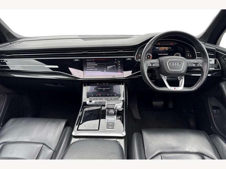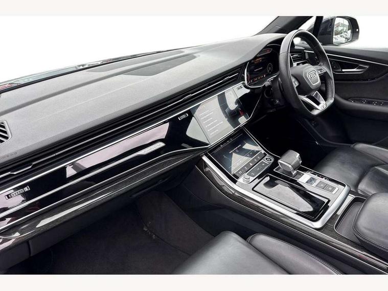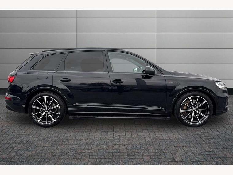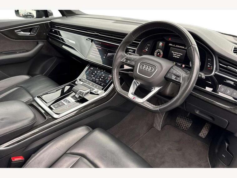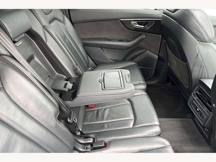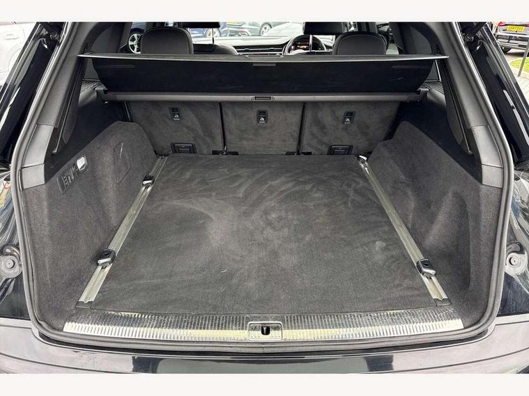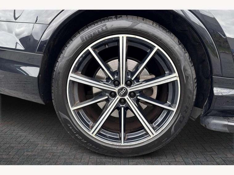 Audi connect safety and service (e-call), Audi drive select (Auto, Comfort, Dynamic, Efficiency, Individual, Off-road and All road), Audi phone box with wireless charging, Audi smartphone interface includes wireless Apple carplay/Android Auto, Audi virtual cockpit - 12.3" high-resolution LCD display with fully customisable instrument cluster, Camera based traffic sign recognition, Electromechanical steering, MMI navigation plus with MMI touch screens includes 10.1" and 8.6" screens with haptic feedback, Natural voice recognition, Power operated tailgate, Start/stop system, 3 pin 10 amp domestic charging cable, 75 litre fuel tank, Adaptive air sports suspension, Quattro all wheel drive with self locking centre differential, Type 2 mode 3 charging cable, Type 2 socket for AC charging, Audi music interface - front 2 USB-C ports with charger and data functions, DAB digital radio module, Audi matrix LED headlights with dynamic front and rear indicators, Auto dimming frameless rear view mirror, Black roof rails, Bumpers in contrast paint scandium grey finish includes door trim and wheel arch trim strips, inlays in door strip contain quattro embossing, Electrically adj heated/folding + automatically dimming exterior mirrors with memory + automatic kerb side function for passenger side exterior mirror, Heat insulating glass in windshield, Integrated LED indications in door mirrors, LED daytime running lights, LED rear tail lights, Privacy glass - dark tinted rear and rear side windows from B-pillar backwards, 4 zone deluxe automatic climate control, 5 seat layout with ISOFIX points for the front passenger seat and rear passenger seat, Black cloth headlining, Comfort front centre armrest, Folding rear seats, Front head restraints, Front/rear floor mats, Heated front seats, LED interior ambient lighting, Rear head restraints, Sunvisors with illuminated vanity mirrors, Tool kit, Comfort and sound pack with Bang + Olufsen premium sound system - Q7, Titanium black styling pack - Q7/SQ7, 3 point seatbelts on all rear seats, Acoustic vehicle alerting system, Audi pre sense front, Driver and front passenger, front side and curtain airbags, Electromechanical parking brake, Electronic Stabilisation Control (ESC) including ABS, ASR and EDL, Extended pedestrian protection measures, Hill hold assist, Seatbelt monitoring, Tyre pressure loss indicator, Warning triangle and first aid kit, Anti theft alarm, Anti-theft wheel bolts and wheel loosening detection, Keyless go with remote central locking, Polished oak trim with grey finished, Tyre repair kit,