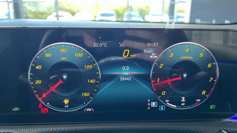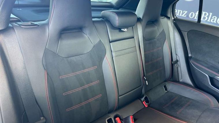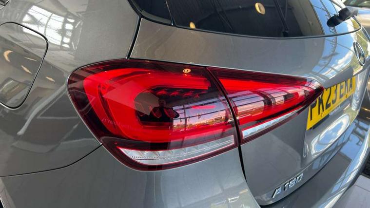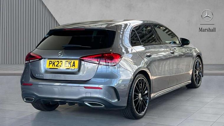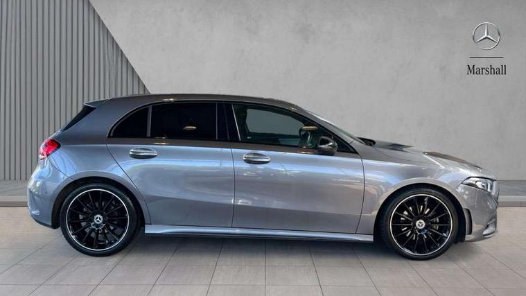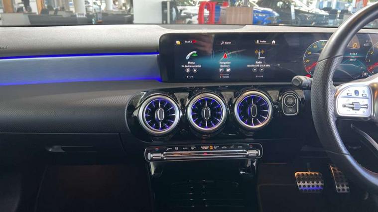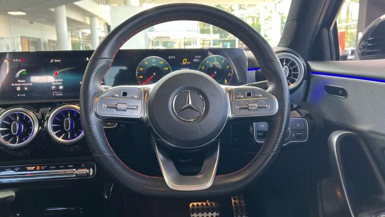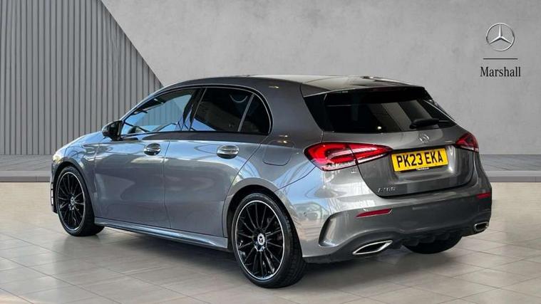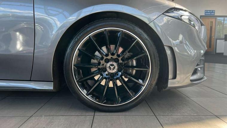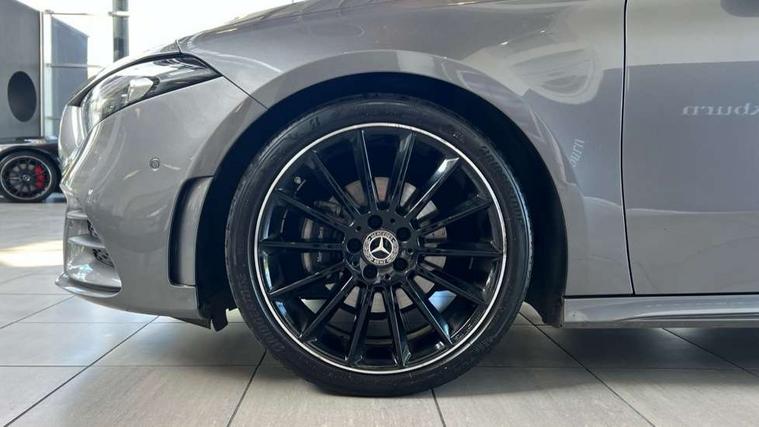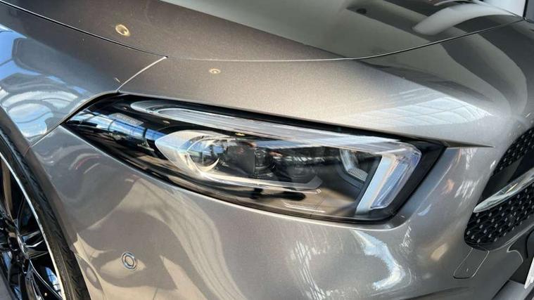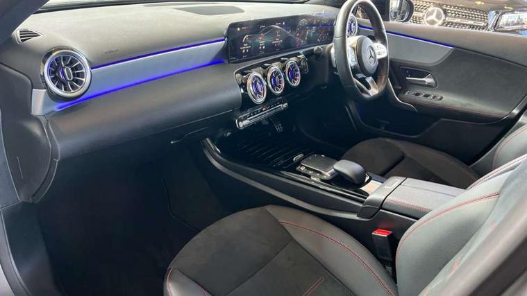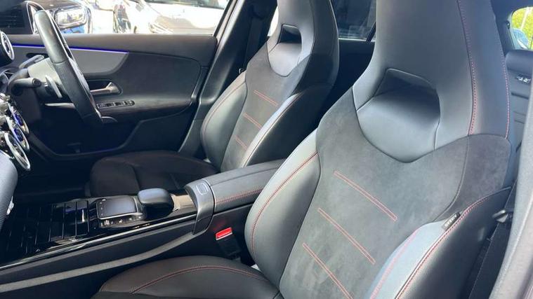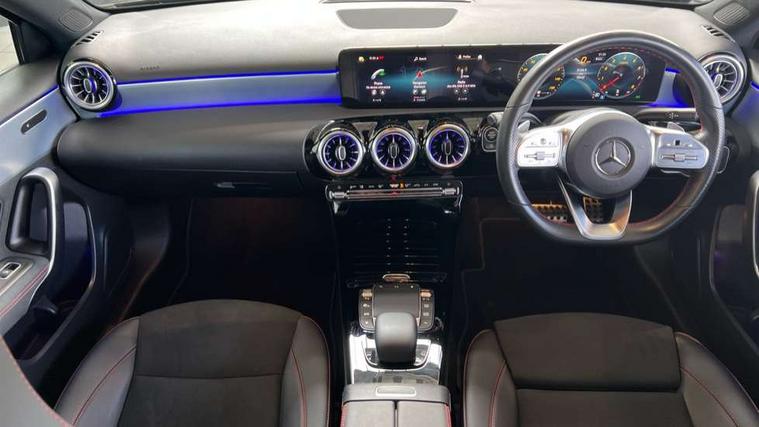 10.25" Digital instrument cluster display screen, 10.25" media display, 180 degree rear view camera with parking guidelines, Active parking assist with visual and audible warning of detected obstacles, Attention assist, Brake pad wear indicator warning light, Car wash mode, Cruise control + speed limiter, Direct steering, Dual bluetooth interfaces, DYNAMIC SELECT with a choice of driving modes (ECO, Comfort, Sport and Individual), ECO start/stop function, Fluid level warning indicator for fuel, oil, coolant and washer fluid, Hard-disk navigation, Hey Mercedes Voice activation, Lamp failure indicator, Lane keeping system, Mercedes me connect including emergency call system, accident recovery, breakdown and maintenance management, Mercedes me remote services, Outside temperature gauge, Owners manual in English, Pre-installation for private car sharing, Preinstallation for Mercedes Benz link, Service indicator (ASSYST), Smartphone integration with Apple CarPlay and Android auto, Speed limit assist, Speed sensitive power steering, Traffic sign assist, Trip computer, Ultrasonic sensors positioned in the front and rear bumpers, Lowered comfort suspension, Rear axle torsion beam, 2 USB ports (type C) in rear stowage compartment and one in front of center console, 6 speakers, DAB Digital radio, MBUX multimedia system with DAB digital radio and touchpad including satellite navigation, Mercedes-Benz sound system - 100W, 4 Electric Front and Rear windows, Adaptive brake lights, AMG bodystyling - Front apron with splitter in chrome, rear apron with chrome trim and chrome visible trim elements in tailpipe, Automatic headlights, Black weather strip, Body colour bumpers, Body colour door handles with chrome inserts, Body colour side skirt, Electric adjustable and heated door mirrors with integrated LED side indicators, Exclusive diamond radiator grille, Exhaust system - Twin visible tailpipes in polished stainless steel, Headlamp assist automatic headlamp activation, Heated glass rear windscreen + timer control, LED daytime running lights, LED High level third brake light, LED tail lamp, Multibeam LED headlights with adaptive highbeam assist plus, Panoramic sliding sunroof, Privacy glass, Radio aerial, Rain sensing windscreen wipers with two sensitivity settings, Rear fog lights, Rear side wing doors, Rear wiper, 3 seat bench in 2nd row, 3 Spoke flat bottom leather multi function steering wheel with perforated leather in grip area, 40:20:40 split folding rear seats, Artico man-made leather/Microfibre Dinamica upholstery with red contrast stitching, Auto Mercedes-Benz child seat recognition sensor, Black air vents with surround in silver chrome, Black roof lining, Brushed stainless steel sports pedals with rubber studs, Controller on centre console with chrome surround, Floor mats with AMG lettering, Front centre armrest with storage compartment, Front seat backs luggage nets, Galvanished gear shift paddles on steering wheel, Heated front seats, Height/reach adjustable steering column, Illuminated Mercedes Benz lettering front door sills with changeable cover, Interior lighting - 64 colour Ambient lighting, Interior mirror with reading lamps in black and frameless, Rear armrest with 2 cupholders, Rear head restraints, Seat occupancy sensor for front passenger seat, Single front passenger seat, Sports seats with integrated headrests, Stowage compartment in centre console with retractable cover, Sunvisors with illuminated vanity mirrors, Touchpad on center console, Twin front cupholders, Two zone thermotronic luxury automatic climate control, Light and sight pack - A Class, Mirror package - A Class, Night pack - A Class Saloon/Hatchback, Seat comfort pack - A Class, 3 rear 3 point seatbelts, ABS with Brake Assist, Active bonnet, Active brake assist includes forward collision warning system with autonomous braking, Adaptive brake assist with hold function and hill start assist, Black seatbelts, Childproof locks manually operated for rear doors and electrically operated for rear power windows, Crash responsive emergency lighting, Driver and passenger head and side airbags, Drivers knee airbag, Dual stage driver/passenger airbags, Electronic parking brake, ESP curve dynamic assist, ESP with ASR, Front and rear seatbelt reminder, Front brake callipers with Mercedes Benz lettering, ISOFIX and top tether child seat fixing points in two outer rear seats, Tyre pressure monitoring system, Warning triangle and first aid kit, Window airbags, Alarm system/interior protection/immobiliser, Keyless entry lock/unlock, Keyless Go, Remote central locking and crash sensor with emergency opening function, Urban guard vehicle protection system with immobiliser and interior protection, Matrix look light longitudinal grain aluminium trim element, 19" multi spoke light alloy wheels painted in black with a high sheen rim flange, Summer tyres, Tirefit sealant kit,