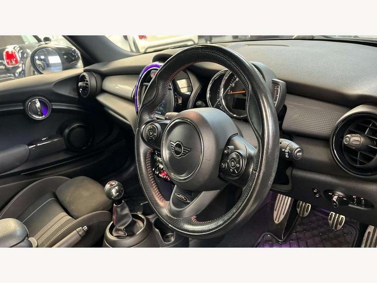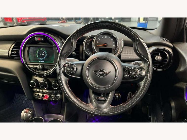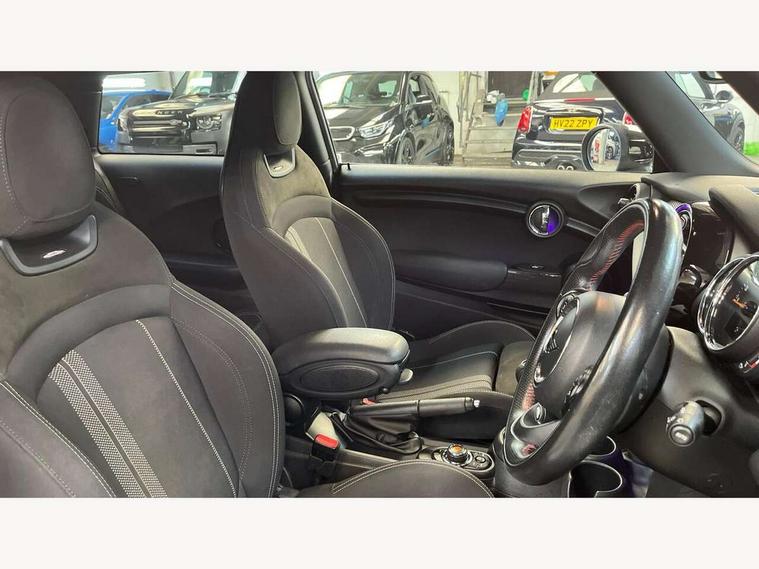 Automatic start/stop function with brake energy recuperation, Compatible mobile phone bluetooth with audio streaming, Electro-mechanical speed dependant steering assistance, Instrument cluster, Mini E-call, MINI TeleServices, On board computer, Service interval indicator, Double Vanos system, Fully variable valve control, High precision injection, Performance Control, 6.5" touchscreen with LED ring, FM tuner and DAB digital radio, Automatic headlight activation switch, Body colour fuel filler cap, Chrome border high gloss black slats radiator grille, Dynamic brake lights, Electric front+rear windows, Heated rear window, Heated windscreen washer jets, John Cooper Works - aerodynamic kit (front and rear apron, spoiler), front and rear sport bumpers and part-painted side sills with door sill finishers, John Cooper Works rear spoiler, LED headlight with closed ring and daytime driving lights, Left exhaust tailpipe with chrome finisher, Metal door sill strips with MINI imprint, Model logo Cooper on right of tailgate, Rain sensor window wipers, Rear fog lights, Rear LED lights with union jack design, Rear window wiper, Side scuttle panel with integrated indicator, Sun/heat protection glass, White indicator lenses, 12V Accessory socket in centre console, 4 lashing eyes in luggage compartment, 60/40 split folding rear seat, Anthracite headlining, Chrome interior highlights, Cupholders, Front and rear head restraints, Front and rear isofix with front passenger airbag deactivation, Glove compartment, Height and length steering column adjustment, Interior lighting with 12 basic colours selectable via toggle switch in roof, John Cooper Works leather steering wheel with contrasting stitching in Chilli Red with John Cooper Works logo, John Cooper Works Logo in seat, Leather gearshift lever and handbrake gaiters, LED reading lights, vanity mirror lights, front foot well light and spotlight on front seats, Manual air conditioning, Mechanical seat adjustment, driver seat height adjust, forward/back and front seats backrest, Mini logo projection on floor from drivers exterior mirror, Multifunction steering wheel, Storage compartments in doors, Sunvisors with vanity mirrors, 3 point seatbelts on all four seats, 6 Airbags - front, side, head and seat belt tensioners, Anti-lock braking system (ABS), DSC - Dynamic Stability Control, Front and rear disc brakes, Hill start assist, Single tone fanfare horn, Tyre pressure monitoring system, Alarm system with tilt sensor, monitoring doors, bonnet interior and tailgate, Electronic vehicle immobiliser, Start/stop toggle with keyless go, Tool kit,