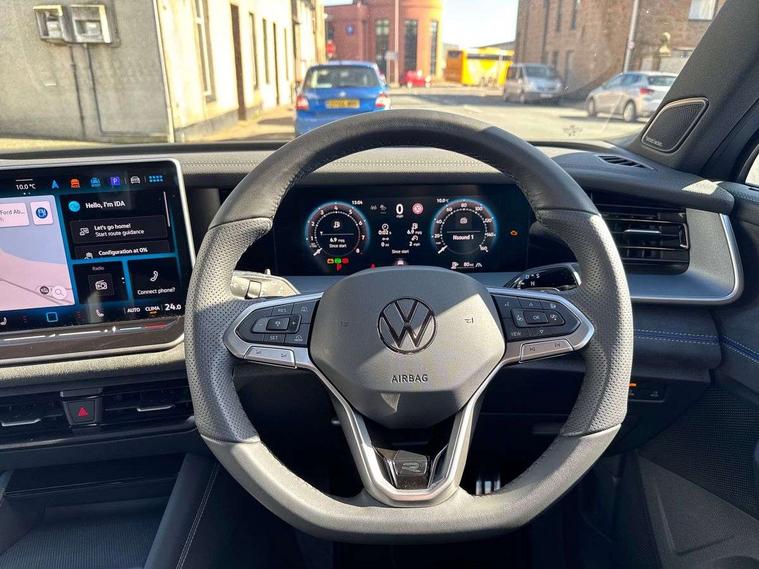 Adaptive cruise control (ACC), Digital Cockpit Pro - 10.25" high resolution dash display screen with customisable menus and information, Driver alert system, Driver attention monitoring system, Dynamic road sign display, E-Sim card for online connectivity, eCall emergency call system, Lane change system, Side assist, Rear traffic alert and Exit warning system, Multifunction front facing camera, Oncoming vehicle braking when turning including swerve support, Start/stop system with regenerative braking, Voice activation spoken voice commands for telephone and navigation system, Warning signal and warning light for front and rear seatbelts not fastened, Wireless App-Connect, Front wheel drive, Digital radio reception (DAB), Diversity antenna for FM reception, Air intake with Chrome trim, Auto dimming interior rear view mirror, Automatic headlight control system, Body colour door handles, Chrome moldings on the side windows, Coming/leaving home lighting function, Dynamic headlight range control with dynamic cornering light, Exterior mirrors convex on the left and aspherical on the right, Heat insulating glass in side and rear windows, Illuminated Volkswagen logo rear with animation, Laminated safety glass winshield, heat insulating, LED 3rd brake light, LED separate signature day time running light, Puddle lights, Rain sensor windscreen wipers, Rear fog light on one side, reversing light on both sides, Rear side wing doors, Rear wiper, Reverse activated passenger's door mirror, Surround lighting with welcome light, Volkswagen logo in front, illuminated lighting animation with wake up/goodbye scenario and illuminated door handles, 10 colour interior ambient lighting, 12V outlet in center console rear and in luggage compartment, 3 rear headrests, 3 rear seat bench in 2nd row, backrest split folding with centre armrest and 2 seats in 3rd row of seats, Black roof lining, Brushed stainless steel pedals, Carpet mats, front and rear, Centre console with illuminated storage compartment with sliding cover and two drinks holders, Chrome elements on the mirror switch and power window switches and door pulls, Door and side trim panel insert in Art velour, Flat luggage compartment floor, Front centre armrest, Front scuff plates in alumium, ISOFIX anchors for child seats on outer rear seats and front passenger seat compatible with i-Size, Mechanical rear seat release, Power adjustable lumbar support in front, Single front passenger seat, Sports comfort seats in front, Sun visors with illuminated vanity mirrors, 3 Point seat belts in front with pretensioners, 3 point seatbelts in outer rear with ECE label, Autonomous emergency braking front assist with pedestrian and cyclist monitoring, Driver and front passenger airbag with front passenger airbag deactivation, Electronic parking brake with auto hold, First aid kit with warning triangle and safety vest, Front and rear curtain airbags, Front and rear side airbags, Front centre airbag, Front disc brakes, Hill start assist, Rear disc brakes, Two tone horn, Decorative material set R-Line, Interior door handle in matte chrome,