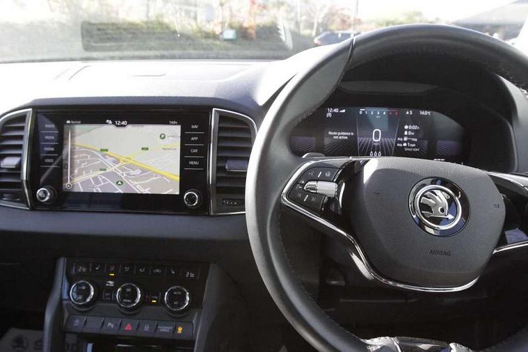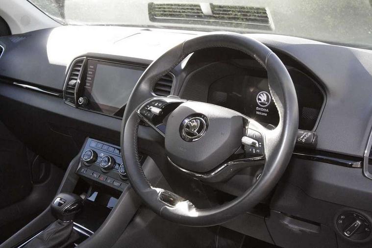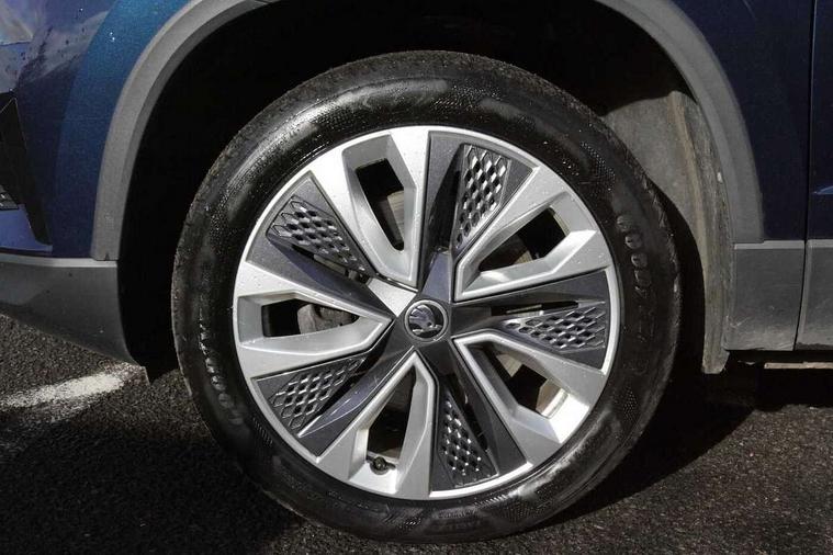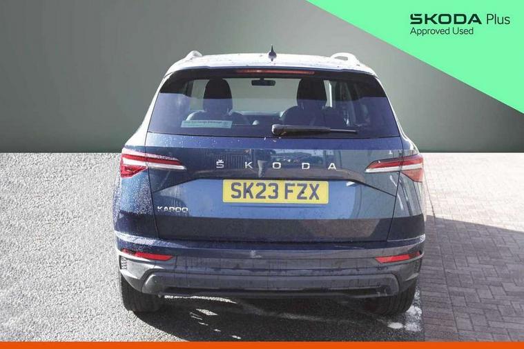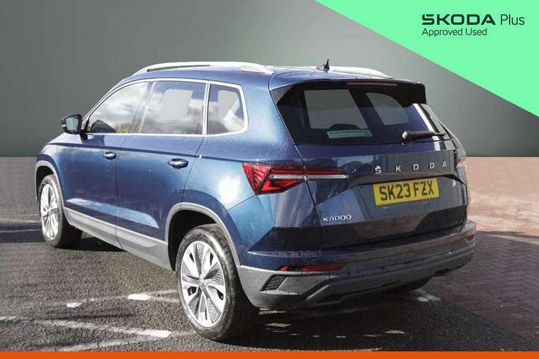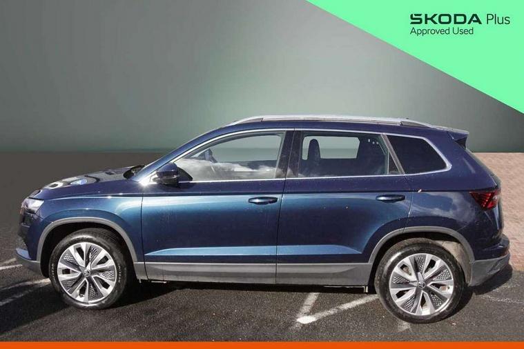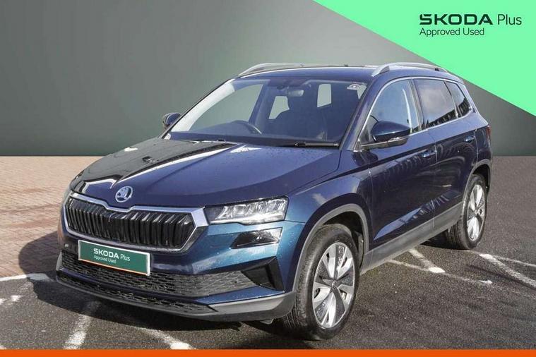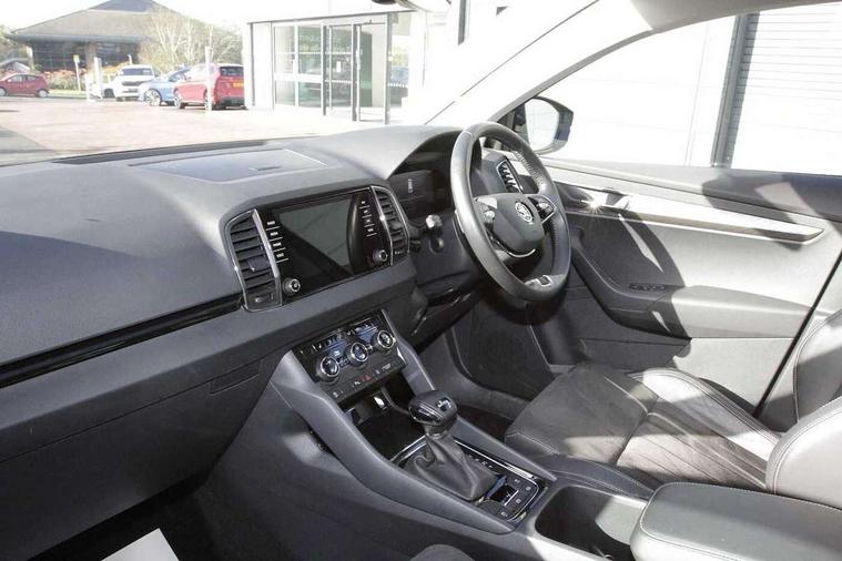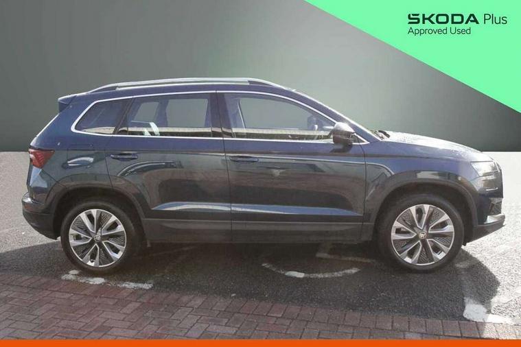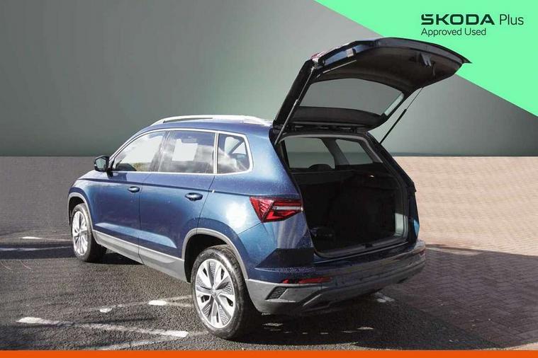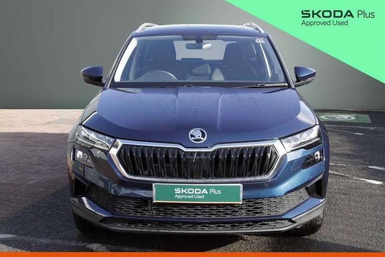 8" Digital display, Care connect, Driver fatigue sensor, Emergency services call system, Outside temperature gauge, Service interval indicator, SmartLink wireless for Apple and wired for Android, Start/stop system with regenerative braking, USB C Port x 2 in front centre console, 8 Speakers, DAB radio with Bluetooth, USB connection, Acoustic glass, Aero front windscreen wipers with intermittent function, Auto dimming rear view mirror with light and rain sensors, Black electric window control buttons, Body colour door mirrors and handles, Dynamic headlight range control with cornering light function, Electric front and rear windows with child proof lock, Heated rear windscreen, LED daytime running lights, LED rear lights with high functionality welcome effect and dynamic indicators, Light assistant (coming/leaving home/tunnel light), Plastic scuff plates, Privacy glass, Rear side wing doors, Rear spoiler, Rear window wiper with washer system and intermittent control, Safety reflectors on front doors, 1.5 litre bottle holders in driver and front passenger door panels, 12V socket in boot, 12v socket in front centre armrest with storage compartment and rear air vents, 2 Folding hooks and nets in boot, 2 spoke leather heated multifunction steering wheel with DSG paddles, 2 x Tablet holder, 3 rear height adjustable headrests, 3 seat bench in 2nd row, 4 foldable roof handles with rear coat hooks, Black floor carpet, Chrome inner door handles, Decorative door sills with KAROQ badging, Double sided boot floor, Foldable hooks in the boot, Front head restraints, Height adjustable front three point seats belts with tensioners, Height/reach adjust steering wheel, Ice scraper, Illuminated glovebox, Illuminated luggage compartment, Isofix child seat preparation for front passenger seat, Isofix child seat preparation outer rear, Manual lumbar support for front seats, Pen holder, Pollen filter, Rear boot cover, Rear reading lights, Rubbish bin door, Safety vest holder, Single front passenger seat, Storage box in upper central dashboard closed, Sunvisors with illuminated vanity mirrors, Textile floor mats, Ticket holder, VarioFlex seats with standard rear seat release, Chrome roof rails + chrome pack - Karoq, Parking pack - Karoq, Automatic door unlocking in case of crash, Automatic fuel cut off in case of crash, Child locks on rear doors, Driver airbag, Electronic parking brake with auto hold function, Emergency rear braking signal, ESC including ABS, MSR, ASR, EDS, HBA, DSR, RBS, MKB and traction control, Front side airbags, Hill hold control, Knee airbags, Passenger airbag with switch-off function, Pedestrian monitor, Seatbelt reminder signalisation and pretensioner for all seats, Three point seatbelts rear, Two tone horn, Tyre pressure display, Tyre pressure monitor, Alarm with interior monitoring, back up horn and tilt sensor with safe function, Electronic engine immobiliser, Keyless entry and start/stop, Remote central locking with 2 remote folding keys, Chrome framed air vents, 18" Procyon silver alloy wheels with anthracite aero inserts, Anti-theft wheel bolts protection, Storage on wheel cover, Tool kit,