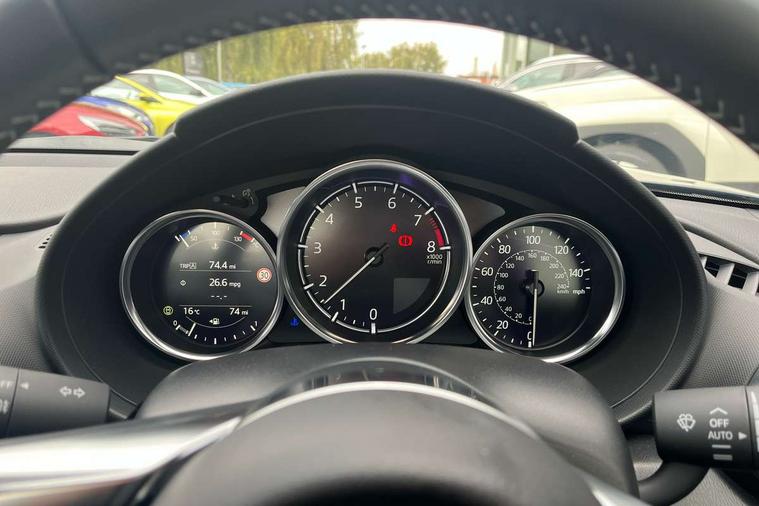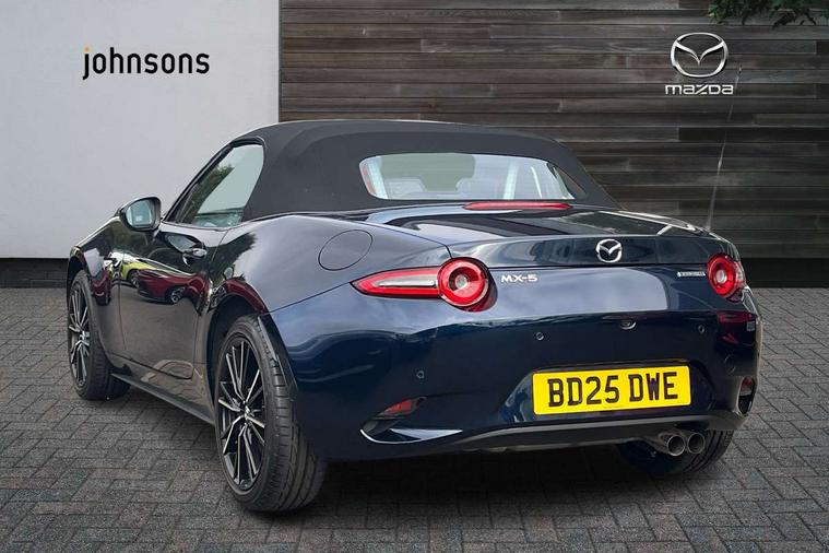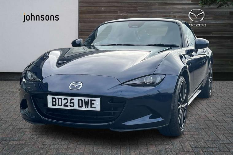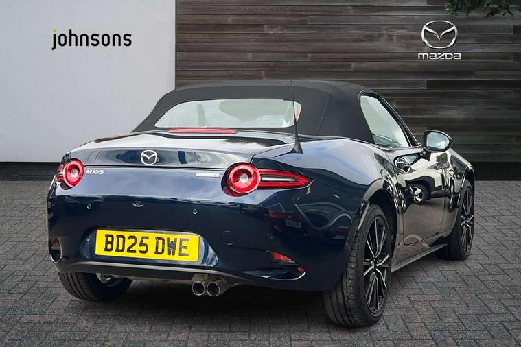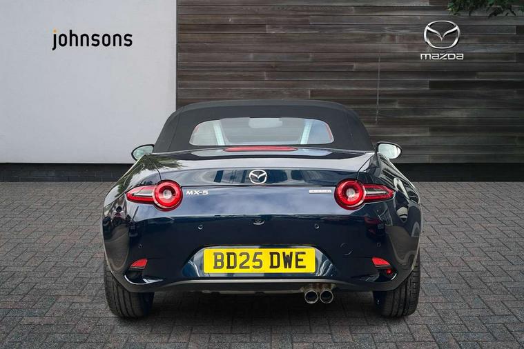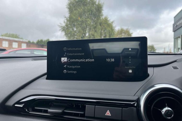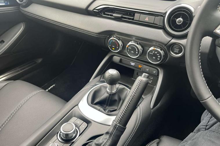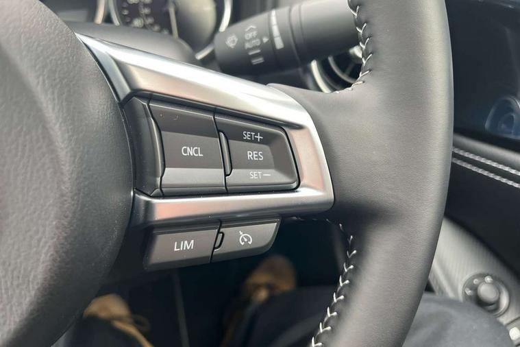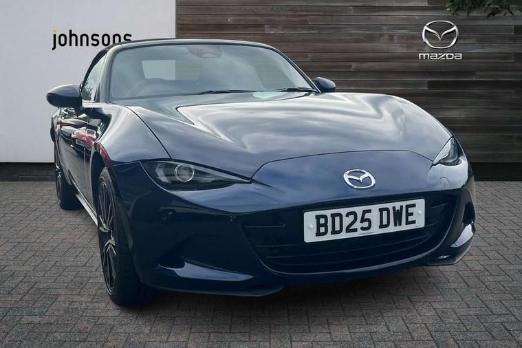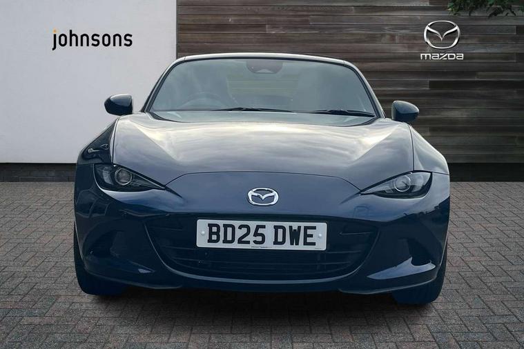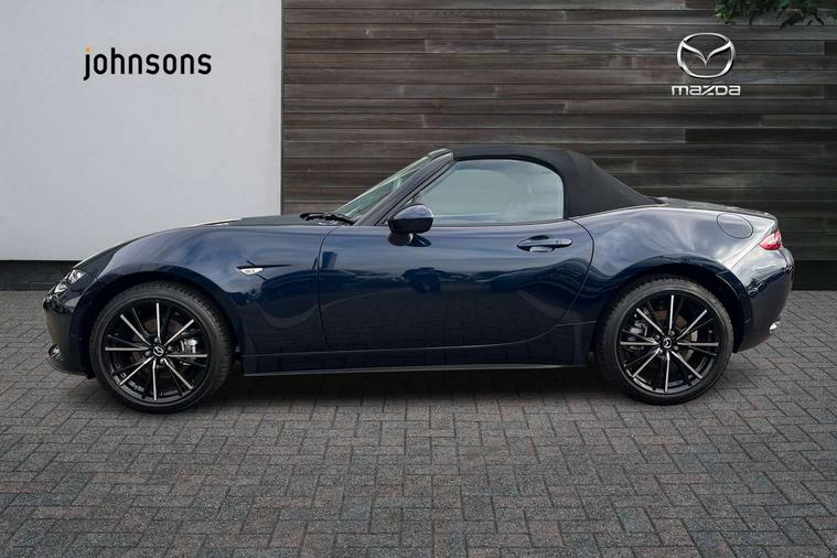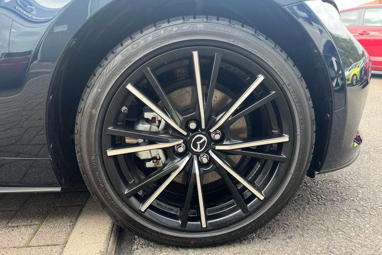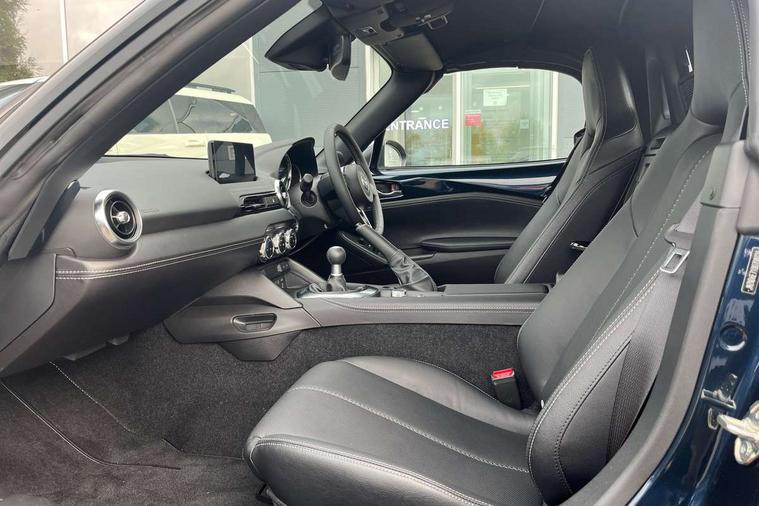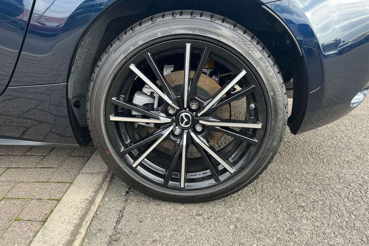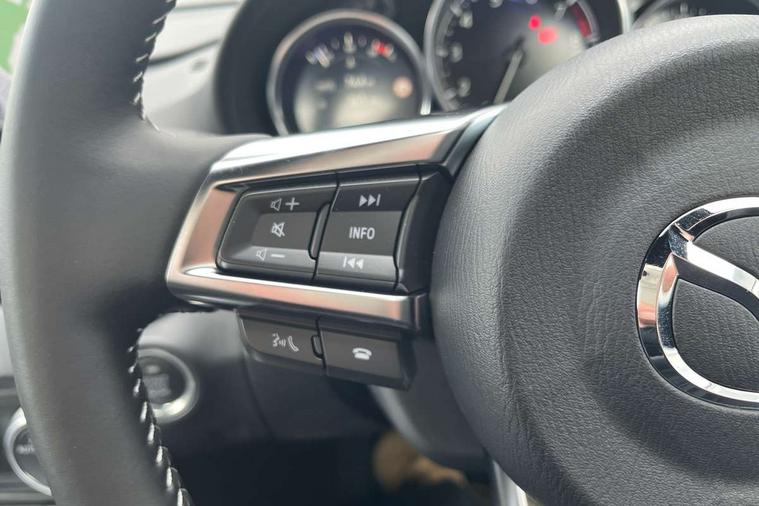 8.8" Colour centre touch screen display with Mazda Connect infotainment, Aha and stitcher app, Analogue speedometer, Apple car play/Android Auto, Blind spot monitoring with rear cross traffic alert, Cruise control with Intelligent speed assist, Driver alert system, eCall emergency call system, Emergency stop signalling system, Engine start/stop button, Hands free phone preparation, Integrated bluetooth with hands-free calling, bluetooth audio and easy access to phone contacts, Integrated navigation system, Kinematic posture control, Lane departure warning system, Lane keep assist, Multi dot display tachometer and electric odometer, PAS, Rear parking sensor, Reversing camera, Service indicator, Traffic sign recognition, Trip computer, Water temperature gauge, Asymmetric limited slip differential, I-ELOOP, i-stop, Sports suspension featuring Bilstein dampers, 2 x USB Type-C inputs, Multimedia Commander including separate volume dial, Premium Bose sound system with 9 speakers with 2 in each front headrest, AM/FM/DAB radio and MP3, Steering wheel mounted audio/bluetooth controls, Adaptive LED Headlights, Automatic headlamp levelling, Black scuff plates with stainless steel insert, Body colour bumpers, Body colour co ordinated interior upper door trim, Body coloured electric/heated door mirrors, Coming/leaving home lighting function, Dual exhaust pipes, Dusk sensitive headlamps, Electric front windows/one touch facility, Exterior body colour co ordinated upper door panel trim with black vinyl and silver stitching, Frameless auto dimming rear view mirror, Front intermittent wipers, LED 3rd brake light, LED daytime running lights, LED indicator lights, LED rear lights, Manually operated black premium cloth soft top with heated rear glass window, Piano Black fashion bars, Rain sensing front wipers, Rear boot, 12V socket, Centre console storage box, Chrome Air conditioning dials, Climate control air conditioning, Coin Box, Driver and front passenger sunvisors with covered vanity mirror and driver ticket holder, Driver seat manual slide, recline and tilt adjustment, Front centre armrest, Front head restraints, Gear shift indicator, Heated front seats, in 3 heat levels, Interior courtesy light, ISOFIX front passenger seat child seat compliance, Leather gear knob, Leather handbrake lever, Leather steering wheel, Lockable rear centre box with lid, Passenger seat + manual slide/recline adjust, Perforated leather upholstery, Single front passenger seat, Strut brace, Tilt/telescopic steering column, Two cupholders, Windblocker, 3 point ELR front seatbelts with pretensioners, ABS+Electronic Brake force Distribution, Deployable Hood System (DHS), Driver and passenger seatbelt reminder audible warning, Dynamic stability control with track mode, Exit warning, Front dual stage driver and single stage front passenger airbags, Front smart city brake support with autonomous emergency braking (SCBS), Hill hold assist, Passenger airbag deactivate switch, Side airbags, Smart city brake support - Rear (SCBS-R), Traction control, Tyre pressure monitor, Remote central locking with deadlocking and remote boot release, Smart keyless entry, Superlocking, Thatcham category 1 alarm + immobiliser, Centre Console - Vinyl leather, Chrome air vent surrounds, Dashboard panel - Black Vinyl, 17" Black machined alloy wheels, Tyre puncture repair kit,