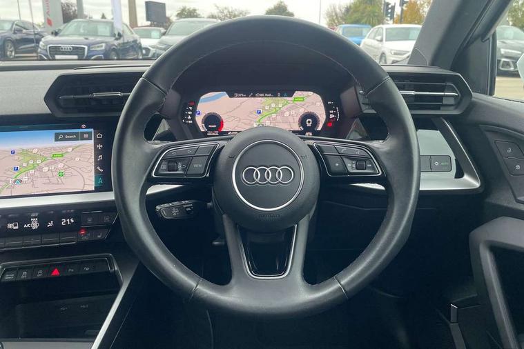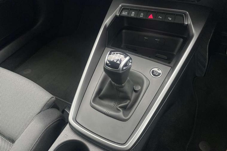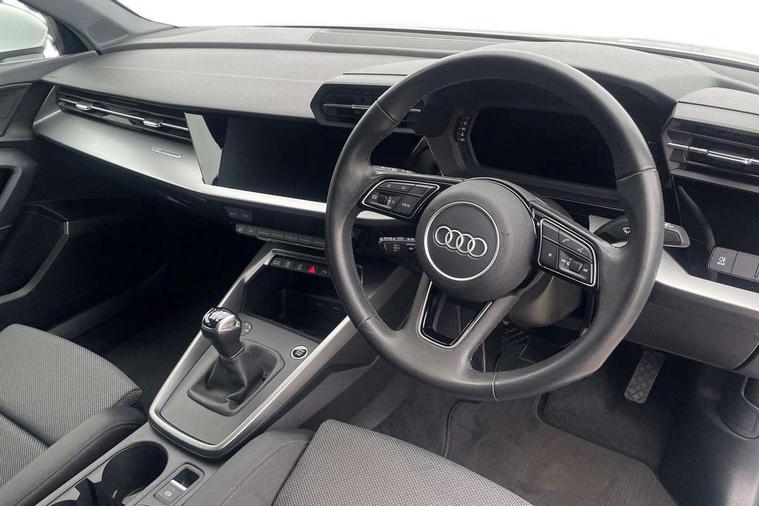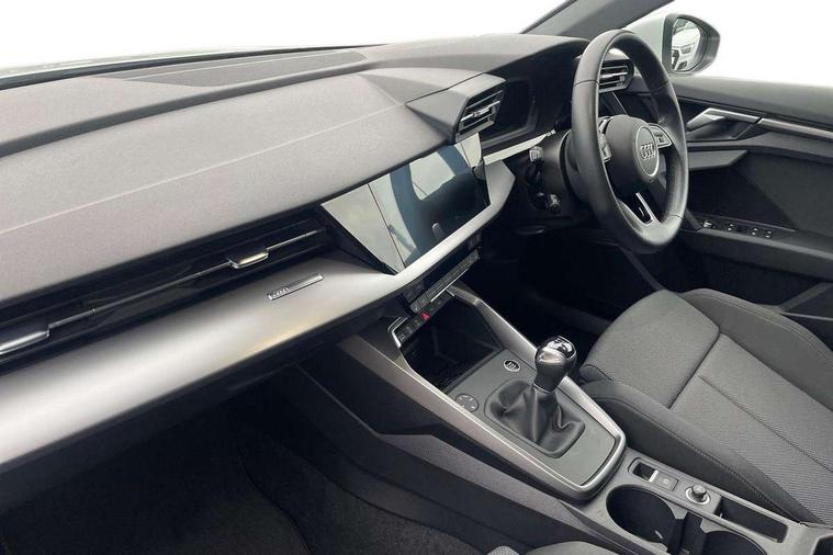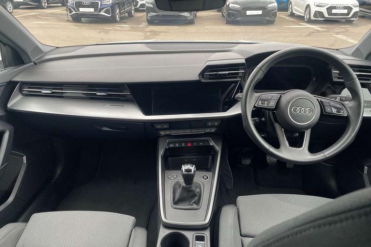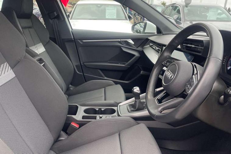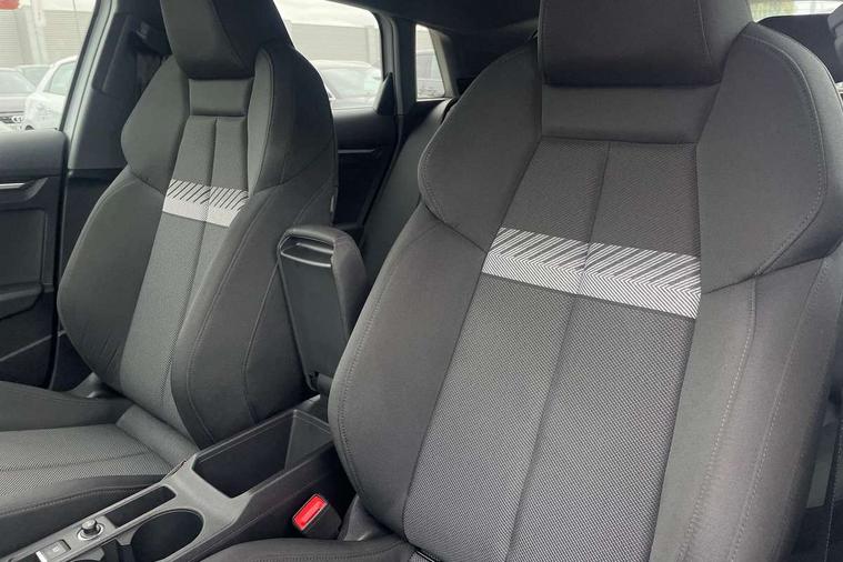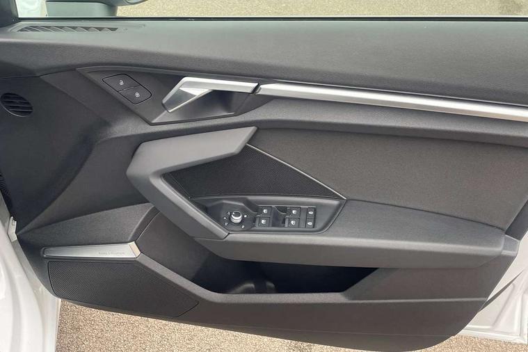 Audi drive select (Auto, Comfort, Dynamic, Efficiency and Individual), Audi smartphone interface, Audi Virtual Cockpit - 10.25" digital and colour instrument cluster, Automatic start/stop system with recuperation, Bluetooth interface, Camera based traffic sign recognition, Collision avoidance assistant, Cruise control, e-Call (emergency call), Electromechanical power speed sensitive steering, Lane departure warning system, MMI Navigation Plus with high resolution 10.1" colour touch screen display, Rear parking sensors, Service indicator, Trip computer, Voice control system with natural language interaction, Standard suspension, 2xUSB-C connection with data and charging functions, 6 passive loudspeakers, DAB Digital radio, 3rd brake light, Acoustic glass windscreen, Aluminium window trim, Auto dimming frameless rear view mirror, Body colour exterior mirrors, Body colour roof spoiler, Electrically adjustable/heated/folding/auto dimming door mirrors with integrated LED indications + kerb view function for passenger side, Front electric windows, LED daytime running lights, LED headlights and halogen rear lights, Light and rain sensors, Rear electric windows, Rear side wing doors, Rear window, rear door windows and rear side windows in clear glass, Rear wiper, 12V socket and storage compartment in front centre console, 3 seat bench in 2nd row, 3 spoke leather multifunction steering wheel, 4 way electrically adjustable lumbar support for driver and front passenger, 60/40 split folding rear seat bench, Dual zone electronic climate control, Front and rear headrests, Front centre armrest, Front door sill trims with aluminium inlay, Front/rear floor mats, Height and reach adjustable steering wheel, Interior lighting - Front and rear roof module including reading lights, glove compartment light and right hand side, Interior lighting - glove compartment light and right hand side, Luggage compartment floor covering, Manual boot compartment lid, Manually adjustable front seats, Routine cloth upholstery with front sports seats, Seat side bolsters, Single front passenger seat, Steel grey cloth headlining, Aluminium interior elements pack - A3 Sportback, LED interior lighting pack - A3 Sportback, Sport styling pack - A3 Sportback, 3x3 point rear seat belts, Driver and front passenger airbag with passenger airbag deactivation, Electronic Stabilisation Control (ESC) including ABS, ASR and EDL, First aid kit with warning triangle and 2 safety vests, Front side airbags with head airbags and interaction airbag, Pre-sense front with pedestrian and cyclist detection, Seatbelt monitoring, Tyre pressure loss indicator, Anti theft alarm, Anti-theft wheel bolts, Electronically operated child locks, Immobiliser, Remote control central locking, Inlays with silk effect paint in platinum grey,