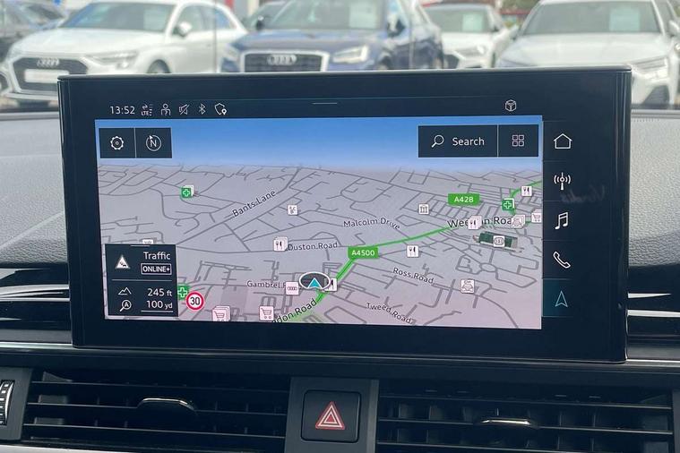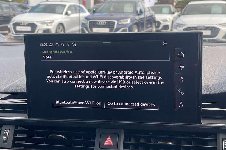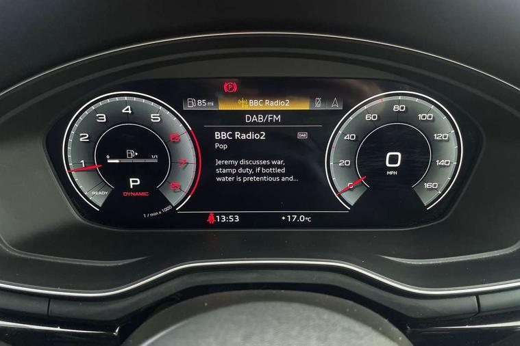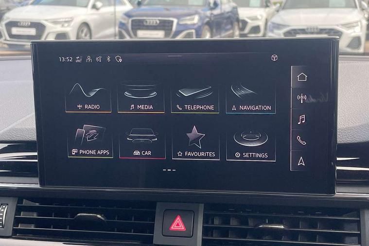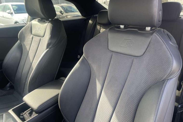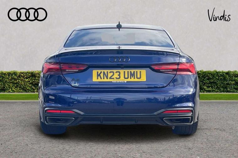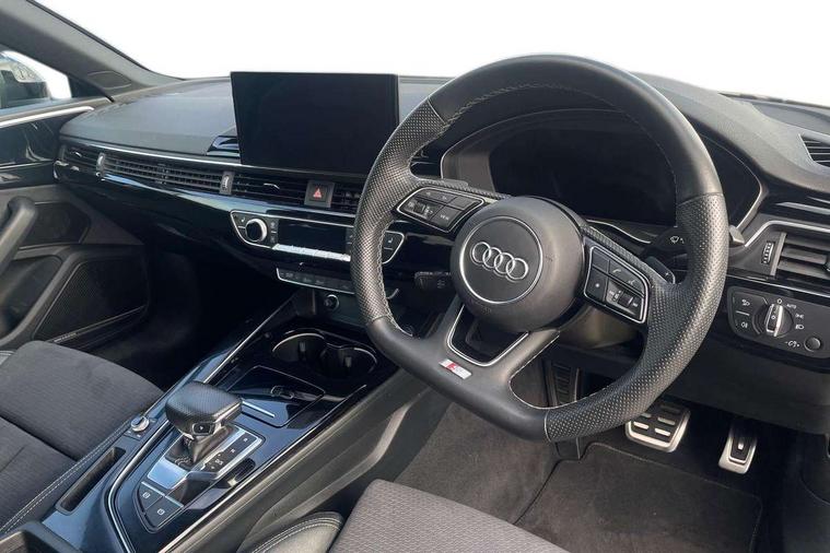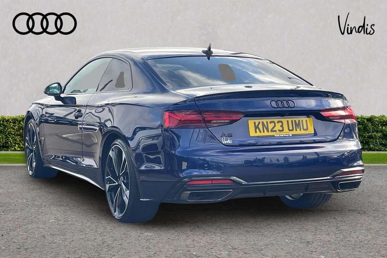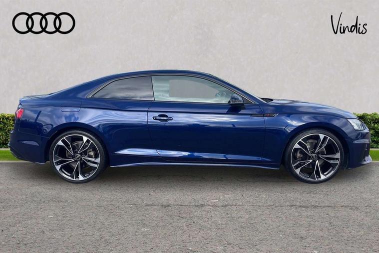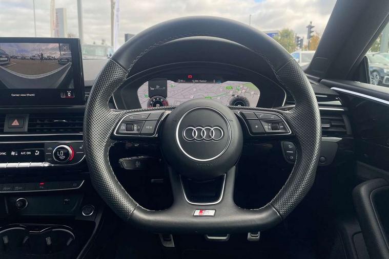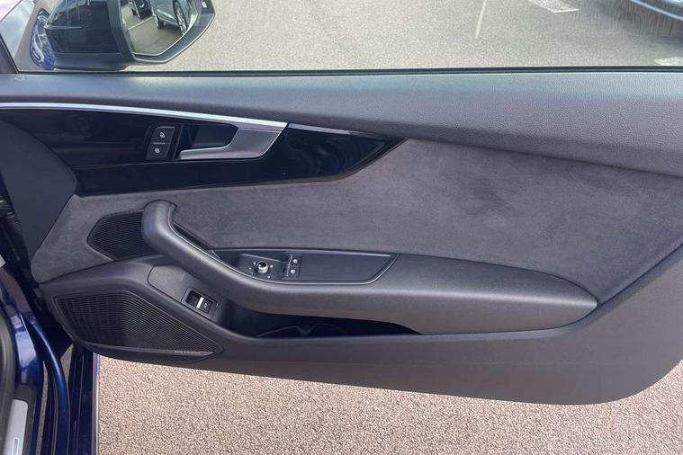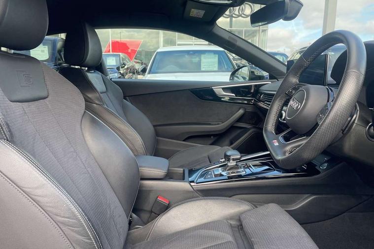 Audi connect safety and service (e-call), Audi connect with Amazon Alexa Integration, Audi drive select (Auto, Comfort, Dynamic and Individual), Audi parking system plus with front and rear sensors, Audi smartphone interface, Audi virtual cockpit - 12.3" full colour digital instrument cluster, vehicle/engine speed, Radio/media information+Driver assistance systems, Automatic start-stop system with coasting functionality and efficiency programme, Bluetooth interface, Electric boot lid release, Electro-mechanical power steering, Email, calendar and text messages displayed via MMI, MMI nav+ with MMI touch - 10.1" high resolution MMI display, touch sensitive, 3D map, route/country info, dynamic route guide, personal route assist, Rear view camera, Service interval indicator, Voice control system, Sports suspension lowered by 23mm, 8 passive loudspeakers, CD player, DAB digital radio reception, Two additional USB ports for rear passenger in rear centre console, Two SDXC card slots, Audi Beam uses LEDs to project the Audi logo, Audi matrix LED headlights with LED rear lights + dynamic front and rear indicators, Auto dimming door mirrors, Auto dimming rear view mirror, Black door mirror housings, Body colour door handles, Body colour front spoiler lip, Body colour side sill trim, Electric adjustable heated door mirrors, Electric folding door mirrors, Electric front windows, Exhaust tailpipe trims in dark chrome, Front and rear bumpers with side skirts, Front fog lights, Honeycomb structure radiator grille in grained matt black, Kerb-view function for passenger side, LED daytime running lights, LED side indicator lights integrated into door mirrors, LED third brake light, Privacy glass, Rain and light sensors, Rear boot, Rear diffuser in matt anthracite black with trim strip in matt aluminium silver, Rear side wing doors, S model rear spoiler in black, Side air inlets in grained matt black with matt aluminium silver inlay, Variable front intermittent wipers, Windscreen with acoustic glazing, 2 seat bench in 2nd row, 4 way electric lumbar support for driver and front passenger, 40/20/40 split folding 2 seater rear seat bench with rear centre armrest, Adjustable steering column, Black cloth headlining, Black perforated leather gearknob, Contrast stitching on seats, steering wheel and gear lever gaiter, Deluxe 3 zone electronic climate control, Front centre armrest, Front head restraints, Front/rear floor mats, Heated front seats, Illuminated door sill trim with S logo, ISOFIX child seat mounting and top tether, Luggage compartment mat, Manual seat adjustment, Rear headrests, Single front passenger seat, Stainless steel pedals, Sunvisors with vanity mirrors, Black styling pack - A5 Coupe/Sportback, LED interior light pack - A5/RS5, 2 x 3-point rear seatbelts, 6 airbags - Driver, front passenger, curtain and side airbags, Electromechanical parking brake, Electronic Stabilisation Control (ESC) including ABS, ASR and EDL, Front passenger airbag deactivation, Height adjustable front seatbelts, Hill hold assist, Multi collision brake assist, Pop-up bonnet for pedestrian protection, Pre sense city, Seatbelt monitoring, Tyre pressure warning, Variable restraint system, Warning triangle and first aid kit, Anti theft alarm system, Anti theft wheel bolts, Immobiliser, Keyless Go, Remote central locking, Piano black finish inlay, 20" 5 twin spoke polygon design alloy wheels in gloss anthracite black and gloss turned finish, Tool kit, Tyre repair kit,