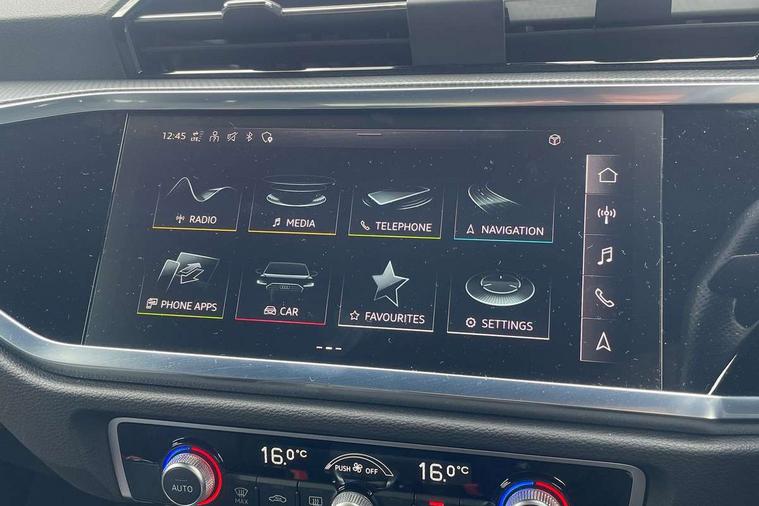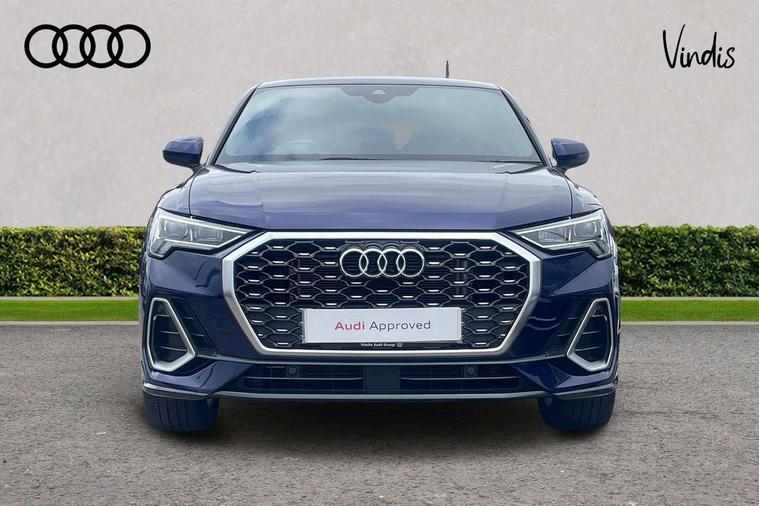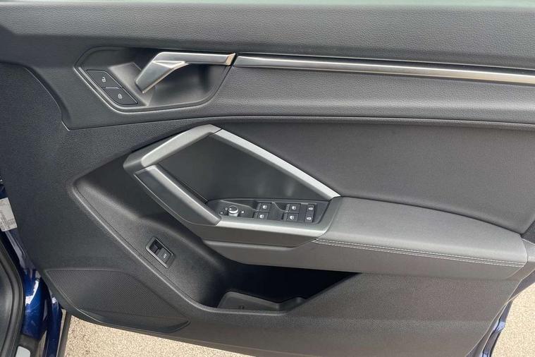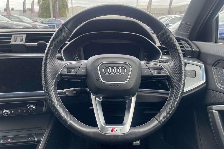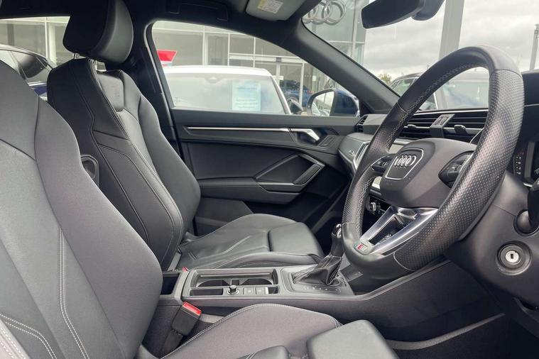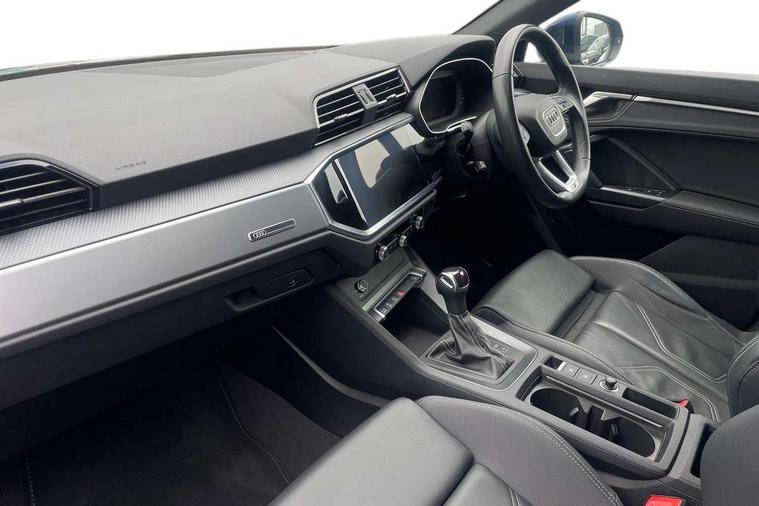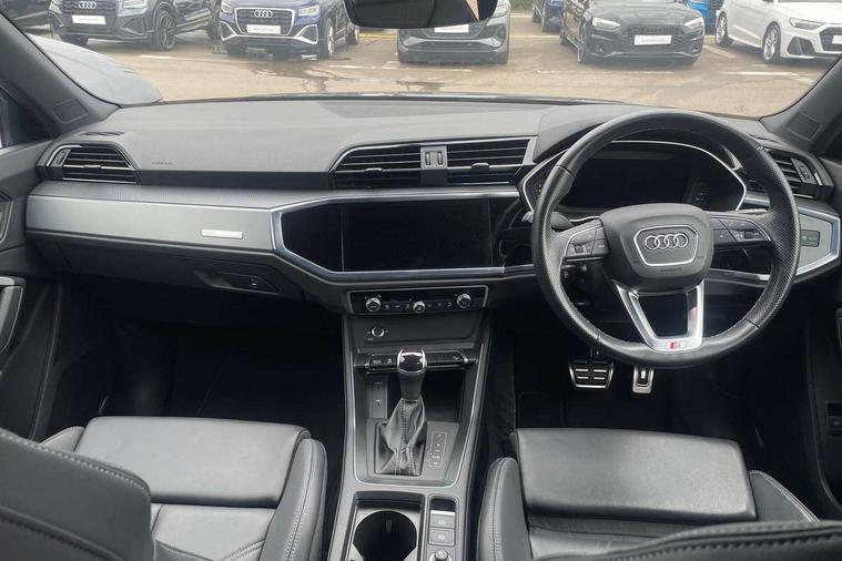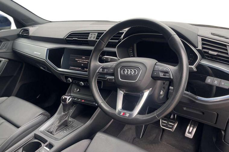 Audi drive select, Audi lane departure warning, Audi Virtual Cockpit - 10.25" display, Bluetooth interface, Camera based traffic sign recognition, Legal emergency call, MMI Navigation Plus with high resolution 10.1 inch touchscreen colour display, Power operated tailgate, Progressive steering, Service interval indicator, Smartphone interface includes wireless Apple carplay/Android Auto, Start stop system with recuperation, Voice control system with natural language interaction, Sports suspension, 2 USB-C ports with charge and data functions, 6 passive loudspeakers, DAB digital radio module, Acoustic windscreen, Aluminium window trim, Auto dimming frameless rear view mirror, Diffuser grille in grained matt black, Diffuser trim in selenite silver, Electrically folding, adjustable and heated door mirrors with integrated LED side indicators and kerb view function for passenger side, Front and rear electric windows, Front fog lights, Front side air inlets in selenite silver, Front underbody protection in manhattan grey paint finish, Grille surround in aluminium silver matt, High gloss black finish B and C pillars, LED Dynamic rear indicators, LED headlights with LED daytime running lights, LED rear lights, LED third brake light, Privacy glass dark tinted rear and rear-side windows (from B-pillar backwards), Radiator grille in anthracite black with inlay in matt aluminium silver, Rain and light sensors, Rear side wing doors, Rear underbody protection in matt black, Rear wiper, S line badges on front wings, S line front and rear bumpers and side skirts in contrasting Manhattan grey paint finish, Side skirt insert in matt Platinium grey, Variable front intermittent wipers, 12V socket in rear centre console, 3 seat bench in 2nd row, 3 spoke leather multifunction steering wheel features S badging and grips in perforated leather with contrast stitching, 40:20:40 folding with manual adjustment for 60:40 forwards/backwards position and backrest angle, Adjustable rear seat bench/backrest with centre armrest and cupholder, Black cloth headlining, Dual zone electronic climate control, Front and rear black floor mats with contrast stitching, Front and rear headrests, Front and rear roof module including reading lights, Front centre armrest, Glove compartment lighting, Height and reach adjustable steering wheel, Illuminated door sill trims with S logo, ISOFIX child seat mounting for front passenger with airbag deactivation and outer rear seat including top tether attachment point for outer rear seats, Luggage compartment light right in white, Luggage compartment sill protection in stainless steel, Manual front seats with height adjustment, Perforated leather gearknob, Single front passenger seat, Stainless steel pedals, Ambient lighting pack - Q3, Non smoking pack - Q3, 3x3 point rear seatbelts, 6 airbags - Driver, front passenger, curtain and side windows, Audi pre-sense front with pedestrain and cyclist recognition, Electrically operated child locks on rear doors, Electromechanical parking brake, Electronic stabilisation control including ABS, ASR and EDL, Front seatbelt reminder, Hill descent control, Hill hold assist, Pre sense basic, Seatbelt monitoring, Tyre pressure warning, Warning triangle and first aid kit, Anti theft alarm, Anti theft wheel bolts, Immobiliser, Remote central locking, Aluminium look interior elements, Black dashboard, Dark matt brushed aluminium inlay, Detail dashboard around MMI touch colour display in glass look, black with surround in aluminium look, Leatherette door armrest,
