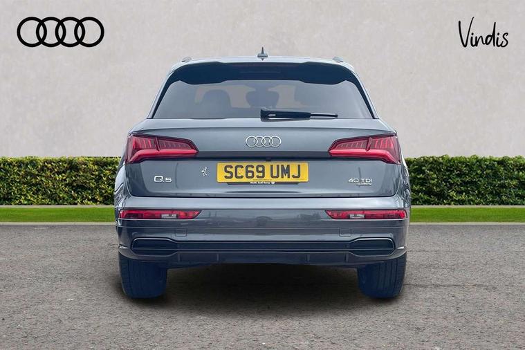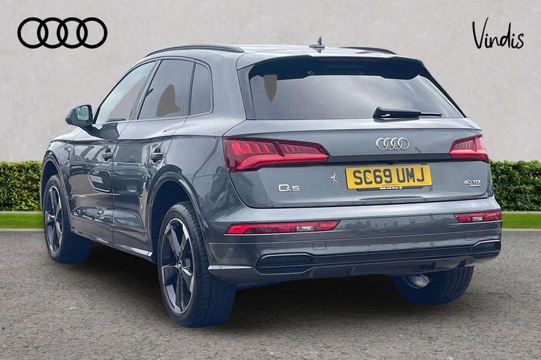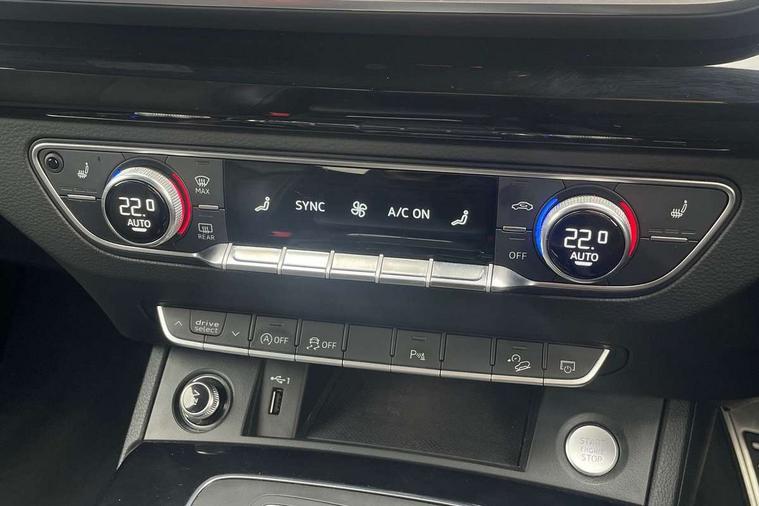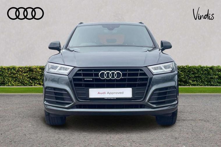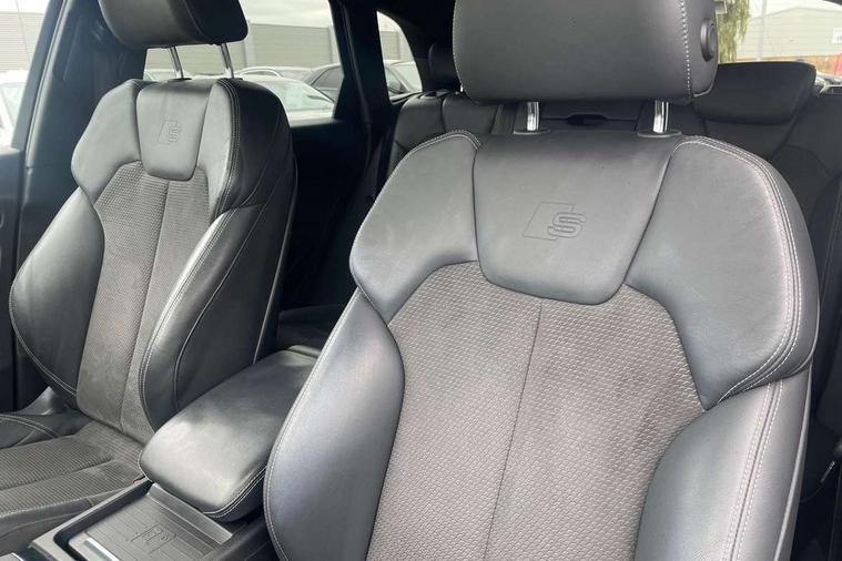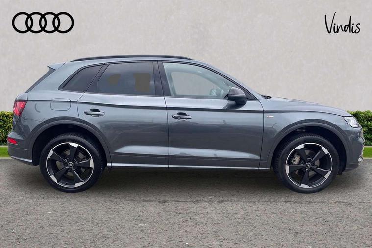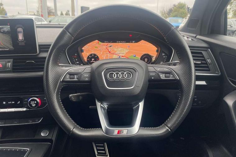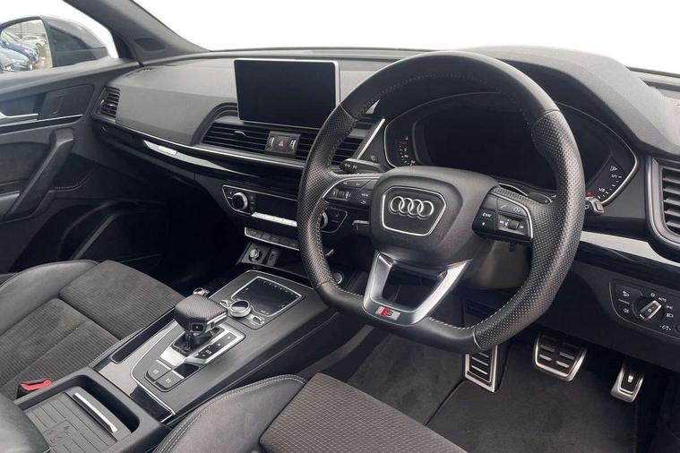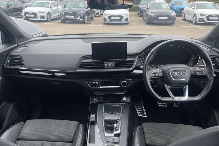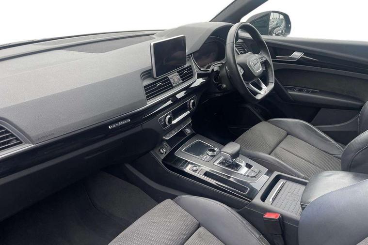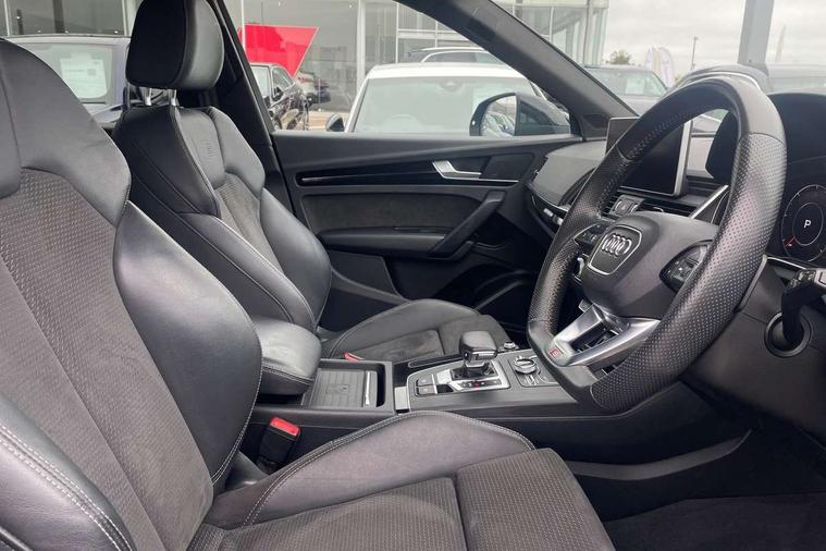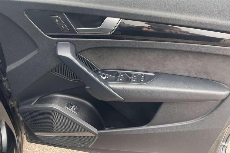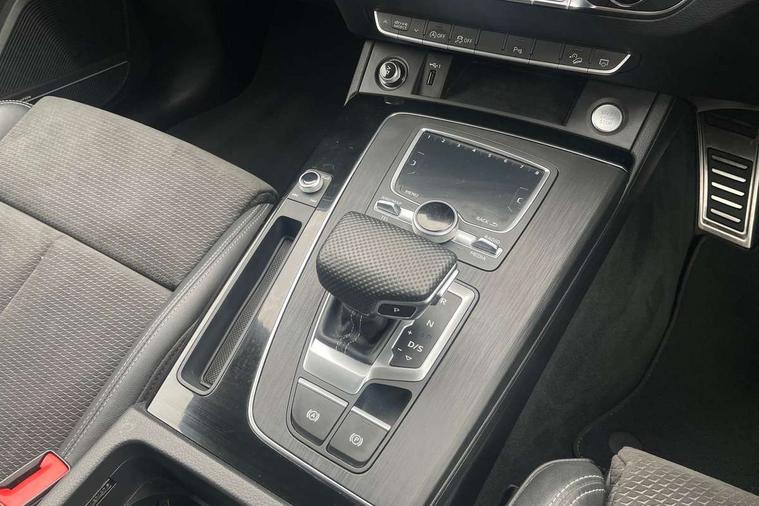Black piano finish inlays, LED interior light pack - Q5, Non Smokers pack, Titanium black styling pack - Q5, 20" 5 arm rotor design sport alloy wheels in gloss anthracite black, diamond cut finish, Anti theft alarm, Anti-theft wheel bolts, Keyless Go access/ignition system, Remote central locking, 2x SD card slot, CD player, DAB Digital radio, MMI radio plus with 7" colour MMI screen and MMI controller, 3 point seatbelts on all seats, 6 airbags - Driver, front passenger, curtain and side airbags, Electromechanical parking brake, Electronic stabilisation control including ABS, ASR and EDL, Front passenger airbag deactivation, Hill descent control, Hill hold assist, Multi collision brake assist, Pop-up bonnet for pedestrian protection, Pre sense city, Seat belt force limiter, Seatbelt monitoring, Tyre pressure warning, Warning triangle and first aid kit, Acoustic windscreen, Air inlets in matt titanium black with blades in matt aluminium silver, Auto dimming rear view mirror, Automatic headlight levelling, Black roof rails, Body colour bumpers, Body colour rear diffuser with matt aluminium silver surrounds, Body colour underbody protection, Chrome exhaust tailpipe, Electric adjustable/heated/folding door mirrors, Front and rear electric windows, High beam assistant, LED headlights with LED rear lights + dynamic rear indicators, Light and rain sensor for auto activation of lights and windscreen wipers, Loading sill protector in stainless steel, Privacy glass with front acoustic glazing, Rear wiper, Titanium black door mirror housings, 2 x USB charging port with aux input socket, 3 rear headrests, 3 spoke flat bottom high multi-function leather steering wheel, 40:20:40 split folding rear seat with rear centre armrest, Black cloth headlining, Contrast stitching on seats, steering wheel and gear lever gaiter, Deluxe 3 zone electronic climate control, Front centre armrest, Front sport seats with S embossed logo, Front/rear floor mats, Heated front seats, Height adjustable front head restraints, Height/reach adjustable steering column, ISOFIX child seat mounting and top tether, Luggage compartment carpet, Manual seat adjustment with 4-way electric lumbar support, Perforated leather gearknob, Removable luggage compartment floor, Stainless steel pedals, Sunvisors with vanity mirrors, Tool kit, Trunk roller cover, 7" Colour driver information system, Audi connect safety and service (e-call), Audi drive select, Audi parking system plus with front and rear sensors, Audi Pre sense collision avoidance, Audi smartphone interface, Automatic start-stop system with coasting functionality and efficiency programme, Cruise control + speed limiter, Electro - mechanical power assisted steering, MMI Navigation, Mobile telephone preparation - bluetooth interface, Power tailgate, Service interval indicator, Voice control system, Diesel particulate filter, Dynamic suspension, Quattro on demand,