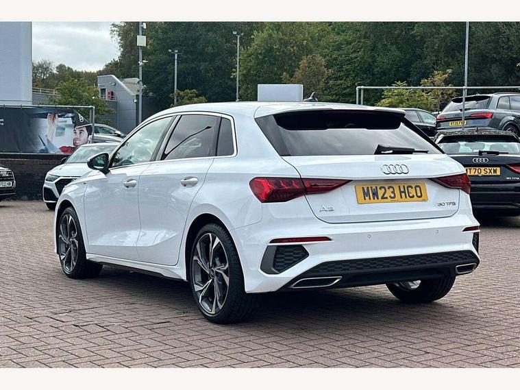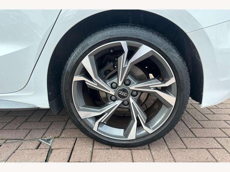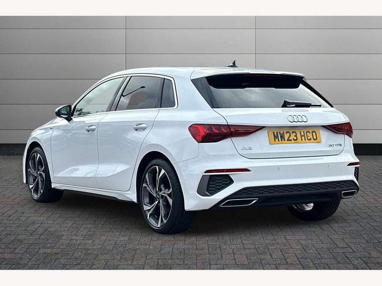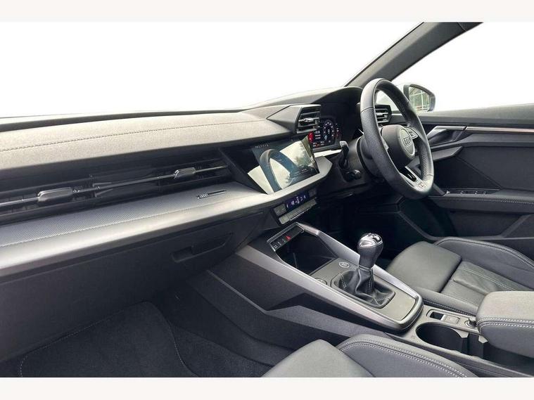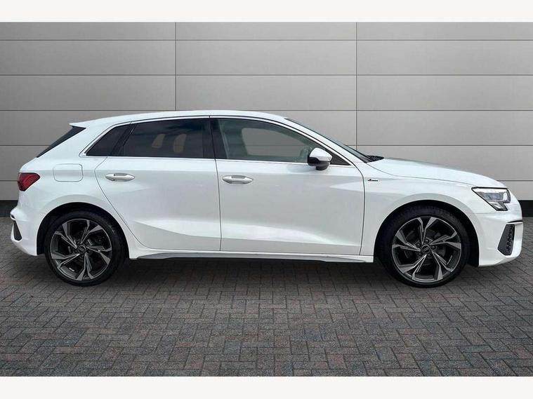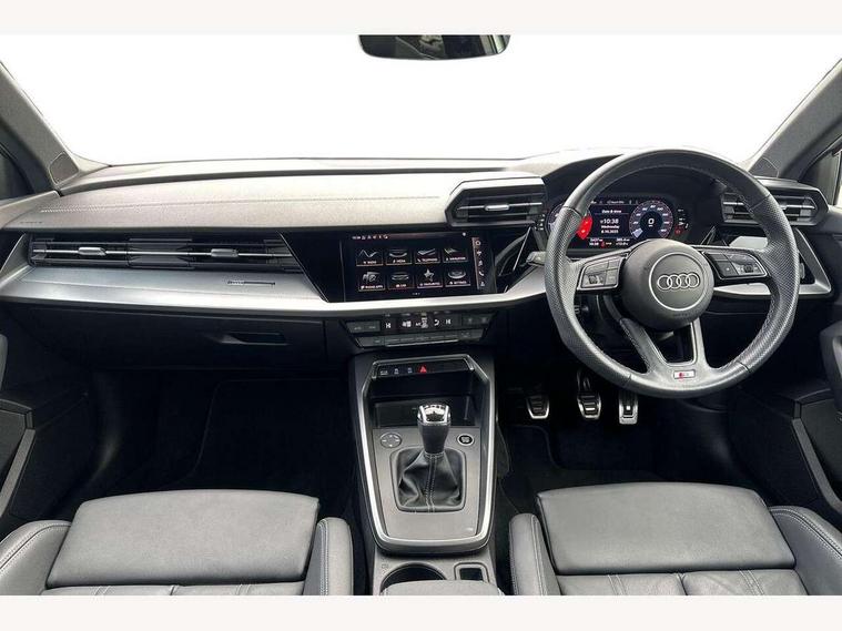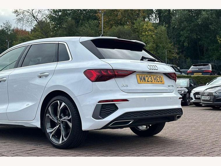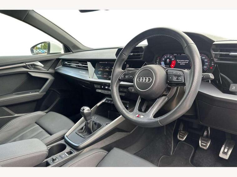 Audi drive select (Auto, Comfort, Dynamic and Individual), Audi smartphone interface, Audi Virtual Cockpit - 10.25" digital and colour instrument cluster, Automatic start/stop system with recuperation, Bluetooth interface, Camera based traffic sign recognition, Collision avoidance assistant, Cruise control, e-Call (emergency call), Electromechanical power speed sensitive steering, Lane departure warning system, MMI Navigation Plus with high resolution 10.1" colour touch screen display, Rear parking sensors, Service indicator, Trip computer, Voice control system with natural language interaction, Sports suspension, 2xUSB-C connection with data and charging functions, 6 passive loudspeakers, DAB Digital radio, 3rd brake light, Acoustic glass windscreen, Aluminium window trim, Auto dimming frameless rear view mirror, Body colour exterior mirrors, Electrically adjustable/heated/folding/auto dimming door mirrors with integrated LED indications + kerb view function for passenger side, Front electric windows, Illuminated aluminium inserts front door sills with S logo, LED daytime running lights, LED headlights with LED rear lights and dynamic rear indicators, Light and rain sensors, Privacy glass - dark tinted rear window, rear door and side windows, Rear electric windows, Rear side air outlets in grained matt black, Rear side wing doors, Rear wiper, S line bumpers, S roof spoiler, 12V socket and storage compartment in front centre console, 3 seat bench in 2nd row, 3 spoke leather multifunction steering wheel, 4 way electrically adjustable lumbar support for driver and front passenger, 60/40 split folding rear seat bench, Black cloth headlining, Dual zone electronic climate control, Front and rear centre armrest in leather, Front and rear headrests, Front/rear floor mats, Height and reach adjustable steering wheel, Interior lighting - glove compartment light and right hand side, Luggage compartment floor covering, Manual boot compartment lid, Manually adjustable front seats, Seat side bolsters, Single front passenger seat, Stainless steel pedals and front footrest in black, Twin leather upholstery with front sports seats S embossed logo, Aluminium interior elements pack - A3 Sportback, LED interior lighting pack - A3 Sportback, S line styling pack - A3 Sportback, 3x3 point rear seat belts, Driver and front passenger airbag with passenger airbag deactivation, Electronic Stabilisation Control (ESC) including ABS, ASR and EDL, First aid kit with warning triangle and 2 safety vests, Front side airbags with head airbags and interaction airbag, Pre-sense front with pedestrian and cyclist detection, Seatbelt monitoring, Tyre pressure loss indicator, Anti theft alarm, Anti-theft wheel bolts, Electronically operated child lock, Immobiliser, Remote control central locking, Dark spectrum aluminium inlays, accent surfaces in the dashboard and centre console in platinum grey silk effect paint finish,