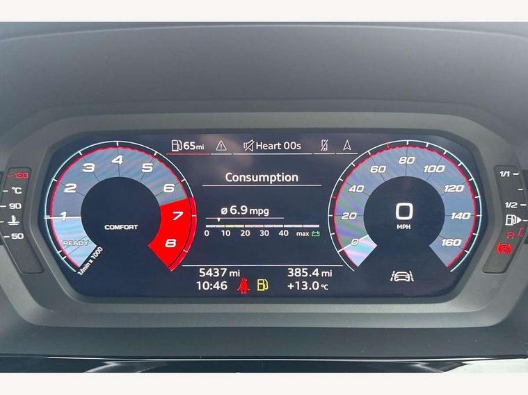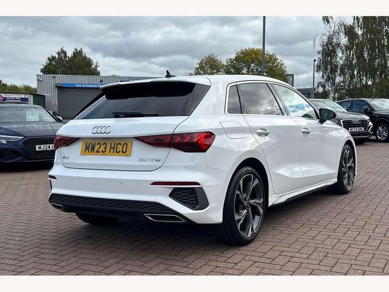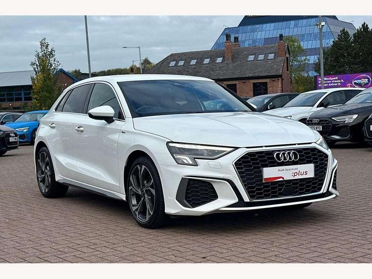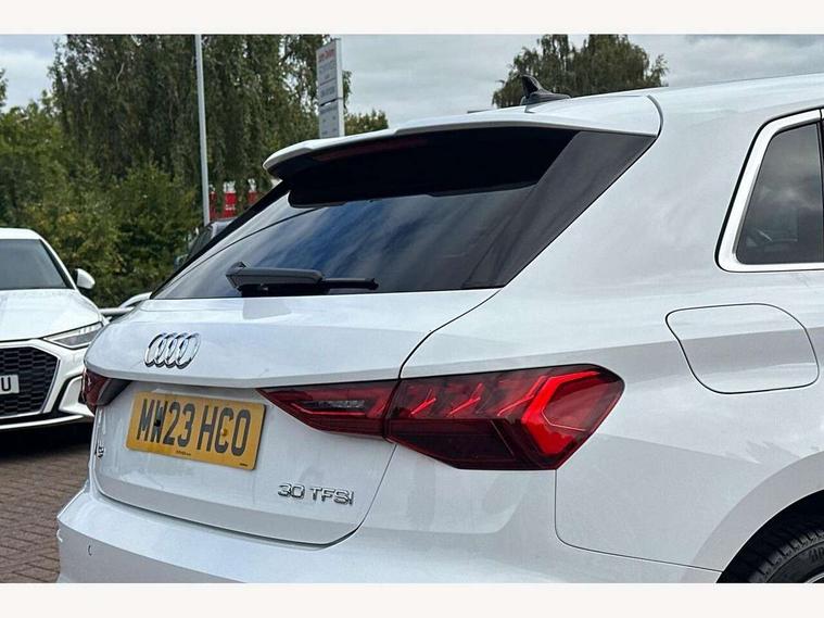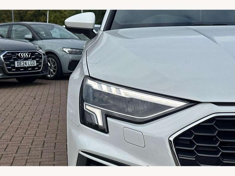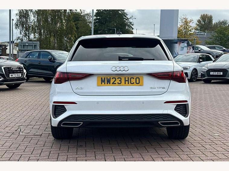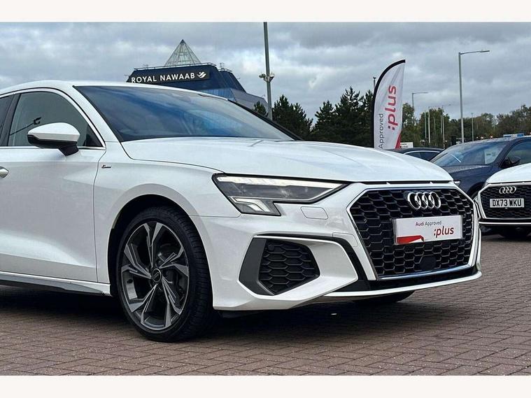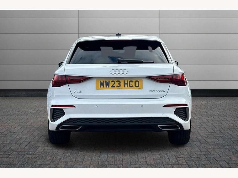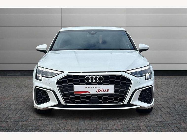Audi drive select (Auto, Comfort, Dynamic and Individual), Audi smartphone interface, Audi Virtual Cockpit - 10.25" digital and colour instrument cluster, Automatic start/stop system with recuperation, Bluetooth interface, Camera based traffic sign recognition, Collision avoidance assistant, Cruise control, e-Call (emergency call), Electromechanical power speed sensitive steering, Lane departure warning system, MMI Navigation Plus with high resolution 10.1" colour touch screen display, Rear parking sensors, Service indicator, Trip computer, Voice control system with natural language interaction, Sports suspension, 2xUSB-C connection with data and charging functions, 6 passive loudspeakers, DAB Digital radio, 3rd brake light, Acoustic glass windscreen, Aluminium window trim, Auto dimming frameless rear view mirror, Body colour exterior mirrors, Electrically adjustable/heated/folding/auto dimming door mirrors with integrated LED indications + kerb view function for passenger side, Front electric windows, Illuminated aluminium inserts front door sills with S logo, LED daytime running lights, LED headlights with LED rear lights and dynamic rear indicators, Light and rain sensors, Privacy glass - dark tinted rear window, rear door and side windows, Rear electric windows, Rear side air outlets in grained matt black, Rear side wing doors, Rear wiper, S line bumpers, S roof spoiler, 12V socket and storage compartment in front centre console, 3 seat bench in 2nd row, 3 spoke leather multifunction steering wheel, 4 way electrically adjustable lumbar support for driver and front passenger, 60/40 split folding rear seat bench, Black cloth headlining, Dual zone electronic climate control, Front and rear centre armrest in leather, Front and rear headrests, Front/rear floor mats, Height and reach adjustable steering wheel, Interior lighting - glove compartment light and right hand side, Luggage compartment floor covering, Manual boot compartment lid, Manually adjustable front seats, Seat side bolsters, Single front passenger seat, Stainless steel pedals and front footrest in black, Twin leather upholstery with front sports seats S embossed logo, Aluminium interior elements pack - A3 Sportback, LED interior lighting pack - A3 Sportback, S line styling pack - A3 Sportback, 3x3 point rear seat belts, Driver and front passenger airbag with passenger airbag deactivation, Electronic Stabilisation Control (ESC) including ABS, ASR and EDL, First aid kit with warning triangle and 2 safety vests, Front side airbags with head airbags and interaction airbag, Pre-sense front with pedestrian and cyclist detection, Seatbelt monitoring, Tyre pressure loss indicator, Anti theft alarm, Anti-theft wheel bolts, Electronically operated child lock, Immobiliser, Remote control central locking, Dark spectrum aluminium inlays, accent surfaces in the dashboard and centre console in platinum grey silk effect paint finish,