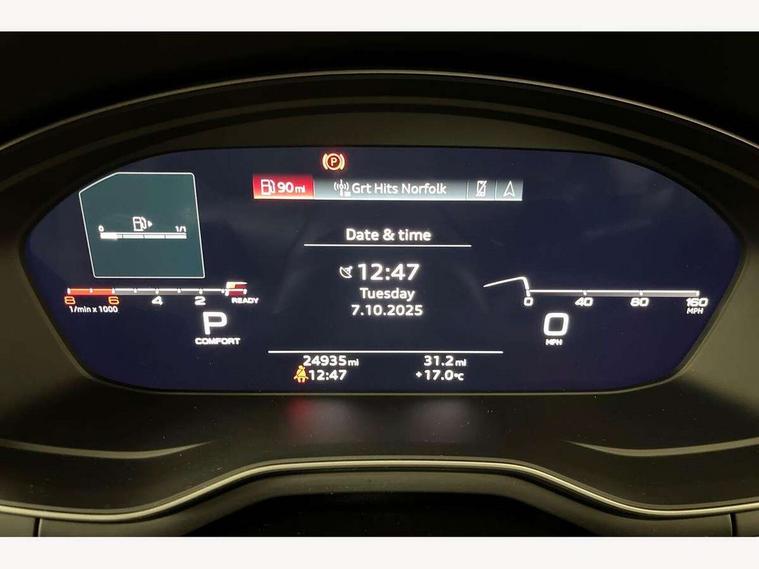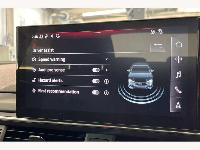 Audi connect safety and service (e-call), Audi connect with Amazon Alexa Integration, Audi drive select, Audi parking system plus with front and rear sensors, Audi smartphone interface, Audi virtual cockpit, Automatic start-stop system with coasting functionality and efficiency programme, Bluetooth interface, Cruise control system with speed limiter, Electric boot lid release, Electromechanical power steering, Email, calendar and text messages displayed via MMI, MMI Navigation plus with MMI touch includes 10.1" high resolution colour MMI display, 3D map, Rear view camera, Voice control system, 54 litre fuel tank, Comfort dynamic suspension, 2 USB charging ports, 8 passive loudspeakers, DAB digital radio reception, Auto dimming rear view mirror, Body coloured door mirrors, Electrically folding auto dimming/adjustable/heated door mirrors with LED side indicators and kerb view function for passenger side, LED headlights and rear lights with LED daytime running lights, LED third brake light, New design rear diffuser, Rain and light sensors, Rear boot, Rear side wing doors, Variable intermittent front wash/wipe, Windscreen with acoustic glazing, 3 spoke high multi-function leather sport steering wheel with paddle shift and height and reach adjustable, 4 way electric lumbar support for driver and front passenger, 40/20/40 split folding 3 rear seat bench in 3 parts with rear centre armrest, Deluxe 3 zone electronic climate control, Door sill trims with aluminium inlay, Front and rear head restraints, Front centre armrest, Heated front seats, Interior lighting, ISOFIX child seat mounting and top tether, Manual seat adjustment, Single front passenger seat, High gloss package - A4, 3 rear seatbelts, 6 airbags - Driver, front passenger, curtain and side windows, Electronic Stabilisation Control (ESC) including ABS, ASR and EDL, Hill hold assist, Multi collision brake assist, Pop-up bonnet for pedestrian protection, Pre sense city, Rear door child safety locks, Seatbelt monitoring, Warning triangle and first aid kit, Anti theft alarm, Anti theft wheel bolts, Central locking, Keyless Go, Tool kit, Tyre repair kit,