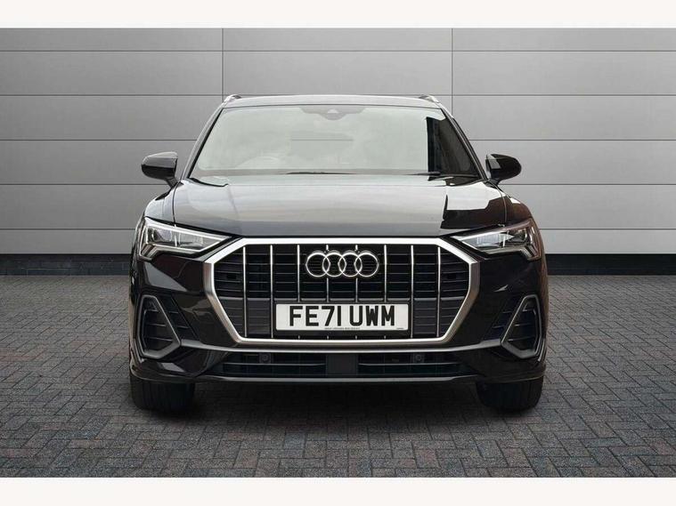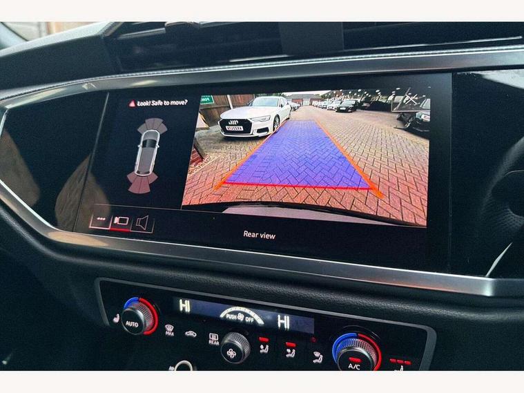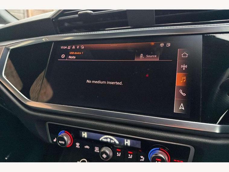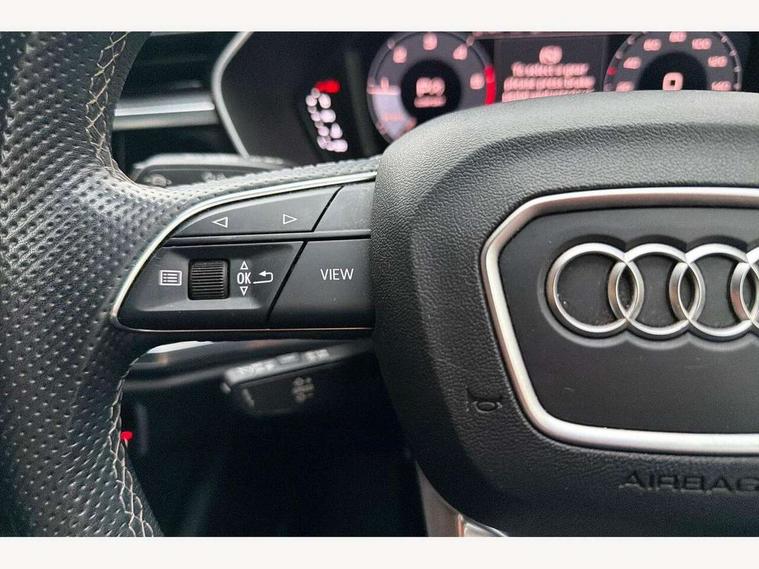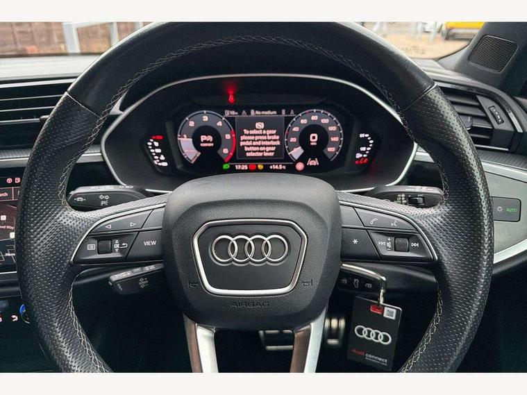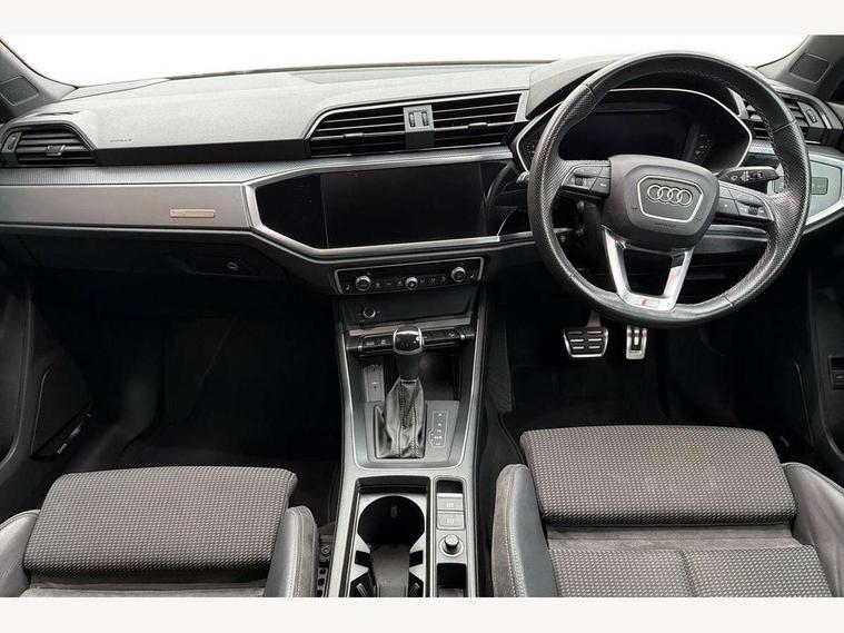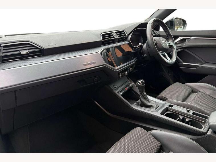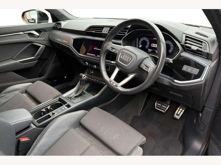 Amazon alexa Integration, Audi connect safety and service (e-call), Audi drive select, Audi lane departure warning, Audi smartphone interface includes wireless Apple carplay/Android Auto, Audi Virtual Cockpit - 10.25" display, Bluetooth interface, Camera based traffic sign recognition, MMI Navigation Plus with high resolution 10.1 inch touchscreen colour display, Power operated tailgate, Progressive steering, Service interval indicator, Start stop system with recuperation, Voice control system with natural language interaction, Diesel particulate filter, Sports suspension, 2 USB-C ports with charge and data functions, 6 passive loudspeakers, DAB digital radio module, Acoustic windscreen, Aluminium roof rails, Aluminium window trim, Auto dimming frameless rear view mirror, Body coloured bumpers, Electrically folding, adjustable and heated door mirrors with integrated LED side indicators and kerb view function for passenger side, Front and rear electric windows, Front fog lights, Front side air inlets in matt platinum grey, Front spoiler blade in matt platinum grey, Grille vertical bars in aluminium silver/Matt, High gloss black finish B and C pillars, LED headlights with LED daytime running lights and dynamic rear indicator, LED rear lights, Privacy glass dark tinted rear and rear-side windows (from B-pillar backwards), Rain and light sensors, Rear diffuser strip in matt titanium black, S line badges on front wings, S Line front and rear bumpers, Side skirt insert in matt Platinium grey, Silver chrome grille surround, Titanium black radiator grille, 12V socket in rear centre console, 40:20:40 folding with manual adjustment for 60:40 forwards/backwards position and backrest angle, Adjustable rear seat bench/backrest with centre armrest and cupholder, Black cloth headlining, Dual zone electronic climate control, Front and rear black floor mats with contrast stitching in rock grey, Front and rear headrests, Front and rear roof module including reading lights, Front centre armrest, Glove compartment lighting, Height and reach adjustable steering wheel, Illuminated door sill trims with S logo, ISOFIX child seat mounting for front passenger with airbag deactivation and outer rear seat including top tether attachment point for outer rear seats, Luggage compartment light, Manual front seats with height adjustment, Perforated leather gearknob, Stainless steel luggage compartment sill finisher, Stainless steel pedals, Non smoking pack - Q3, 3x3 point rear seatbelts, 6 airbags - Driver, front passenger, curtain and side windows, Audi pre-sense front with pedestrain and cyclist recognition, Electrically operated child locks on rear doors, Electromechanical parking brake, Electronic stabilisation control including ABS, ASR and EDL, Hill descent control, Hill hold assist, Pre sense basic, Seatbelt monitoring, Tyre pressure warning, Warning triangle and first aid kit, Anti theft alarm, Anti theft wheel bolts, Remote central locking, Dark matt brushed aluminium inlay, Detail dashboard around MMI touch colour display in glass look, black with surround in aluminium look, Leatherette door armrest,