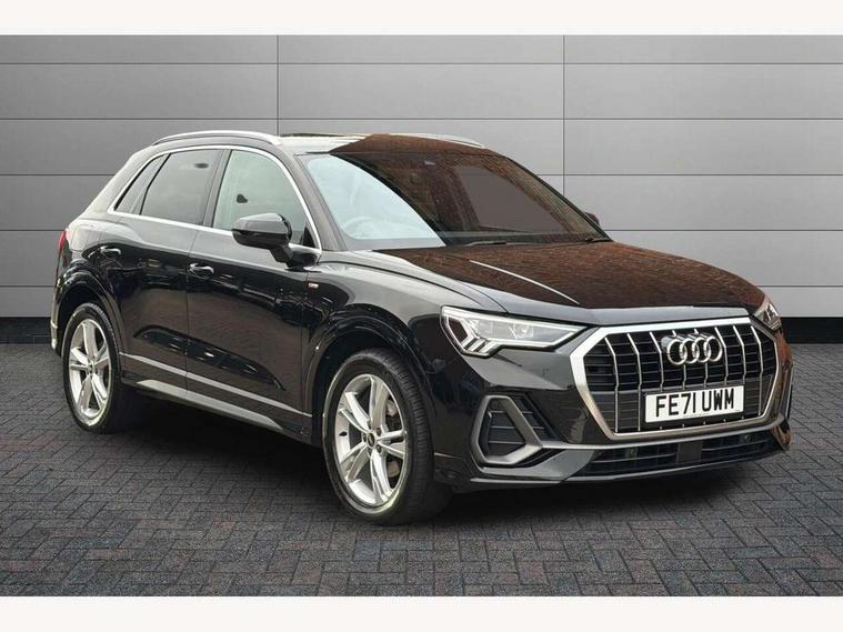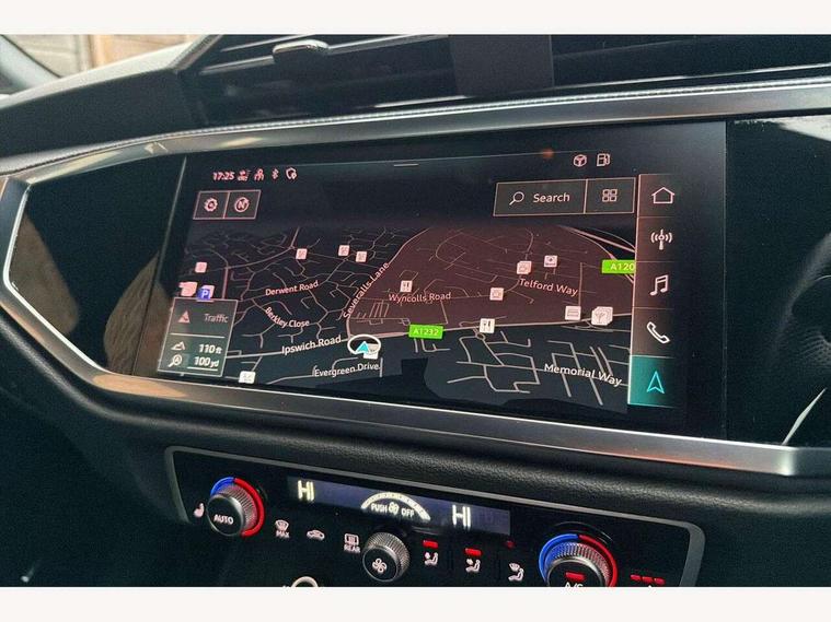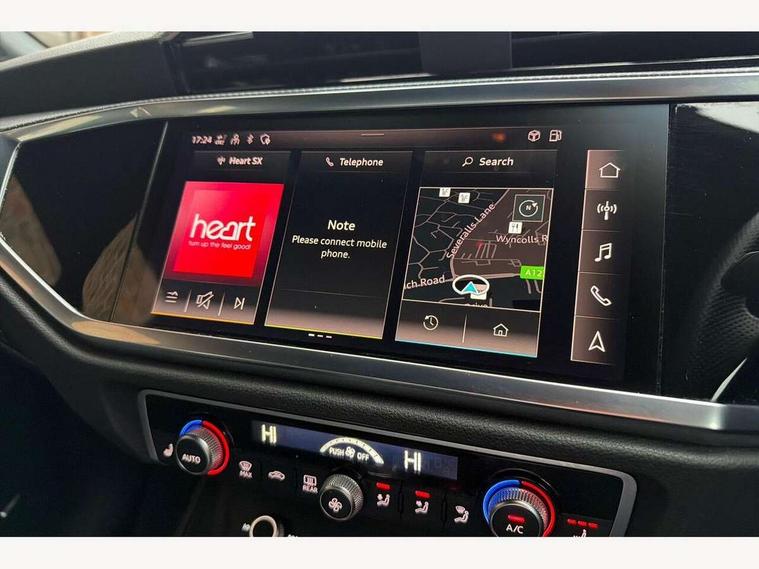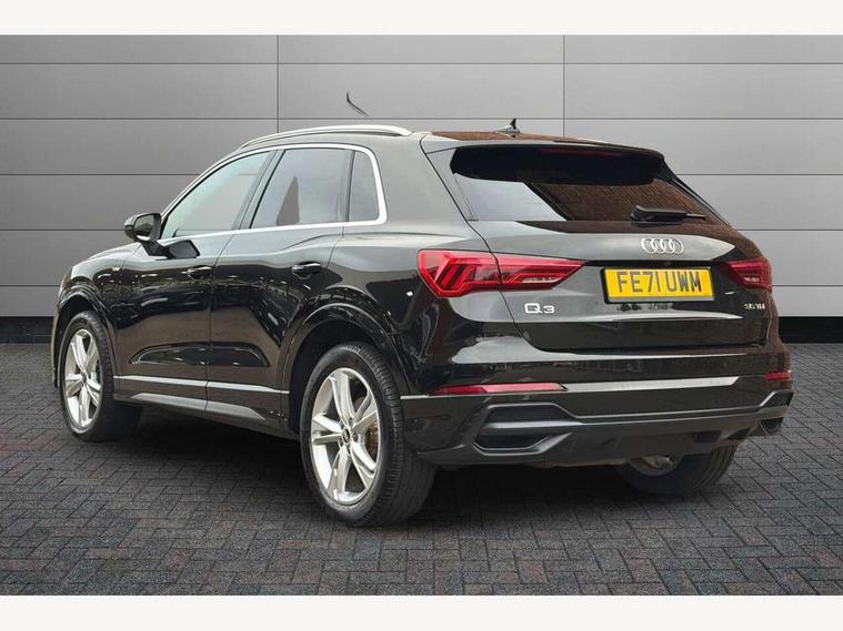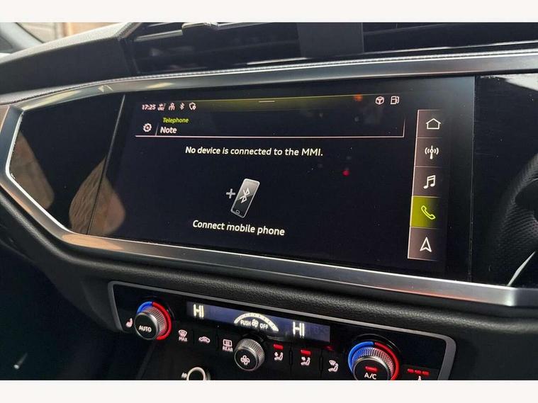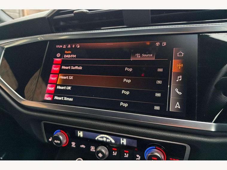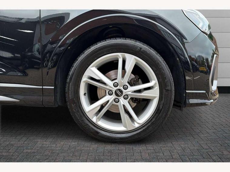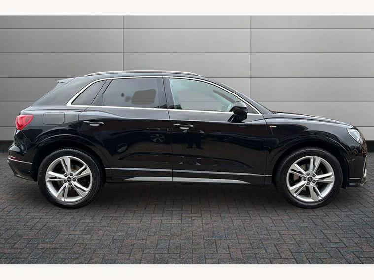 Amazon alexa Integration, Audi connect safety and service (e-call), Audi drive select, Audi lane departure warning, Audi smartphone interface includes wireless Apple carplay/Android Auto, Audi Virtual Cockpit - 10.25" display, Bluetooth interface, Camera based traffic sign recognition, MMI Navigation Plus with high resolution 10.1 inch touchscreen colour display, Power operated tailgate, Progressive steering, Service interval indicator, Start stop system with recuperation, Voice control system with natural language interaction, Diesel particulate filter, Sports suspension, 2 USB-C ports with charge and data functions, 6 passive loudspeakers, DAB digital radio module, Acoustic windscreen, Aluminium roof rails, Aluminium window trim, Auto dimming frameless rear view mirror, Body coloured bumpers, Electrically folding, adjustable and heated door mirrors with integrated LED side indicators and kerb view function for passenger side, Front and rear electric windows, Front fog lights, Front side air inlets in matt platinum grey, Front spoiler blade in matt platinum grey, Grille vertical bars in aluminium silver/Matt, High gloss black finish B and C pillars, LED headlights with LED daytime running lights and dynamic rear indicator, LED rear lights, Privacy glass dark tinted rear and rear-side windows (from B-pillar backwards), Rain and light sensors, Rear diffuser strip in matt titanium black, S line badges on front wings, S Line front and rear bumpers, Side skirt insert in matt Platinium grey, Silver chrome grille surround, Titanium black radiator grille, 12V socket in rear centre console, 40:20:40 folding with manual adjustment for 60:40 forwards/backwards position and backrest angle, Adjustable rear seat bench/backrest with centre armrest and cupholder, Black cloth headlining, Dual zone electronic climate control, Front and rear black floor mats with contrast stitching in rock grey, Front and rear headrests, Front and rear roof module including reading lights, Front centre armrest, Glove compartment lighting, Height and reach adjustable steering wheel, Illuminated door sill trims with S logo, ISOFIX child seat mounting for front passenger with airbag deactivation and outer rear seat including top tether attachment point for outer rear seats, Luggage compartment light, Manual front seats with height adjustment, Perforated leather gearknob, Stainless steel luggage compartment sill finisher, Stainless steel pedals, Non smoking pack - Q3, 3x3 point rear seatbelts, 6 airbags - Driver, front passenger, curtain and side windows, Audi pre-sense front with pedestrain and cyclist recognition, Electrically operated child locks on rear doors, Electromechanical parking brake, Electronic stabilisation control including ABS, ASR and EDL, Hill descent control, Hill hold assist, Pre sense basic, Seatbelt monitoring, Tyre pressure warning, Warning triangle and first aid kit, Anti theft alarm, Anti theft wheel bolts, Remote central locking, Dark matt brushed aluminium inlay, Detail dashboard around MMI touch colour display in glass look, black with surround in aluminium look, Leatherette door armrest,