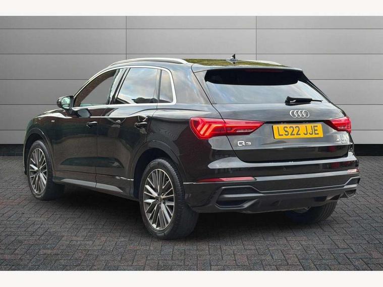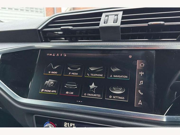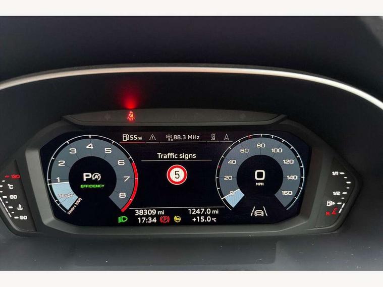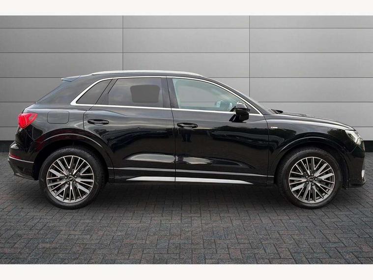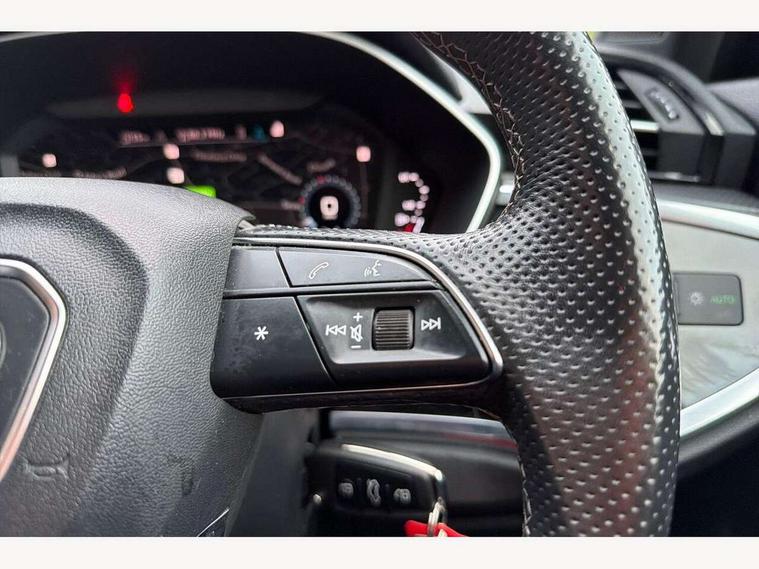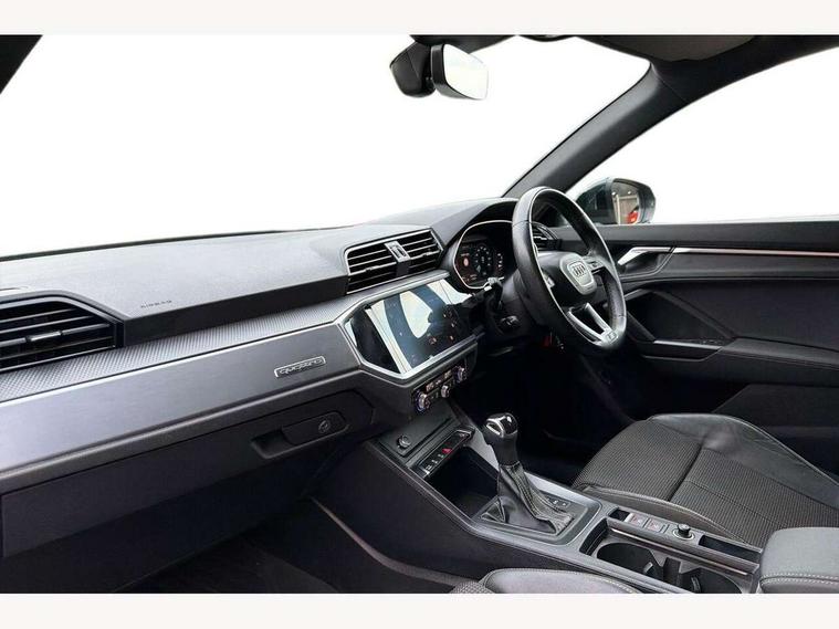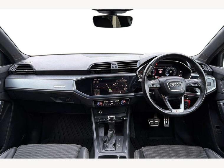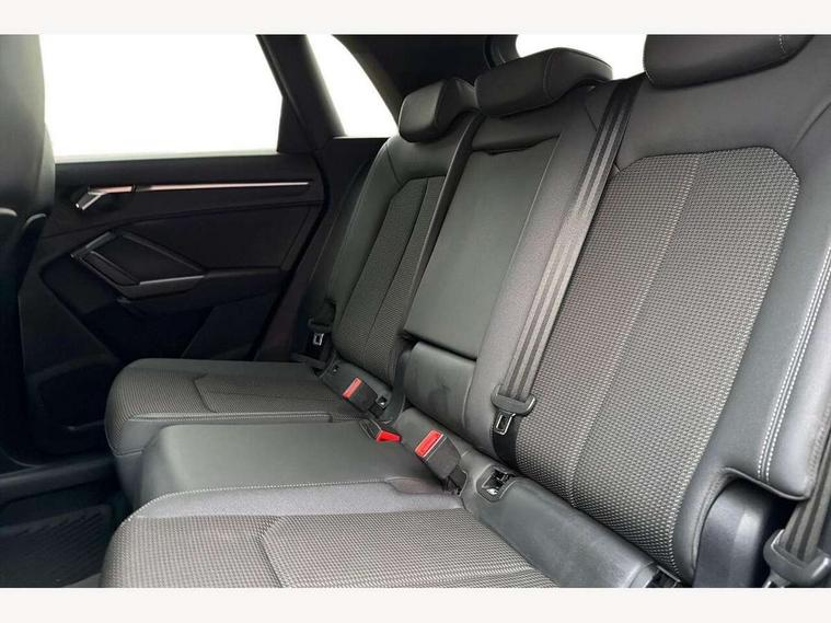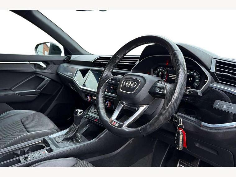 Amazon alexa Integration, Audi connect safety and service (e-call), Audi drive select, Audi lane departure warning, Audi Virtual Cockpit - 10.25" display, Bluetooth interface, Camera based traffic sign recognition, MMI Navigation Plus with high resolution 10.1 inch touchscreen colour display, Power operated tailgate, Progressive steering, Service interval indicator, Smartphone interface includes wireless Apple carplay/Android Auto, Start stop system with recuperation, Voice control system with natural language interaction, Sports suspension, 2 USB-C ports with charge and data functions, 6 passive loudspeakers, DAB digital radio module, Acoustic windscreen, Aluminium roof rails, Aluminium window trim, Auto dimming frameless rear view mirror, Body coloured bumpers, Electrically folding, adjustable and heated door mirrors with integrated LED side indicators and kerb view function for passenger side, Front and rear electric windows, Front fog lights, Front side air inlets in matt platinum grey, Front spoiler blade in matt platinum grey, Grille vertical bars in aluminium silver/Matt, High gloss black finish B and C pillars, LED headlights with LED daytime running lights, LED rear lights, LED third brake light, Privacy glass dark tinted rear and rear-side windows (from B-pillar backwards), Rain and light sensors, Rear diffuser strip in matt titanium black, Rear side wing doors, Rear wiper, S line badges on front wings, S Line front and rear bumpers, Side skirt insert in matt Platinium grey, Silver chrome grille surround, Tinted rear windows, Titanium black radiator grille, Variable front intermittent wipers, 12V socket in rear centre console, 3 seat bench in 2nd row, 40:20:40 folding with manual adjustment for 60:40 forwards/backwards position and backrest angle, Adjustable rear seat bench/backrest with centre armrest and cupholder, Black cloth headlining, Dual zone electronic climate control, Front and rear black floor mats with contrast stitching in rock grey, Front and rear headrests, Front and rear roof module including reading lights, Front centre armrest, Glove compartment lighting, Height and reach adjustable steering wheel, Illuminated door sill trims with S logo, ISOFIX child seat mounting for front passenger with airbag deactivation and outer rear seat including top tether attachment point for outer rear seats, Luggage compartment light, Manual front seats with height adjustment, Perforated leather gearknob, Single front passenger seat, Stainless steel luggage compartment sill finisher, Stainless steel pedals, Non smoking pack - Q3, 3x3 point rear seatbelts, 6 airbags - Driver, front passenger, curtain and side windows, Audi pre-sense front with pedestrain and cyclist recognition, Electrically operated child locks on rear doors, Electromechanical parking brake, Electronic stabilisation control including ABS, ASR and EDL, Front seatbelt reminder, Hill descent control, Hill hold assist, Pre sense basic, Seatbelt monitoring, Tyre pressure warning, Warning triangle and first aid kit, Anti theft alarm, Anti theft wheel bolts, Immobiliser, Remote central locking, Dark matt brushed aluminium inlay, Detail dashboard around MMI touch colour display in glass look, black with surround in aluminium look, Leatherette door armrest,