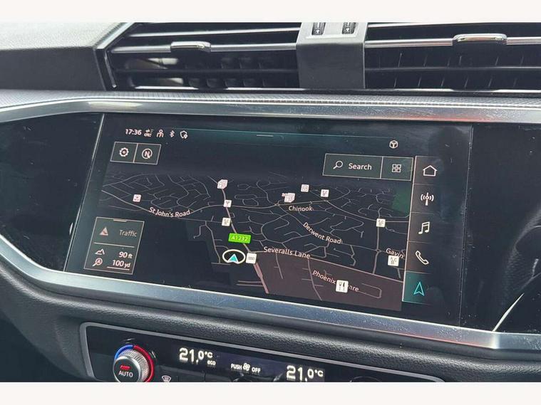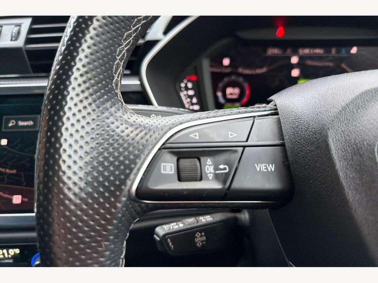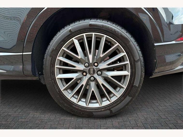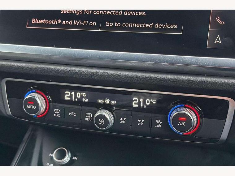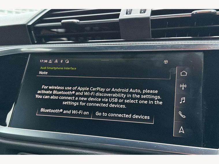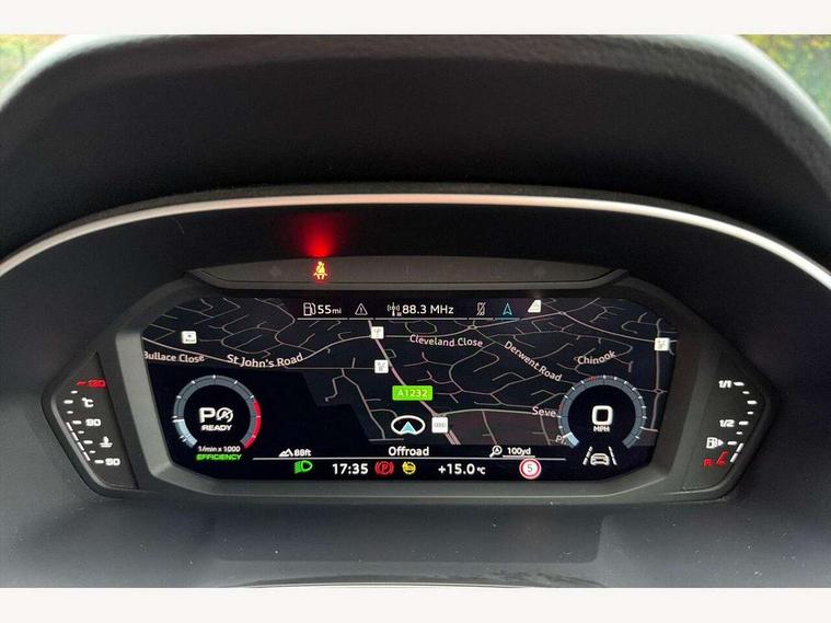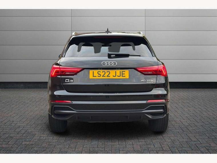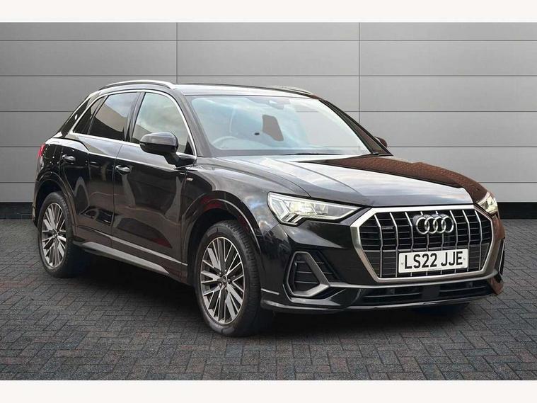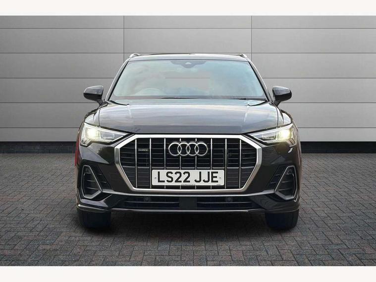 Amazon alexa Integration, Audi connect safety and service (e-call), Audi drive select, Audi lane departure warning, Audi Virtual Cockpit - 10.25" display, Bluetooth interface, Camera based traffic sign recognition, MMI Navigation Plus with high resolution 10.1 inch touchscreen colour display, Power operated tailgate, Progressive steering, Service interval indicator, Smartphone interface includes wireless Apple carplay/Android Auto, Start stop system with recuperation, Voice control system with natural language interaction, Sports suspension, 2 USB-C ports with charge and data functions, 6 passive loudspeakers, DAB digital radio module, Acoustic windscreen, Aluminium roof rails, Aluminium window trim, Auto dimming frameless rear view mirror, Body coloured bumpers, Electrically folding, adjustable and heated door mirrors with integrated LED side indicators and kerb view function for passenger side, Front and rear electric windows, Front fog lights, Front side air inlets in matt platinum grey, Front spoiler blade in matt platinum grey, Grille vertical bars in aluminium silver/Matt, High gloss black finish B and C pillars, LED headlights with LED daytime running lights, LED rear lights, LED third brake light, Privacy glass dark tinted rear and rear-side windows (from B-pillar backwards), Rain and light sensors, Rear diffuser strip in matt titanium black, Rear side wing doors, Rear wiper, S line badges on front wings, S Line front and rear bumpers, Side skirt insert in matt Platinium grey, Silver chrome grille surround, Tinted rear windows, Titanium black radiator grille, Variable front intermittent wipers, 12V socket in rear centre console, 3 seat bench in 2nd row, 40:20:40 folding with manual adjustment for 60:40 forwards/backwards position and backrest angle, Adjustable rear seat bench/backrest with centre armrest and cupholder, Black cloth headlining, Dual zone electronic climate control, Front and rear black floor mats with contrast stitching in rock grey, Front and rear headrests, Front and rear roof module including reading lights, Front centre armrest, Glove compartment lighting, Height and reach adjustable steering wheel, Illuminated door sill trims with S logo, ISOFIX child seat mounting for front passenger with airbag deactivation and outer rear seat including top tether attachment point for outer rear seats, Luggage compartment light, Manual front seats with height adjustment, Perforated leather gearknob, Single front passenger seat, Stainless steel luggage compartment sill finisher, Stainless steel pedals, Non smoking pack - Q3, 3x3 point rear seatbelts, 6 airbags - Driver, front passenger, curtain and side windows, Audi pre-sense front with pedestrain and cyclist recognition, Electrically operated child locks on rear doors, Electromechanical parking brake, Electronic stabilisation control including ABS, ASR and EDL, Front seatbelt reminder, Hill descent control, Hill hold assist, Pre sense basic, Seatbelt monitoring, Tyre pressure warning, Warning triangle and first aid kit, Anti theft alarm, Anti theft wheel bolts, Immobiliser, Remote central locking, Dark matt brushed aluminium inlay, Detail dashboard around MMI touch colour display in glass look, black with surround in aluminium look, Leatherette door armrest,