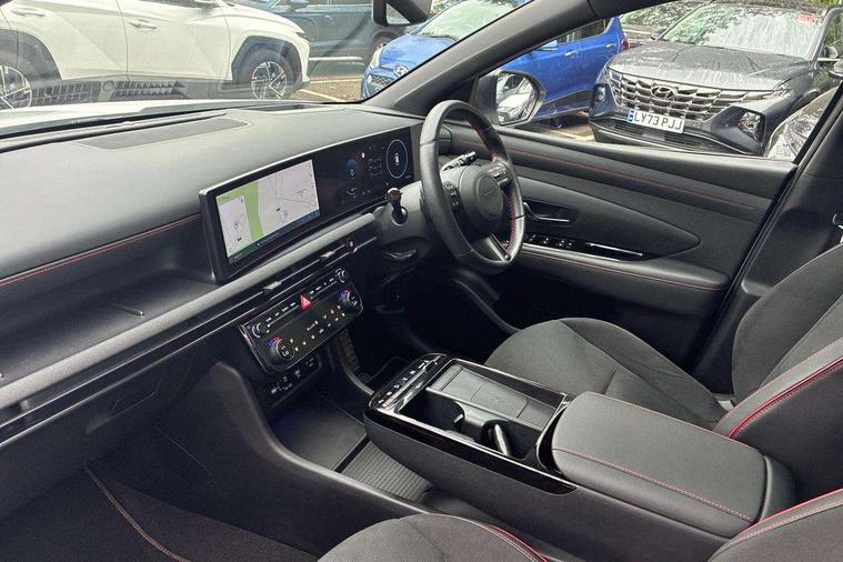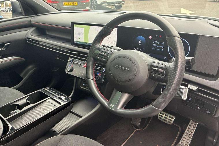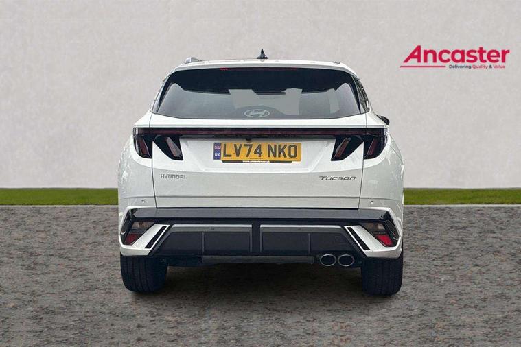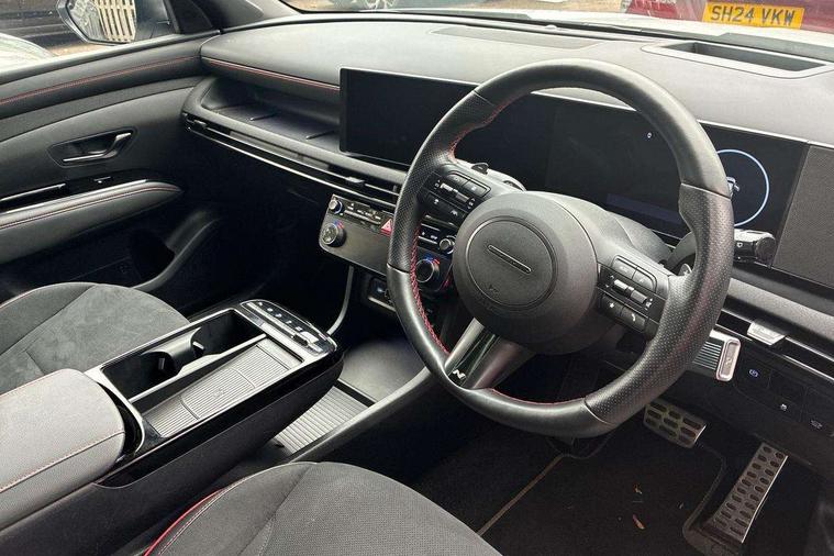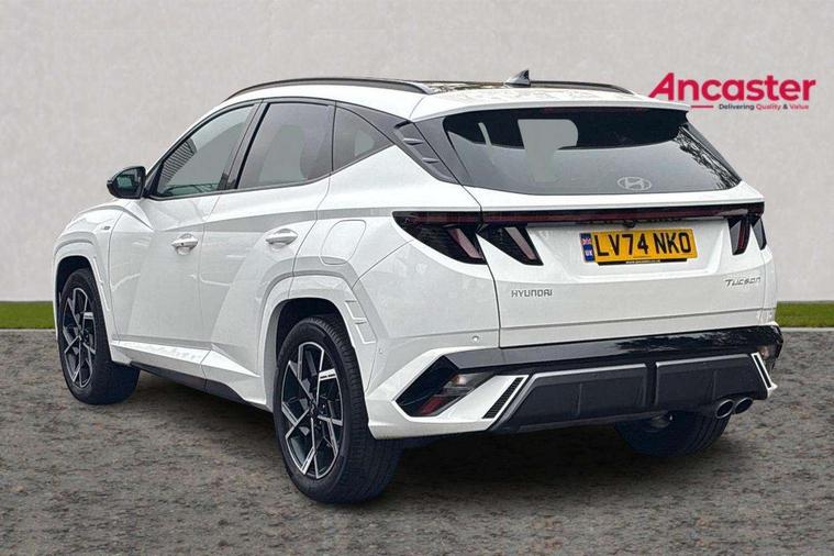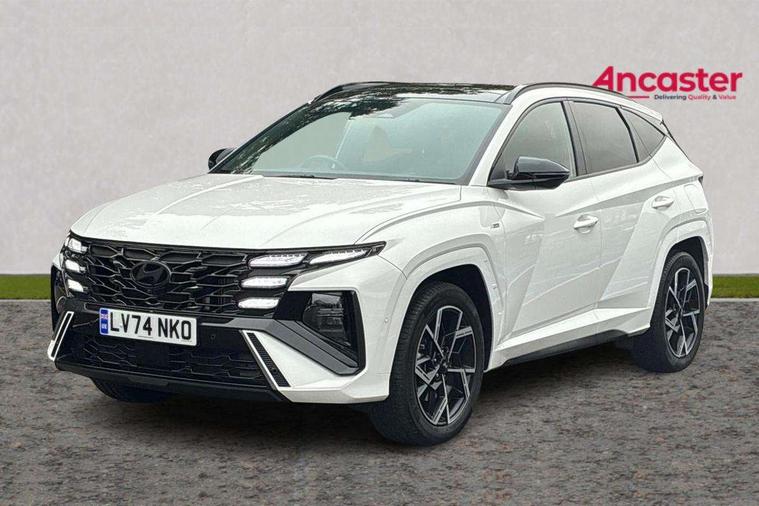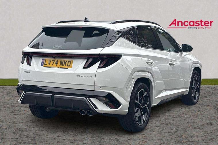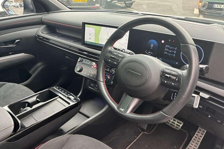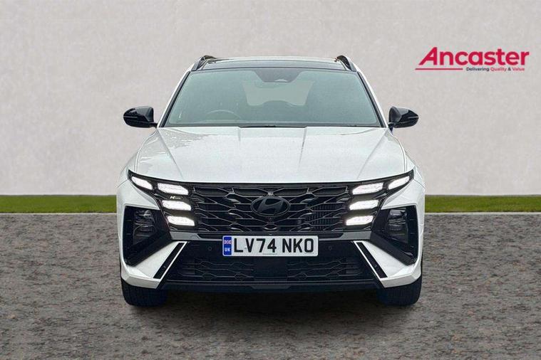 12.3" LCD display with driver's supervision instrument cluster, 12.3" widescreen navigation with bluelink and mapcare, Blind spot view monitor, Bluetooth system, Cruise control - smart adaptive speed control with stop and go function, Digital clock, Drive mode selector, Driver attention warning, E-call, Emergency stop signalling system, Forward Collision Avoidance Assist (FCA) - Car, Pedestrian and Cycle, Forward Collision Avoidance Assist Junction Turning (FCAJX), Front and rear parking sensors, Front, rear and side parking distance warning, Head up Display, Highway Driving Assist (HDA), Hyundai road side assistance, Intelligent speed limit assist, Lane follow assist, Lane keep assist, Over the air updates(OTA), Parking collision avoidance assist (PCA), PAS, Rear camera and guidance parking system, Rev counter, Smart power tailgate, Surround view monitor, Tailgate open warning light, Trip computer, Trip odometer, Voice recognition, Water temperature gauge, Windscreen washer fluid sensor and warning indicator, Wireless Apple CarPlay/Android Auto, Wireless phone charging pad, Shift by Wire Gear Selector (SBW), 2 front and 2 rear USB-C ports, DAB Digital radio, Krell premium audio system with 8 speakers and subwoofer, Steering wheel mounted audio/phone controls, Adjustable intermittent front windscreen wipers with aero wiper blade, Auto dimming rear view mirror, Automatic defog system, Automatic headlights with dusk sensor, Automatic windscreen wipers with rain sensor, Body colour bumpers, Body colour door mirrors with integrated indicators, Body colour exterior door handles, Body coloured wheel arches, Electric tilt/slide panoramic sunroof, Electrically adjustable, heated and power folding door mirrors, Follow me home headlights, Front and rear electric windows with anti-trap mechanism and one touch control, Front fog lights, Glossy black bumper mouldings, LED 3rd brake light, LED daytime running lights, LED rear lights, Matrix LED headlights, Positioning Lights - LED, Privacy glass - Rear windows and tailgate, Rear side wing doors, Rear wash/wipe with intermittent wipe setting, Roof rails, Soft touch rear door paneling, Tinted glass with windscreen shade band, Trailer stability assist, 12V power outlets in front console and luggage compartment, 3 seat bench in 2nd row, 40/20/40 split folding rear seat, 64 colours interior ambient lighting, Adjustable head restraints (Up and down), Cupholders in rear armrest, Door courtesy lights, Driver and passenger sunvisors with illuminated LED vanity mirrors, Driver's seat electric adjustments, Front and rear door pockets, Front armrest with storage box, Front centre console and door bottle holders, Front passenger's seat electric adjustments, Heated front seats, Heated rear seats, Heated steering wheel, Height/reach adjustable steering column, Illuminated/air conditioned glove compartment, ISOFIX child seat anchorage points attached on outer rear seats, Leather wrapped steering wheel and gear knob, Leather/faux textile suede upholstery, LED interior lighting, Luggage compartment lighting, Luggage cover, Luggage hooks, Luggage net, Map and reading lights, Metal pedals, Rear seat remote folding function, Rear side window sunblind, Reclining rear seats, Retractable load cover, Single front passenger seat, Sunglasses holder, Three zone climate control, Touch sensitive climate controls with temperature dials, TUCSON branded metal door scuff plate, Underfloor boot compartment, Ventilated front seats, Wireless charging with armrest, N Line design package - Tucson, N Line interior design package - Tucson, Trailer wiring package - Tucson, 3x3 point rear seatbelts, Active bonnet, Airbag - Front, front side, curtain and centre front airbags, Anti-lock brake system (ABS), Brake assist function, Childproof rear door locks, Curtain airbag roll over sensor, Downhill brake control, Electric parking brake, Electronic stability control, Front and rear seatbelt reminder, Front passenger airbag deactivation switch, Front seatbelt pretensioners, Hill start assist control (HAC), Multi-Collision braking, Outer rear seatbelt height adjustment, Seatbelt height adjustment for front seats, Traction control, Tyre pressure monitoring system with individual tyre pressure display - TPMS, Vehicle stability management, Deadlocks, Immobiliser, Locking wheel nuts, Remote control central locking, Smart key with keyless entry and engine start/stop button, Speed sensitive auto door locking, Thatcham category 1 alarm, 19" Alloy wheels, Tyre repair kit,