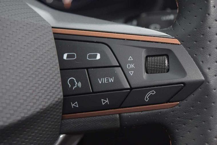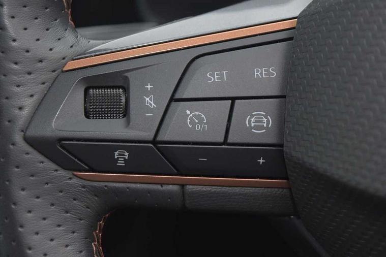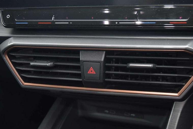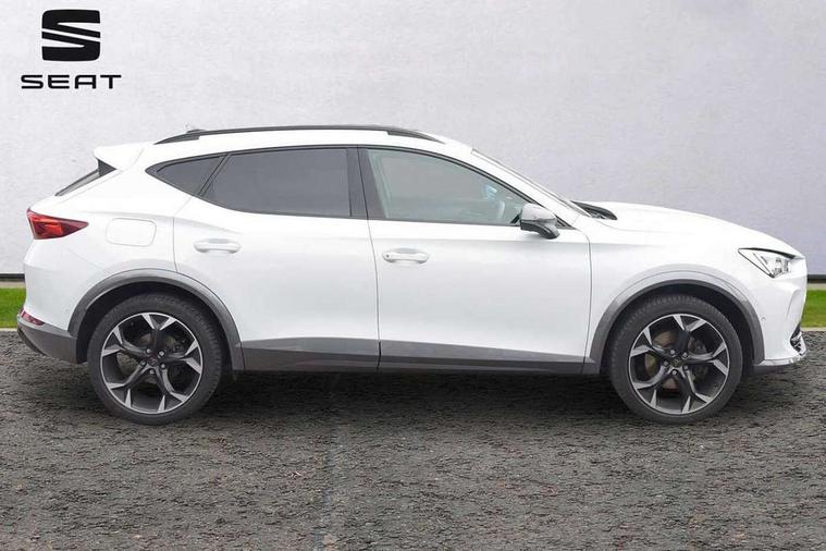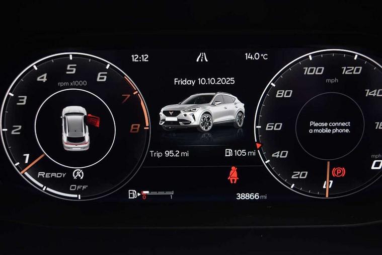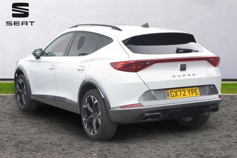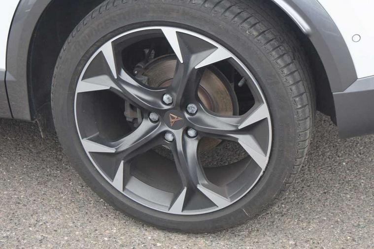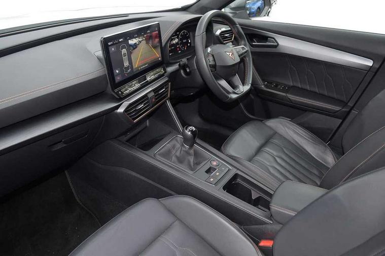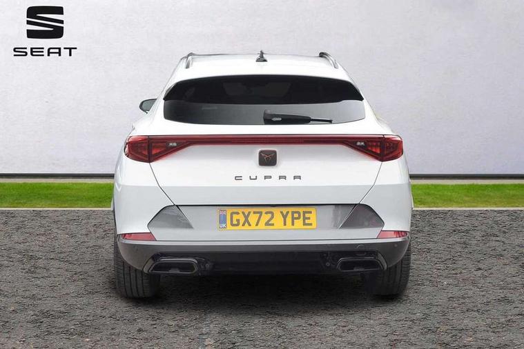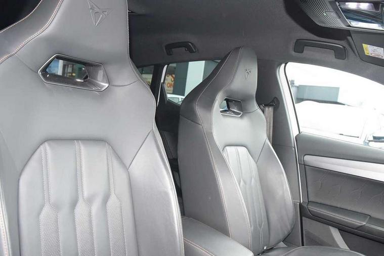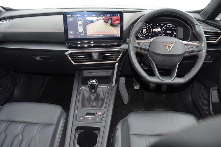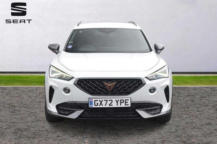 Digital cockpit and configurable dashboard, Driver alert system, Driving profile selection, E-call, Forward collision warning with automatic braking, Lane assist, Navigation system with 12'' Touchscreen Display, Park assist (inc front/rear parking sensors), PAS, Predictive adaptive cruise control with speed limiter, Rear view camera, RPM, trip computer, outside temp gauge, instrument light brightness, low fuel warning light, lights on reminder, gearshift indicator, Service interval indicator, Start/stop system with regenerative braking, Voice control system, Wireless apple carplay, Wireless phone charger, Electronic locking differential and dynamic traction support, Standard suspension, 2 front and 2 rear USB type C sockets, Auxiliary input socket, DAB radio, Auto dimming rear view mirror, Body colour door handles, Body coloured bumpers, Dark grey wing mirror, Daytime running light with automatic headlight control and coming home feature, Dynamic headlight range control, Electric front/rear windows, Electrically adjustable heated and folding door mirrors with memory function, Front fog lamps with cornering function, Gloss black roof rails and window surrounds, LED Headlights, LED Taillights with dynamic indicator, Rain sensing wipers, Rear diffuser with black simulated exhaust pipes, Rear side wing doors, Rear wash/wipe, Third brake light, Tinted rear windows, Welcome lights, 12v power supply in centre console, 12V socket, 12v socket in loadspace, 2 front and 2 rear reading lights, 230V socket, 3 seat bench in 2nd row, 60/40 split rear bench seat with armrest and mechanical seat release, Black headlining, Dust/pollen filter, Front and rear head restraints, Front centre armrest, Height/reach adjust steering wheel, Illuminated interior front door sills, Illuminated sunvisor with mirror, Isofix, Leather multi function steering wheel, Luggage tie-down hooks, Single front passenger seat, Three zone climate control with control panel in rear, Variable luggage/load compartment floor, Wraparound lighting, Genuine Nappa leather Pack - Cupra, Safety and driving pack (M) - Formentor, 3 point seatbelts on all rear seats, ABS, Brake control system - ESC and brake booster, Child proof door locks, Driver and front passenger airbags with front passenger airbag de-activation, Electronic parking brake, Front and rear disc brakes, Front side curtain airbags, Hill hold control, Seat belt reminder for front and rear seats, Tyre pressure monitoring system, Anti theft alarm system, Keyless entry and start system (KESSY), Locking wheel bolts, Copper and aluminium interior detailing, 19" 'Exclusive' machined sport matte black and silver alloy wheels,