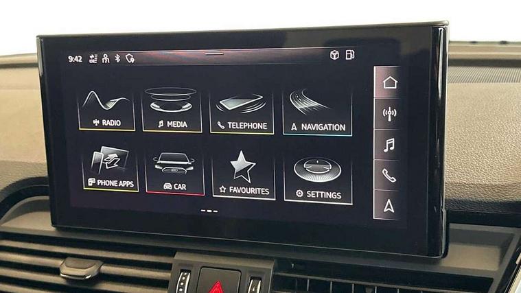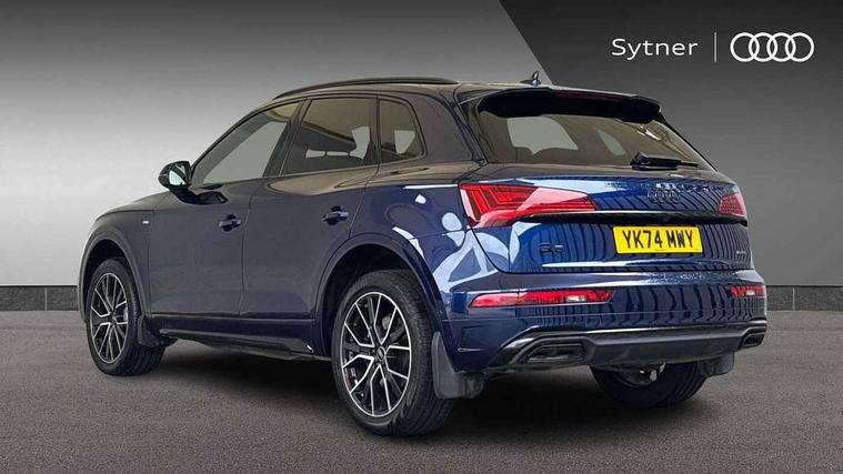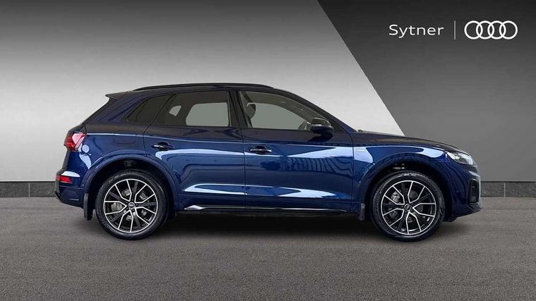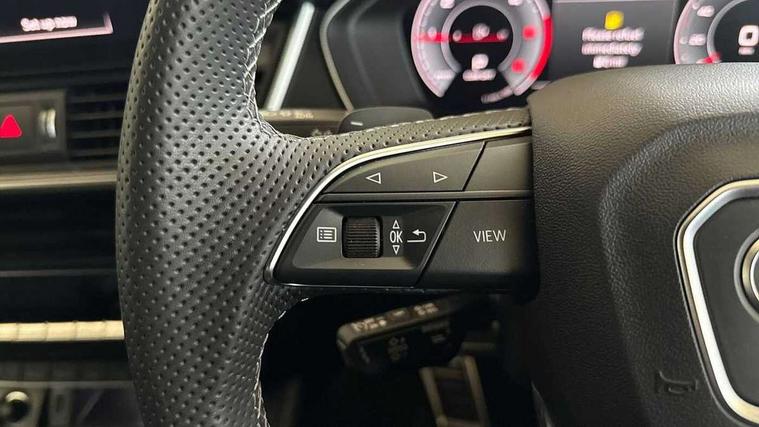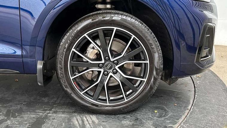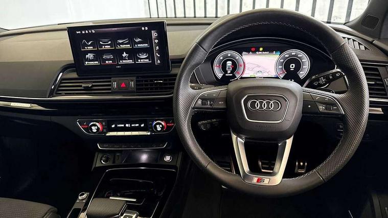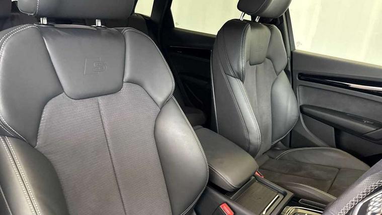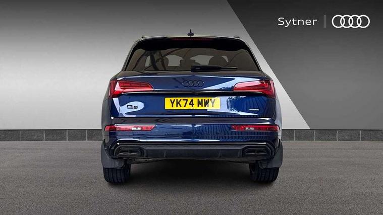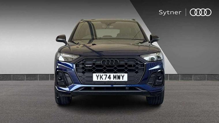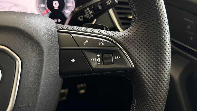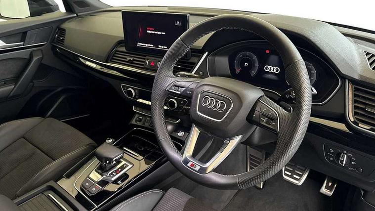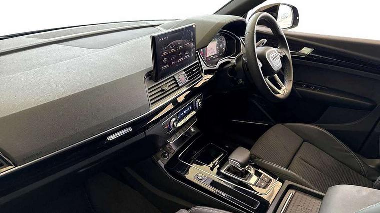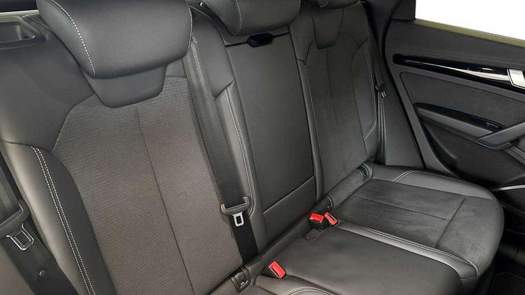 Acoustic front and rear parking sensor, Audi connect safety and service (e-call), Audi drive select, Audi virtual cockpit plus with 12.3" screen and three different layout designs, Audi wireless smartphone interface, Automatic start-stop system with coasting functionality and efficiency programme, Bluetooth interface, Camera based traffic sign recognition, Electro - mechanical power assisted steering, Lane departure warning, MMI navigation plus with 10.1" touch screen, Power tailgate, Reversing camera, Service interval indicator, Voice control system with Audi hotword activation "Hey Audi", Diesel particulate filter, Quattro on demand, S line sports suspension, 2 x USB charging port with aux input socket, 8 loudspeakers, DAB Digital radio, Acoustic windscreen, Auto dimming door mirrors, Auto dimming frameless rear view mirror, Automatic headlight adjustment, Automatic headlights and windscreen wipers, Black roof rails, Black styling with black rings, Body colour bumpers, Body colour rear diffuser with matt aluminium silver surrounds, Body colour underbody protection, Chrome plated exhaust trims, Daytime running lights, Door sills in Selenite silver, Electric adjustable/heated/folding door mirrors, Front air inlet surrounds in aluminium, Front and rear electric windows, Front radiator grille in honeycomb design, LED 3rd brake light, LED headlights and LED tail lights, Loading edge protection in stainless steel, Lower bumpers painted in contrast Manhattan grey, Rear chrome trim strip below lights, Rear privacy glass and rear side windows, Rear side wing doors, Rear wiper, Roof bars, S Line badges on the front wing panels, S Line front and rear bumpers, S Line rear spoiler, S Line side skirts, 3 rear headrests, Black cloth headlining, Comfort front centre armrest, Contrast stitching on seats, steering wheel and gear lever gaiter, Deluxe 3 zone electronic climate control, Front head restraints, Front sport seats with S embossed logo, Front/rear floor mats, Gear lever in black leather, Heated front seats, Height/reach adjustable steering column, Illuminated door sill trims with S logo, Luggage compartment cover, Manual seat adjustment with 4-way electric lumbar support, Single front passenger seat, Stainless steel pedals, Sunvisors with vanity mirrors, Top surface of the rear centre armrest in artificial leather, High gloss pack - Q5, LED interior light pack - Q5, 3 point seatbelts on all seats, 6 airbags - Driver, front passenger, curtain and side airbags, Attention and drowsiness assist, Electrically operated child locks on rear doors, Electromechanical parking brake, Electronic stabilisation control including ABS, ASR and EDL, First aid kit with warning triangle and vests, Front passenger airbag deactivation, Hill descent control, Hill hold assist, ISOFIX child seat mounting for front passenger seat and ISOFIX child seat mounting with Top Tether for outer rear seats, Multi collision brake assist, Pop-up bonnet for pedestrian protection, Pre sense city, Seatbelt monitoring, Tyre pressure warning, Anti theft alarm, Anti-theft wheel bolts, Remote central locking, Remote control key with SAFELOCK and keyless go, Air vents inserts and centre console in gloss black, Tool kit, Tyre repair kit,