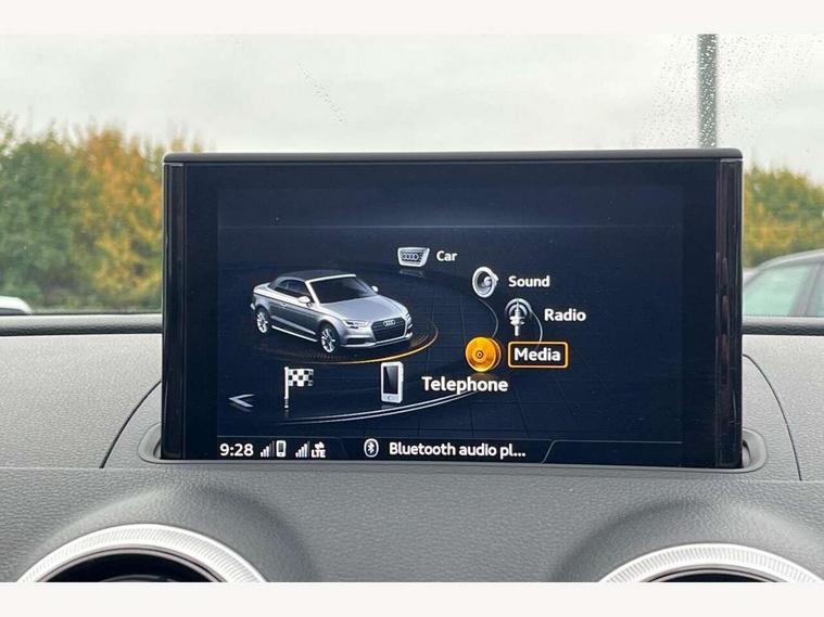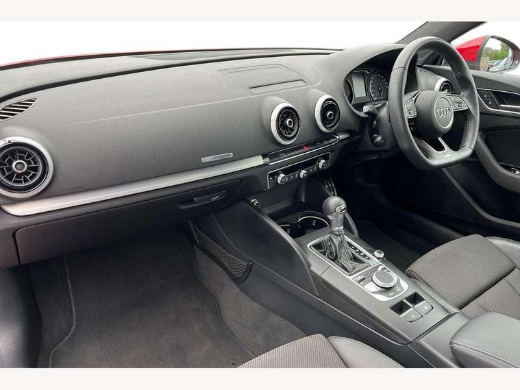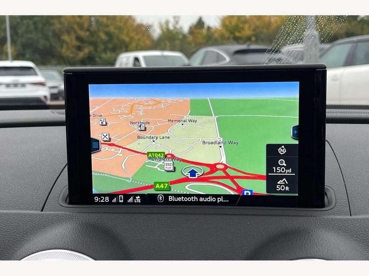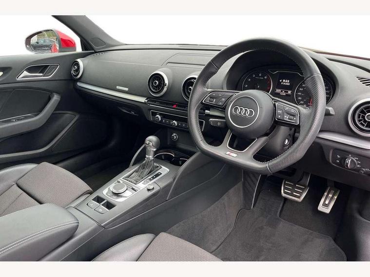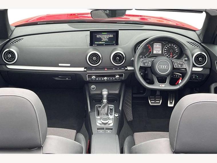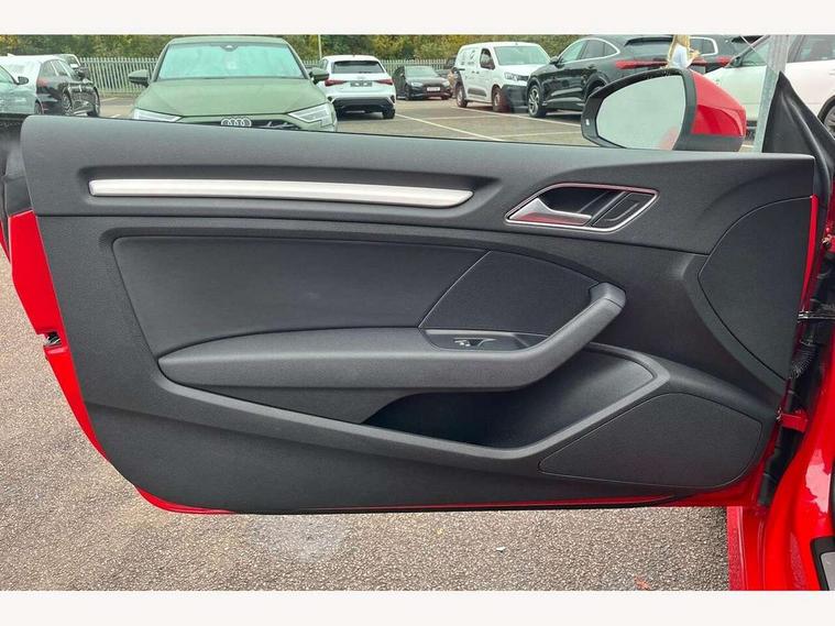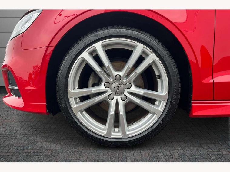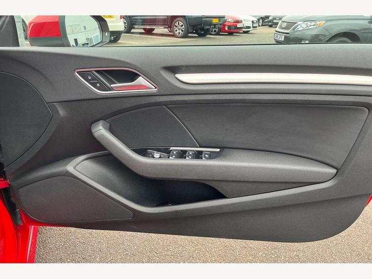 Audi connect, Audi drive select, Audi smartphone interface, Bluetooth interface, Colour driver's information system display, Service interval indicator, 2 USB ports, Audi music interface, DAB Digital radio, Aluminium side window trim, Automatic lights and wipers, Body colour bumpers, Body colour door mirrors with integral indicators, Chrome exhaust tailpipes, Electric operated/heated door mirrors, Front and rear electric windows, Fully automatic acoustic hood, Heated front windscreen, Heated rear window, Heated windscreen washer jets, LED daytime running lights, S Line body styling, 2 height adjustable rear headrests, 3 spoke flat bottom multi-function leather steering wheel including paddle shift, 4 lashing points to secure luggage, 50/50 split folding rear seat, Adjustable front armrest, Driver/passenger sunvisors, Dual zone electronic climate control, Front/rear floor mats, Height adjustable front seats, Height/reach adjustable steering column, Illuminated door sills, Illuminated glovebox, ISOFIX child seat preparation+airbag deactivation, Jack and tool kit, Perforated leather gearknob, Stainless steel pedals, Storage compartment in centre console, Storage compartments in doors, LED interior light pack - A3/RS3, Light and rain sensor pack - A3 Cabriolet, Storage pack - A3 Cabriolet/Saloon, 3 point seatbelts on all seats, ABS/EBD, Active bonnet, Active front headrests, ASR, Automatic roll over protection, Driver and passenger side airbags, Driver/Front Passenger airbags, Drivers knee airbag, EDL, Electromechanical parking brake, ESC - Electronic Stability Control + traction control, Front passenger airbag deactivation, Seatbelt warning, Tyre pressure monitor, Warning triangle and first aid kit, Anti theft alarm, Anti-theft wheel bolts, Immobiliser, Remote control central locking, Aluminium air vent surrounds, Aluminium trim elements, Space saver spare wheel,