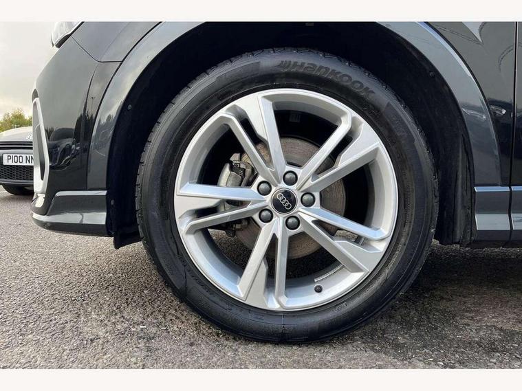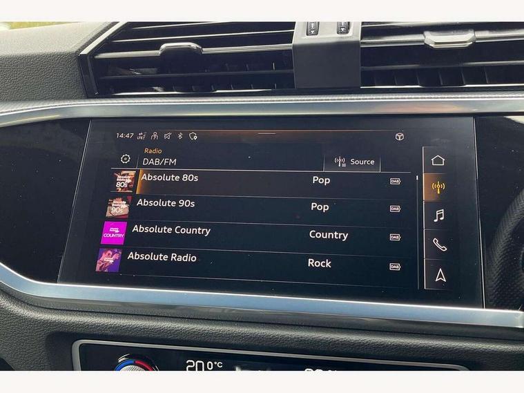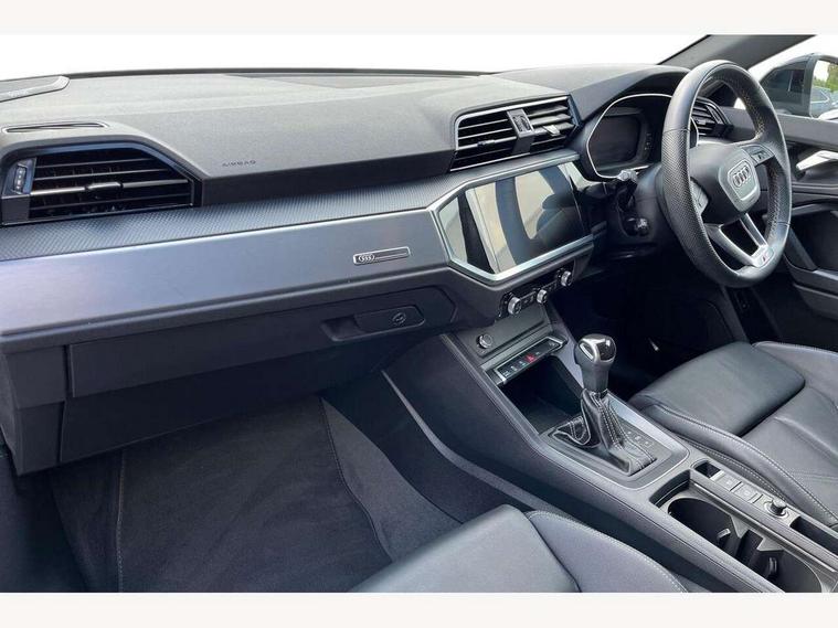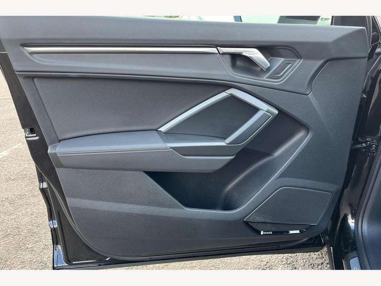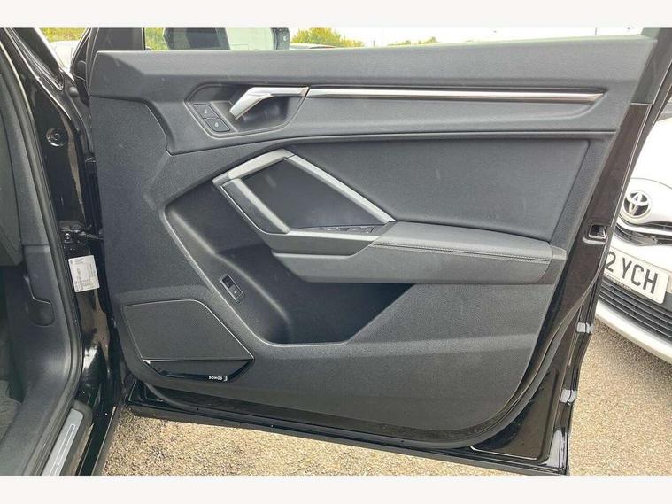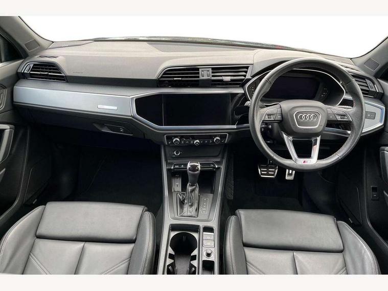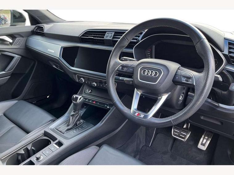 Audi drive select, Audi lane departure warning, Audi Virtual Cockpit - 10.25" display, Bluetooth interface, Camera based traffic sign recognition, Legal emergency call, MMI Navigation Plus with high resolution 10.1 inch touchscreen colour display, Power operated tailgate, Progressive steering, Service interval indicator, Smartphone interface includes wireless Apple carplay/Android Auto, Start stop system with recuperation, Voice control system with natural language interaction, Sports suspension, 2 USB-C ports with charge and data functions, 6 passive loudspeakers, DAB digital radio module, Acoustic windscreen, Aluminium window trim, Auto dimming frameless rear view mirror, Diffuser grille in grained matt black, Diffuser trim in selenite silver, Electrically folding, adjustable and heated door mirrors with integrated LED side indicators and kerb view function for passenger side, Front and rear electric windows, Front fog lights, Front side air inlets in selenite silver, Front underbody protection in manhattan grey paint finish, Grille surround in aluminium silver matt, High gloss black finish B and C pillars, LED Dynamic rear indicators, LED headlights with LED daytime running lights, LED rear lights, LED third brake light, Privacy glass dark tinted rear and rear-side windows (from B-pillar backwards), Radiator grille in anthracite black with inlay in matt aluminium silver, Rain and light sensors, Rear side wing doors, Rear underbody protection in matt black, Rear wiper, S line badges on front wings, S line front and rear bumpers and side skirts in contrasting Manhattan grey paint finish, Side skirt insert in matt Platinium grey, Variable front intermittent wipers, 12V socket in rear centre console, 3 seat bench in 2nd row, 3 spoke leather multifunction steering wheel features S badging and grips in perforated leather with contrast stitching, 40:20:40 folding with manual adjustment for 60:40 forwards/backwards position and backrest angle, Adjustable rear seat bench/backrest with centre armrest and cupholder, Black cloth headlining, Dual zone electronic climate control, Front and rear black floor mats with contrast stitching, Front and rear headrests, Front and rear roof module including reading lights, Front centre armrest, Glove compartment lighting, Height and reach adjustable steering wheel, Illuminated door sill trims with S logo, ISOFIX child seat mounting for front passenger with airbag deactivation and outer rear seat including top tether attachment point for outer rear seats, Luggage compartment light right in white, Luggage compartment sill protection in stainless steel, Manual front seats with height adjustment, Perforated leather gearknob, Single front passenger seat, Stainless steel pedals, Ambient lighting pack - Q3, Non smoking pack - Q3, 3x3 point rear seatbelts, 6 airbags - Driver, front passenger, curtain and side windows, Audi pre-sense front with pedestrain and cyclist recognition, Electrically operated child locks on rear doors, Electromechanical parking brake, Electronic stabilisation control including ABS, ASR and EDL, Front seatbelt reminder, Hill descent control, Hill hold assist, Pre sense basic, Seatbelt monitoring, Tyre pressure warning, Warning triangle and first aid kit, Anti theft alarm, Anti theft wheel bolts, Immobiliser, Remote central locking, Aluminium look interior elements, Black dashboard, Dark matt brushed aluminium inlay, Detail dashboard around MMI touch colour display in glass look, black with surround in aluminium look, Leatherette door armrest,
