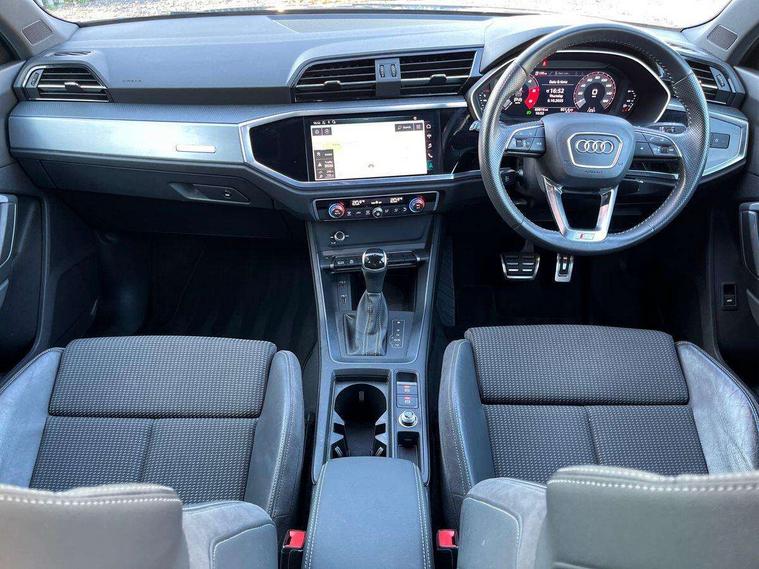 Audi connect safety and service (e-call), Audi drive select, Audi lane departure warning, Audi side assist, Audi smartphone interface, Bluetooth interface, MMI navigation plus with MMI touch, Power opening/closing tailgate, Progressive steering, Service interval indicator, Stop/start system, Voice control system, Diesel particulate filter, DAB digital radio module, Acoustic windscreen, Aluminium roof rails, Aluminium window trim, Auto dimming rear view mirror, Body colour door mirrors, Body coloured bumpers, Diffuser in matt Platinum grey, Electrically adjustable and heated door mirrors with integrated LED side indicators, Front and rear electric windows, Front fog lights, Front side air inlets in matt platinum grey, Front spoiler blade in matt platinum grey, Grille vertical bars in aluminium silver/Matt, High gloss black finish B and C pillars, Privacy glass, Rain and light sensors, Rear diffuser strip in selenite silver, S Line badge on wings, S Line front and rear bumpers, Side skirt insert in matt Platinium grey, Titanium black radiator grille, 12V socket in rear centre console, 40:20:40 split folding rear bench seat, Adjustable rear seat bench/backrest with centre armrest and cupholder, Aluminium door sill trims, Black cloth headlining, Dual zone climate control, Front and rear black floor mats with contrast stitching in rock grey, Front and rear headrests, Front centre armrest with storage compartment and angle adjustment, Illuminated door sill trims with S logo, ISOFIX child seat mounting and Top Tether with front passenger airbag deactivation, Perforated leather gearknob, Stainless steel luggage compartment sill finisher, Stainless steel pedals, Non smoking pack - Q3, 3x3 point rear seatbelts, 6 airbags - Driver, front passenger, curtain and side windows, Audi pre-sense front with pedestrain and cyclist recognition, Electronic stabilisation control including ABS, ASR and EDL, Hill hold assist, Pre sense basic, Seatbelt monitoring, Tyre pressure warning, Warning triangle and first aid kit, Anti theft alarm, Anti theft wheel bolts, Remote central locking, Dark matt brushed aluminium inlay, MMI touch colour display in gloss black with aluminium surround,