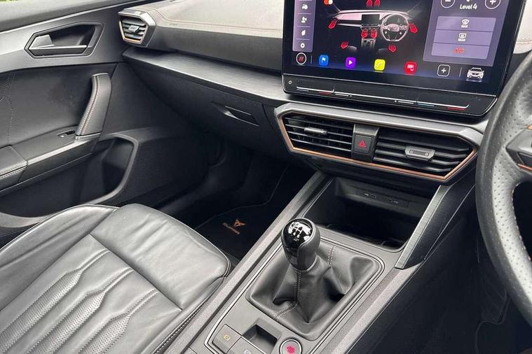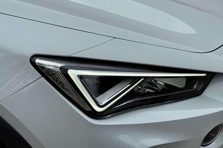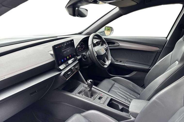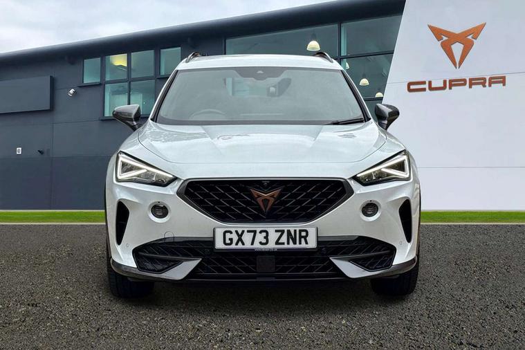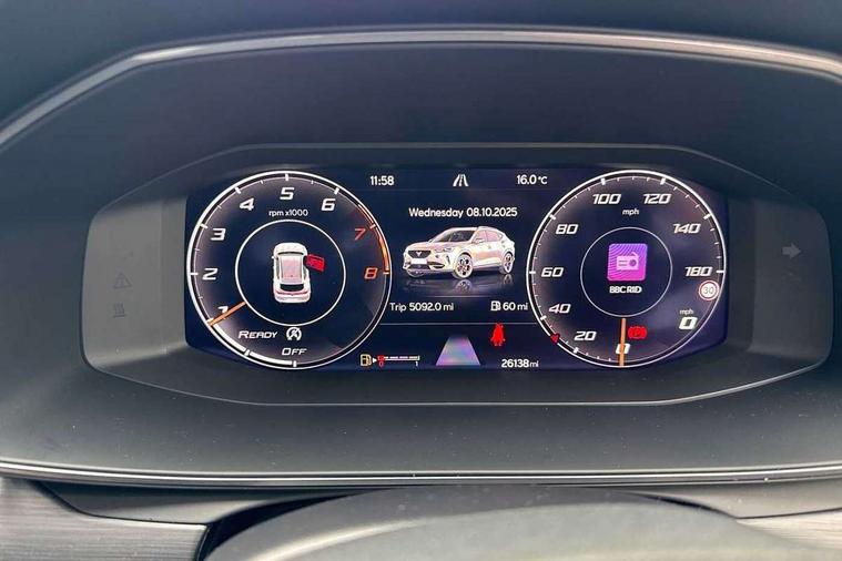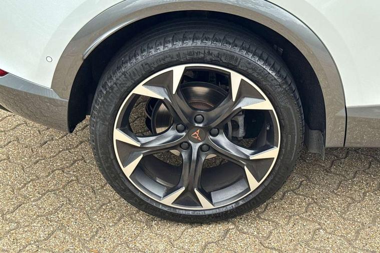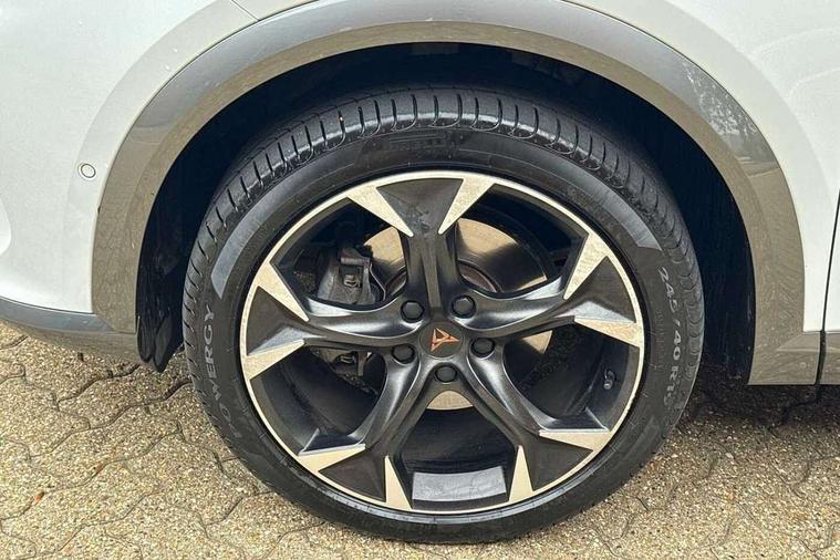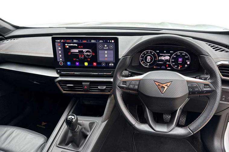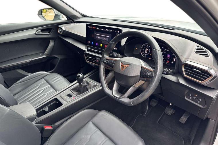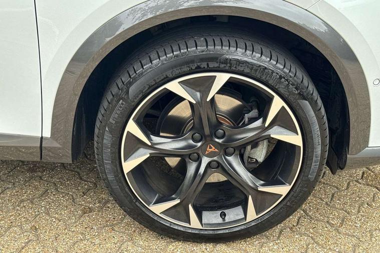 Digital cockpit and configurable dashboard, Driver alert system, Driving profile selection, Forward collision warning with automatic braking, Lane assist, Navigation system with 12'' Touchscreen Display, Park assist (inc front/rear parking sensors), PAS, Predictive adaptive cruise control with speed limiter, Rear view camera, RPM, trip computer, outside temp gauge, instrument light brightness, low fuel warning light, lights on reminder, gearshift indicator, Service interval indicator, Start/stop system with regenerative braking, Voice control system, Wired Android Auto, Wireless apple carplay, Wireless phone charger, Electronic locking differential and dynamic traction support, Standard suspension, 2 front and 2 rear USB type C sockets, Auxiliary input socket, DAB radio, Auto dimming rear view mirror, Body colour door handles, Body coloured bumpers, Dark grey wing mirror, Daytime running light with automatic headlight control and coming home feature, Dynamic headlight range control, Electric front/rear windows, Electrically adjustable heated and folding door mirrors with memory function, Front fog lamps with cornering function, Gloss black roof rails and window surrounds, LED Headlights, LED Taillights with dynamic indicator, Rain sensing wipers, Rear diffuser with black simulated exhaust pipes, Rear side wing doors, Rear wash/wipe, Third brake light, Tinted rear windows, Welcome lights, 12v power supply in centre console, 12V socket, 12v socket in loadspace, 2 front and 2 rear reading lights, 230V socket, 3 seat bench in 2nd row, 60/40 split rear bench seat with armrest and mechanical seat release, Black headlining, Dust/pollen filter, Front and rear head restraints, Front centre armrest, Height/reach adjust steering wheel, Illuminated interior front door sills, Illuminated sunvisor with mirror, Isofix, Leather multi function steering wheel, Luggage tie-down hooks, Single front passenger seat, Three zone climate control with control panel in rear, Variable luggage/load compartment floor, Wraparound lighting, Genuine Nappa leather Pack - Cupra, Safety and driving pack (M) - Formentor, 3 point seatbelts on all rear seats, ABS, Brake control system - ESC and brake booster, Child proof door locks, Driver and front passenger airbags with front passenger airbag de-activation, Electronic parking brake, Front and rear disc brakes, Front side curtain airbags, Hill hold control, Public e-call, Seat belt reminder for front and rear seats, Tyre pressure monitoring system, Anti theft alarm system, Keyless entry and start system (KESSY), Locking wheel bolts, Copper and aluminium interior detailing, 19" 'Exclusive' machined sport matte black and silver alloy wheels,