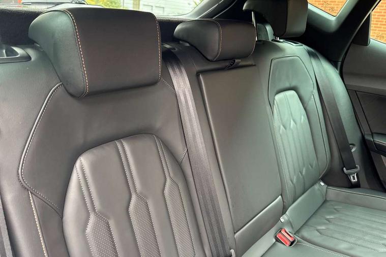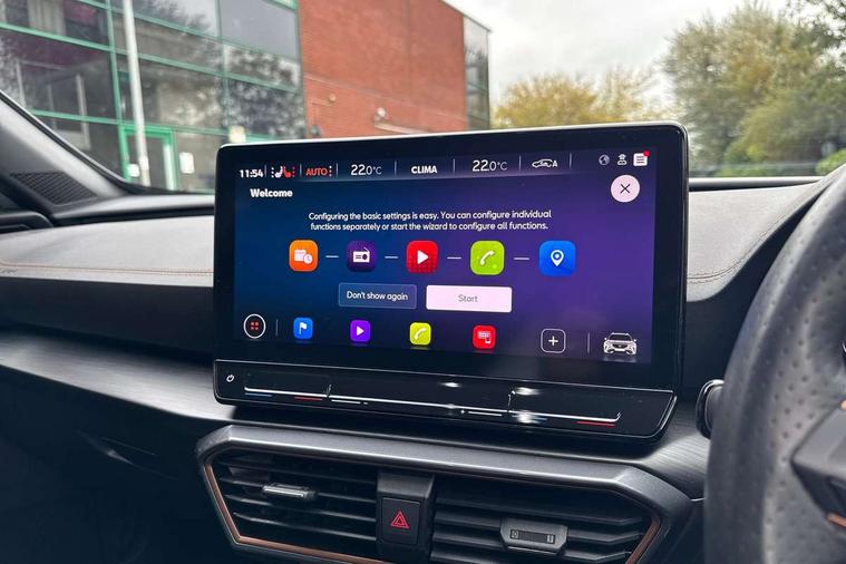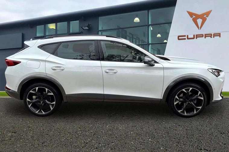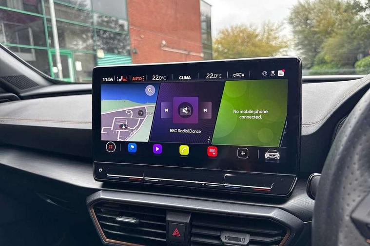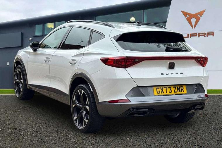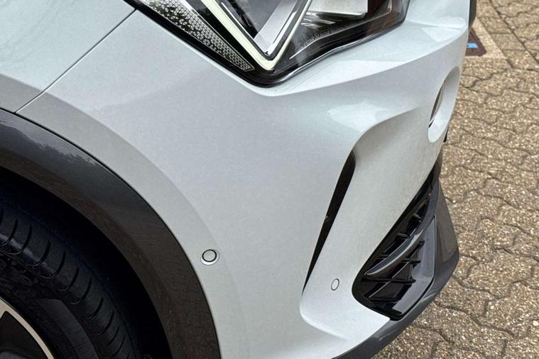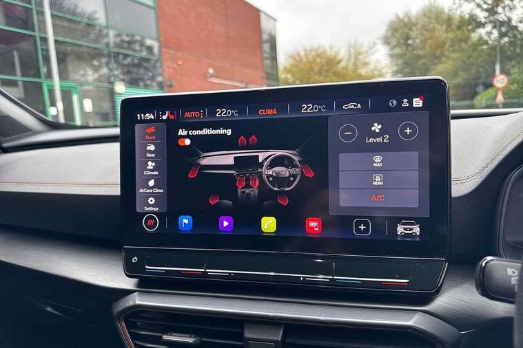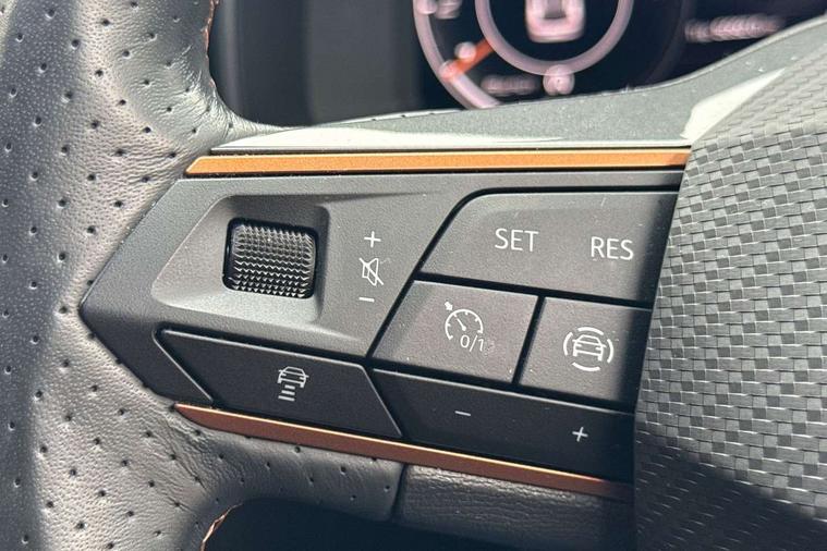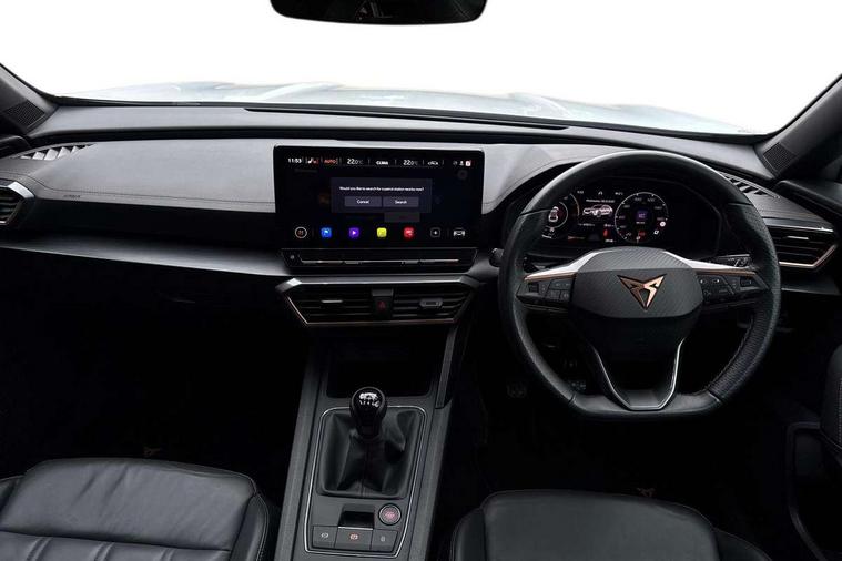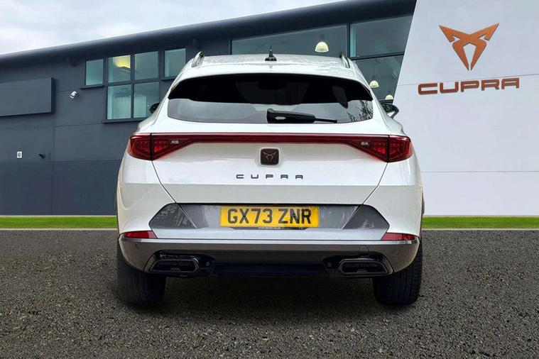 Digital cockpit and configurable dashboard, Driver alert system, Driving profile selection, Forward collision warning with automatic braking, Lane assist, Navigation system with 12'' Touchscreen Display, Park assist (inc front/rear parking sensors), PAS, Predictive adaptive cruise control with speed limiter, Rear view camera, RPM, trip computer, outside temp gauge, instrument light brightness, low fuel warning light, lights on reminder, gearshift indicator, Service interval indicator, Start/stop system with regenerative braking, Voice control system, Wired Android Auto, Wireless apple carplay, Wireless phone charger, Electronic locking differential and dynamic traction support, Standard suspension, 2 front and 2 rear USB type C sockets, Auxiliary input socket, DAB radio, Auto dimming rear view mirror, Body colour door handles, Body coloured bumpers, Dark grey wing mirror, Daytime running light with automatic headlight control and coming home feature, Dynamic headlight range control, Electric front/rear windows, Electrically adjustable heated and folding door mirrors with memory function, Front fog lamps with cornering function, Gloss black roof rails and window surrounds, LED Headlights, LED Taillights with dynamic indicator, Rain sensing wipers, Rear diffuser with black simulated exhaust pipes, Rear side wing doors, Rear wash/wipe, Third brake light, Tinted rear windows, Welcome lights, 12v power supply in centre console, 12V socket, 12v socket in loadspace, 2 front and 2 rear reading lights, 230V socket, 3 seat bench in 2nd row, 60/40 split rear bench seat with armrest and mechanical seat release, Black headlining, Dust/pollen filter, Front and rear head restraints, Front centre armrest, Height/reach adjust steering wheel, Illuminated interior front door sills, Illuminated sunvisor with mirror, Isofix, Leather multi function steering wheel, Luggage tie-down hooks, Single front passenger seat, Three zone climate control with control panel in rear, Variable luggage/load compartment floor, Wraparound lighting, Genuine Nappa leather Pack - Cupra, Safety and driving pack (M) - Formentor, 3 point seatbelts on all rear seats, ABS, Brake control system - ESC and brake booster, Child proof door locks, Driver and front passenger airbags with front passenger airbag de-activation, Electronic parking brake, Front and rear disc brakes, Front side curtain airbags, Hill hold control, Public e-call, Seat belt reminder for front and rear seats, Tyre pressure monitoring system, Anti theft alarm system, Keyless entry and start system (KESSY), Locking wheel bolts, Copper and aluminium interior detailing, 19" 'Exclusive' machined sport matte black and silver alloy wheels,