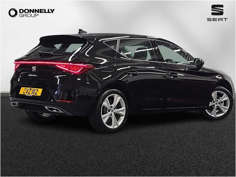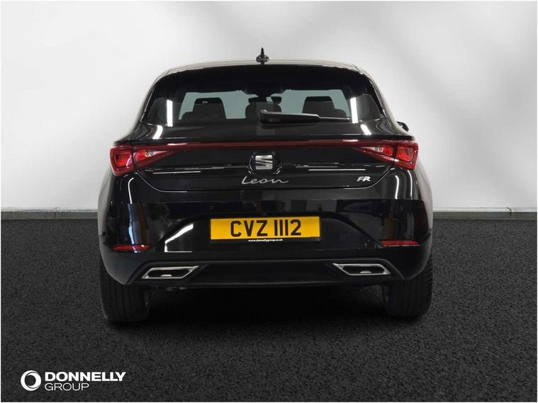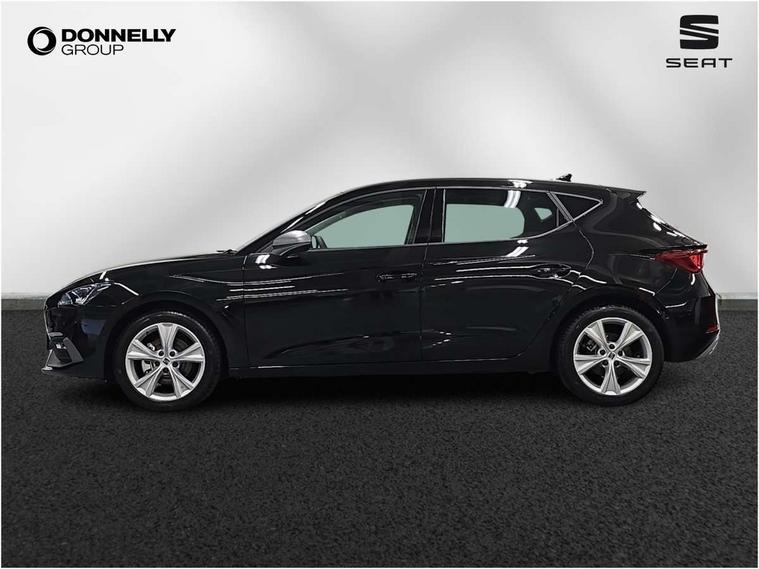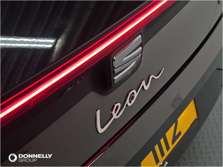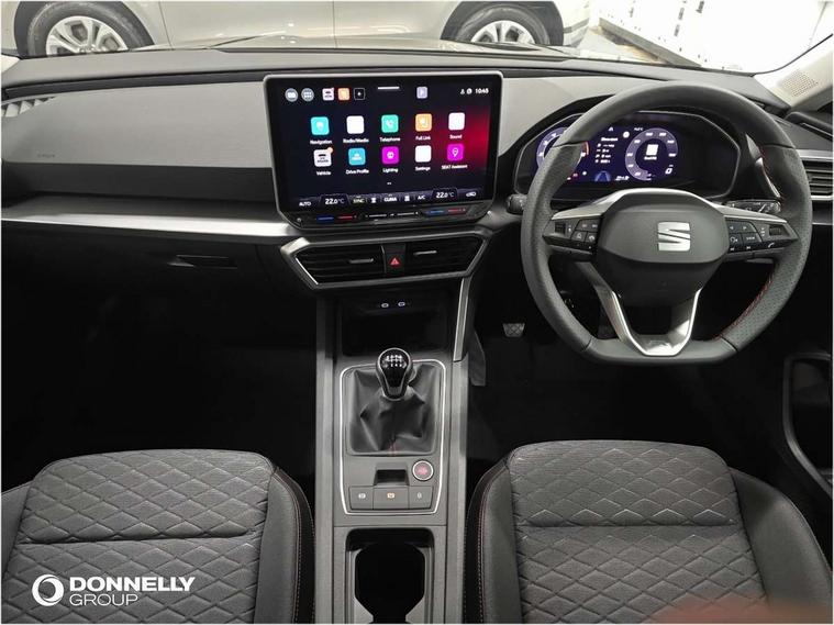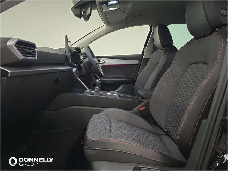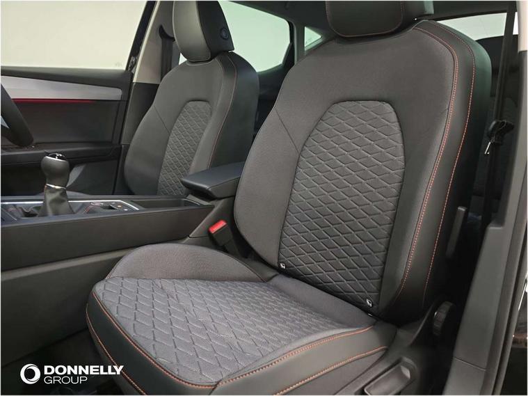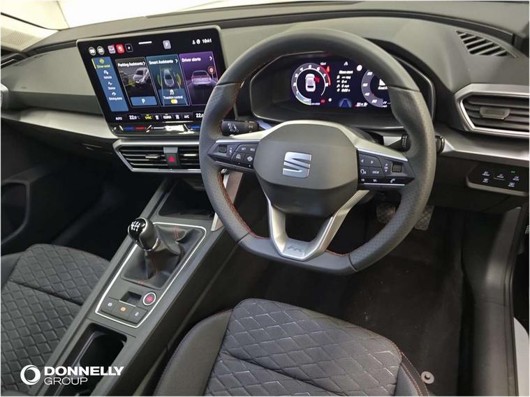 Digital cockpit with multifunction display, Driver attention alert with drowsiness warning, E-call, Front assist with forward collision warning braking reaction to vehicles, pedestrians and cyclists, Full link smartphone integration with Mirror Link, wireless Apple CarPlay and wired Google Android Auto, Intelligent speed assist, Lane assist, Lockable tailgate, Park assist (inc front/rear parking sensors), Power assisted speed sensitive electro-mechanical steering, Rear view camera, RPM, trip computer, outside temp gauge, instrument light brightness, low fuel warning light, lights on reminder, gearshift indicator, SEAT drive profile with 4 modes (Eco/Normal/Sport/Individual), throttle response, Service interval indicator, Start/stop system with regenerative braking, Sports suspension, XDS electronic differential lock and dynamic traction support, 2 front and 2 rear USB-C ports, 7 speakers, Auxiliary input socket, Auto dimming rear view mirror, Body colour door handles, Body coloured bumpers, Cosmo grey exterior mirrors with integrated LED indicators, Dark tinted rear windows, Electric front/rear windows, Electrically adjustable, heated and folding door mirrors, FR sports bumper, Illuminated front door sill, LED front fog lamps, LED headlights and infinite rear tail lights, LED rear fog lamp, Rear side wing doors, Rear wash/wipe, Separate daytime running light with automatic headlight control and coming home feature, Third brake light, Welcome light silhouette from exterior mirrors, Windshield wiper intermittent control with light/rain sensor, 12v power point in centre console, 3 seat bench in 2nd row, 60/40 split rear bench seat with armrest, Ambient lighting with glovebox, footwell and single monocolour, Driver/passenger manual seat height adjustment, Dust/pollen filter, Flat bottomed perforated leather steering wheel with red stitching and FR logo and leather gear stick, Folding boot cover, Front and rear height adjustable headrests, Front and rear reading lights X 4, Front centre armrest, Front seatback storage pockets, Grey headlining, Height/reach adjust steering wheel, ISOFIX points in outer rear seats with top tether anchorage points, Luggage tie-down hooks, Lumbar adjustment for front seats, Single front passenger seat, Sunvisors with covered illuminated mirror, Three zone climate control, Two tone cloth upholstery, Media system plus with navigation - Leon, 3 point seatbelts on all rear seats, ABS, Brake control system - ESC and brake booster, Child proof door locks, Driver and front passenger airbags with front passenger airbag de-activation, front side and curtain airbags, Electronic parking brake, Extended safety system - seat belt tensioner, window closure and hazard lights, Hill hold control, Rear disc brakes, Seat belt reminder for front and rear seats, Tyre pressure monitoring system, Anti theft alarm system with interior monitoring in cab, backup horn and towing protection, KESSY Go (Keyless start), Locking wheel bolts, Wireless phone charging, Chrome interior detailing, 17" Dynamic Bi-spoke alloy wheels with 91W tyres, Tool kit,